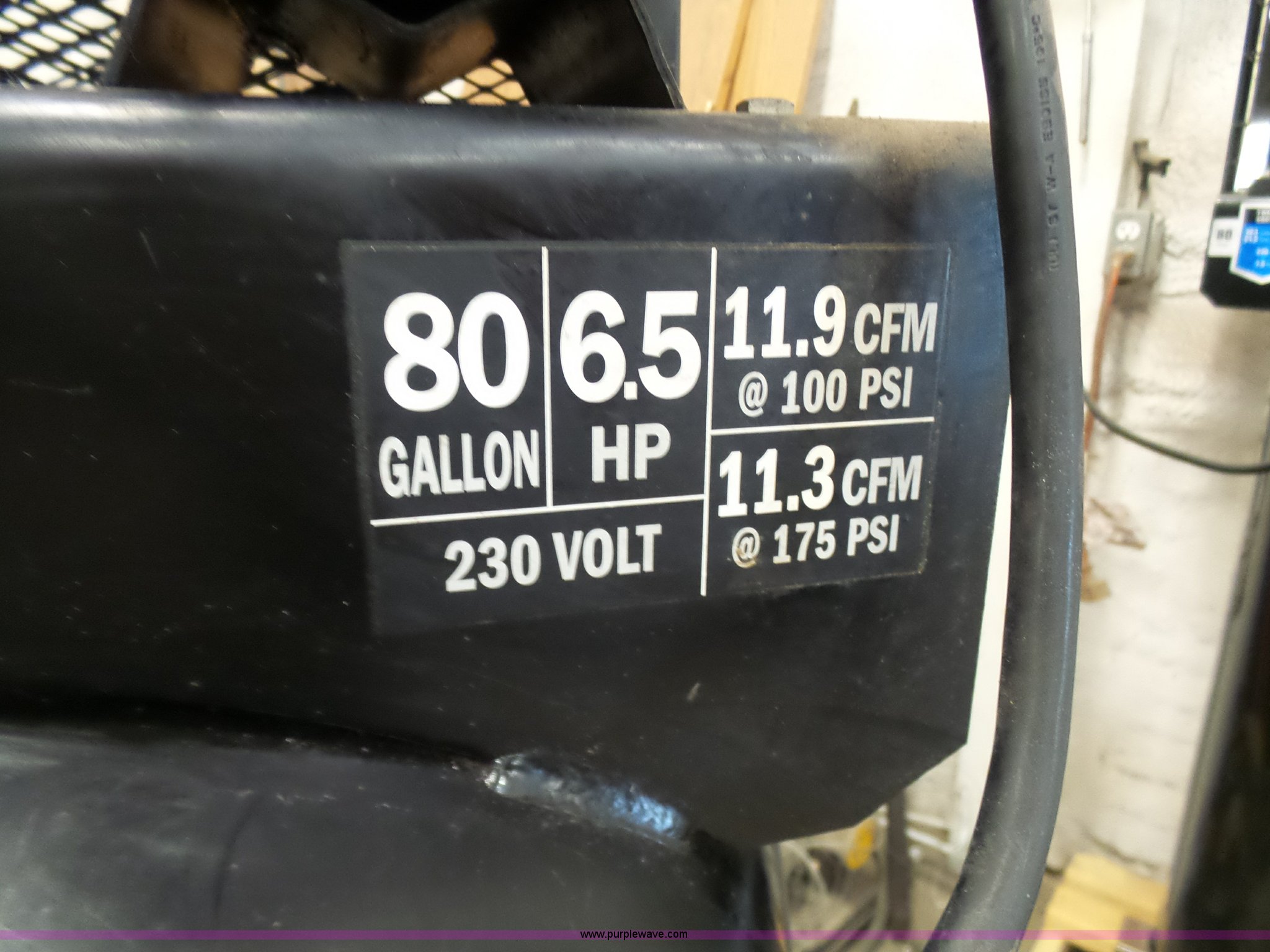 Purple Wave is selling a used Air Compressor in Missouri. This item is a Power Mate Black Max air compressor with the following: Model BV654849, 80 gallon tank capacity, 6.5 HP, 230V, 11.3 CFM at 175 psi, Serial X0985006