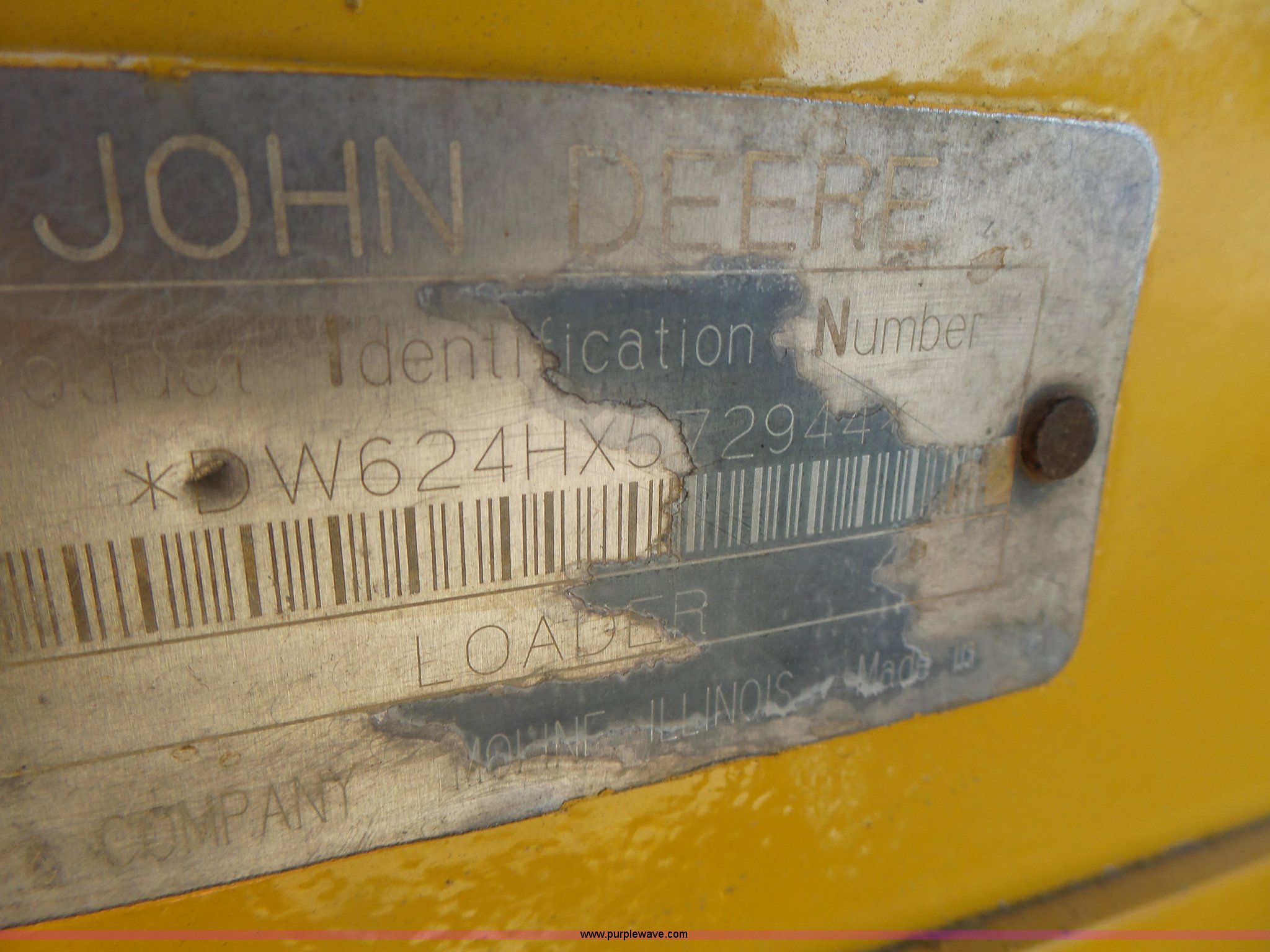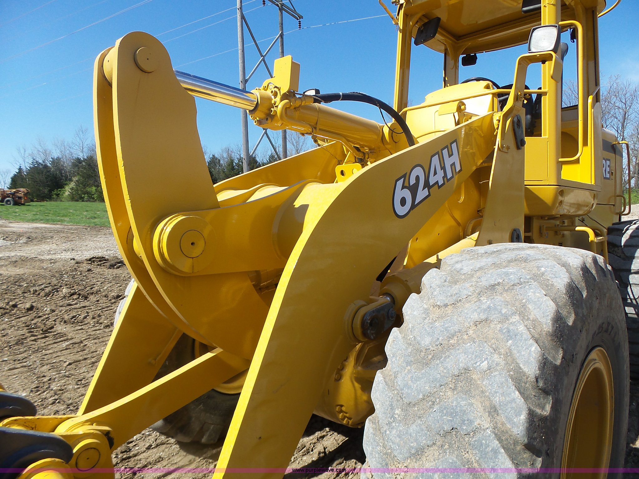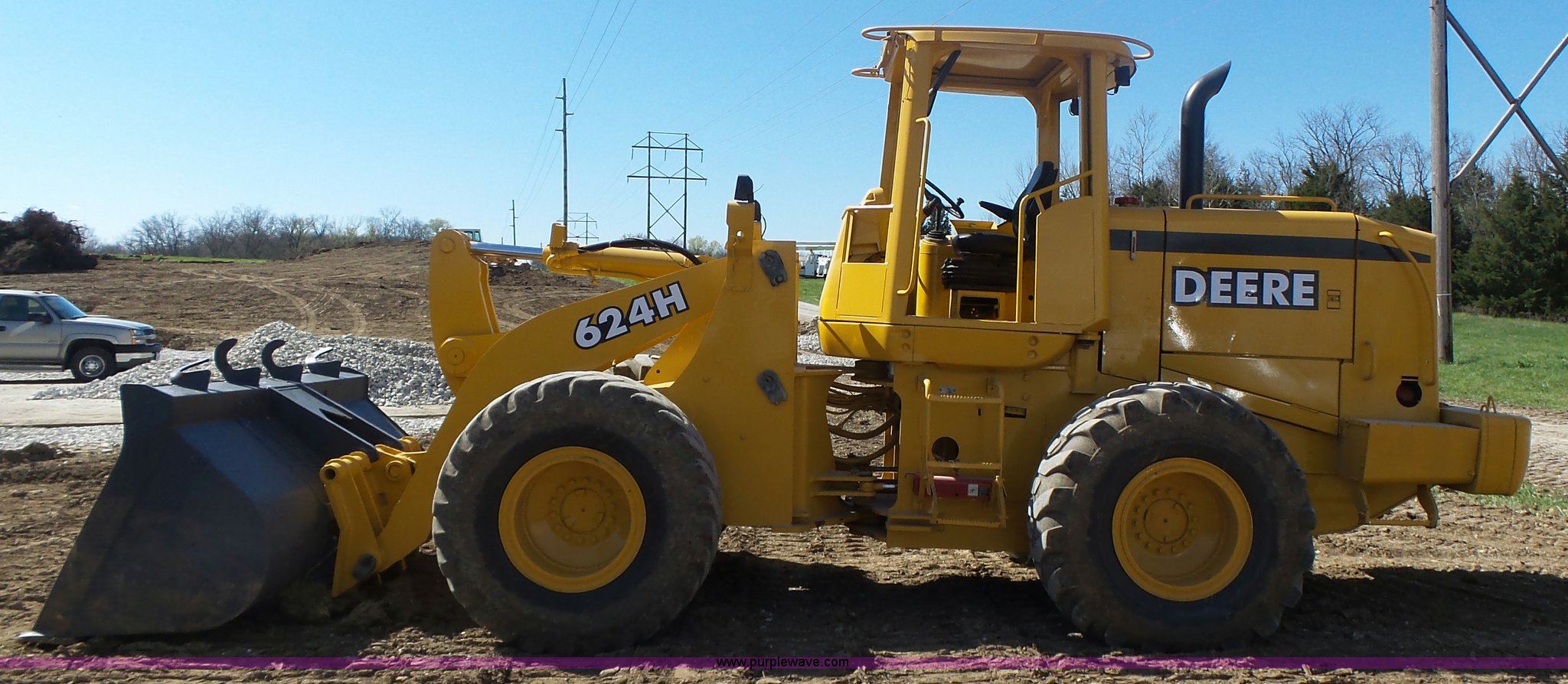 Purple Wave is selling a used Wheel Loader in Missouri. This item is a 1999 John Deere 624H wheel loader with the following: 18,007 hours on meter, John Deere six cylinder turbo diesel engine, Serial T06068H870877, 4F-4R gears, OROPS, Suspension seat, Joystick bucket controls, Front and rear work lights, 104"W general purpose bucket, Bolt-on cutting edge, Quick coupler, 20.5-25 tires, 29,894 lbs. base operating weight, Serial W624HX572944