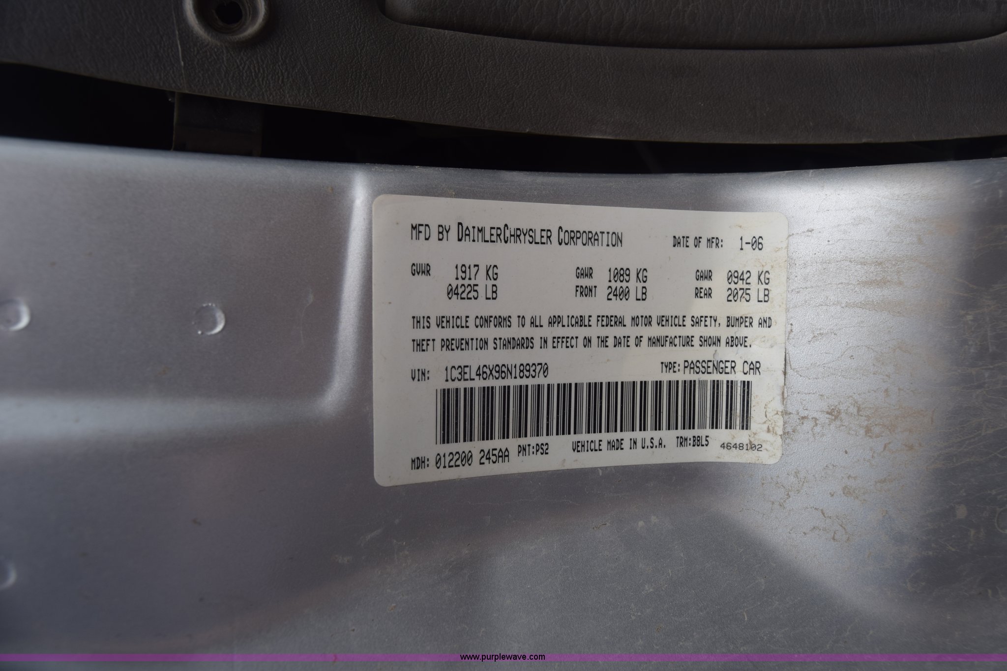 2006 Chrysler Sebring. Unknown miles on odometer, 2.4L L4 DOHC 16V gas engine, Manual transmission, AC and heat, AM/FM/CD, Power windows, locks, and mirrors, Cloth interior, 205/60R16 tires, Interior/exterior cosmetic damage, Dents, Scratches, Broken window, Case# 16C006961. Vehicle is abandoned. Condition and history are unknown. No additional information is available. Vehicle does not have keys unless notated otherwise in the item listing.. View City Of Wichita Terms for title acquisition and item removal requirements.. 1C3EL46X96N189370. Tow Service Inc.. 3760 S Broadway. Wichita, KS 67216