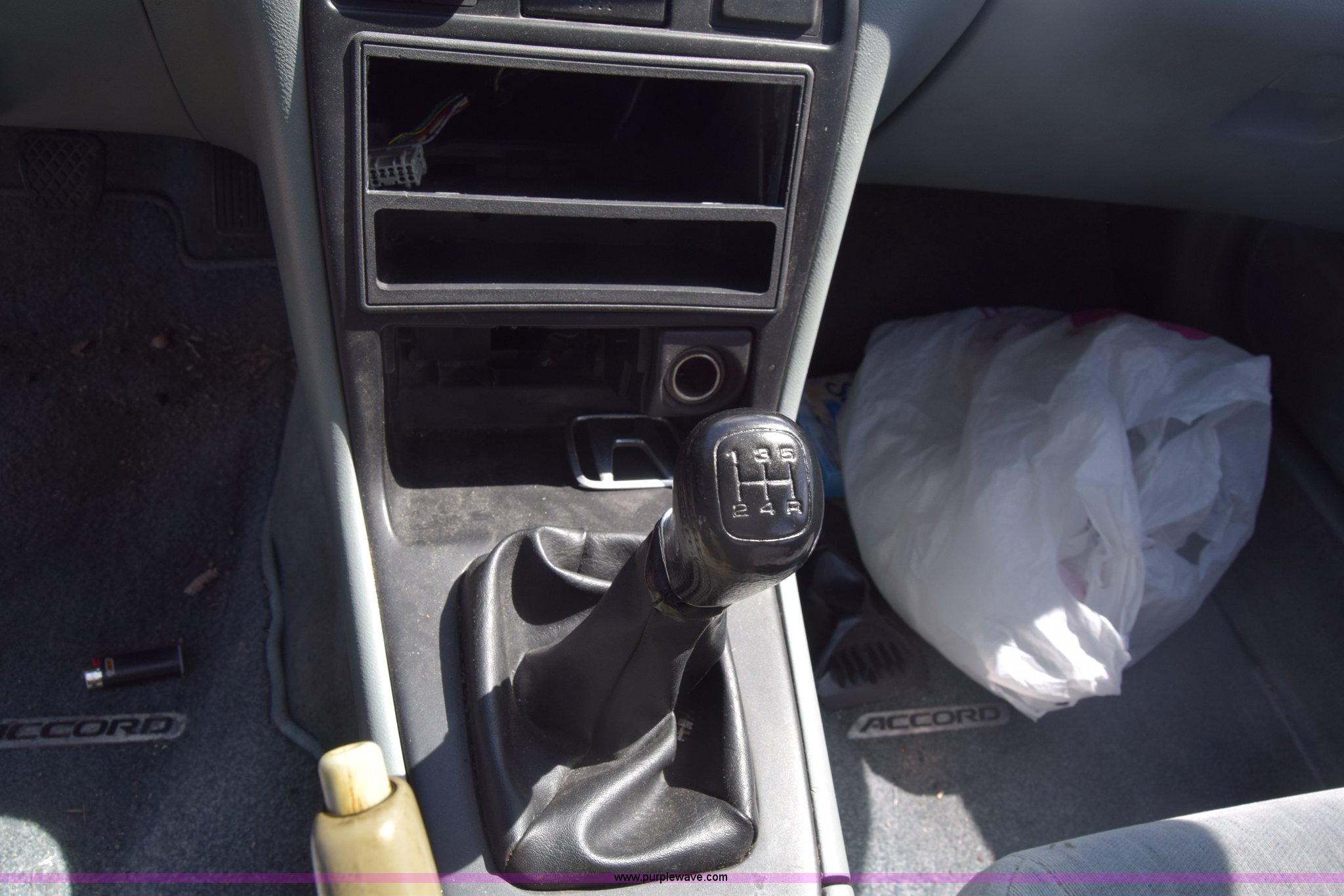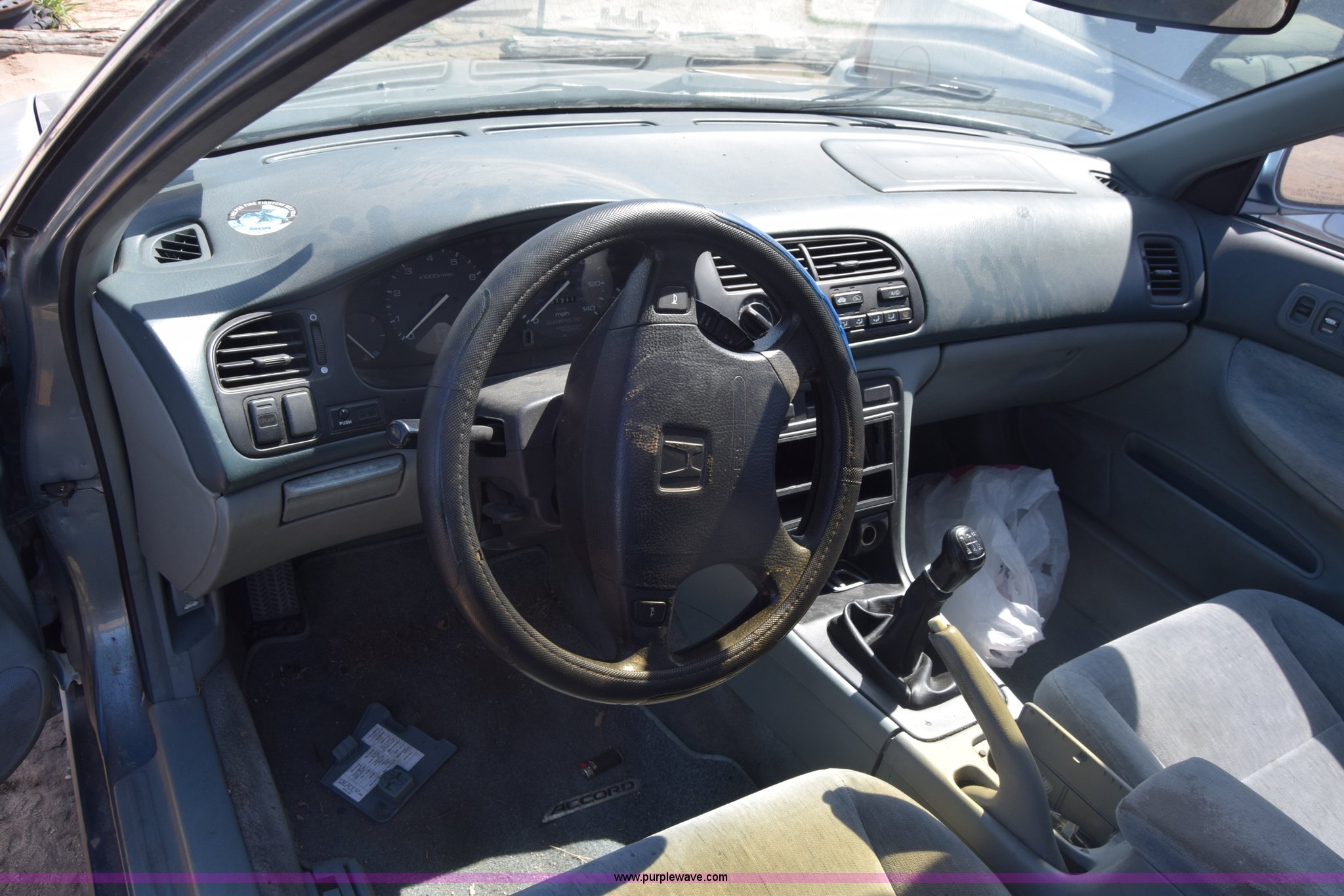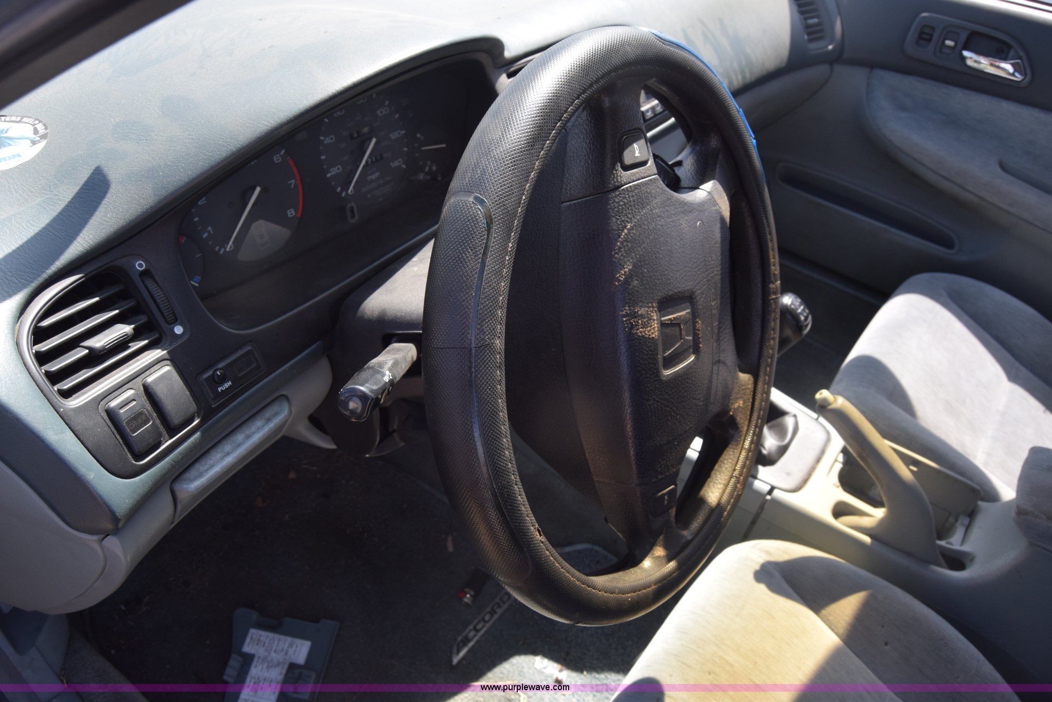 Purple Wave is selling a used Passenger Vehicle in Kansas. This item is a 1994 Honda Accord with the following: 157,211 miles on odometer, 2.2L L4 SOHC 16V gas engine, Five speed manual transmission, AC and heat, Power windows, locks, and mirrors, Cloth interior, 185/70R14 tires, Interior/exterior cosmetic damage, Dents and scratches, Radio missing, Paint faded, Case# 16C006423