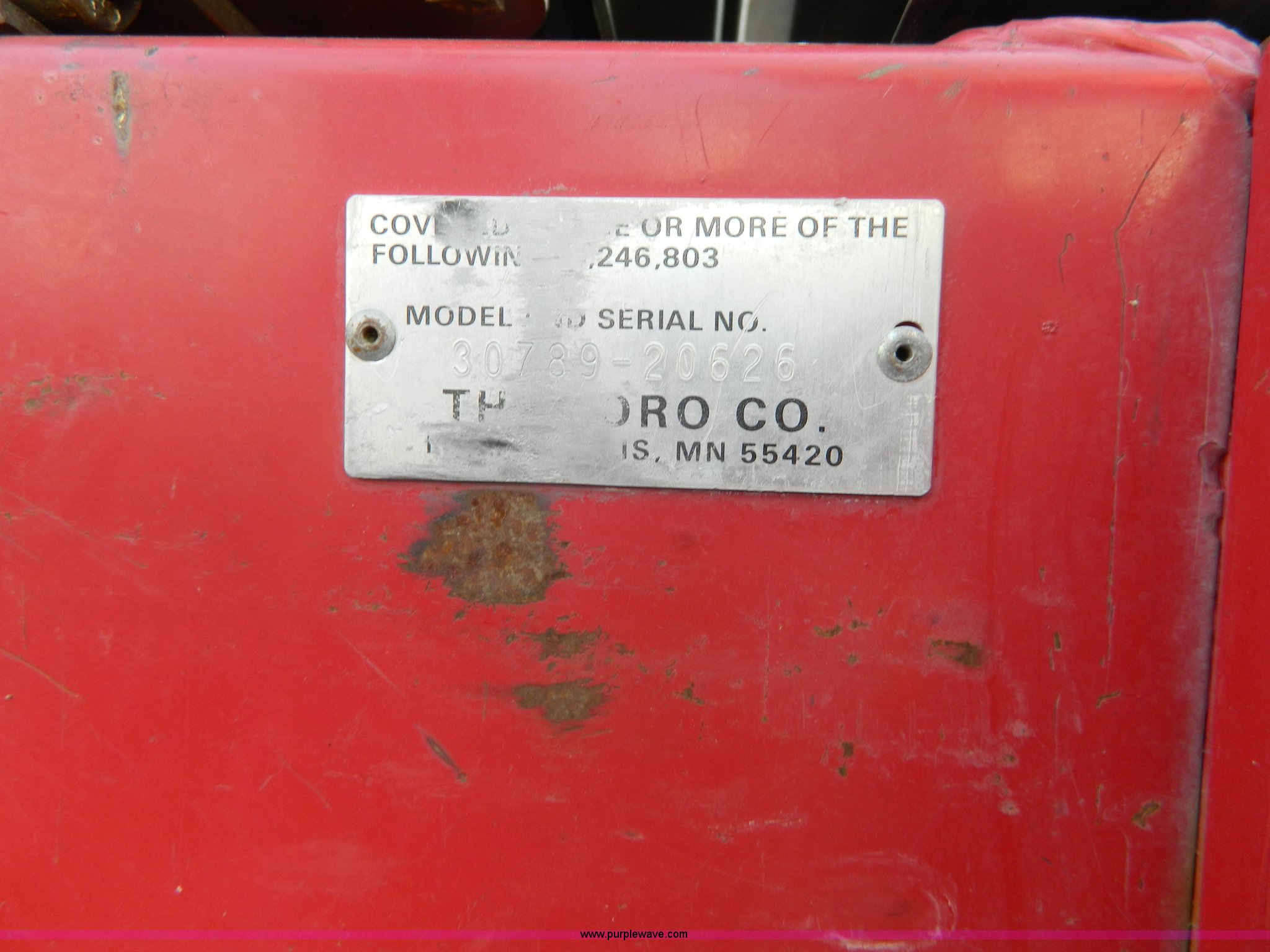 Toro Groundmaster 345 lawn mower. Model 30789, 3,935 hours on meter Hours may vary, still in use, 72" cut, Four cylinder gas engine, Hydrostatic transmission, 16x8.5 front tires, 23x8.5 drive tires, Serial 20626. Hays, KS 67601