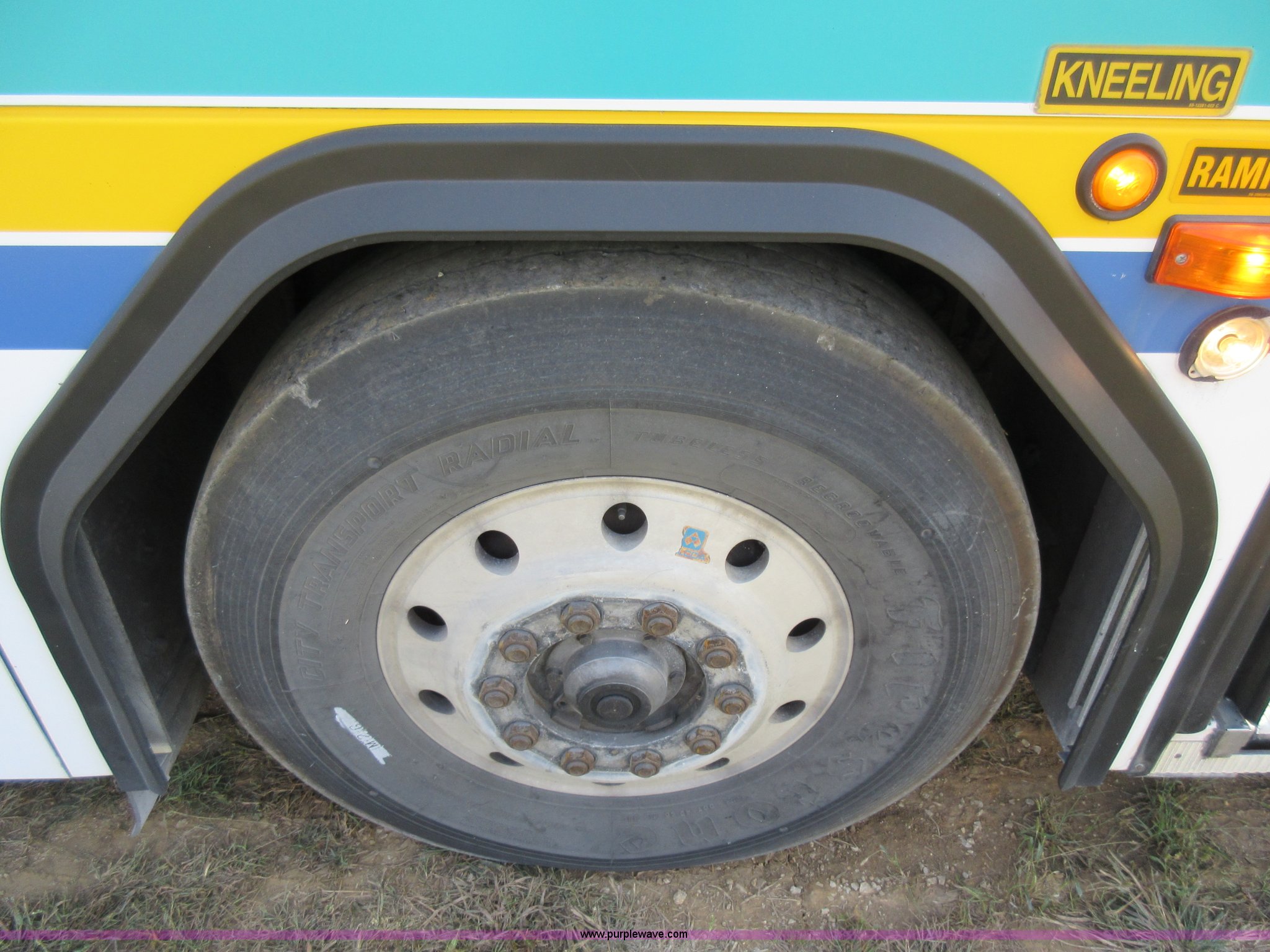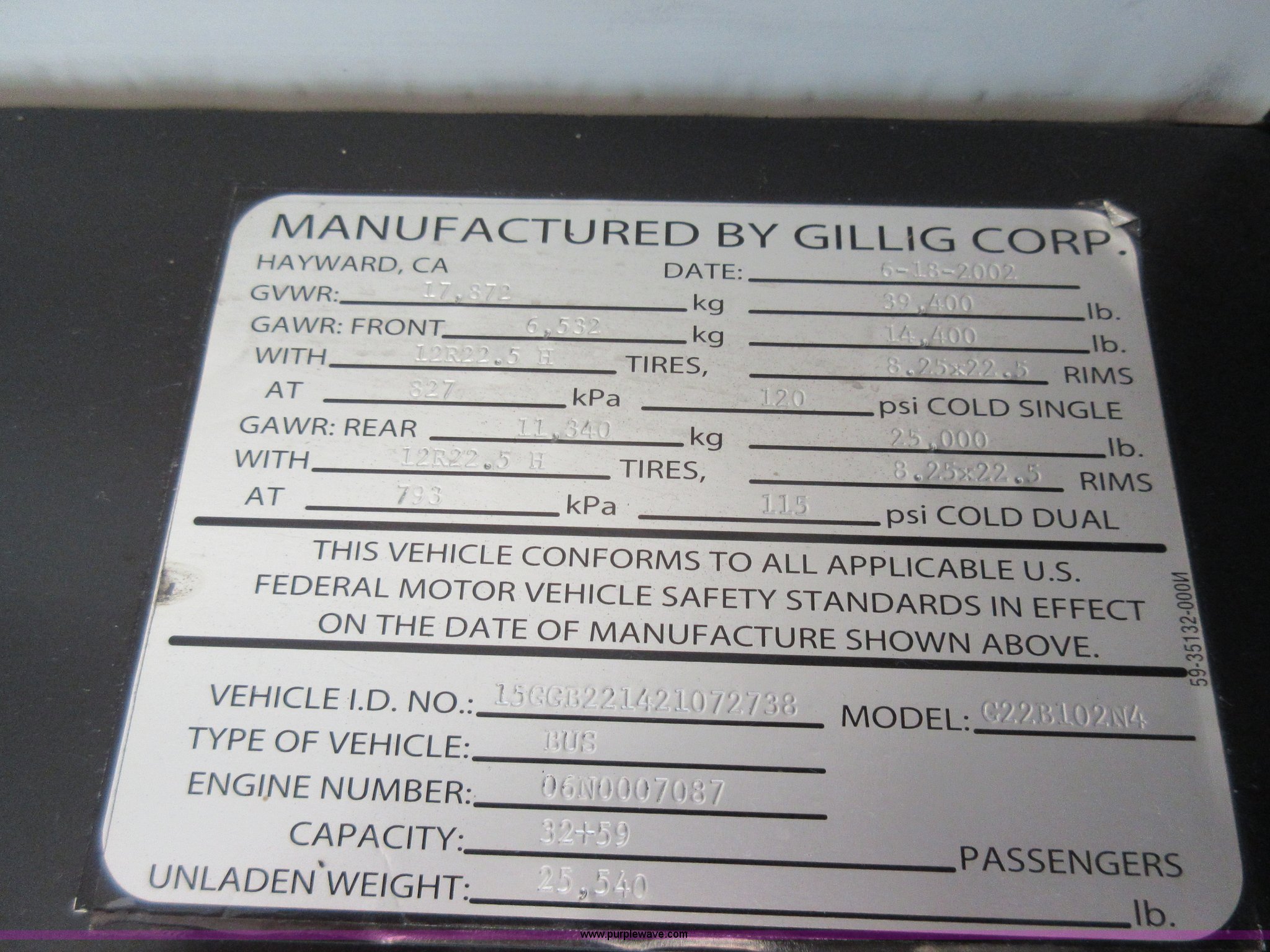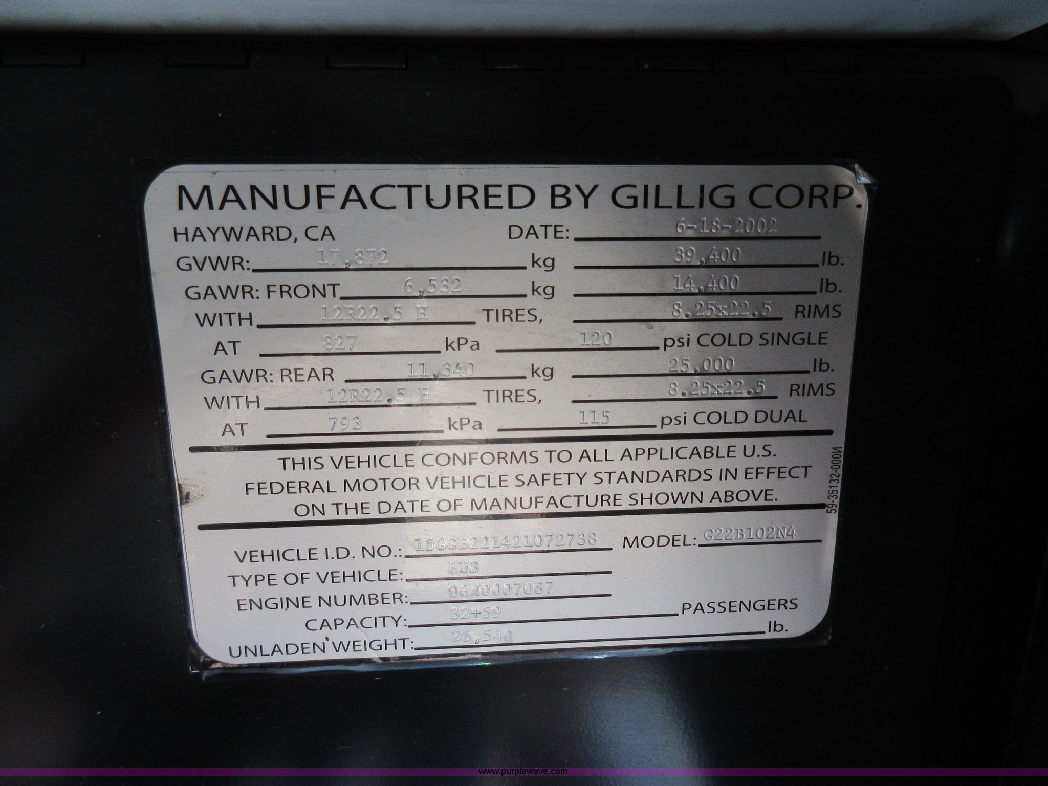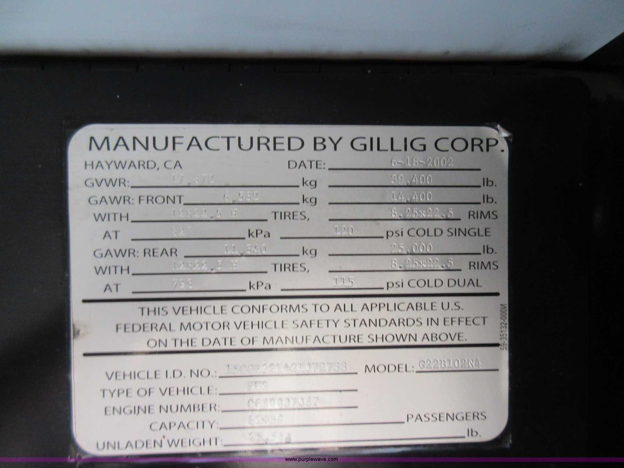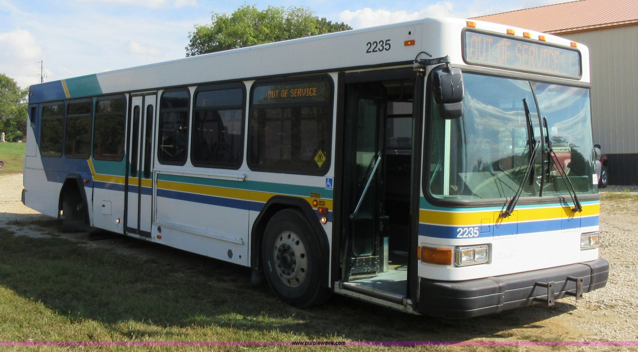 Purple Wave is selling a used Bus in Missouri. This item is a 2002 Gillig Low Floor G22B102N4 transit bus with the following: 450,435 miles on odometer, 164,200 miles on hubometer, Detroit Diesel 8.7L diesel engine, Serial 06N0007087, Automatic transmission, AC and heat, Cloth and vinyl interior, 32 passenger seated capacity, 59 passenger total capacity, Aluminum wheels, 315/80R22.5 tires, GVWR 39,400 lbs, 25,540 lbs unladen weight, Outer wheels removed and are not included, Paint peeling, Scratches and dents