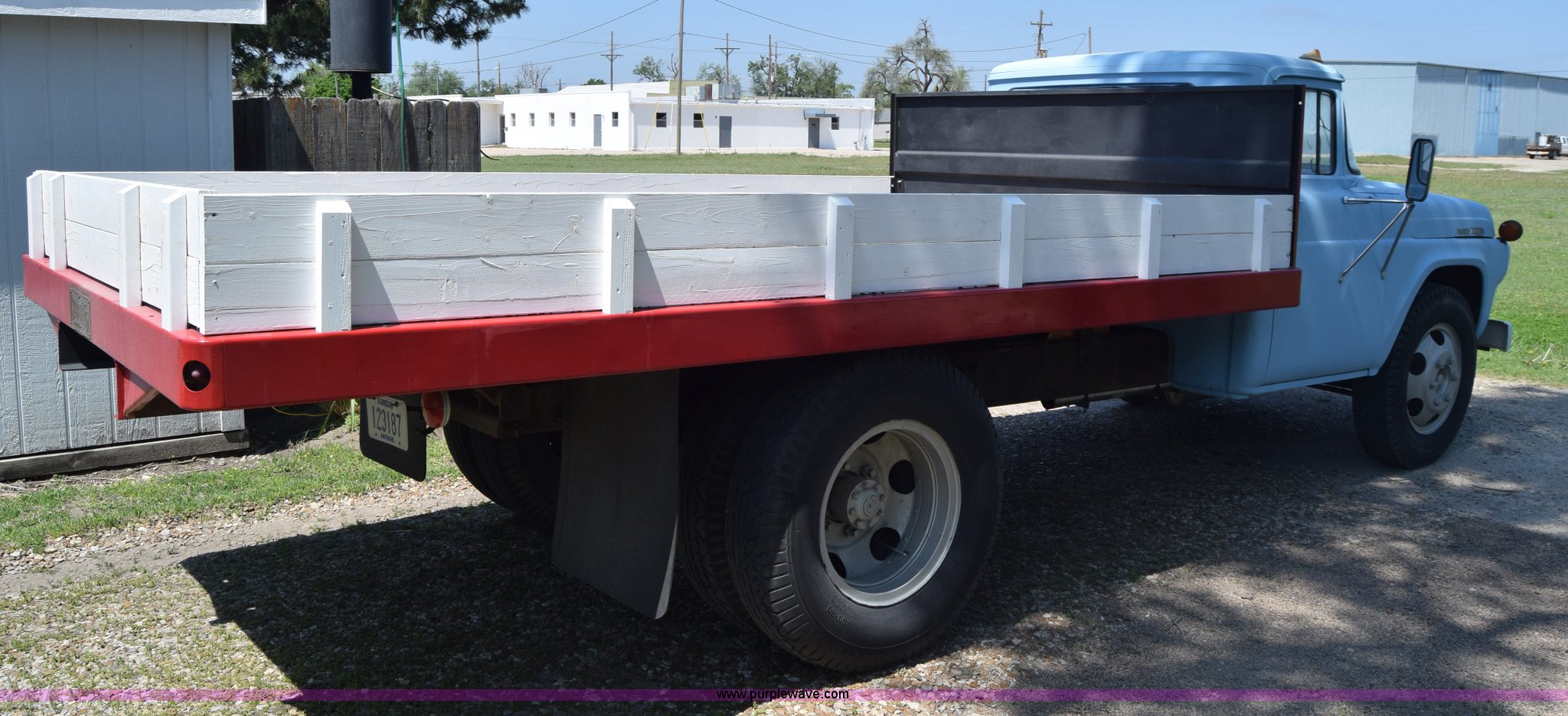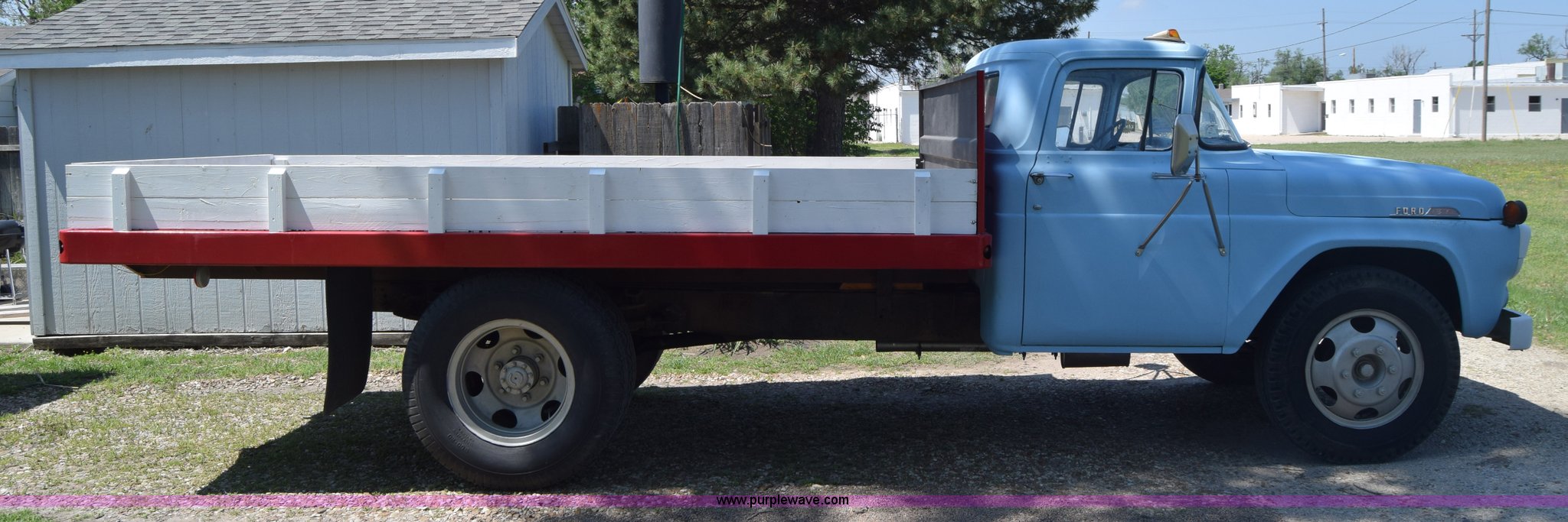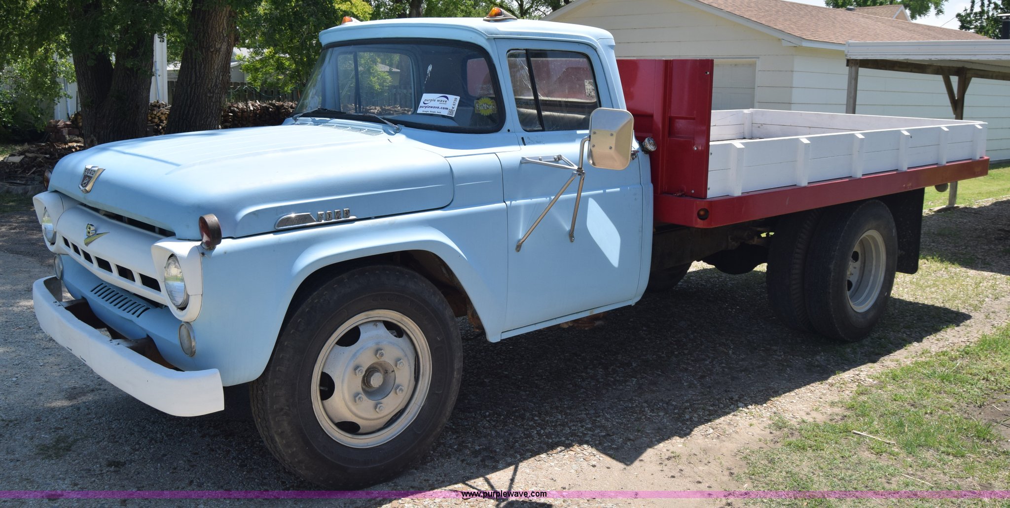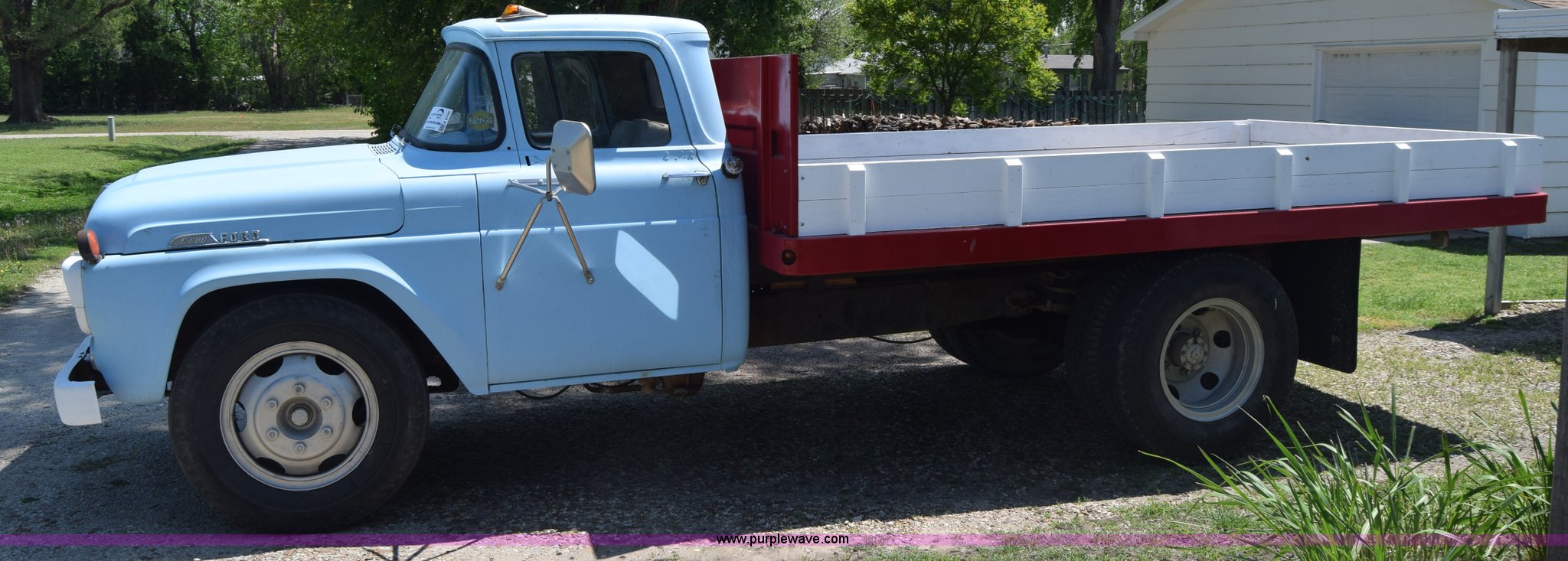 Purple Wave is selling a used Flat Bed Truck in Kansas. This item is a 1957 Ford F600 flatbed truck with the following: 58,728 miles on odometer, Actual mileage unkown, Eight cylinder gas engine, 153 HP, Four speed manual transmission, Heat, Manual windows and locks, Vinyl interior, Knapheide dump flatbed, 13'L x 91"W, Wood floor, Steel sides included, Heil hoist, 154" wheelbase, 9.00-20 tires, GVWR 17,000 lbs