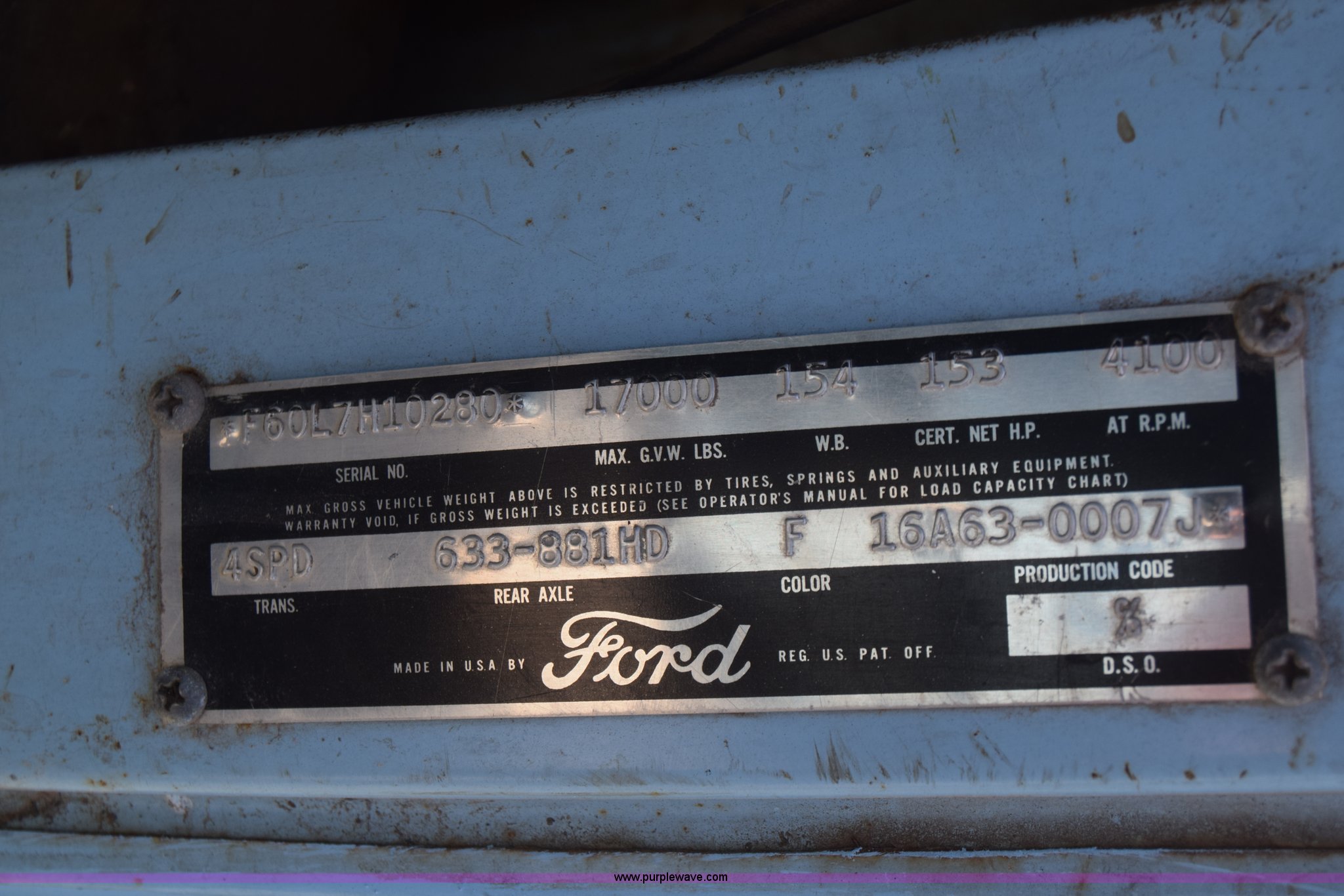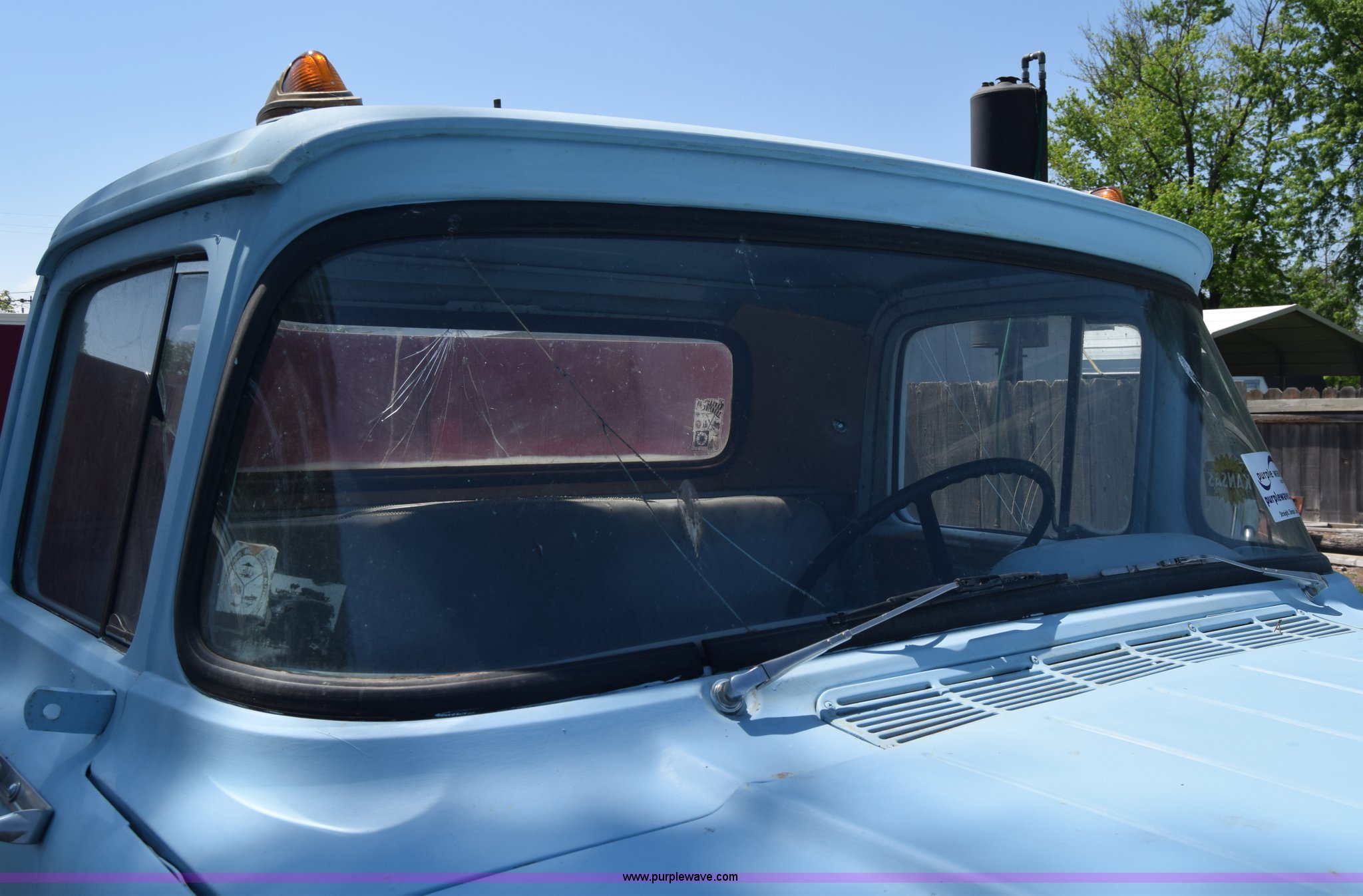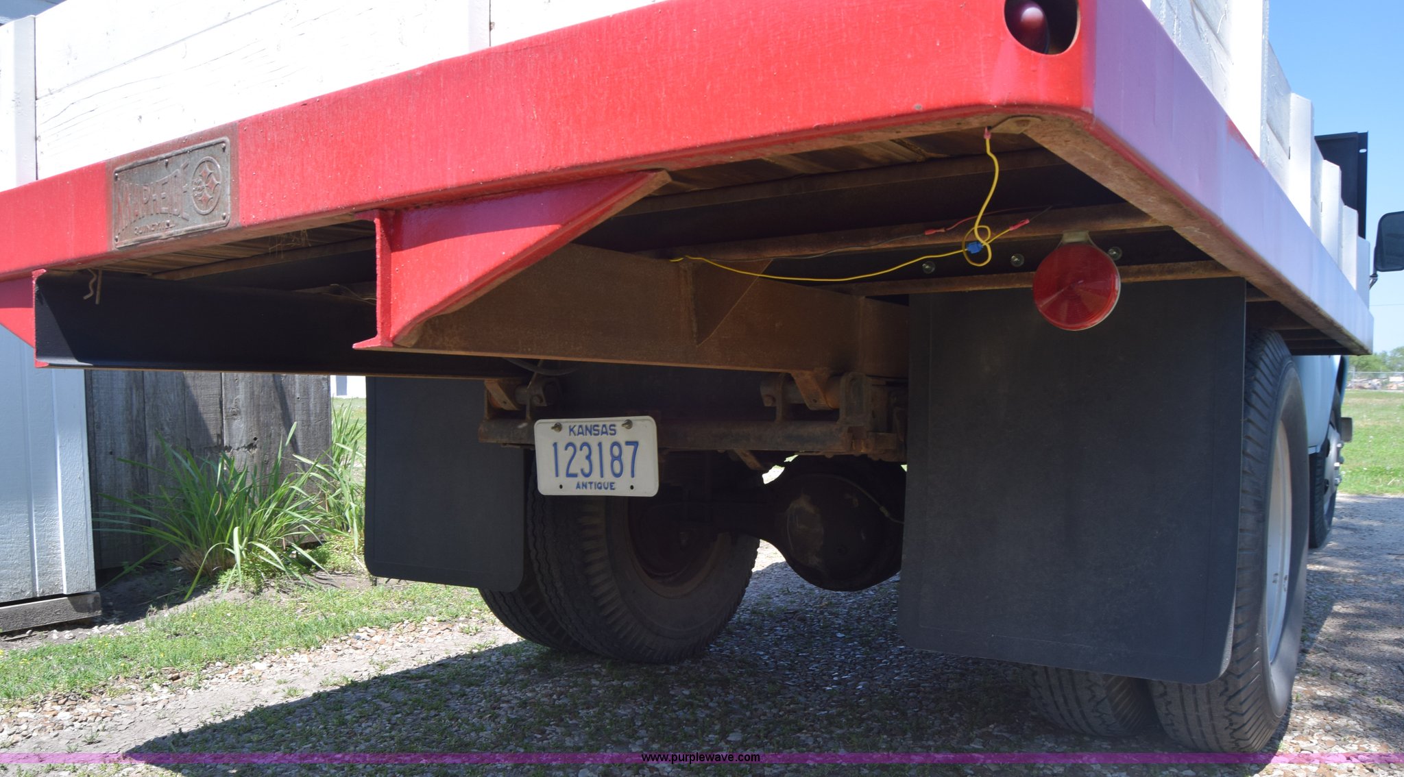 1957 Ford F600 flatbed truck. 58,728 miles on odometer Actual mileage unkown, Eight cylinder gas engine 153 HP, Four speed manual transmission, Heat, Manual windows and locks, Vinyl interior, Knapheide dump flatbed 13'L x 91"W, Wood floor, Steel sides included, Heil hoist, 154" wheelbase, 9.00-20 tires, GVWR 17,000 lbs. Kansas title. Title distribution may be delayed up to 30 days from verification of funds. F60L7H10280. 220 E 3rd. South Hutchinson, KS 67505
