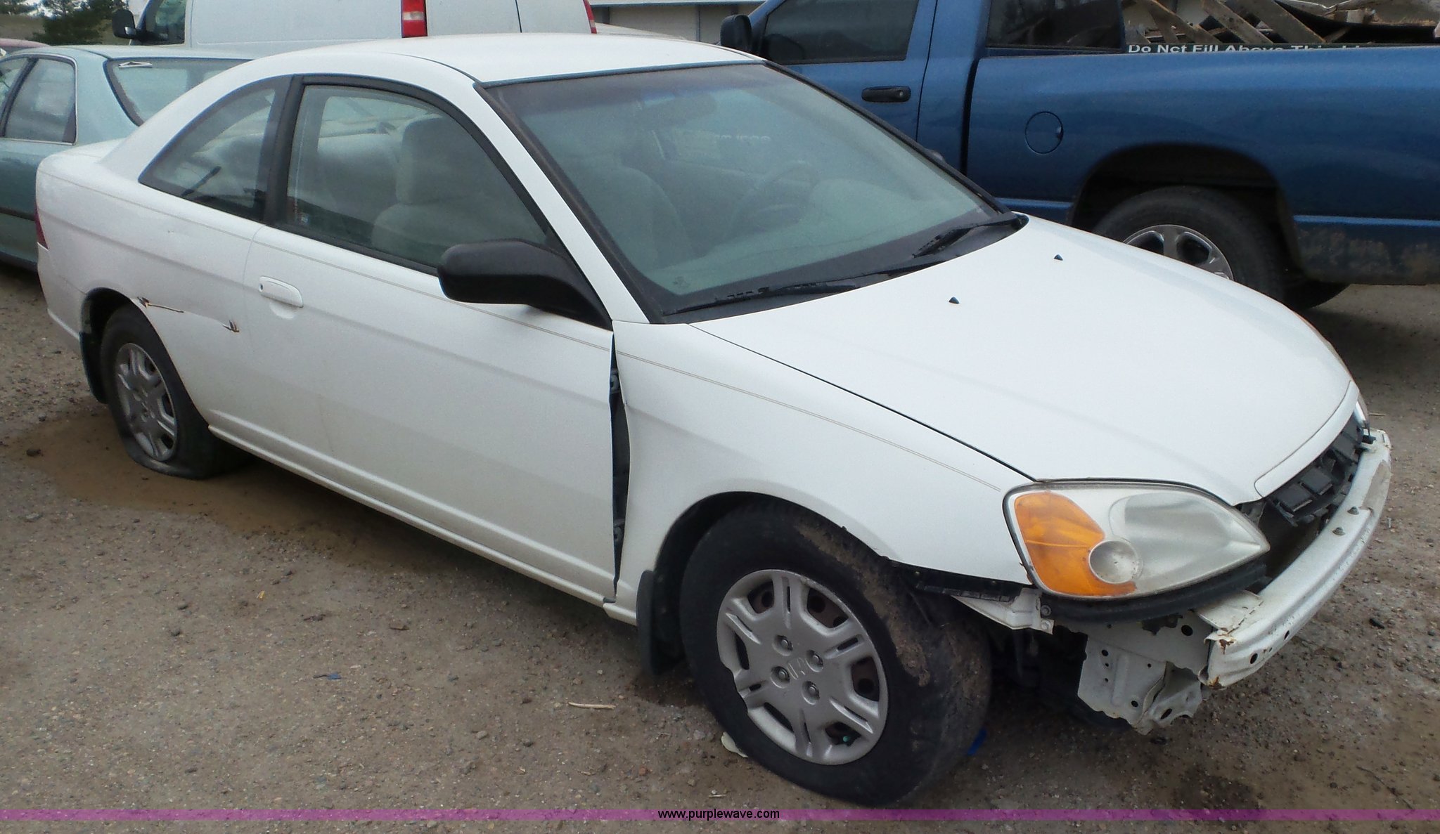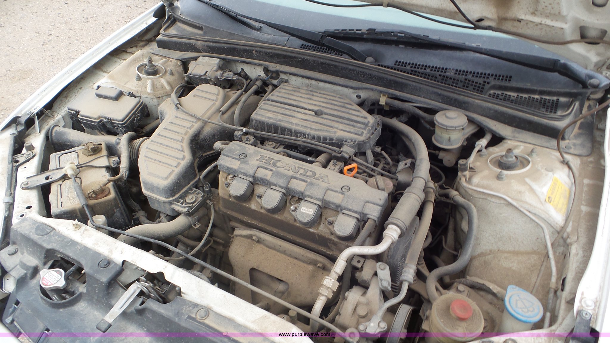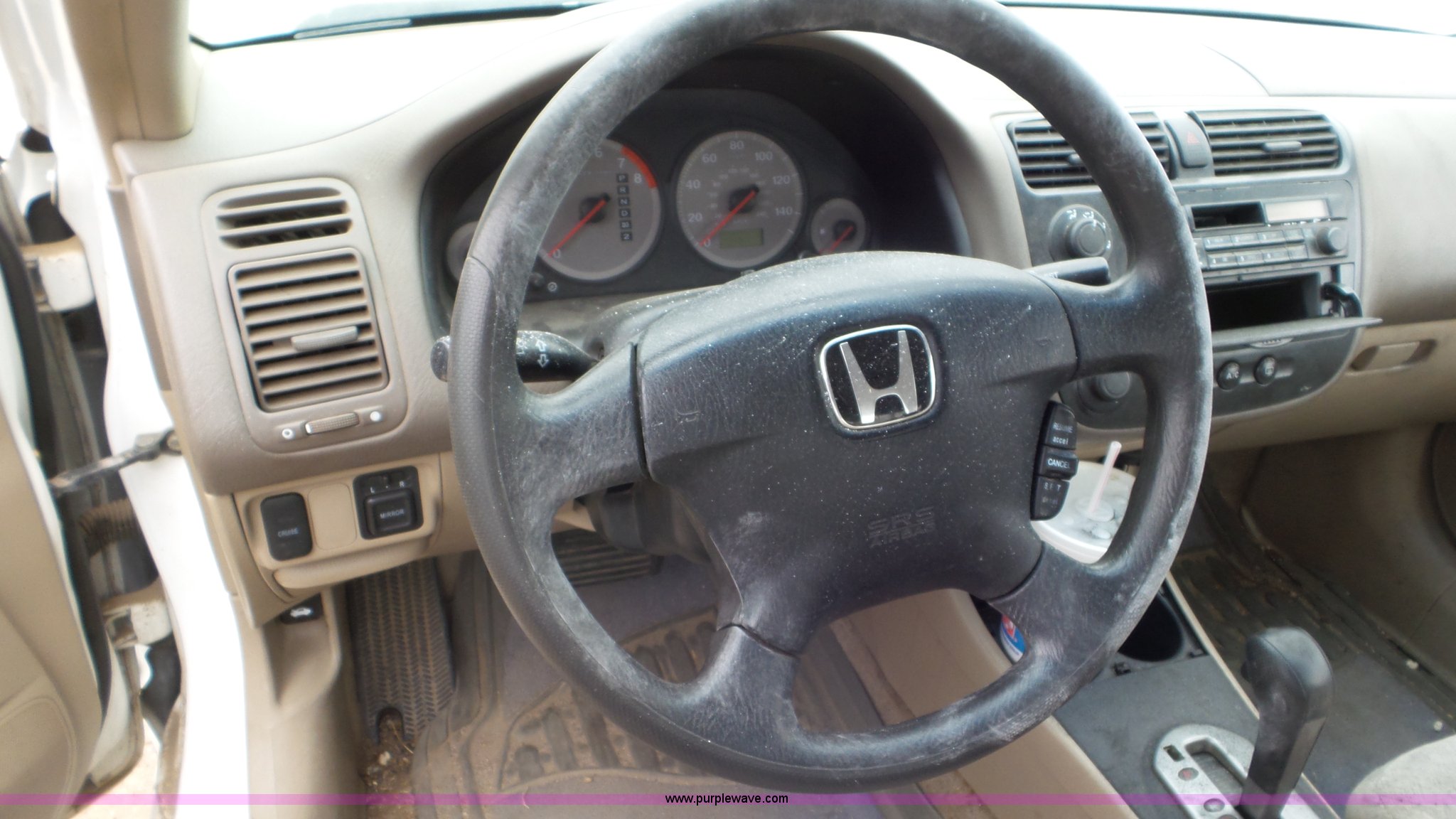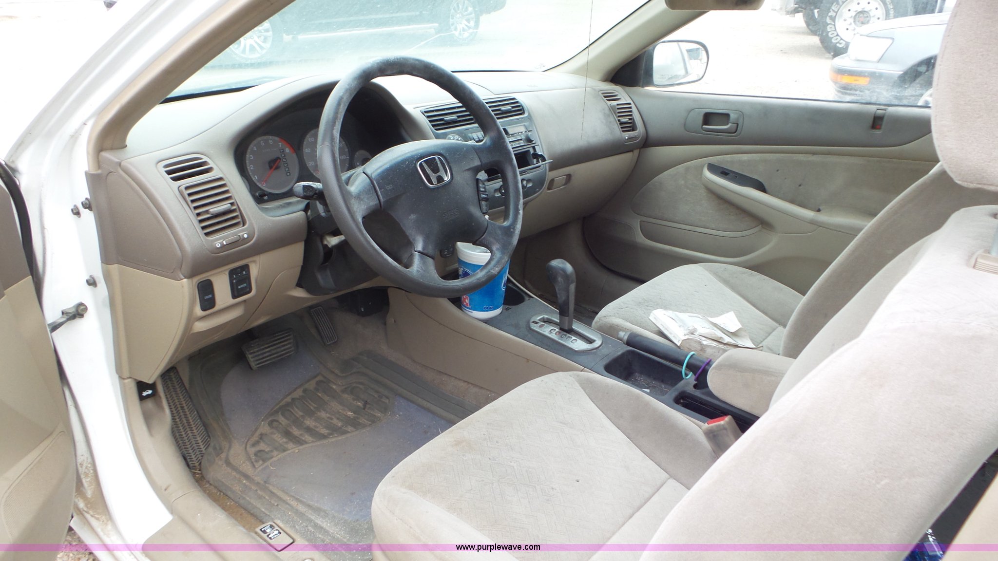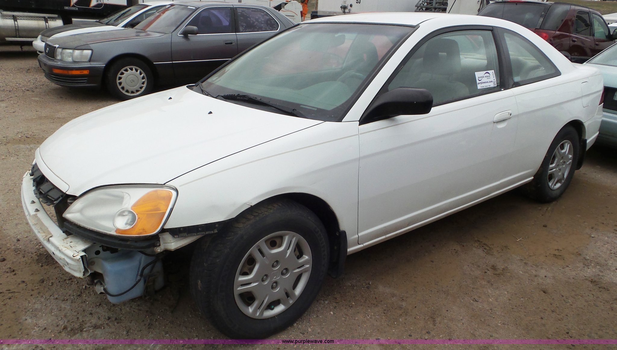 Purple Wave is selling a used Passenger Vehicle in Kansas. This item is a 2002 Honda Civic with the following: Unknown miles on odometer, 1.7L L4 SOHC 16V gas engine, Automatic transmission, AC and heat, Tilt, Cruise, AM/FM, Power windows, locks, and mirrors, Cloth interior, 205/70R14 tires, Interior/exterior cosmetic damage, Cracked windshield, Unknown operating condition, No key