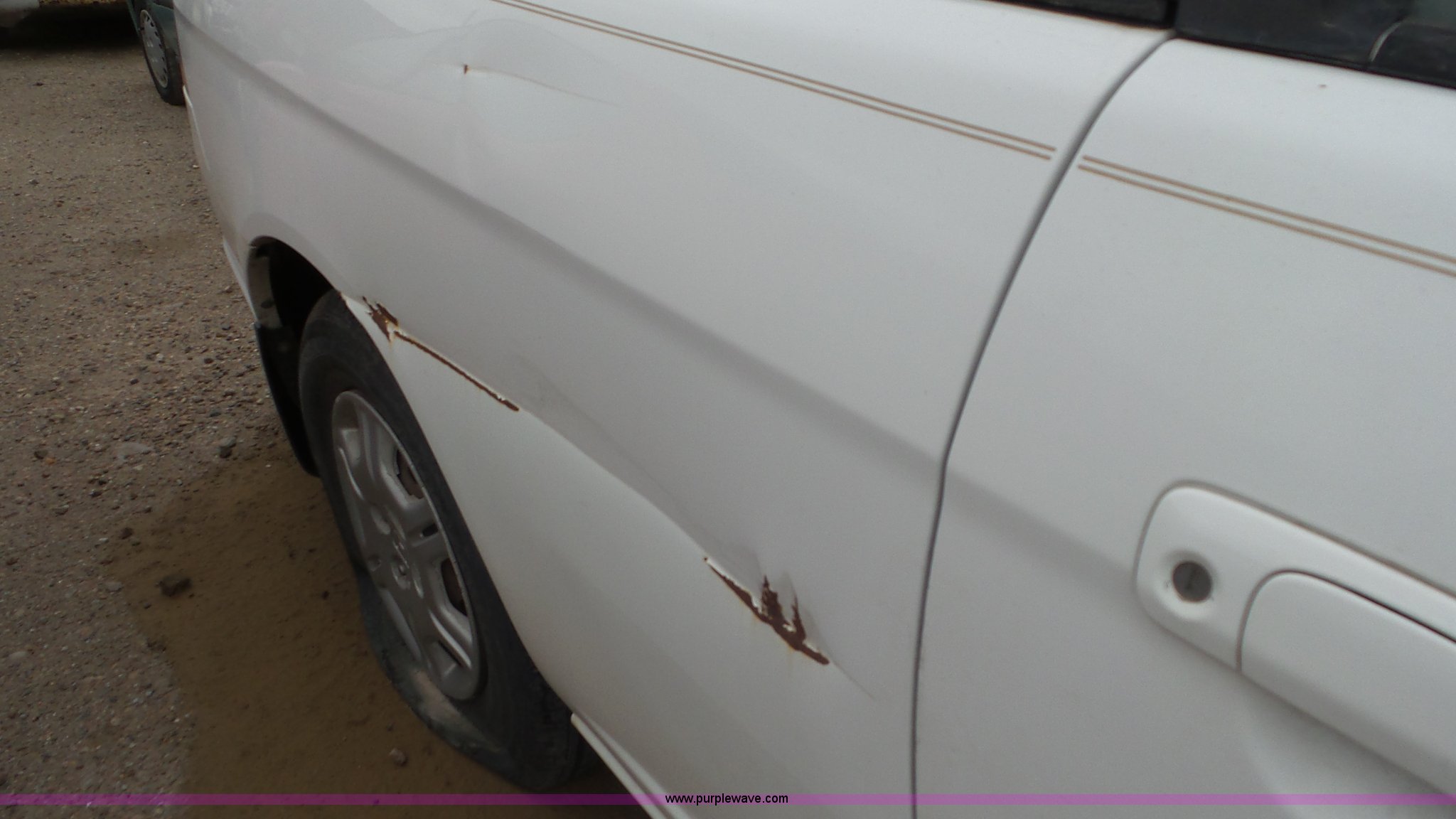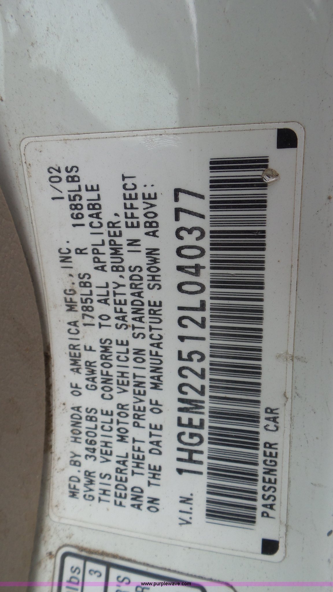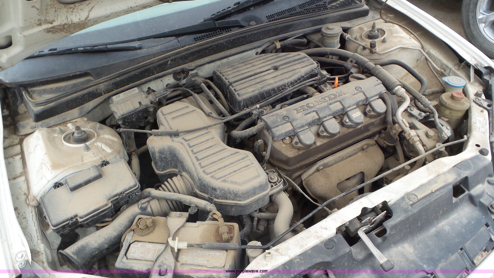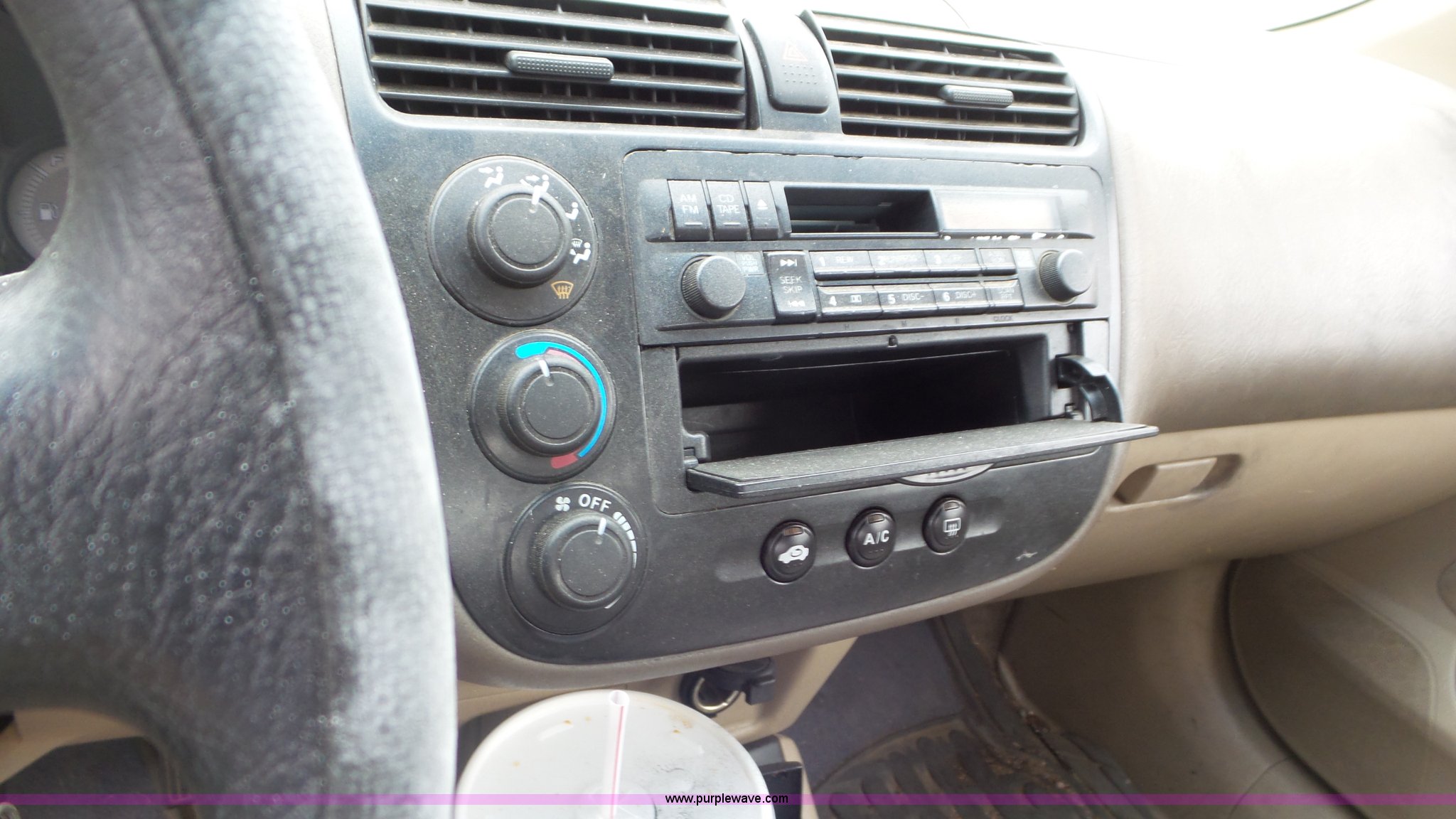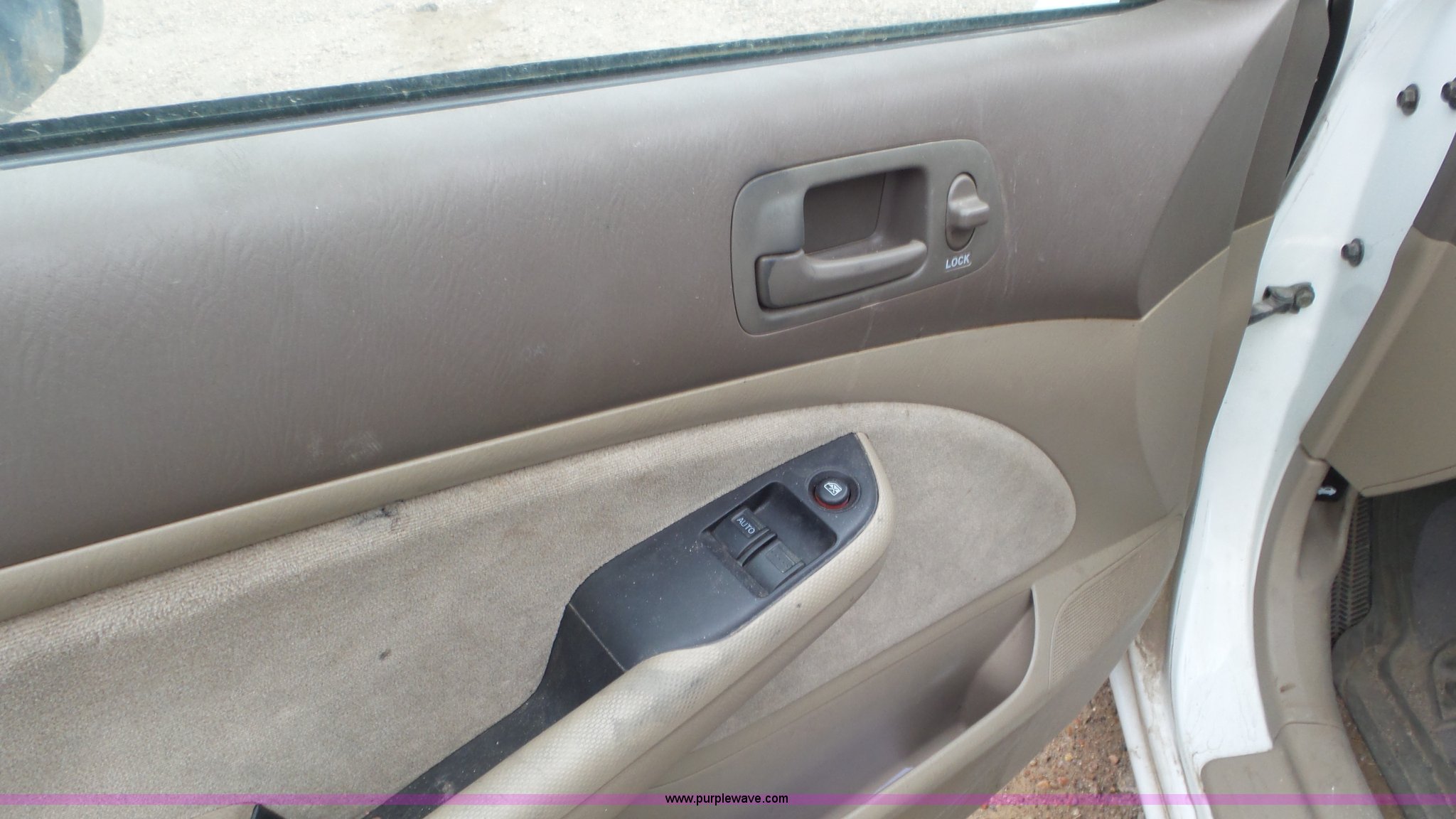 Purple Wave is selling a used Passenger Vehicle in Kansas. This item is a 2002 Honda Civic with the following: Unknown miles on odometer, 1.7L L4 SOHC 16V gas engine, Automatic transmission, AC and heat, Tilt, Cruise, AM/FM, Power windows, locks, and mirrors, Cloth interior, 205/70R14 tires, Interior/exterior cosmetic damage, Cracked windshield, Unknown operating condition, No key