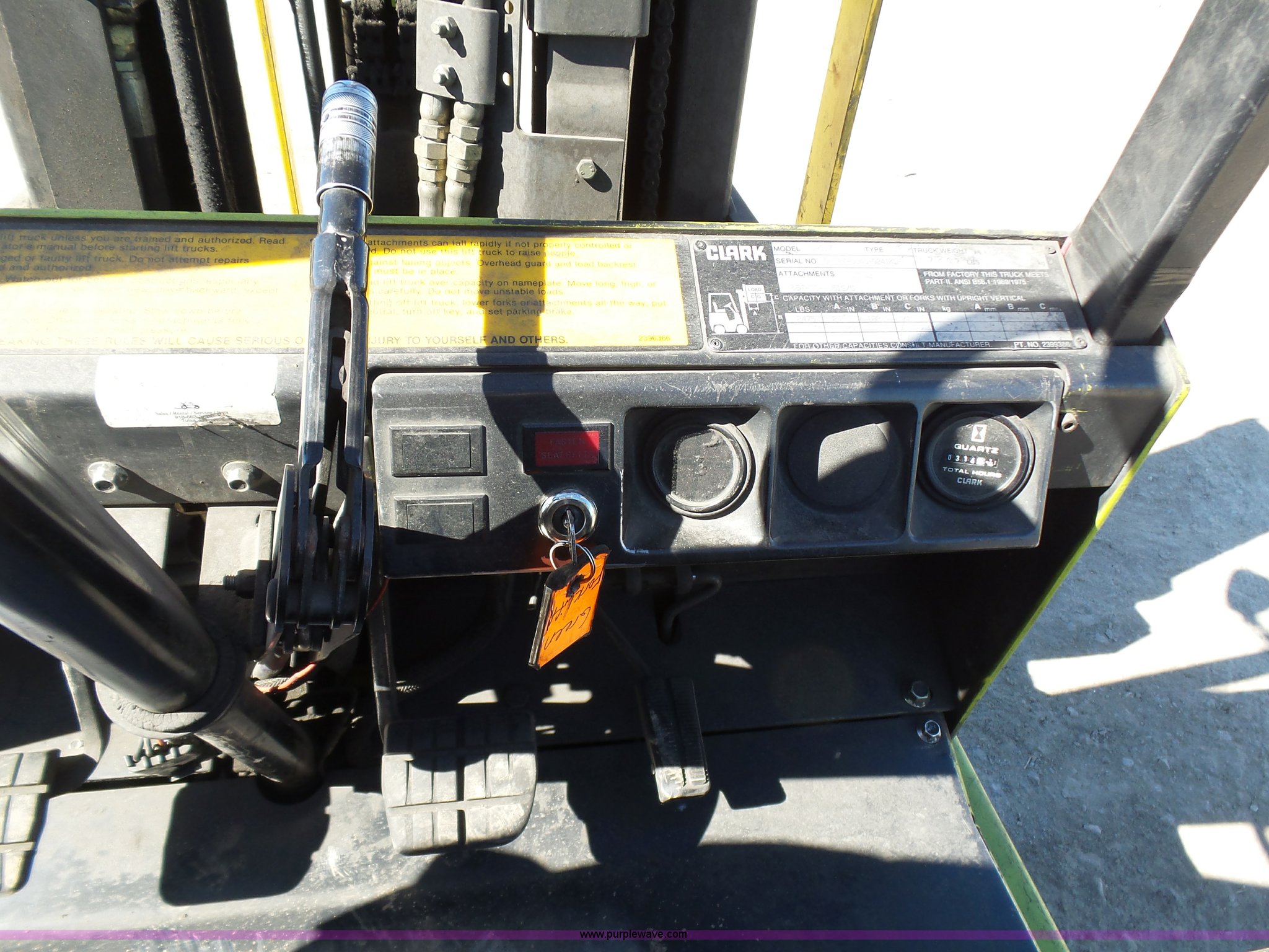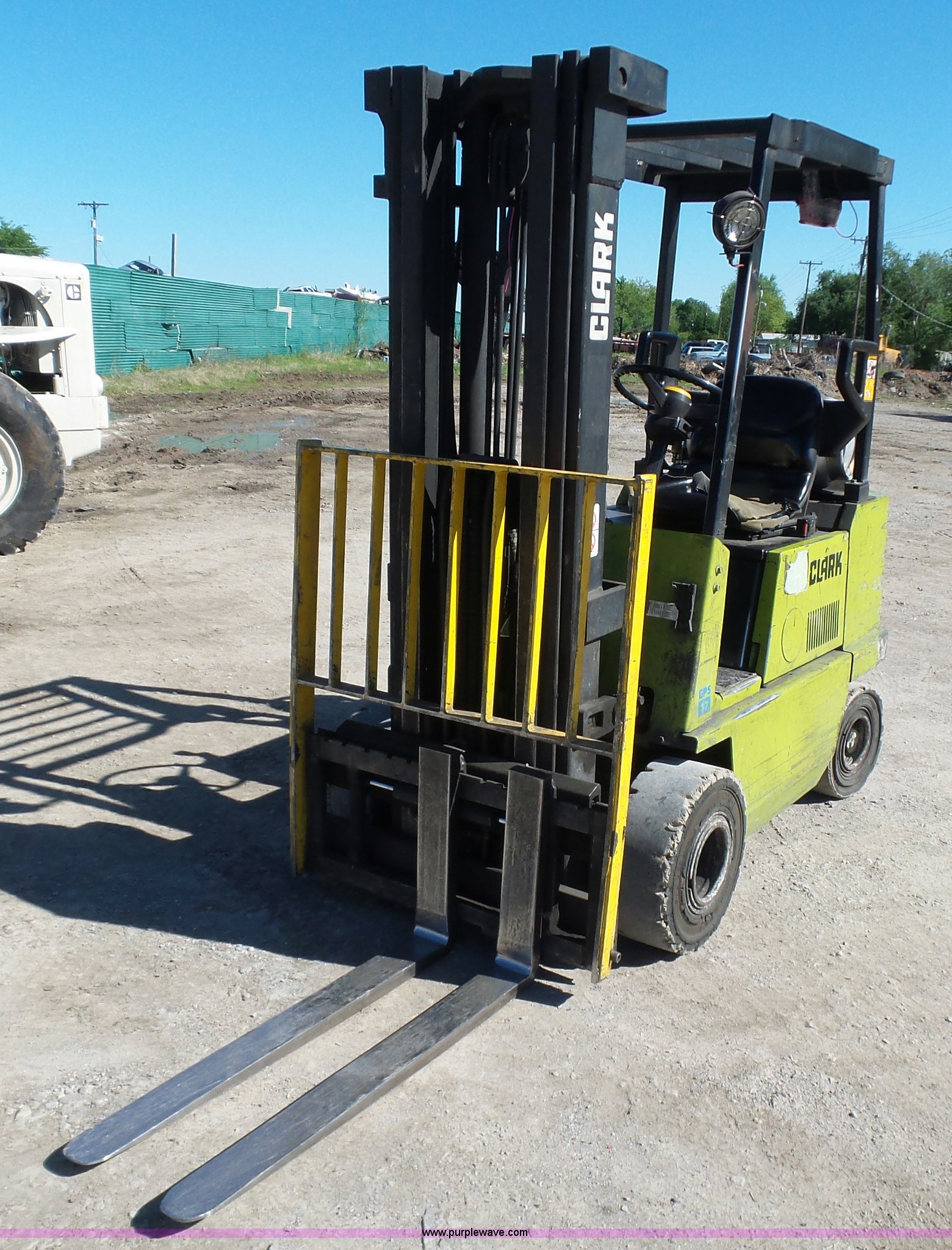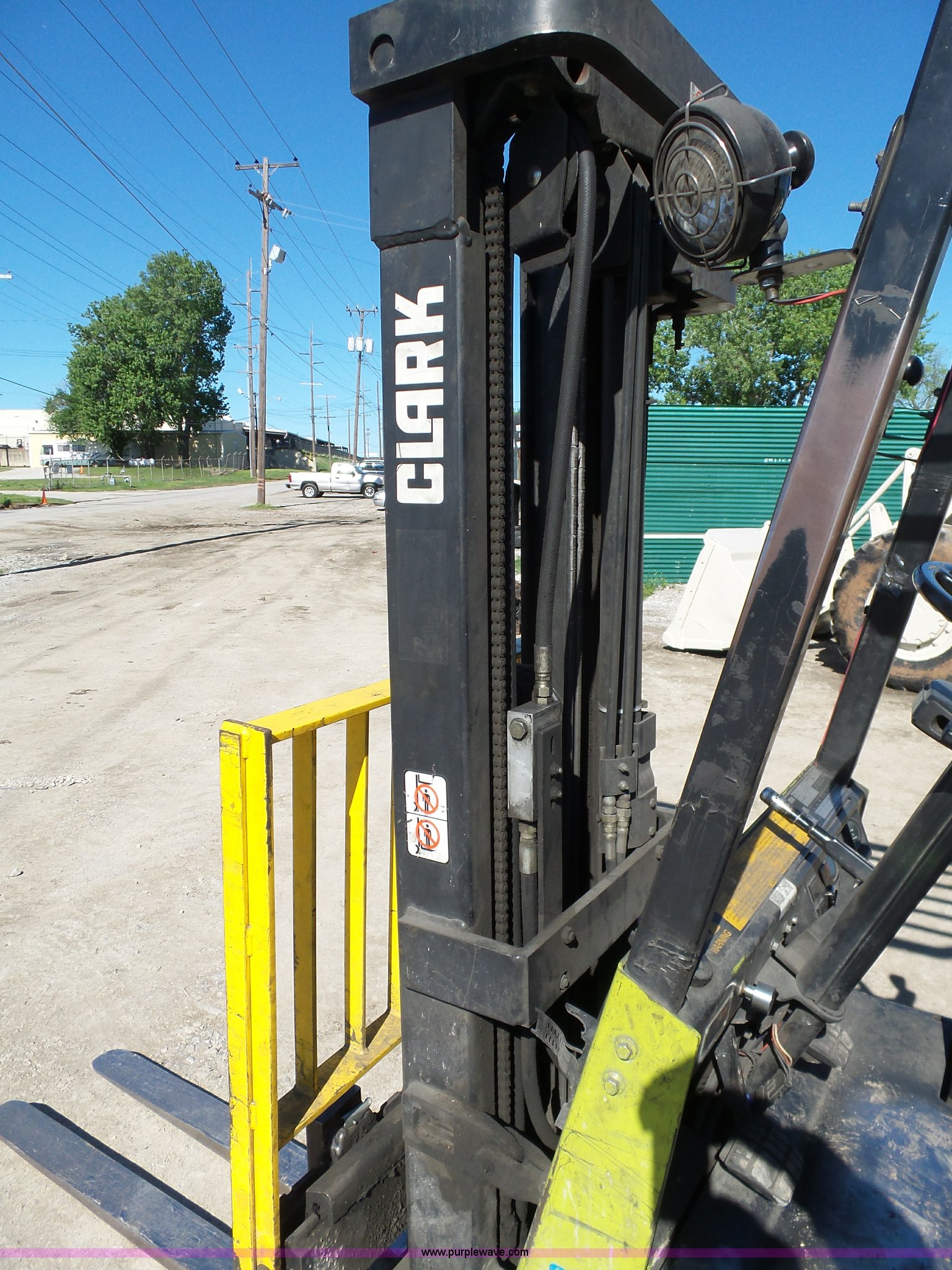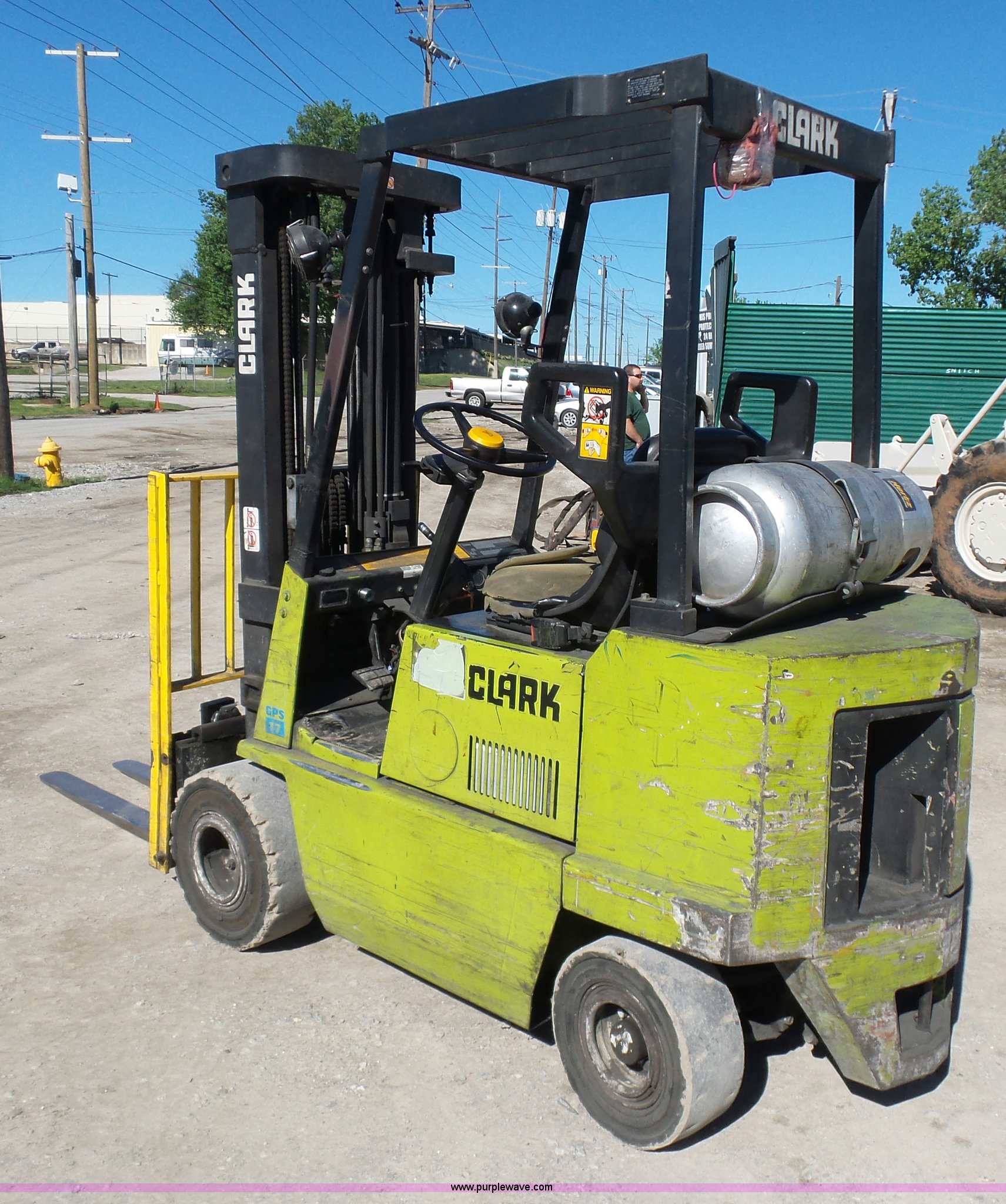 Purple Wave is selling a used Warehouse Forklift in Oklahoma. This item is a Clark GPS17 forklift with the following: 3,104 hours on meter, Four cylinder propane engine, Hydrostatic transmission, 1F-1R gears, Enclosed cab, Work lights, Backup alarm, 2,475 lbs max lift capacity, 188" max lift height, Three mast stages, Side shift, Mast tilt, 41" fork length, Propane tank included, 21x8-9 solid front tires, 18x7-8 solid rear tires, Serial GP127-0045-9241K0F