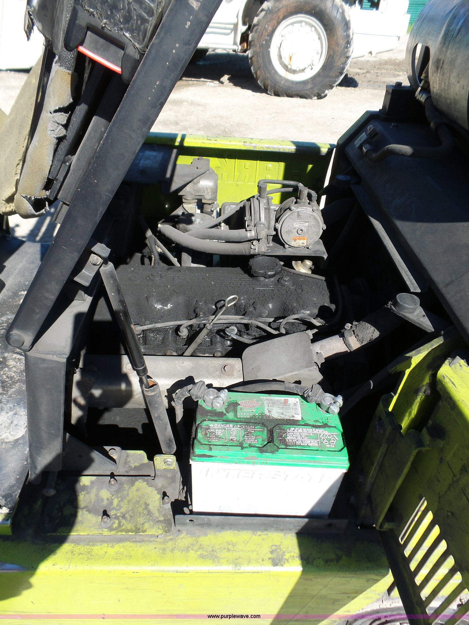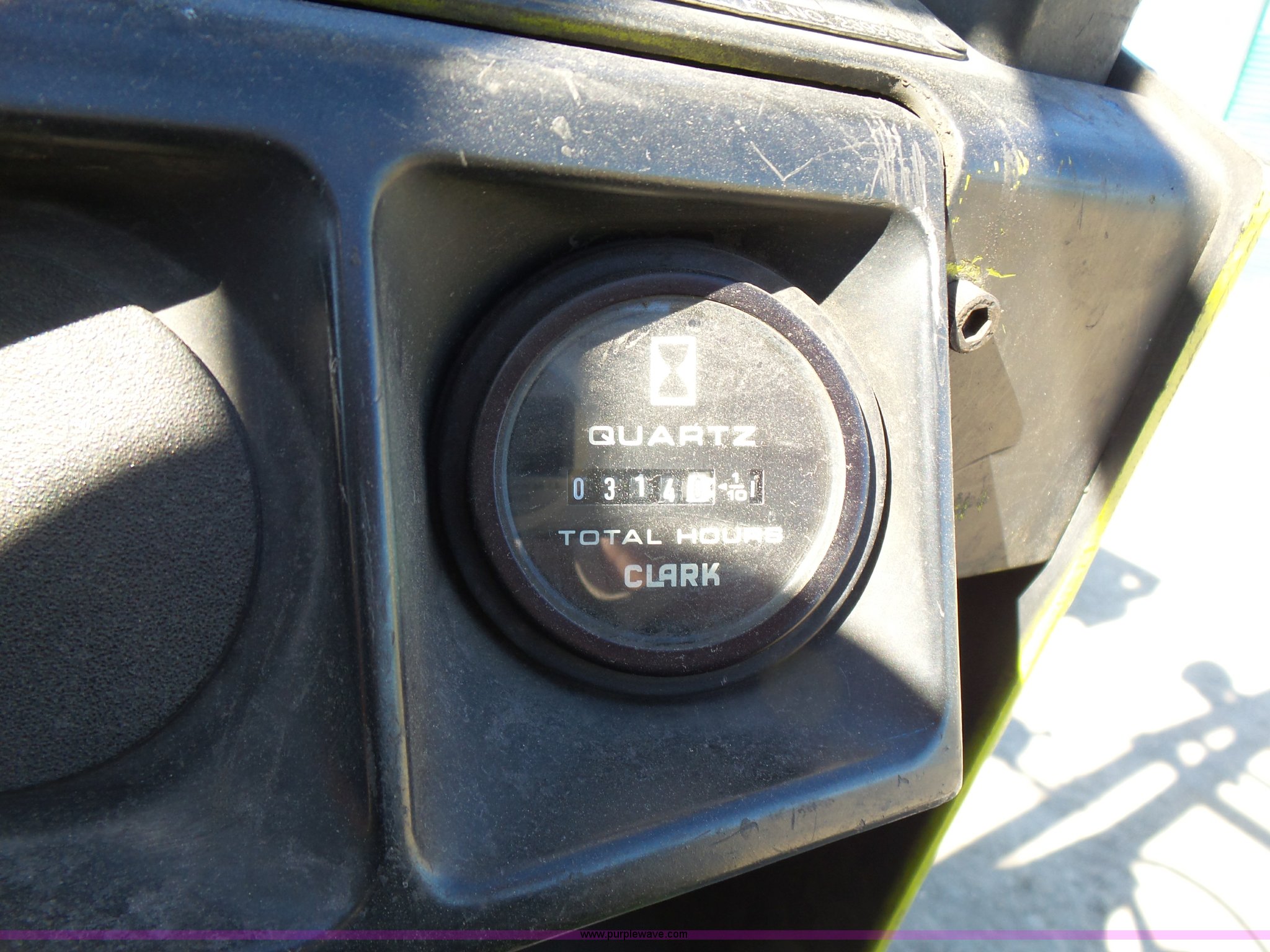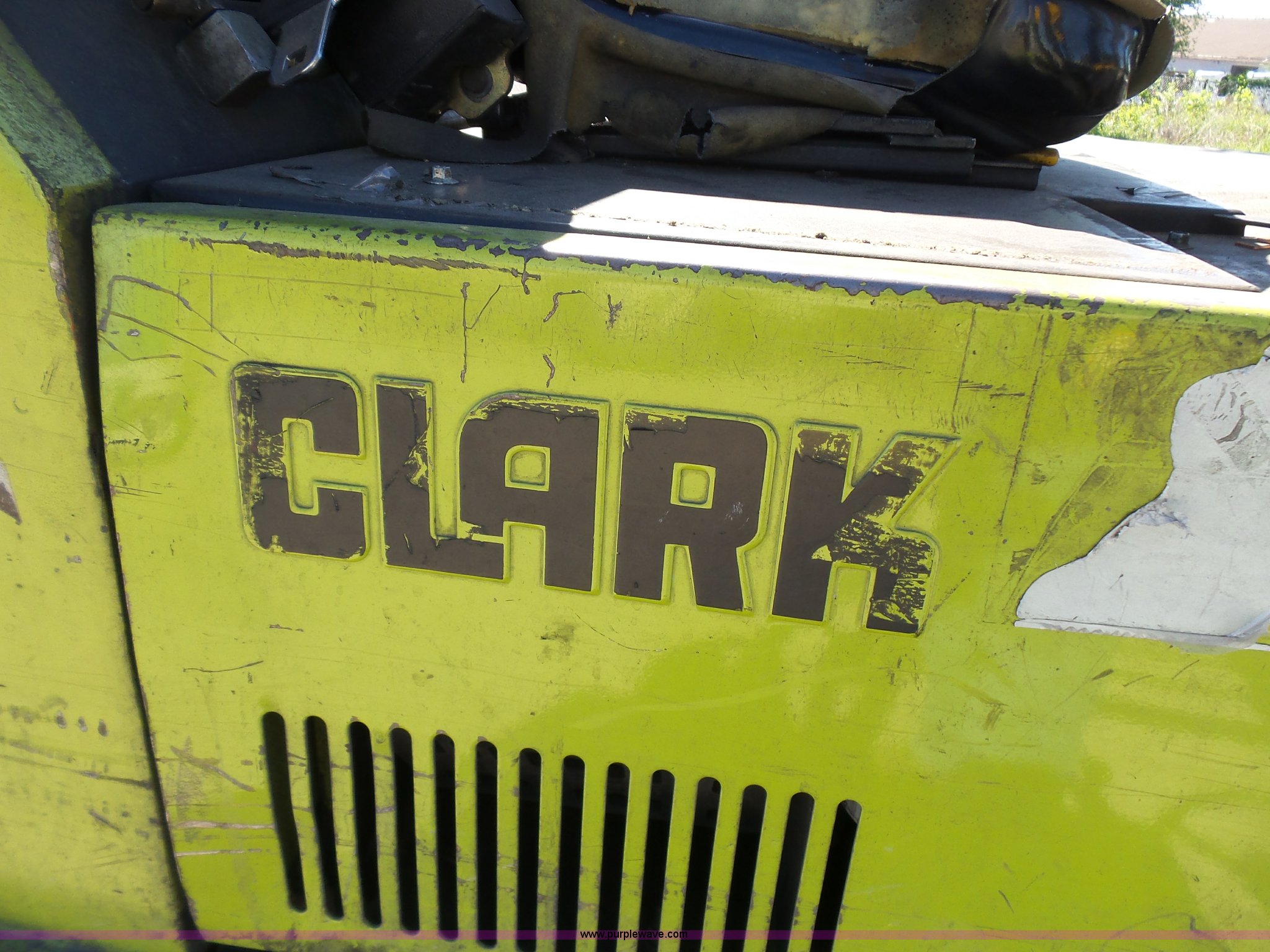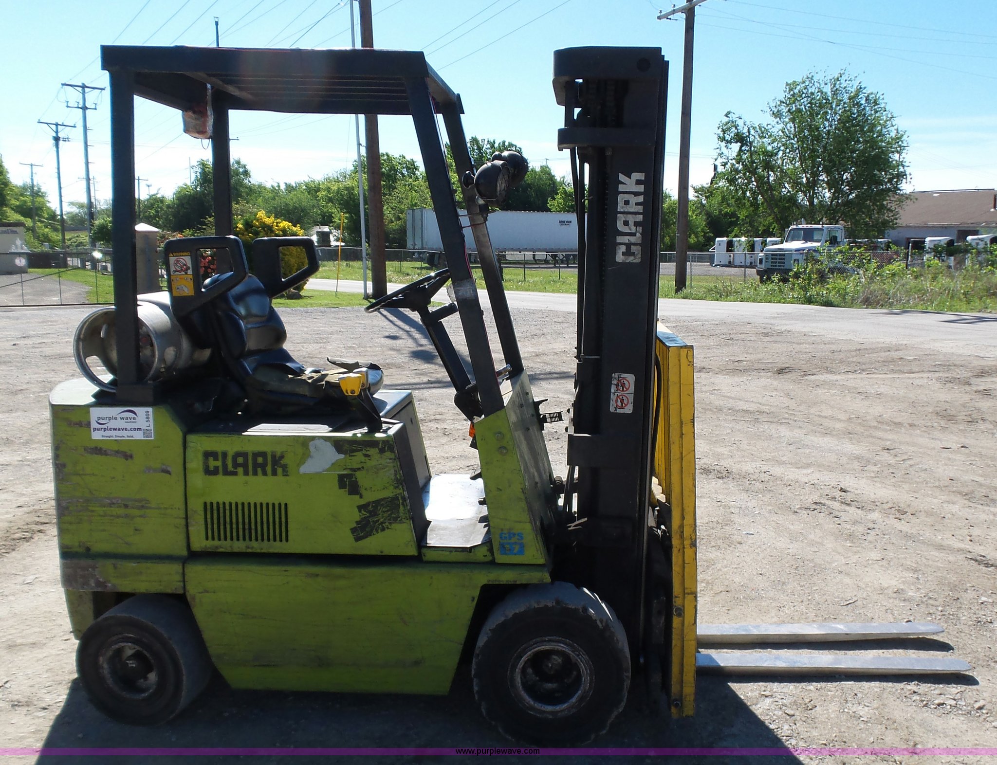 Purple Wave is selling a used Warehouse Forklift in Oklahoma. This item is a Clark GPS17 forklift with the following: 3,104 hours on meter, Four cylinder propane engine, Hydrostatic transmission, 1F-1R gears, Enclosed cab, Work lights, Backup alarm, 2,475 lbs max lift capacity, 188" max lift height, Three mast stages, Side shift, Mast tilt, 41" fork length, Propane tank included, 21x8-9 solid front tires, 18x7-8 solid rear tires, Serial GP127-0045-9241K0F