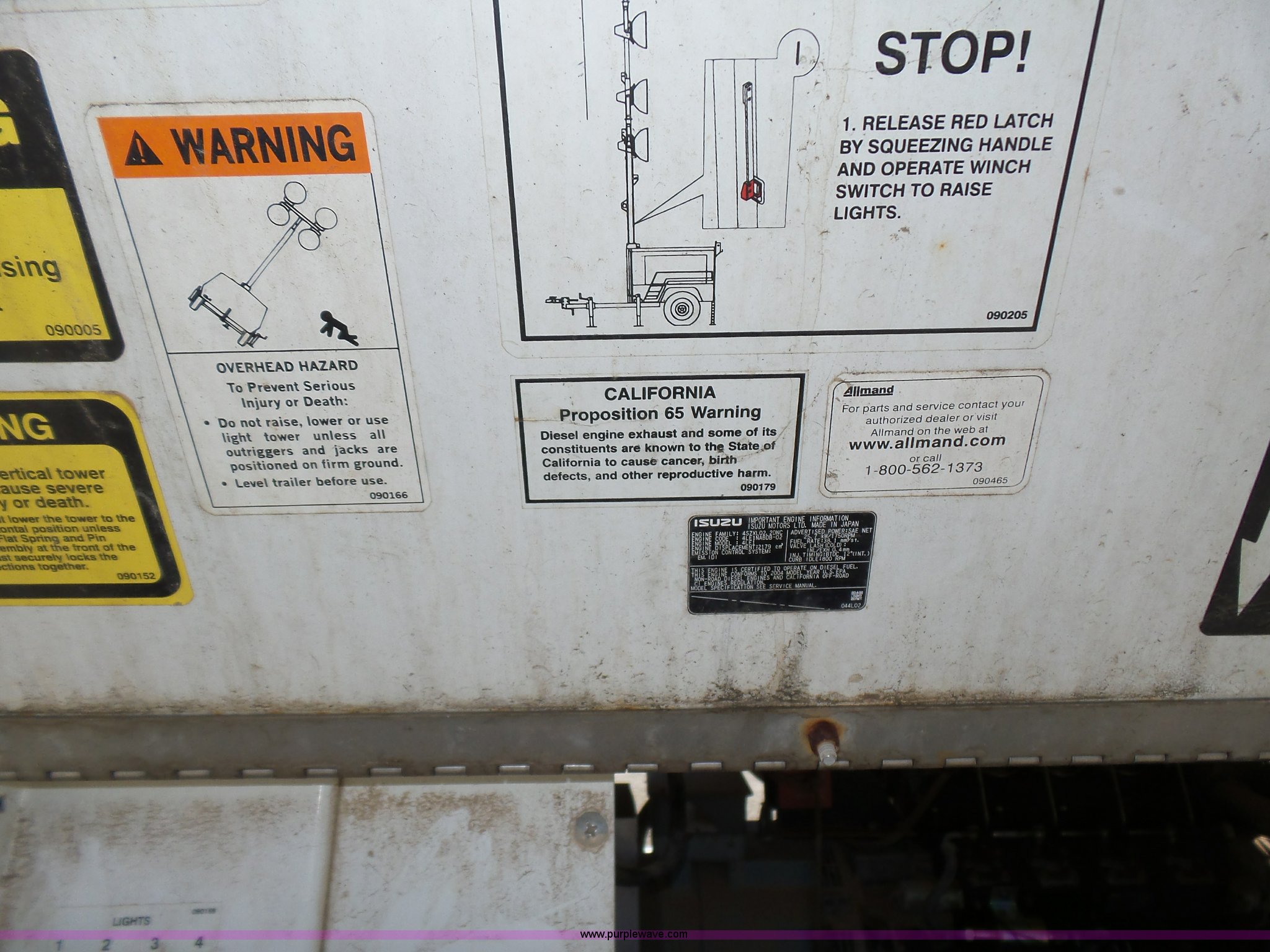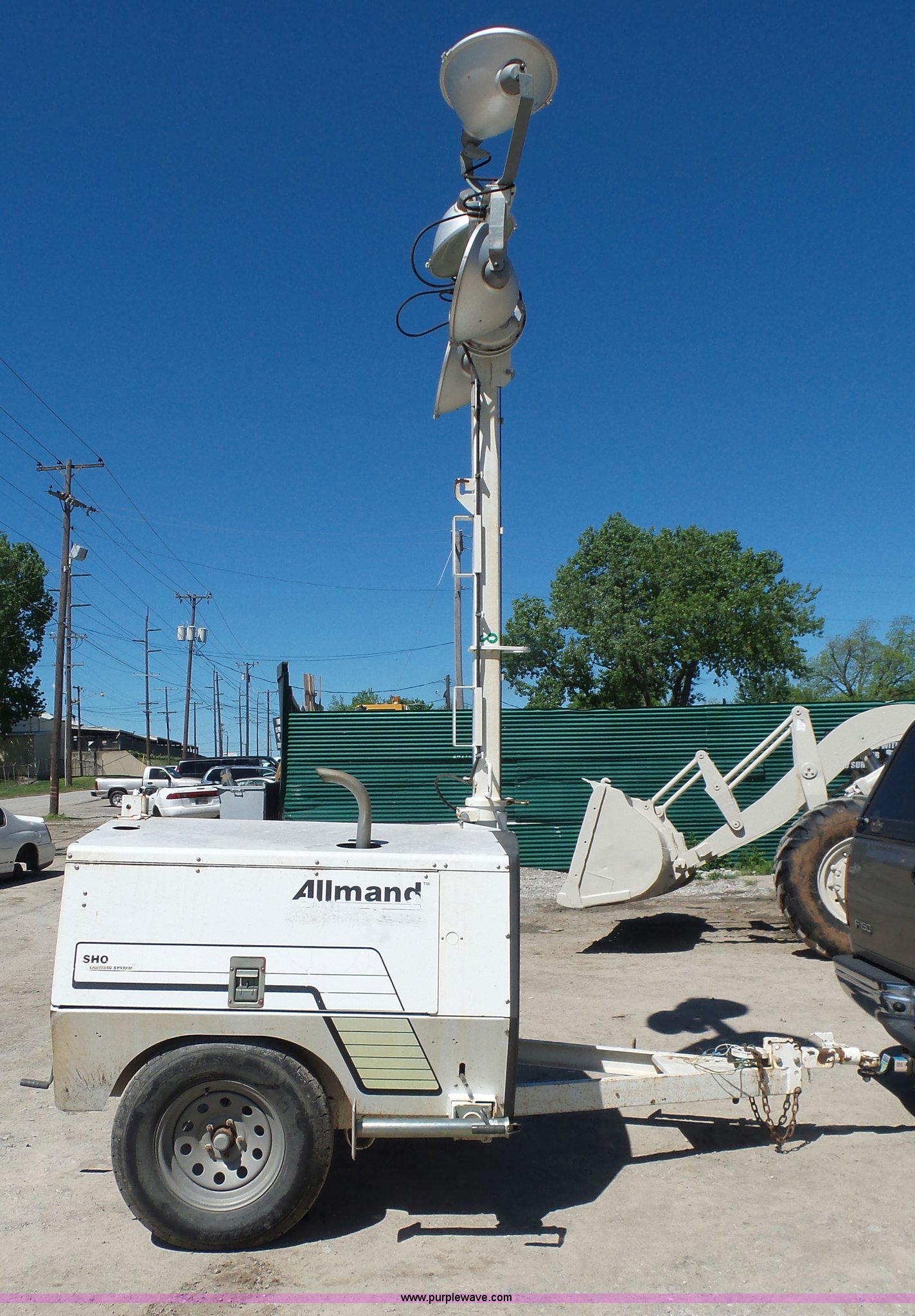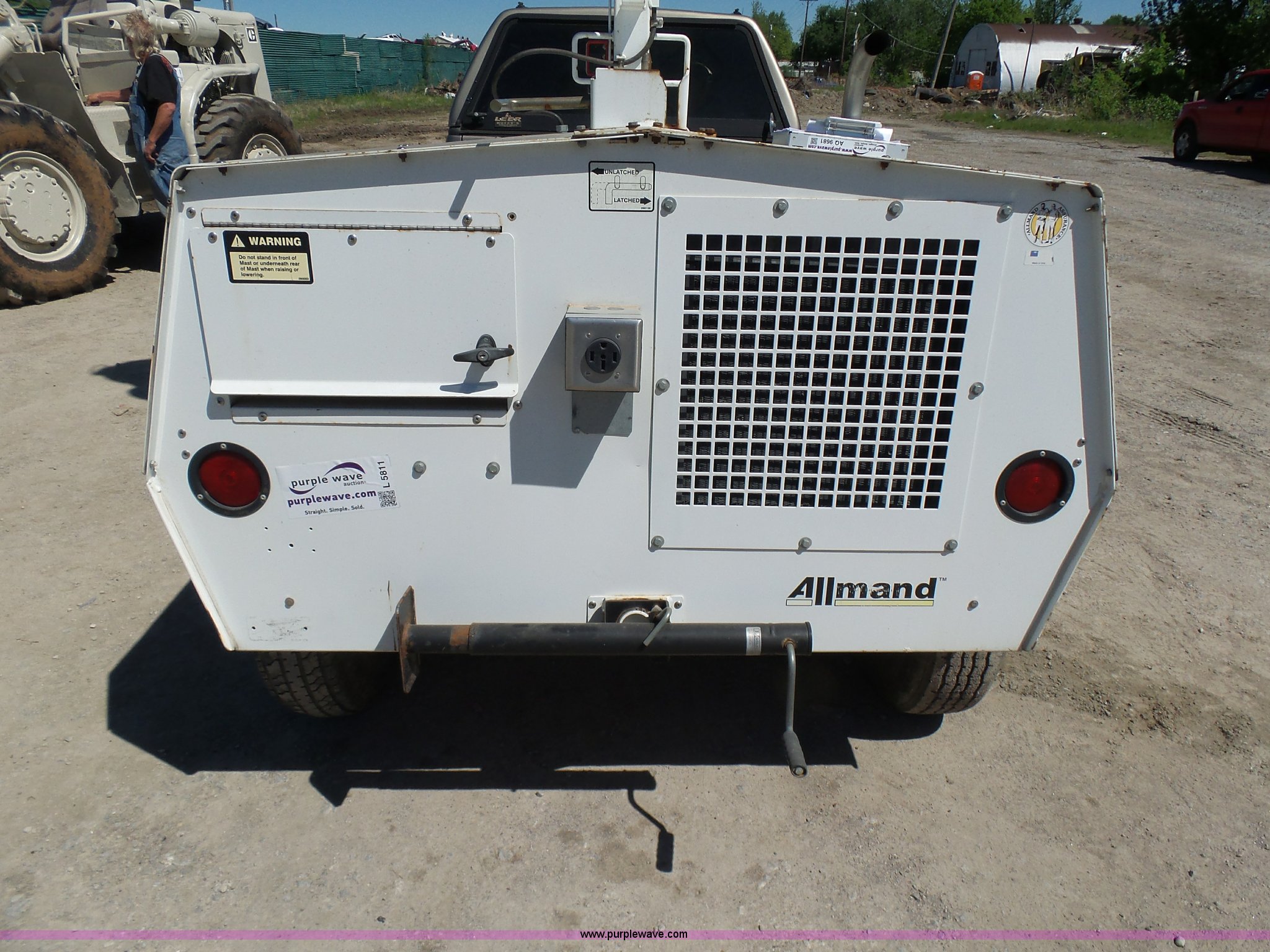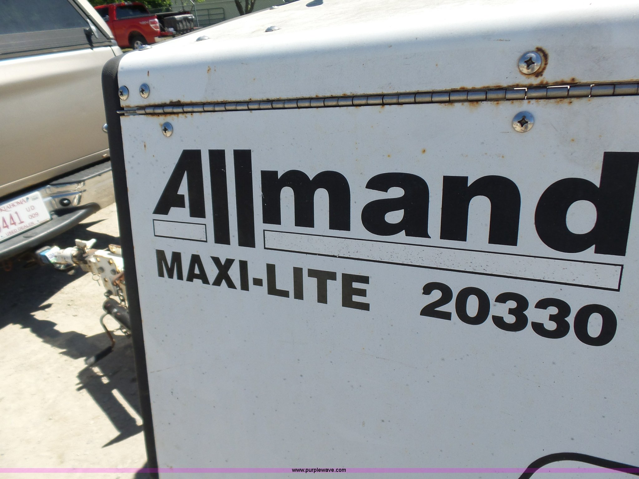 Purple Wave is selling a used Light Plant in Oklahoma. This item is a Allmand Maxi-Lite 20330 light plant with the following: 17,069 hours on meter, Isuzu 2SZXL02.2DNC four cylinder diesel engine, 2,179 cu. cm, 25.7 kW, Serial 4LE1NABDB-02, (4) 1,000 watt bulbs, Power hoist, Control panel, Fuel tank, Three phase, Two-way hitch, 2" ball hitch, Pintle hitch, 225/75R15 tires