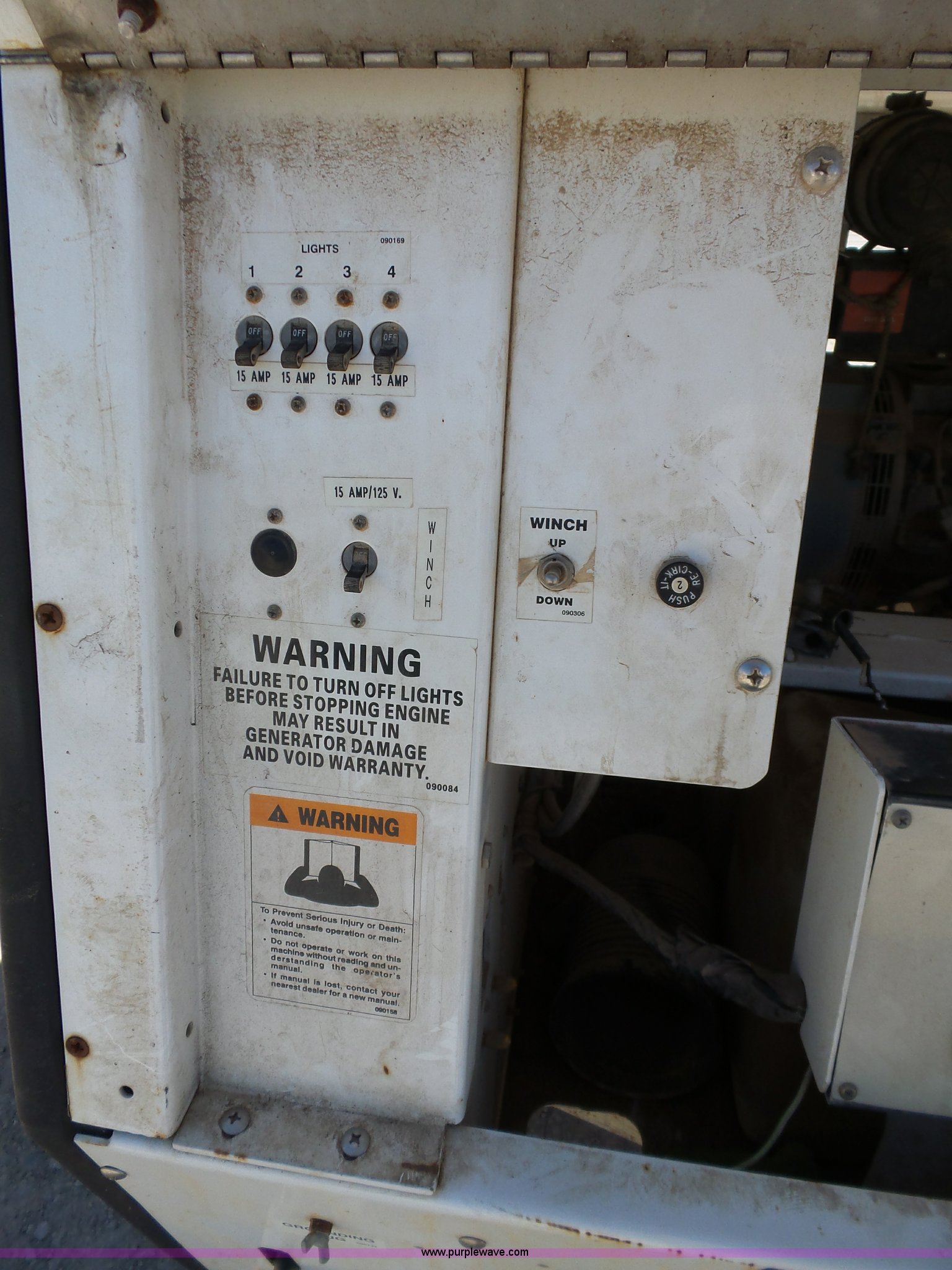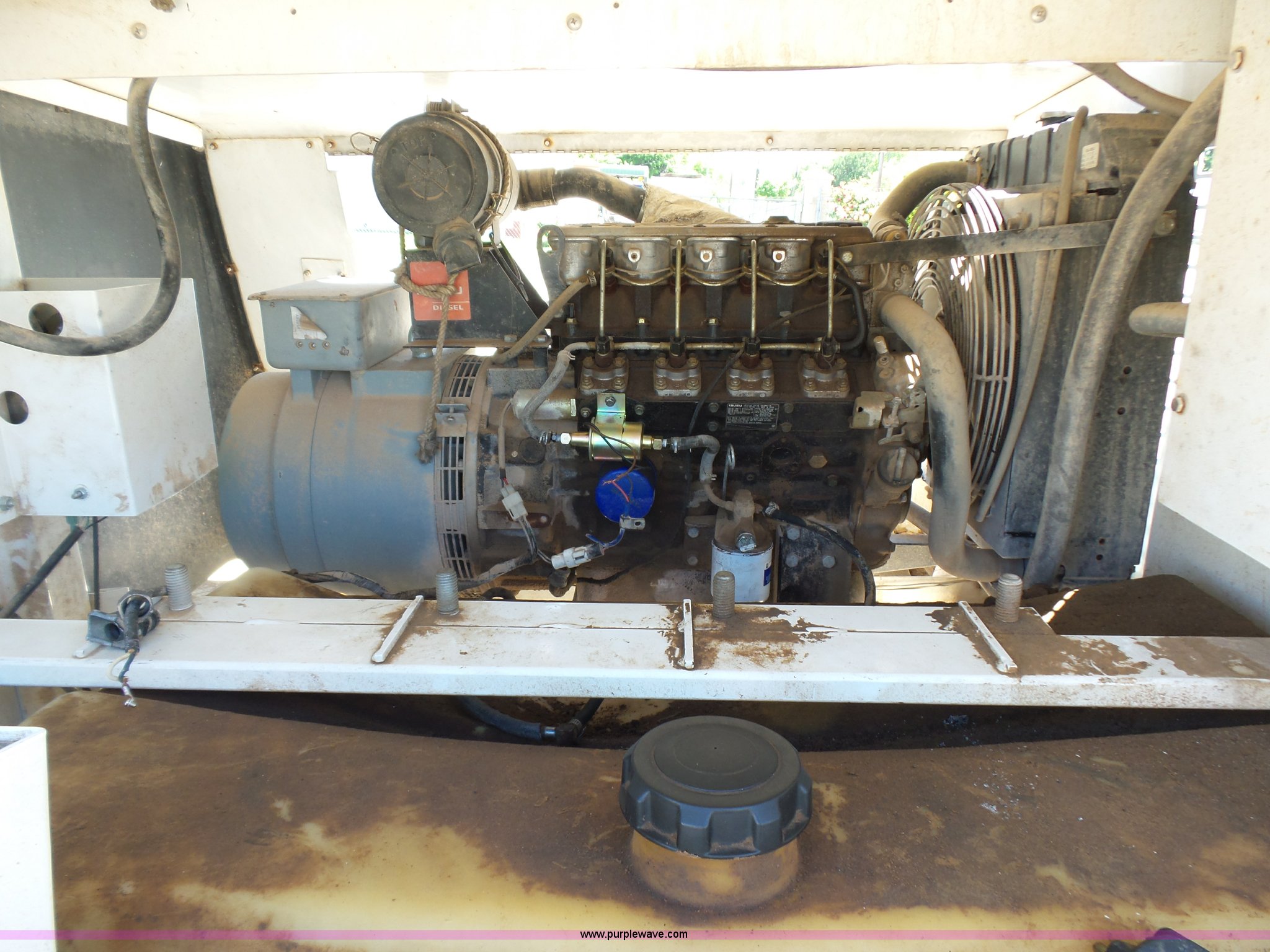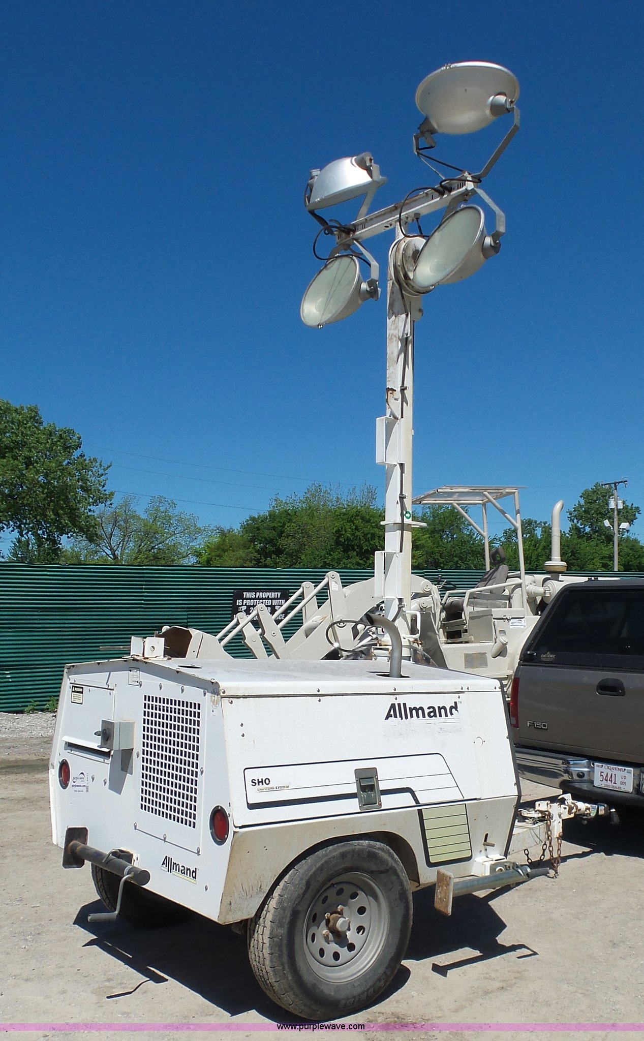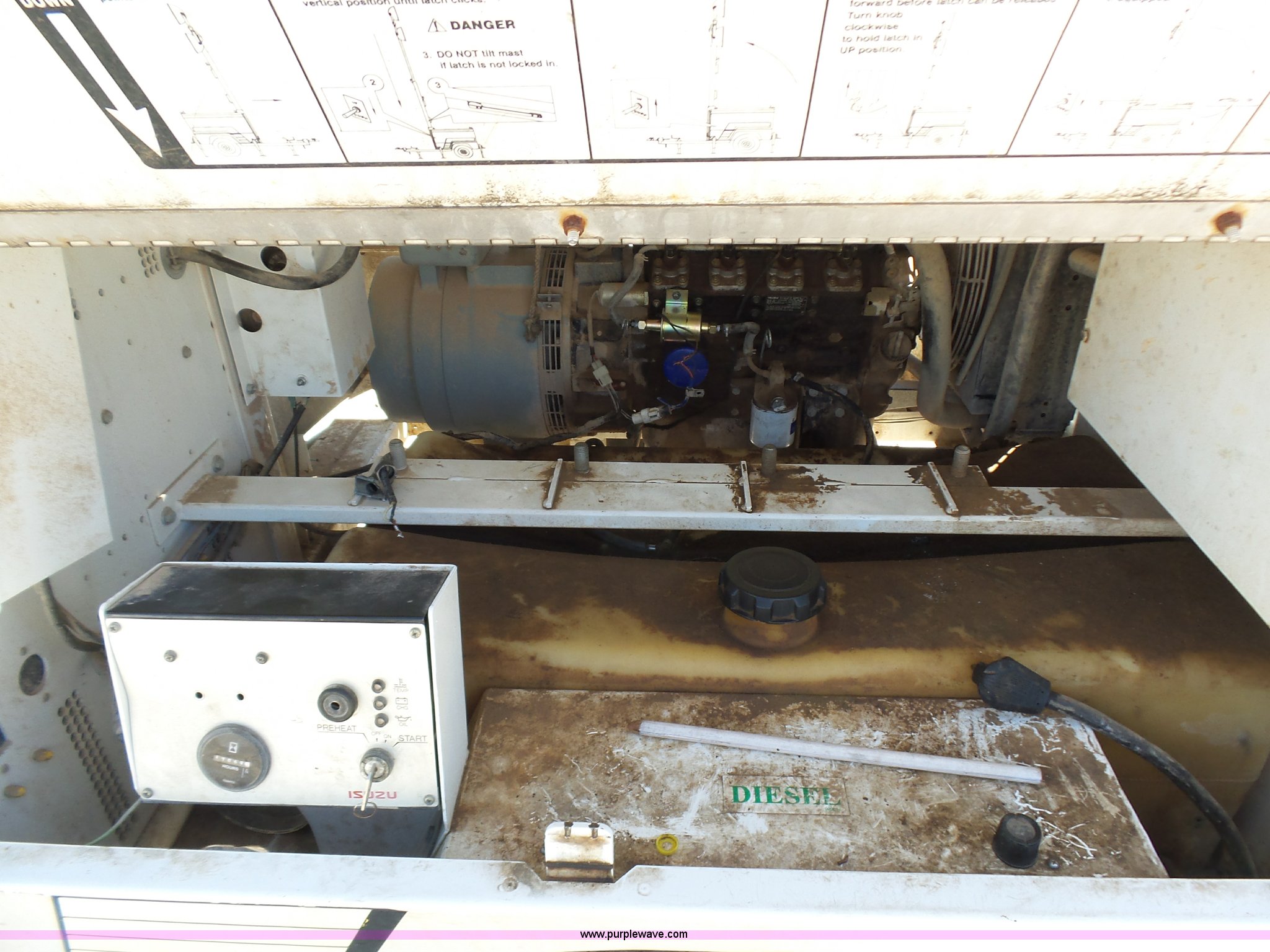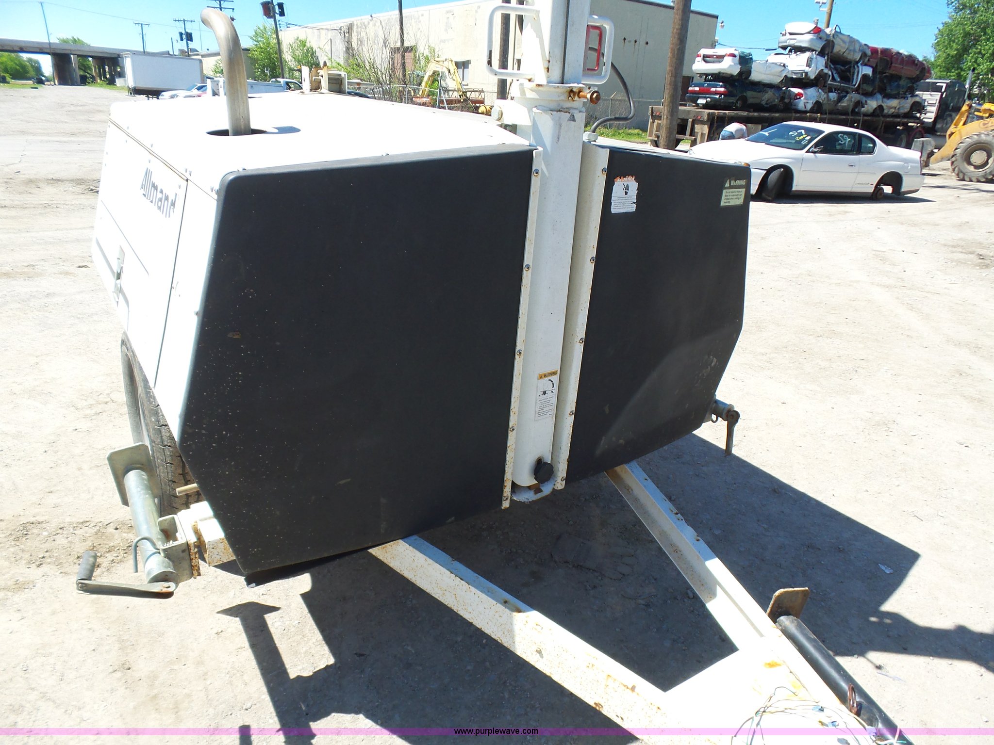 Purple Wave is selling a used Light Plant in Oklahoma. This item is a Allmand Maxi-Lite 20330 light plant with the following: 17,069 hours on meter, Isuzu 2SZXL02.2DNC four cylinder diesel engine, 2,179 cu. cm, 25.7 kW, Serial 4LE1NABDB-02, (4) 1,000 watt bulbs, Power hoist, Control panel, Fuel tank, Three phase, Two-way hitch, 2" ball hitch, Pintle hitch, 225/75R15 tires