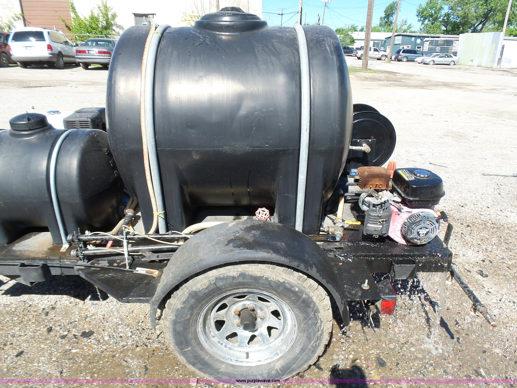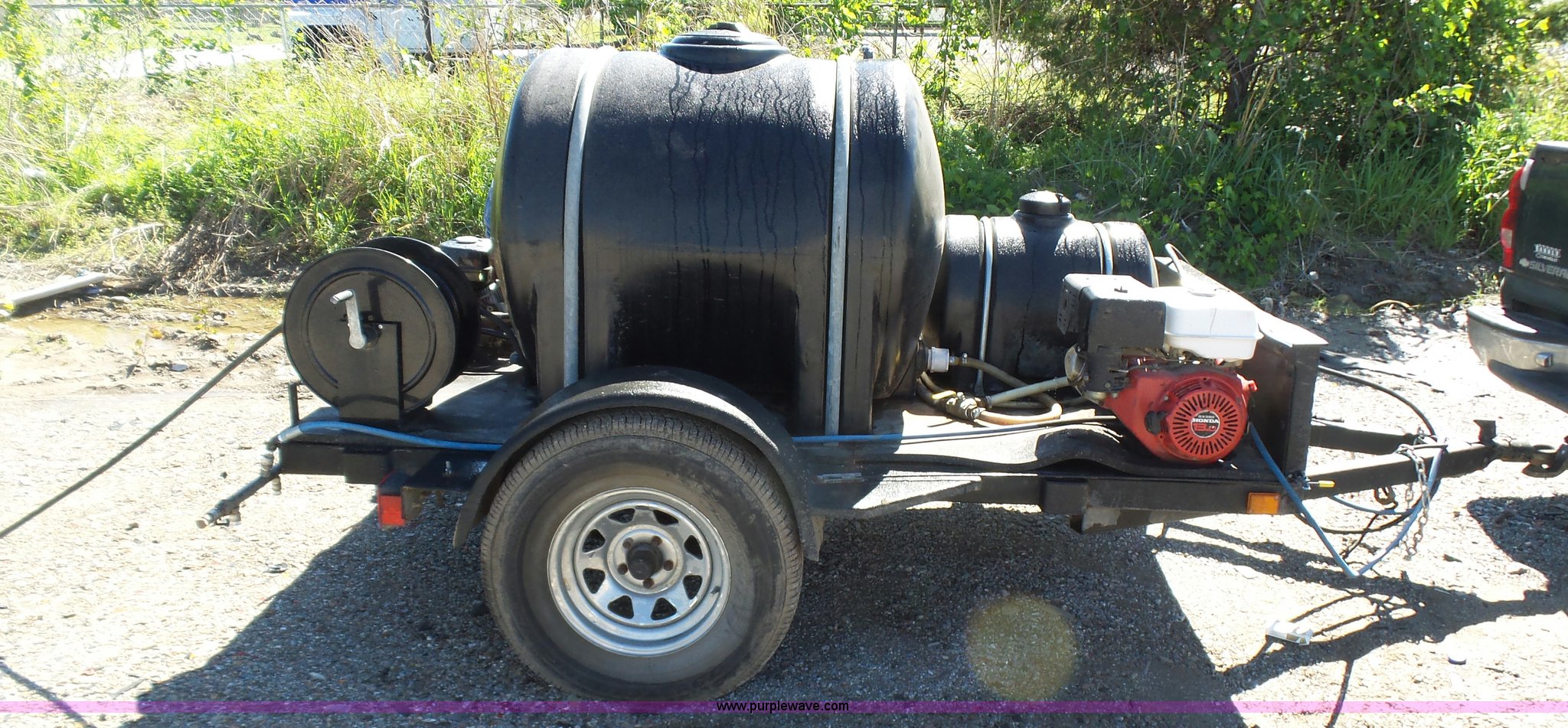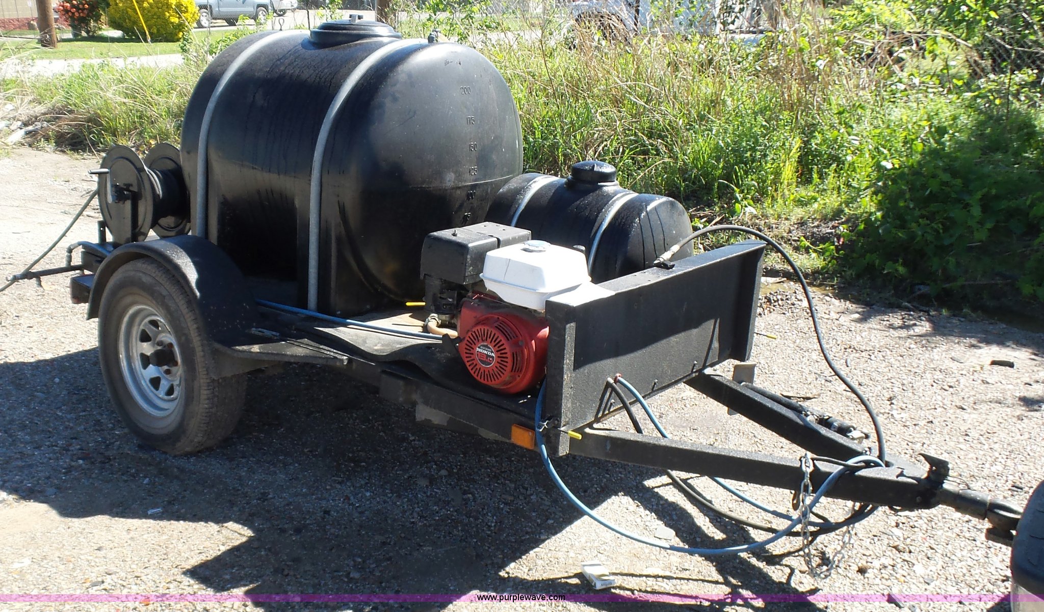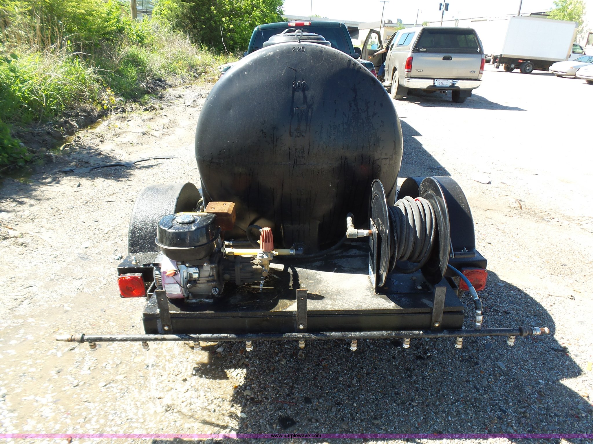 Purple Wave is selling a used Trailer Other in Oklahoma. This item is a Water tank trailer with the following: 100"L x 6'W, 35 gallon tank, 225 gallon tank, Power Ease 200cc engine, 6.5 HP, Honda GX390 gas engine, 12 HP(2) cords, Spray bar, Coxreels CCR-8723 hose reel, Serial 20080815-0308, 2 5/16" ball hitch