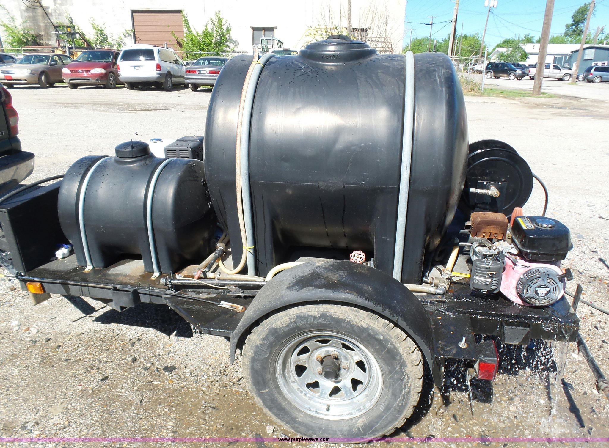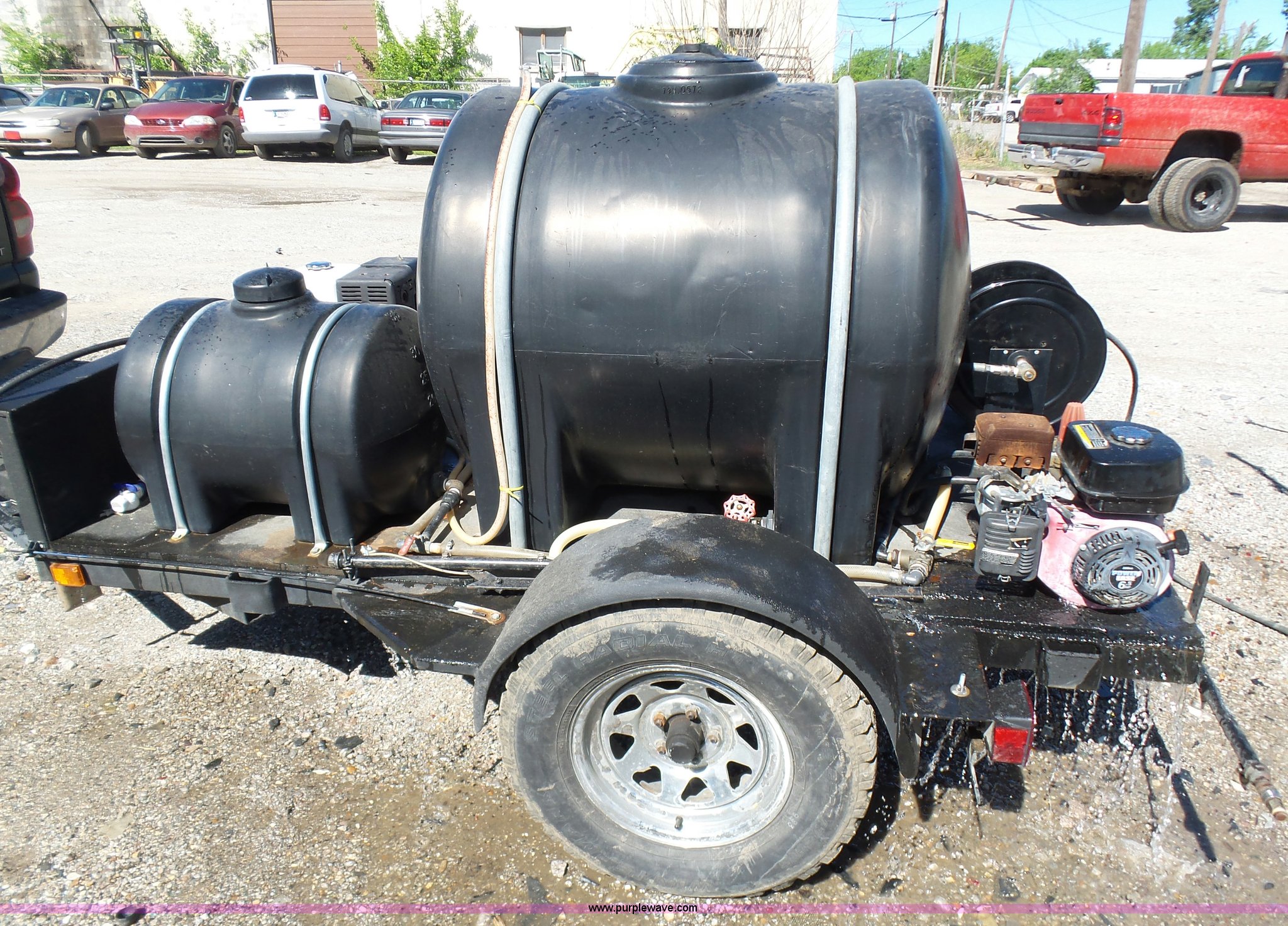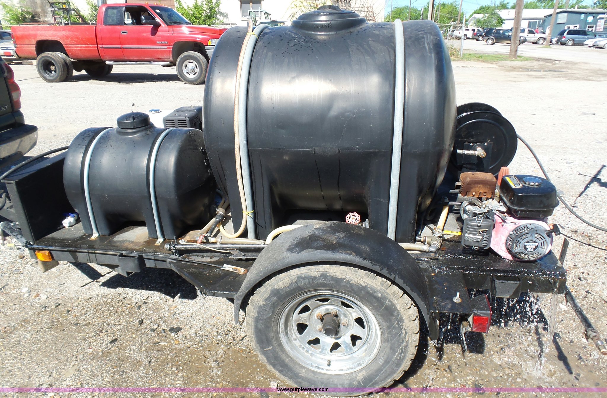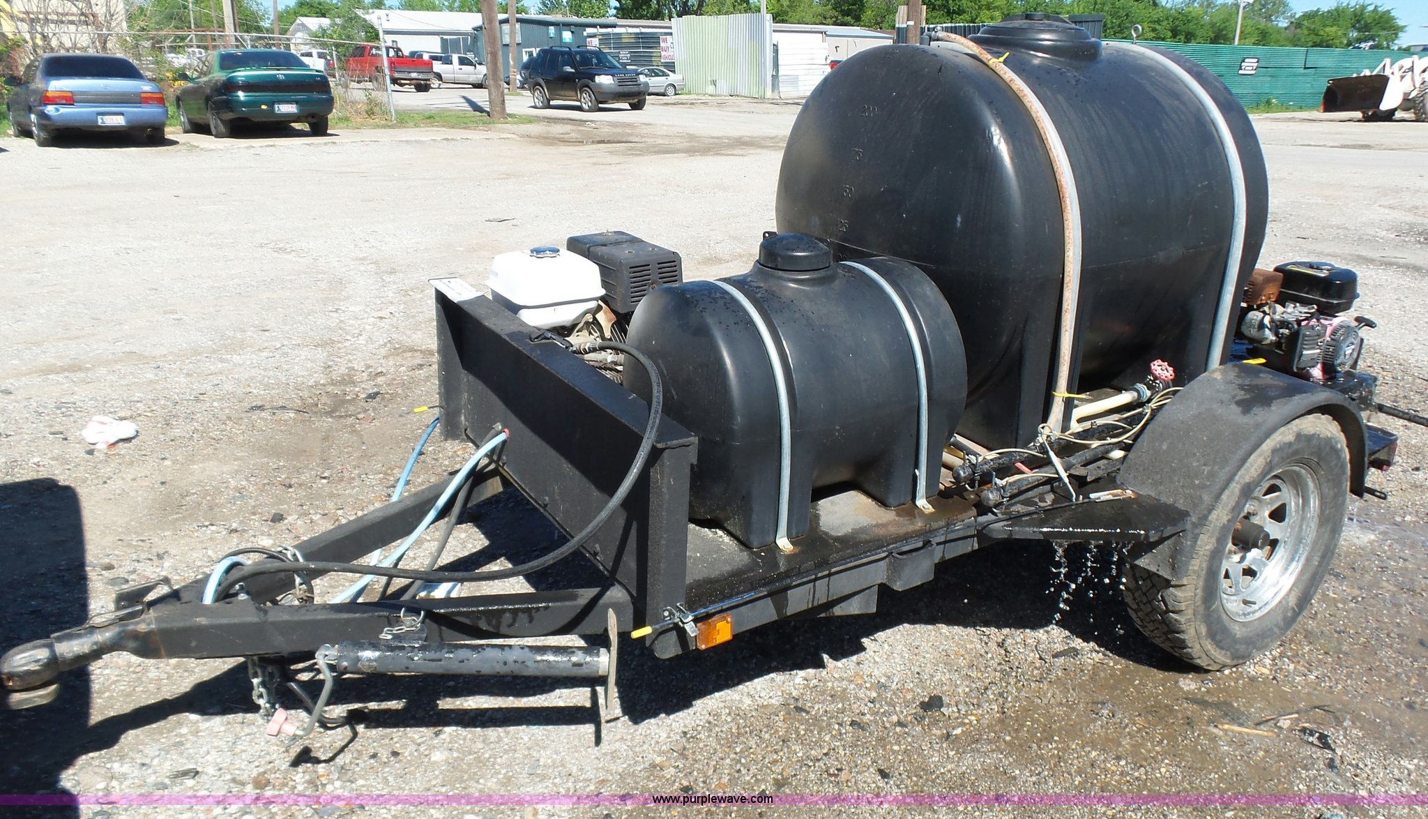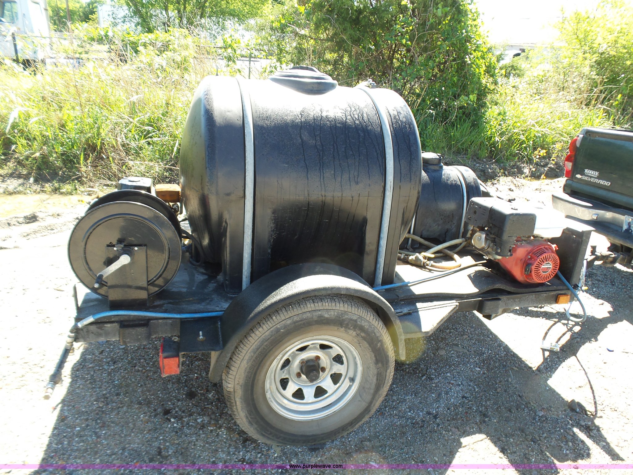 Purple Wave is selling a used Trailer Other in Oklahoma. This item is a Water tank trailer with the following: 100"L x 6'W, 35 gallon tank, 225 gallon tank, Power Ease 200cc engine, 6.5 HP, Honda GX390 gas engine, 12 HP(2) cords, Spray bar, Coxreels CCR-8723 hose reel, Serial 20080815-0308, 2 5/16" ball hitch