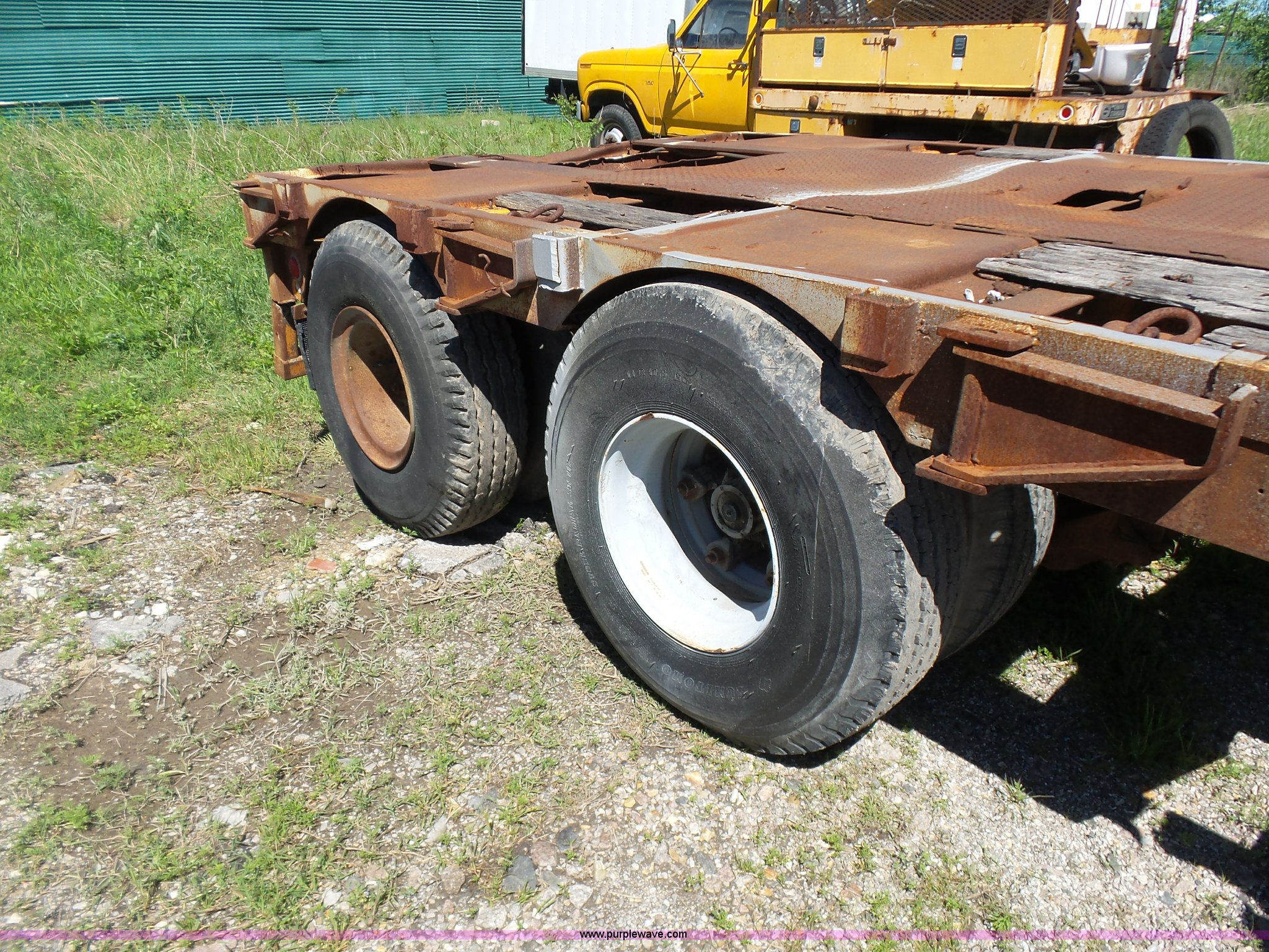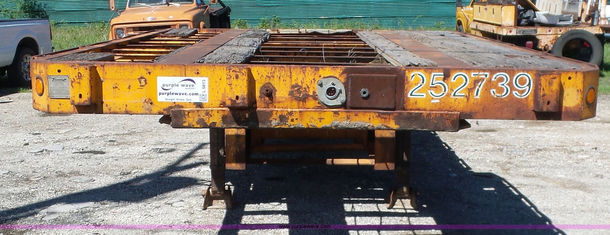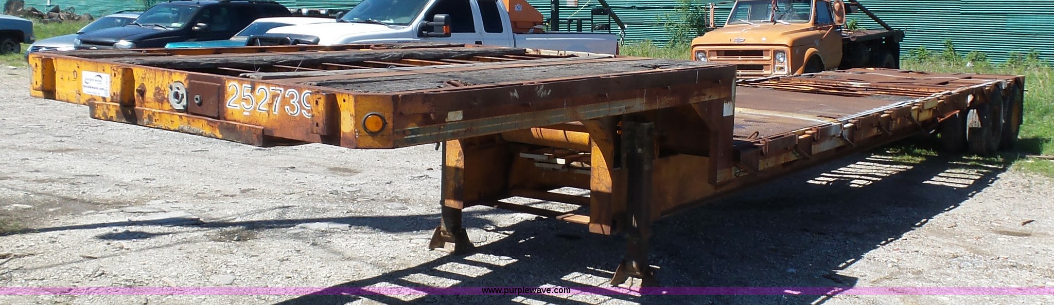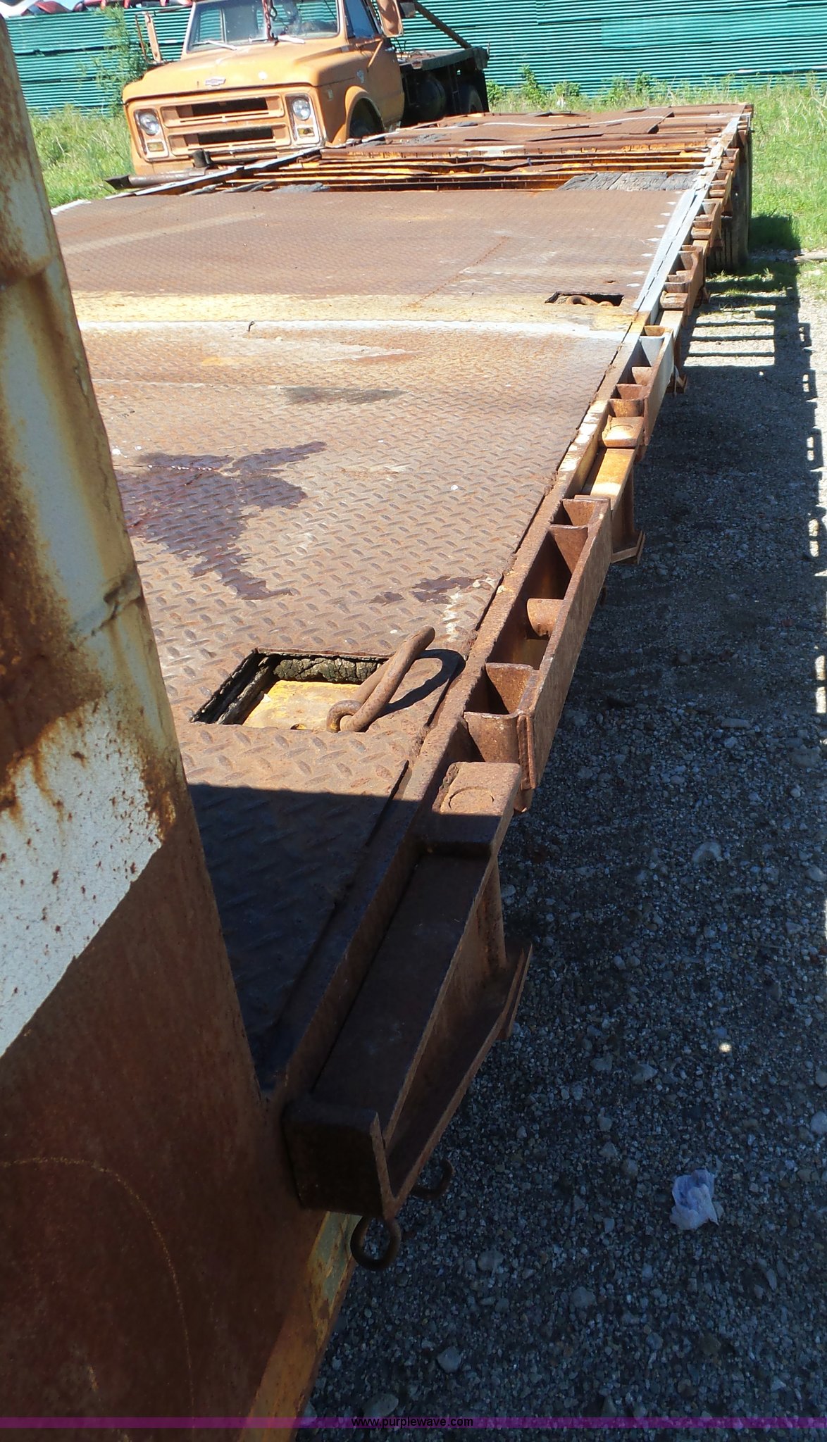 Purple Wave is selling a used Flat or Drop Deck Trailer in Oklahoma. This item is a 1971 Transcraft drop deck trailer with the following: 41'L x 8'W overall, 38" floor height, 118"L top deck, 31' main deck, Outriggers, Steel deck, D-rings, Stake pockets, Fifth wheel hitch, Dual leg landing gear, Air suspension, Air brakes, Tandem axle, 11R17.5 tires