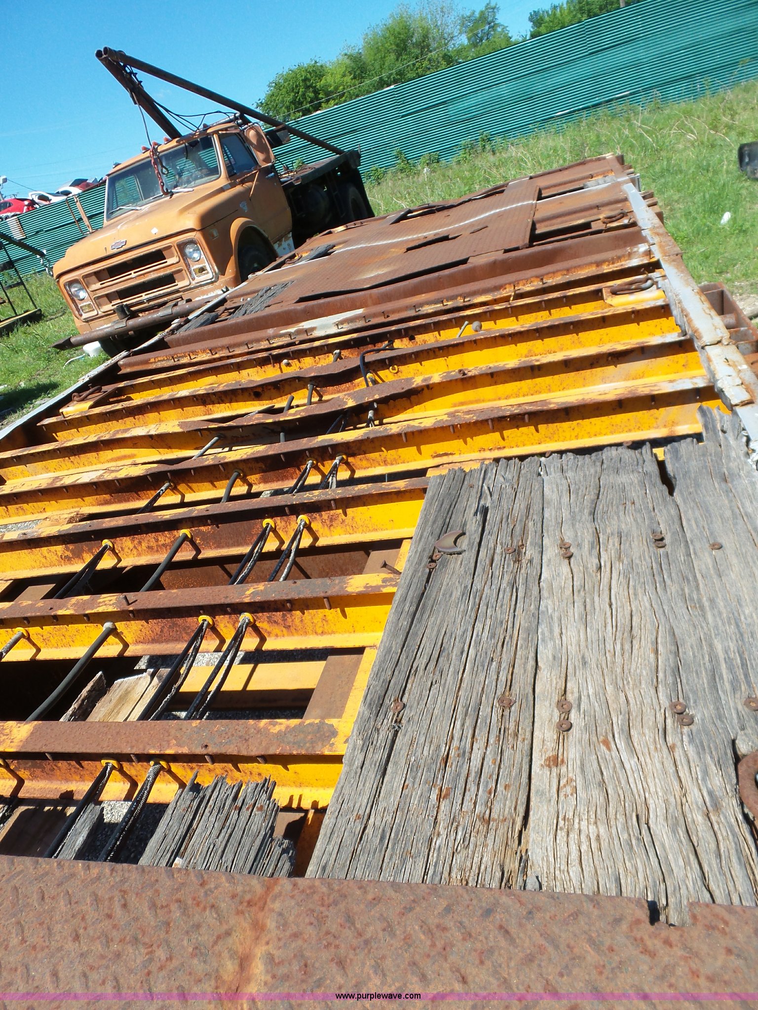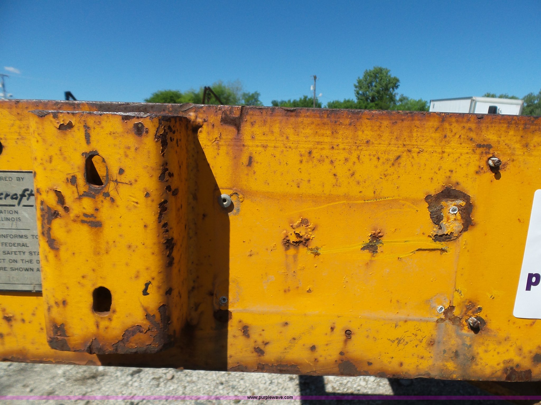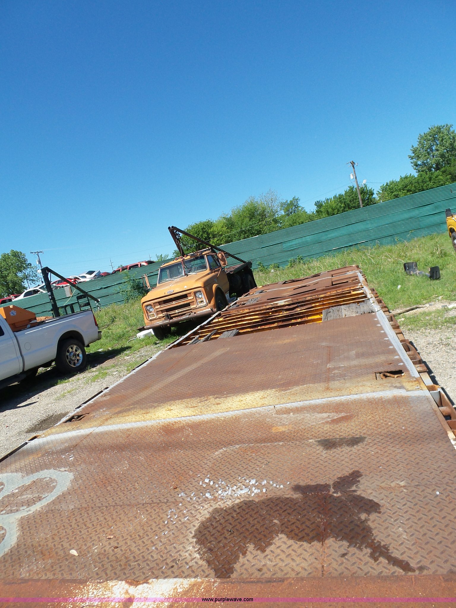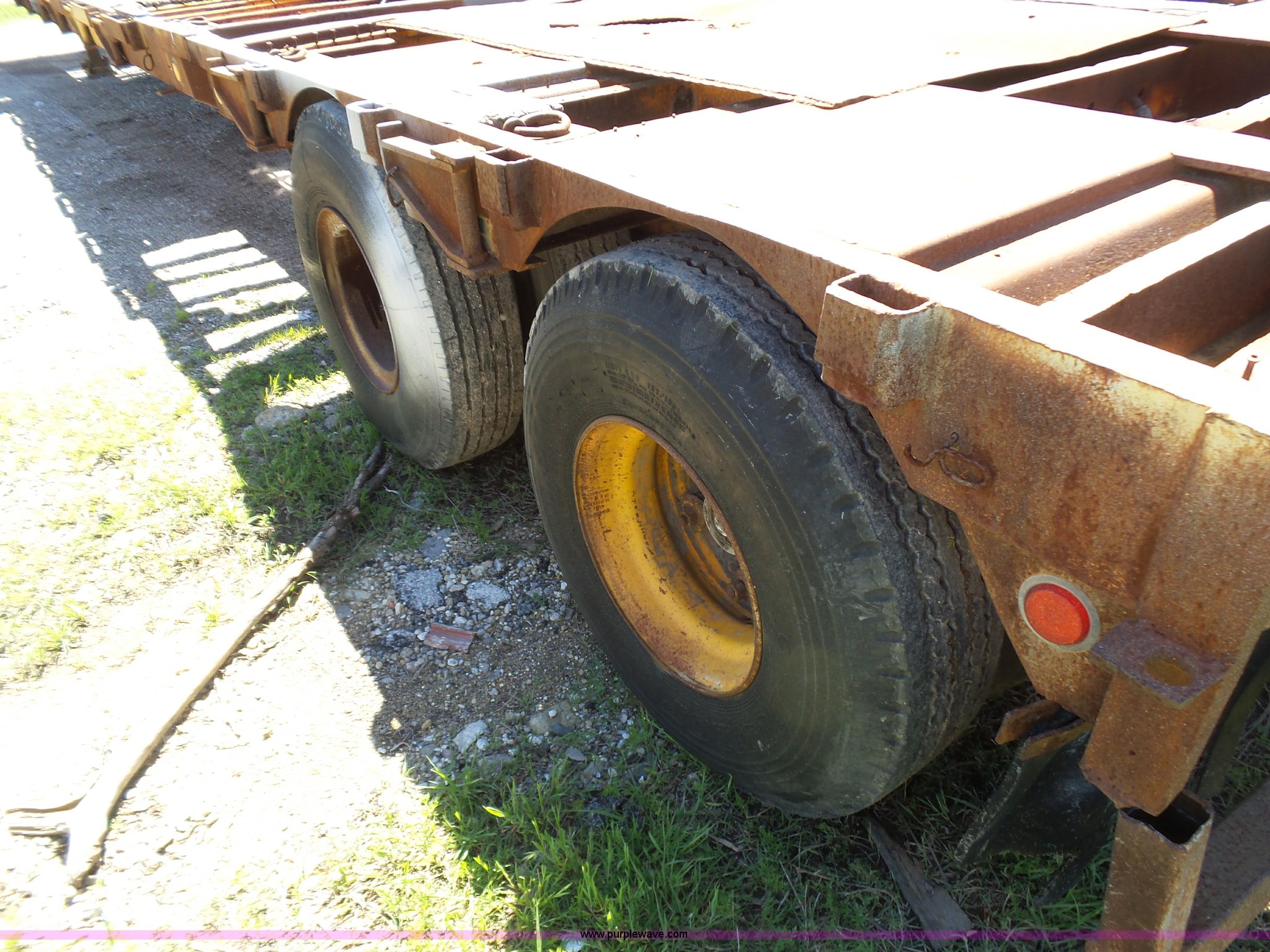 Purple Wave is selling a used Flat or Drop Deck Trailer in Oklahoma. This item is a 1971 Transcraft drop deck trailer with the following: 41'L x 8'W overall, 38" floor height, 118"L top deck, 31' main deck, Outriggers, Steel deck, D-rings, Stake pockets, Fifth wheel hitch, Dual leg landing gear, Air suspension, Air brakes, Tandem axle, 11R17.5 tires