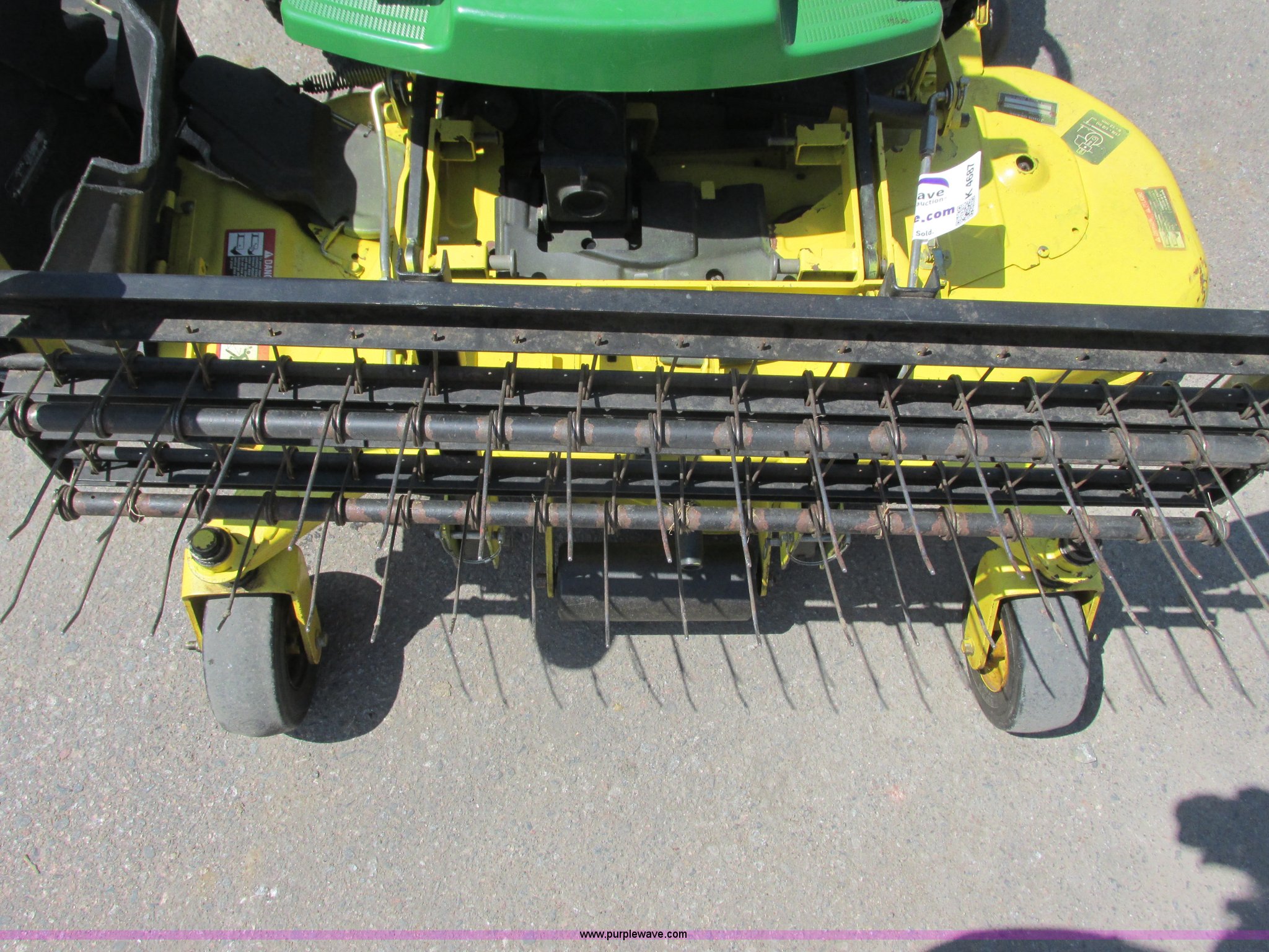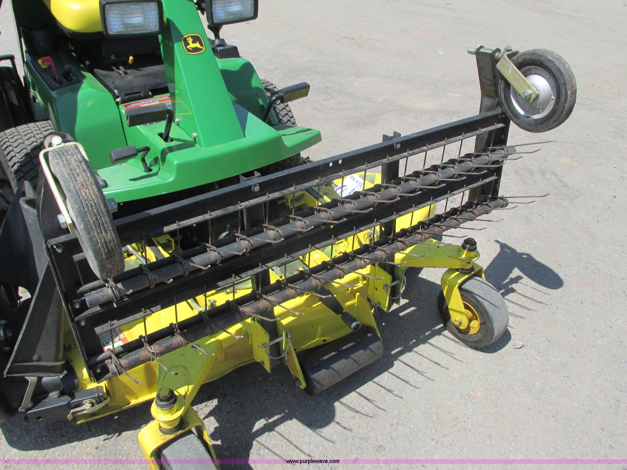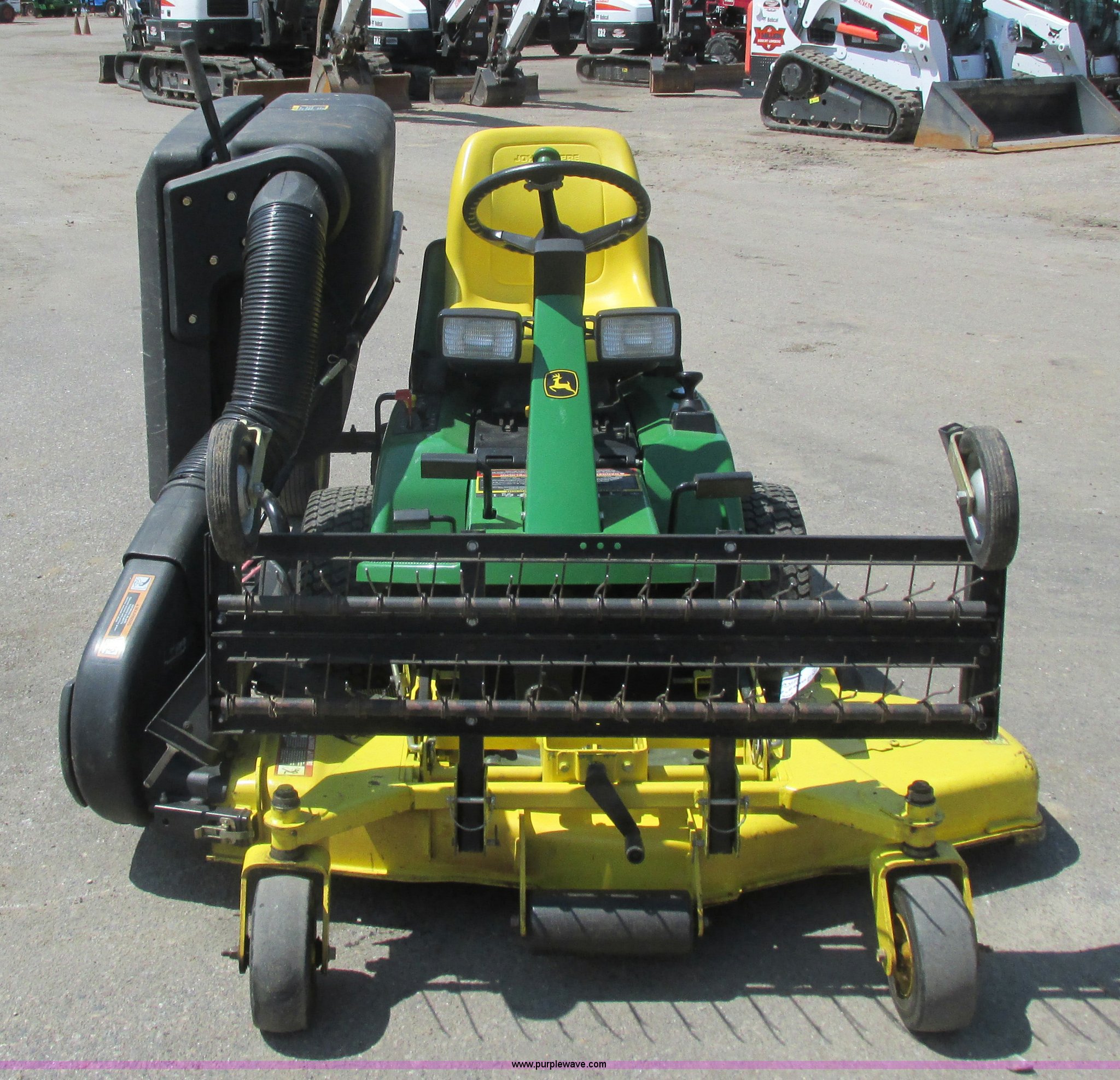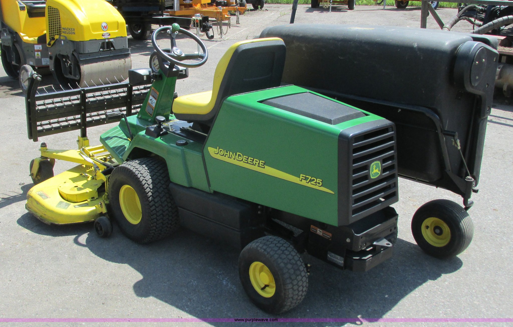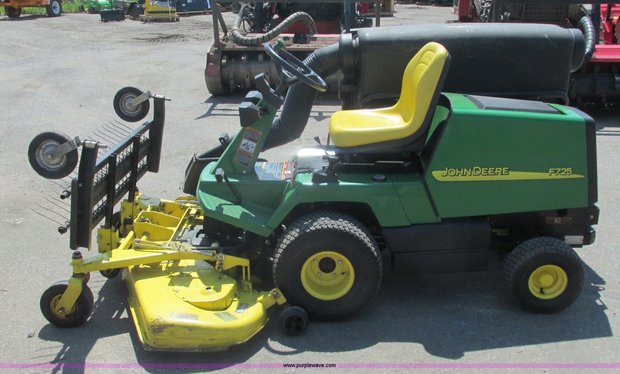 Purple Wave is selling a used Lawn Mower in Minnesota. This item is a John Deere F725 lawn mower with the following: 1,150 hours on meter, 54" cutting capacity, Kawasaki V-twin gas engine, Hydrostatic transmission, Front mounted dethatcher, Power vacuum bagger, Dumping hopper, Front work lights, Rear weights, Pin hitch, 20 x 10.00-8 front tires, 15 x 6.00-6 rear tires