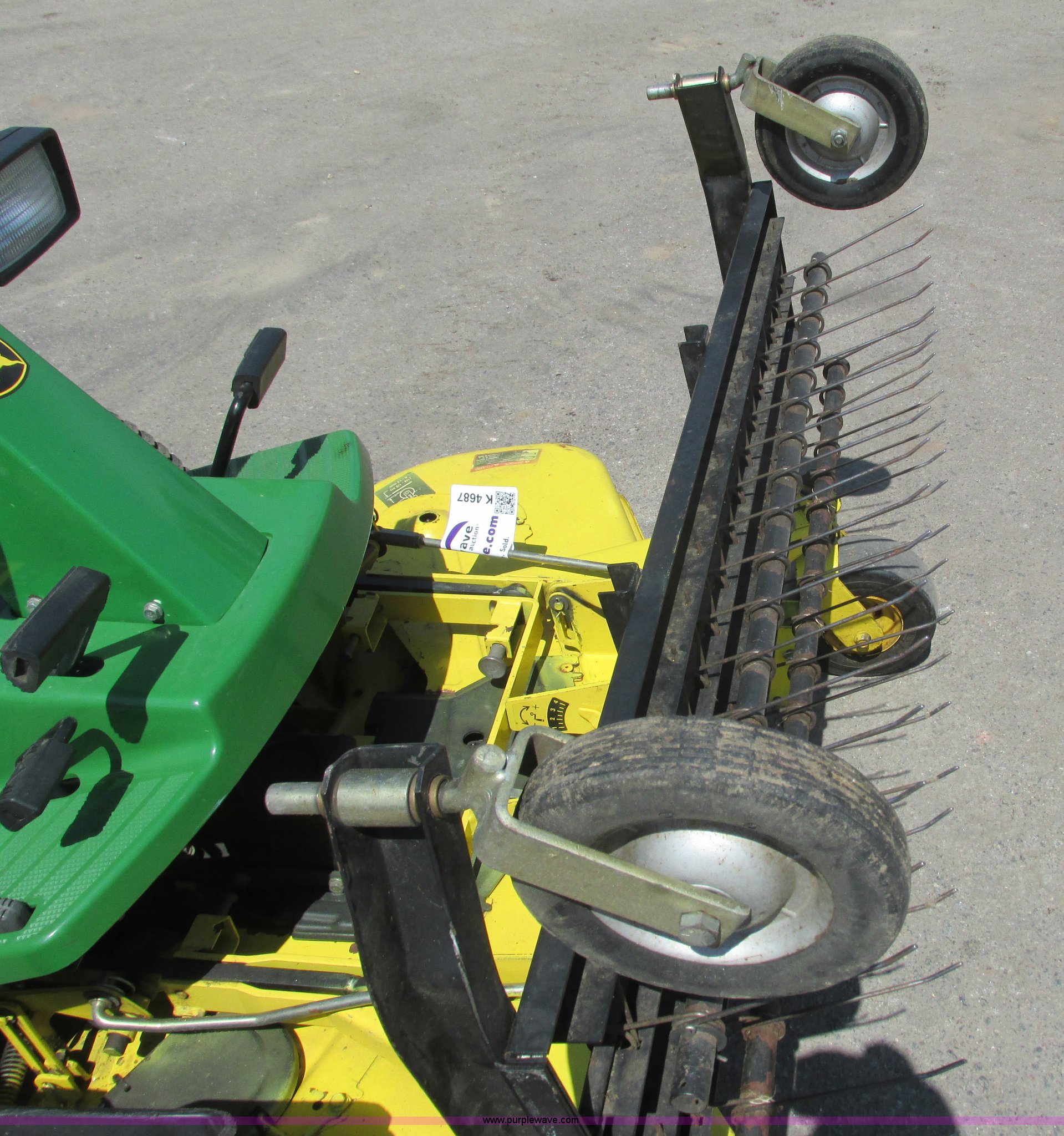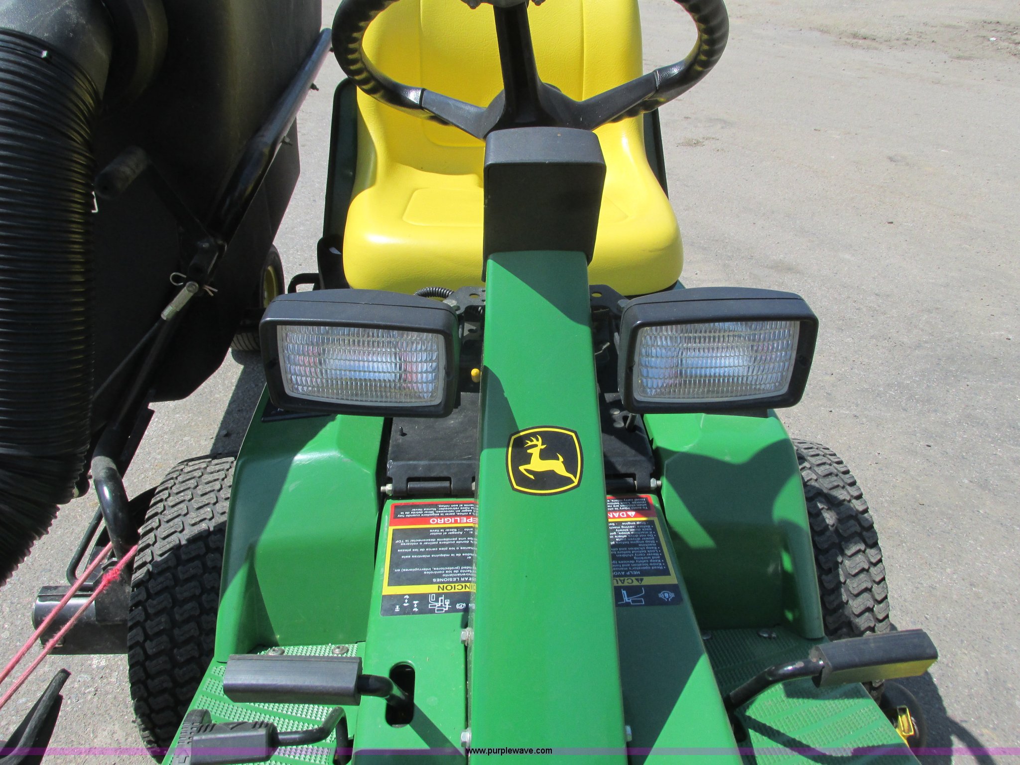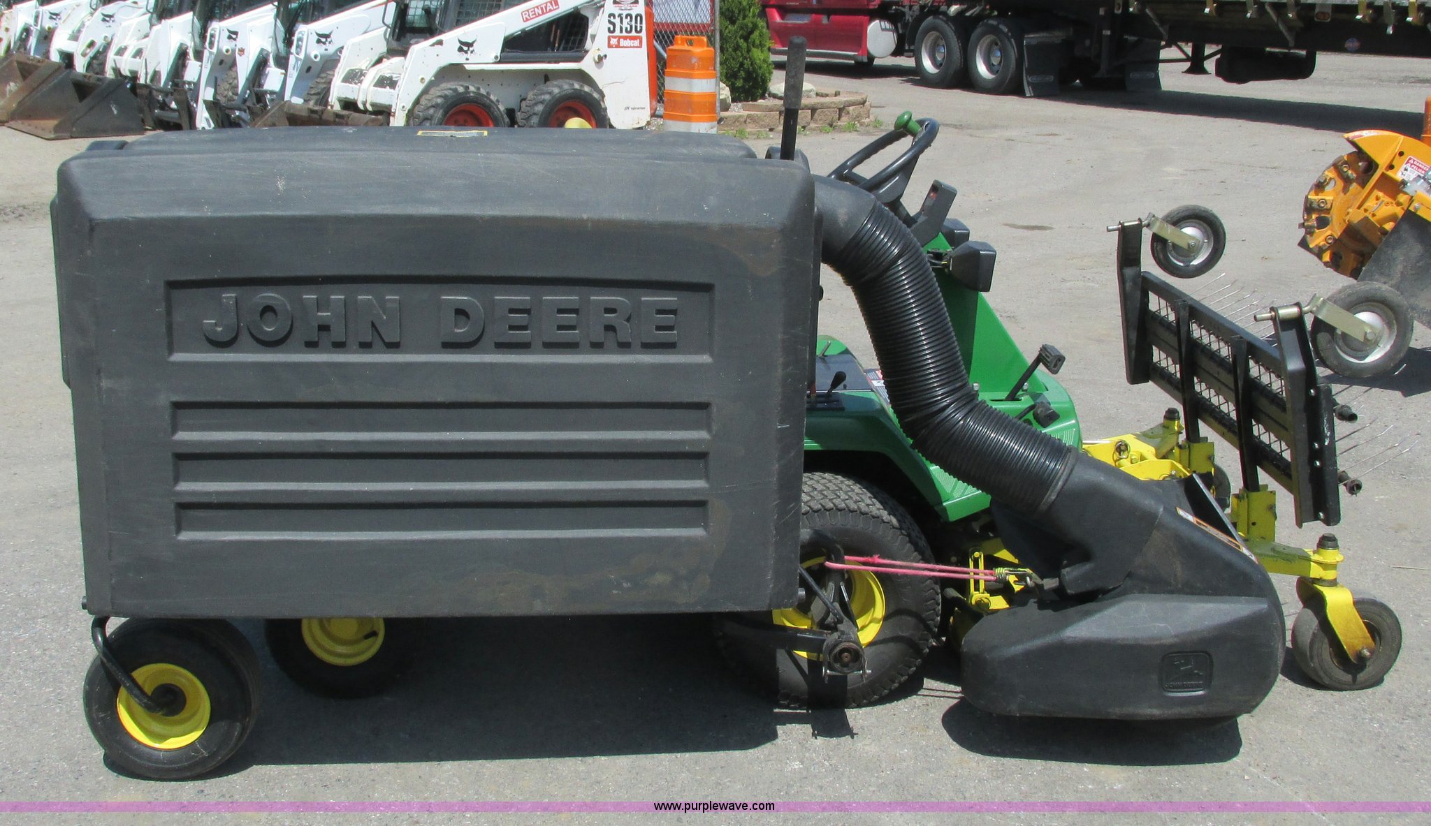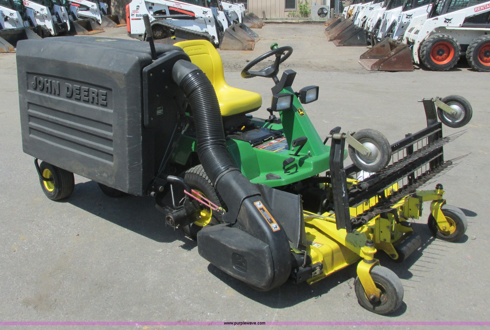 Purple Wave is selling a used Lawn Mower in Minnesota. This item is a John Deere F725 lawn mower with the following: 1,150 hours on meter, 54" cutting capacity, Kawasaki V-twin gas engine, Hydrostatic transmission, Front mounted dethatcher, Power vacuum bagger, Dumping hopper, Front work lights, Rear weights, Pin hitch, 20 x 10.00-8 front tires, 15 x 6.00-6 rear tires