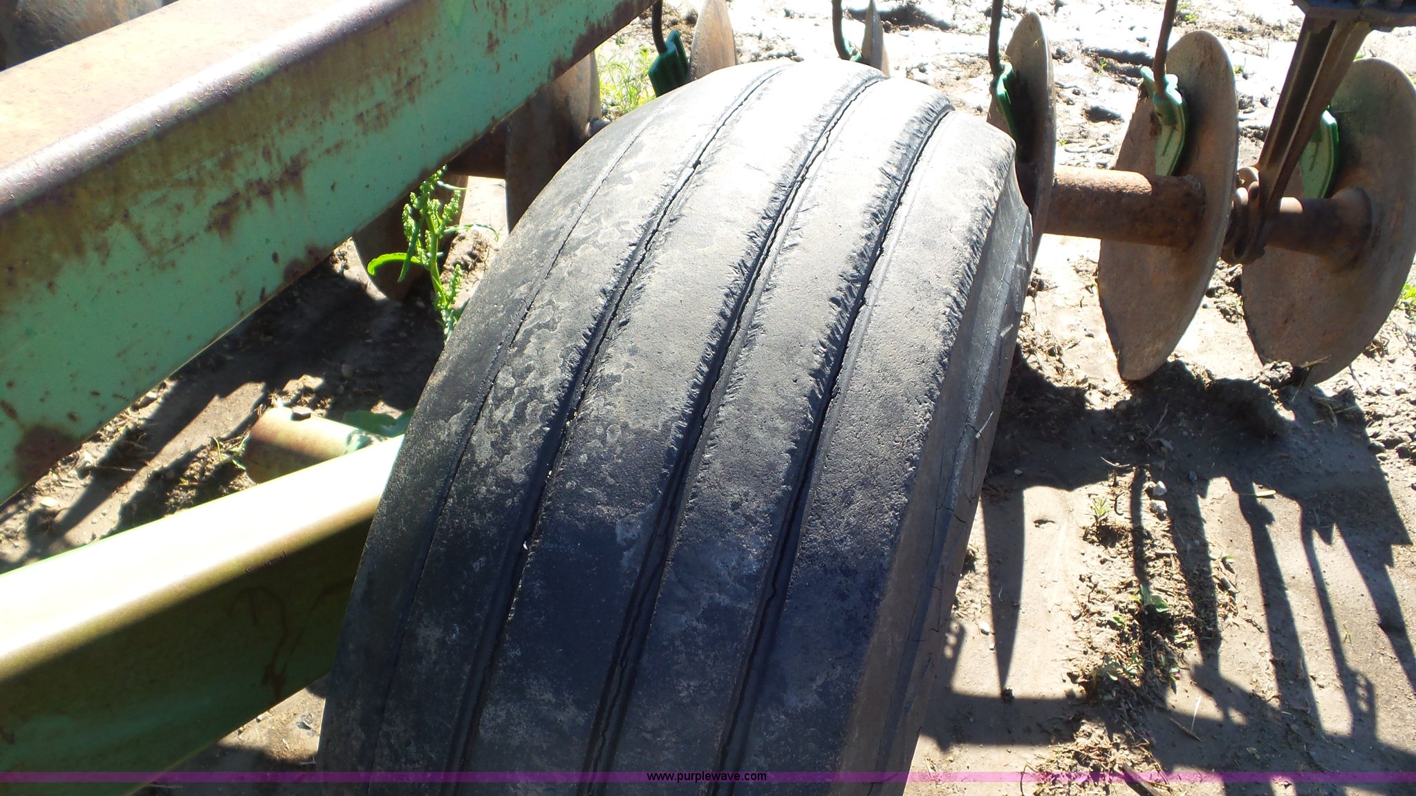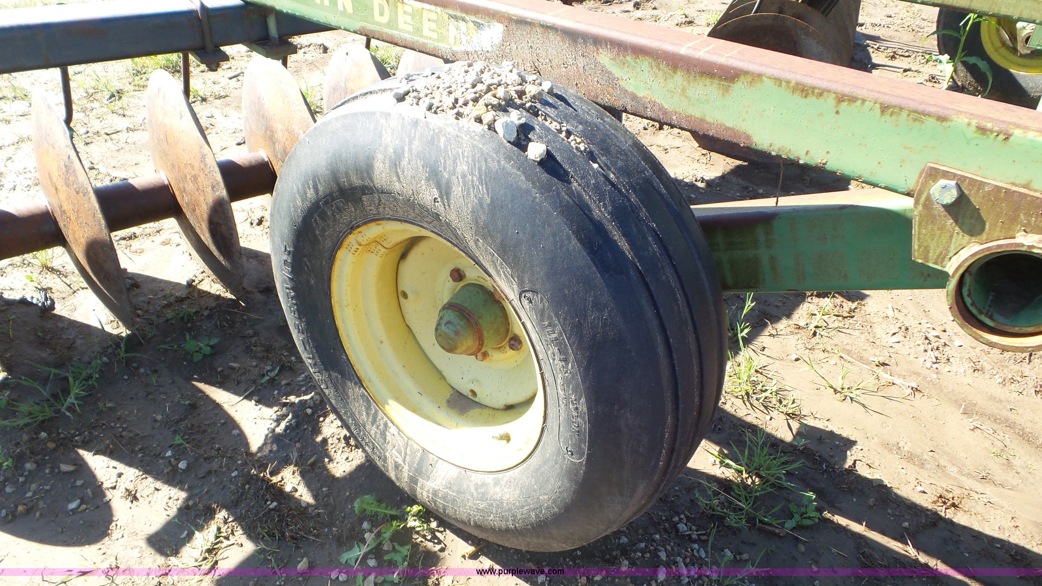 Purple Wave is selling a used Disk in Kansas. This item is a John Deere 210 disk with the following: 13'W, 21" front disks, 20" rear disks, Disk cleaners, Hydraulic lift, 11-14 tires, Serial 030590