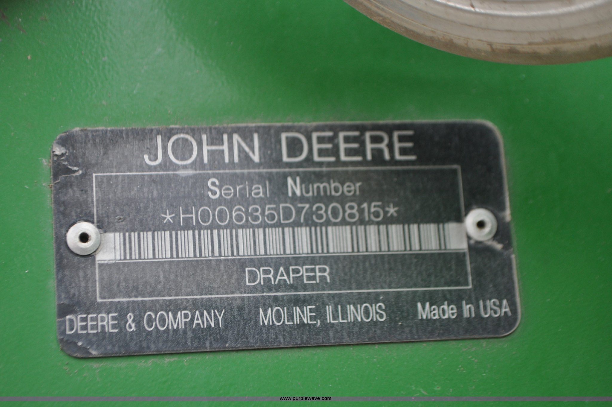 Take a look at this used John Deere 635D draper head being sold on May 25th, 2016 in the SOLD! May 25 Ag Equipment Auction made by John Deere. Take a look at all of the item information below or take a look at similar auctions for Harvesters.