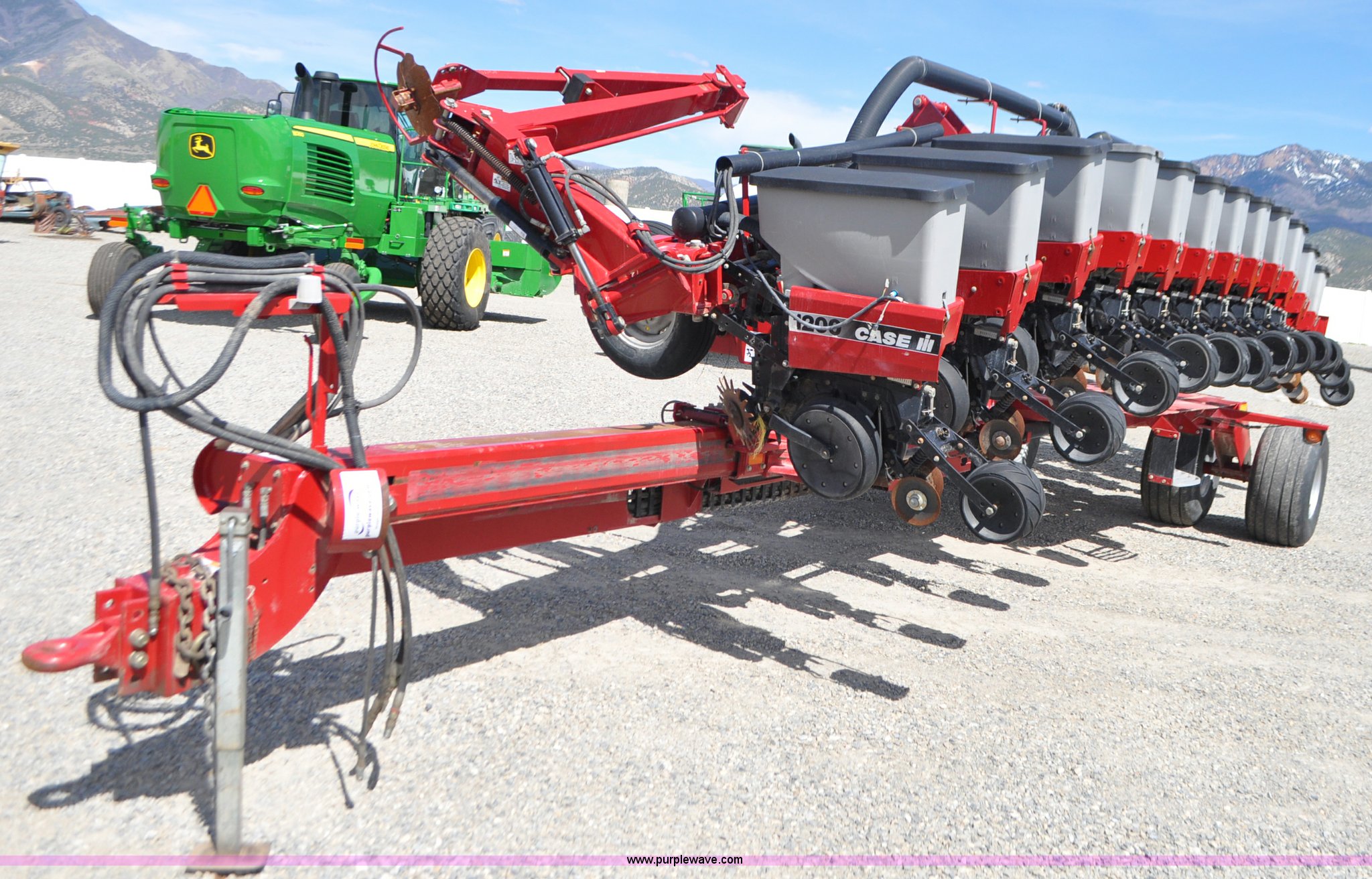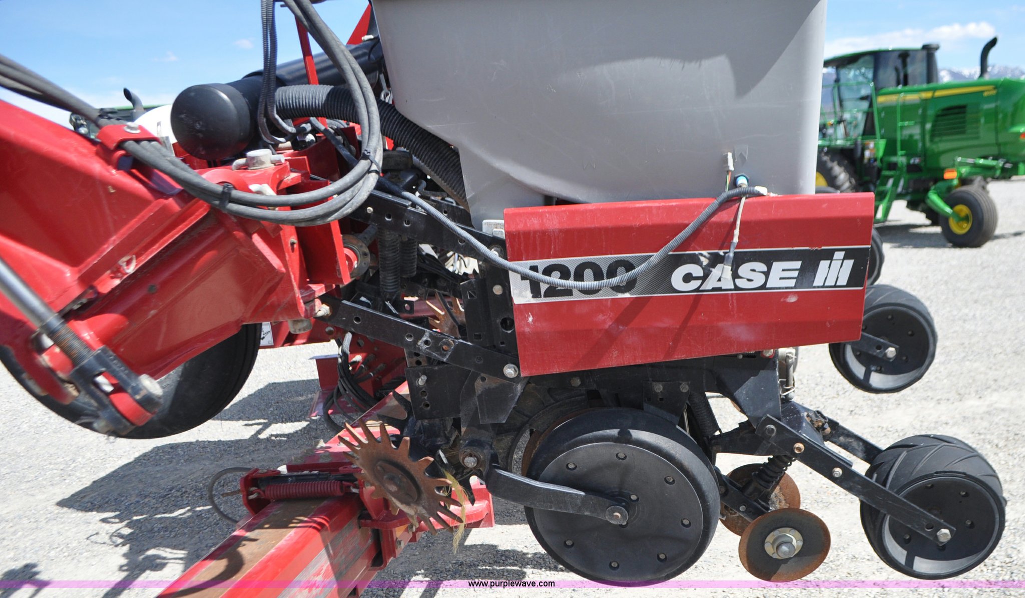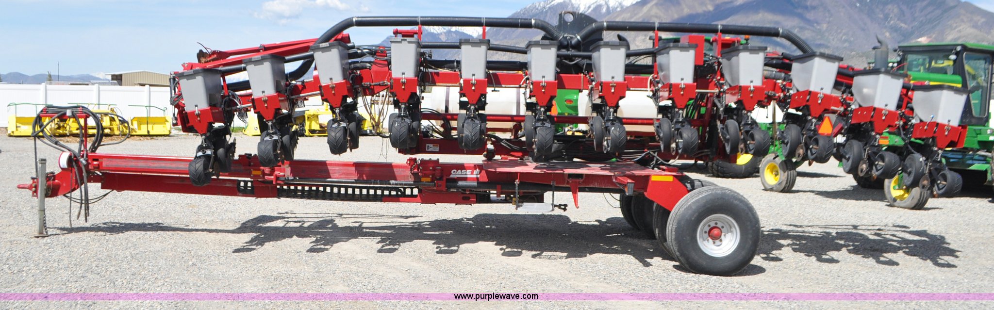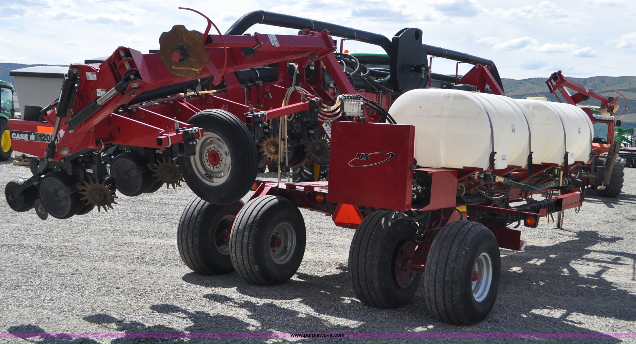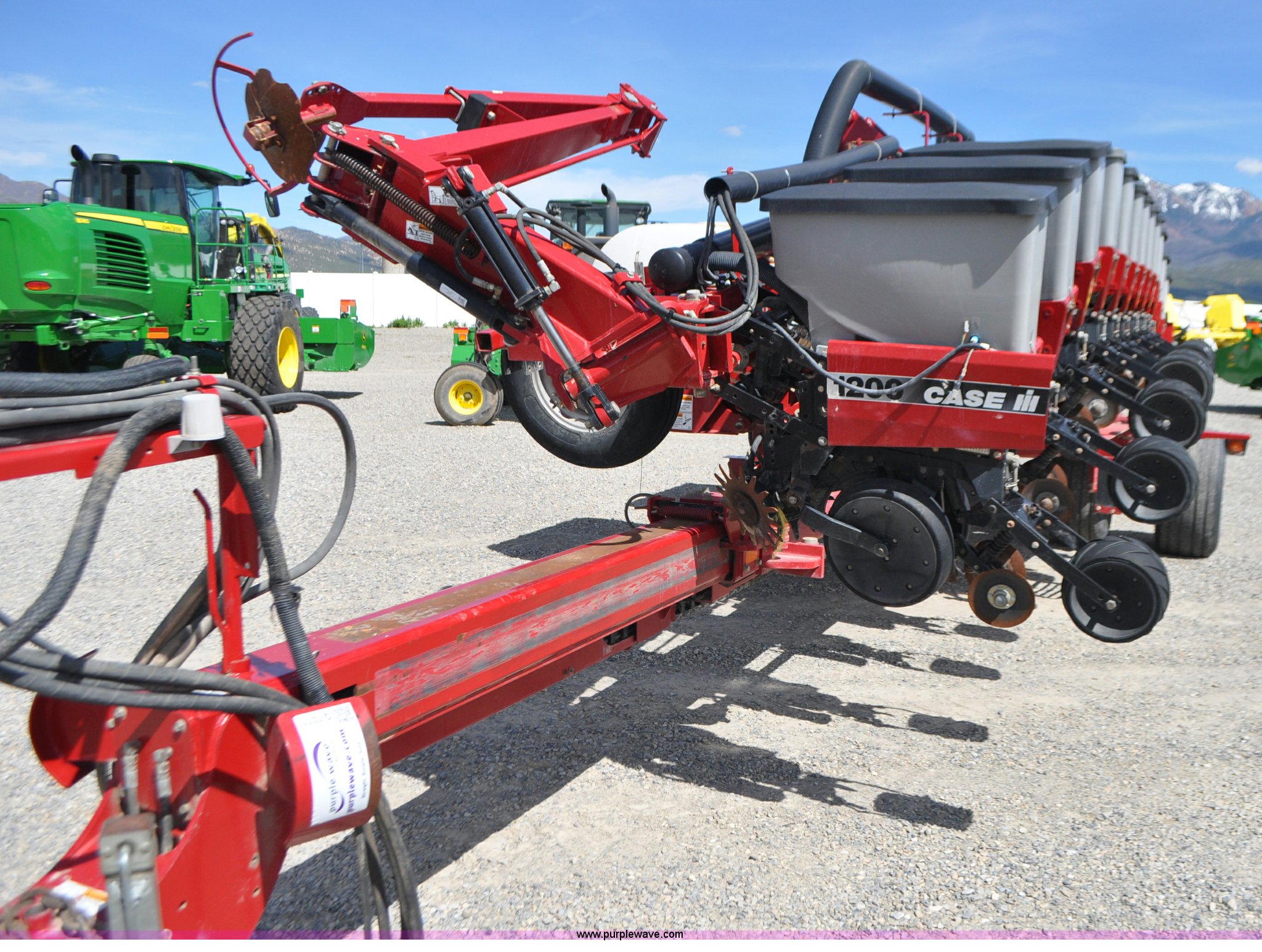 Purple Wave is selling a used Planter in Utah. This item is a Case IH 1200 planter with the following: 12 row units, 30" row spacing, Marker arms, Hydraulic pivot fold, Individual seed hoppers, Vacuum metering, Hydraulic meter drive, Row cleaners, Double disk openers, Double gauge wheels, Double steel disk closing system, 400 gallon liquid fertilizer tank, In furrow fertilizer tubes, Piston pump, Case IH AFS monitor, Pin hitch, (4) 16.5L-16.1 transport tires, (2) 7.60-15 outside tires, Serial CBJ0018305, Unit# U15J0273