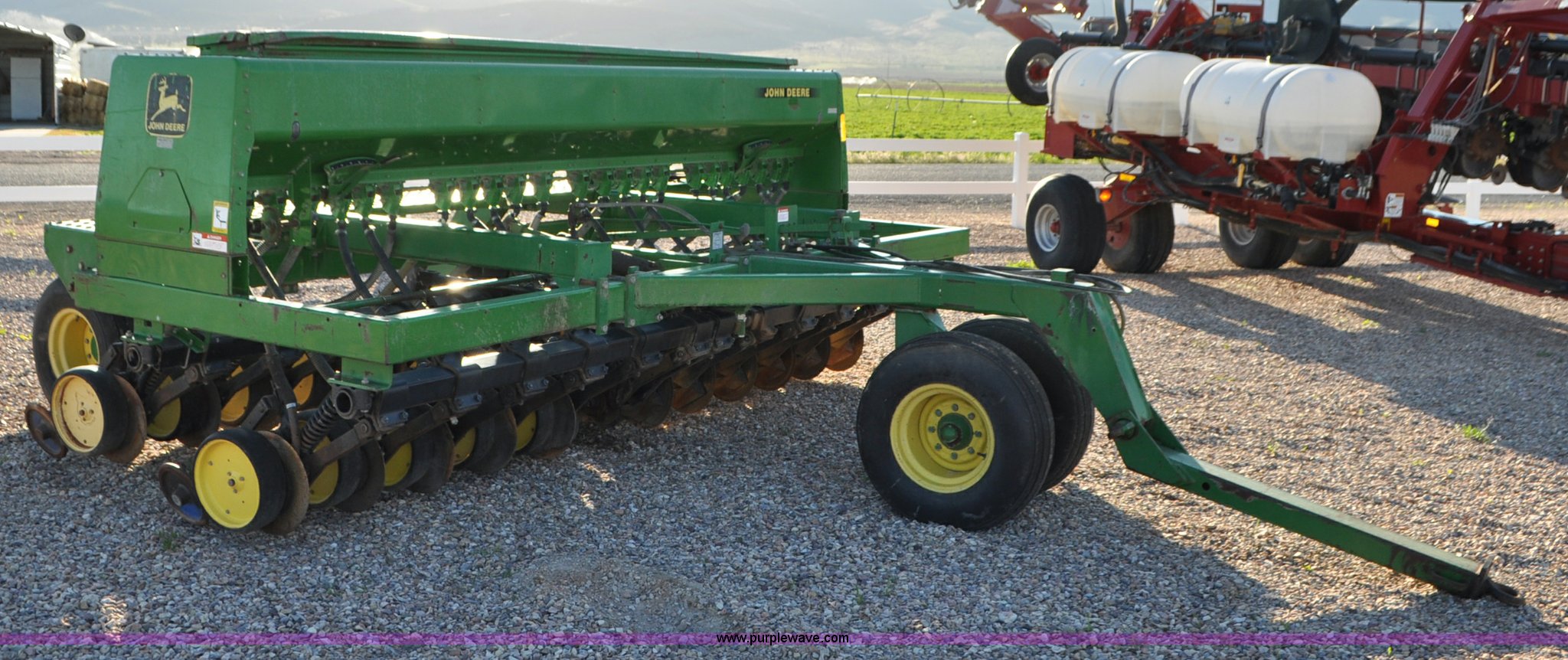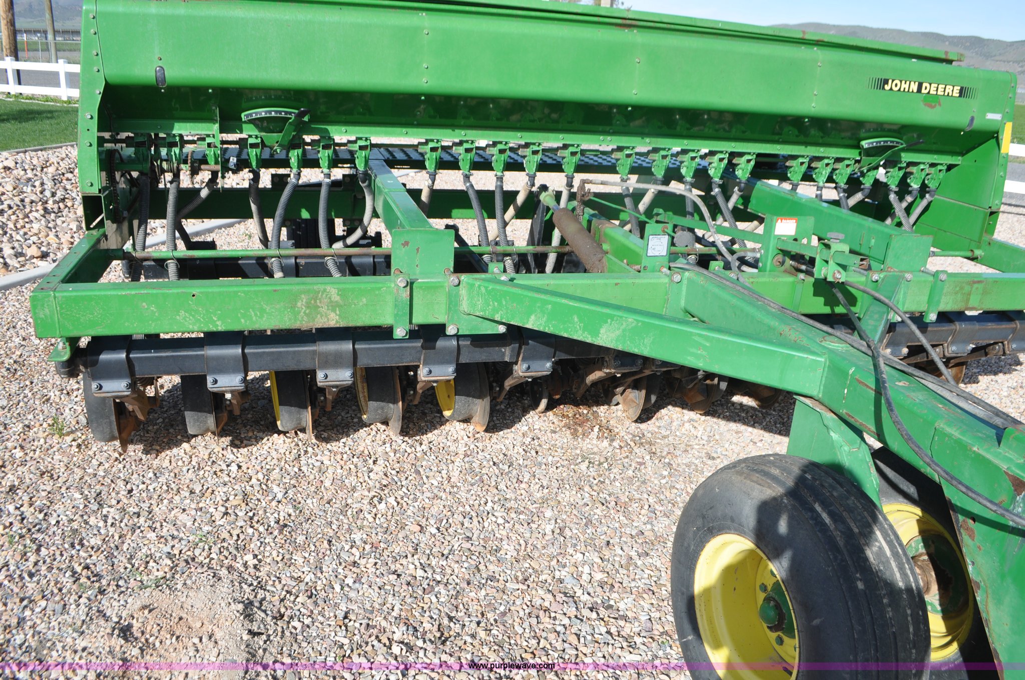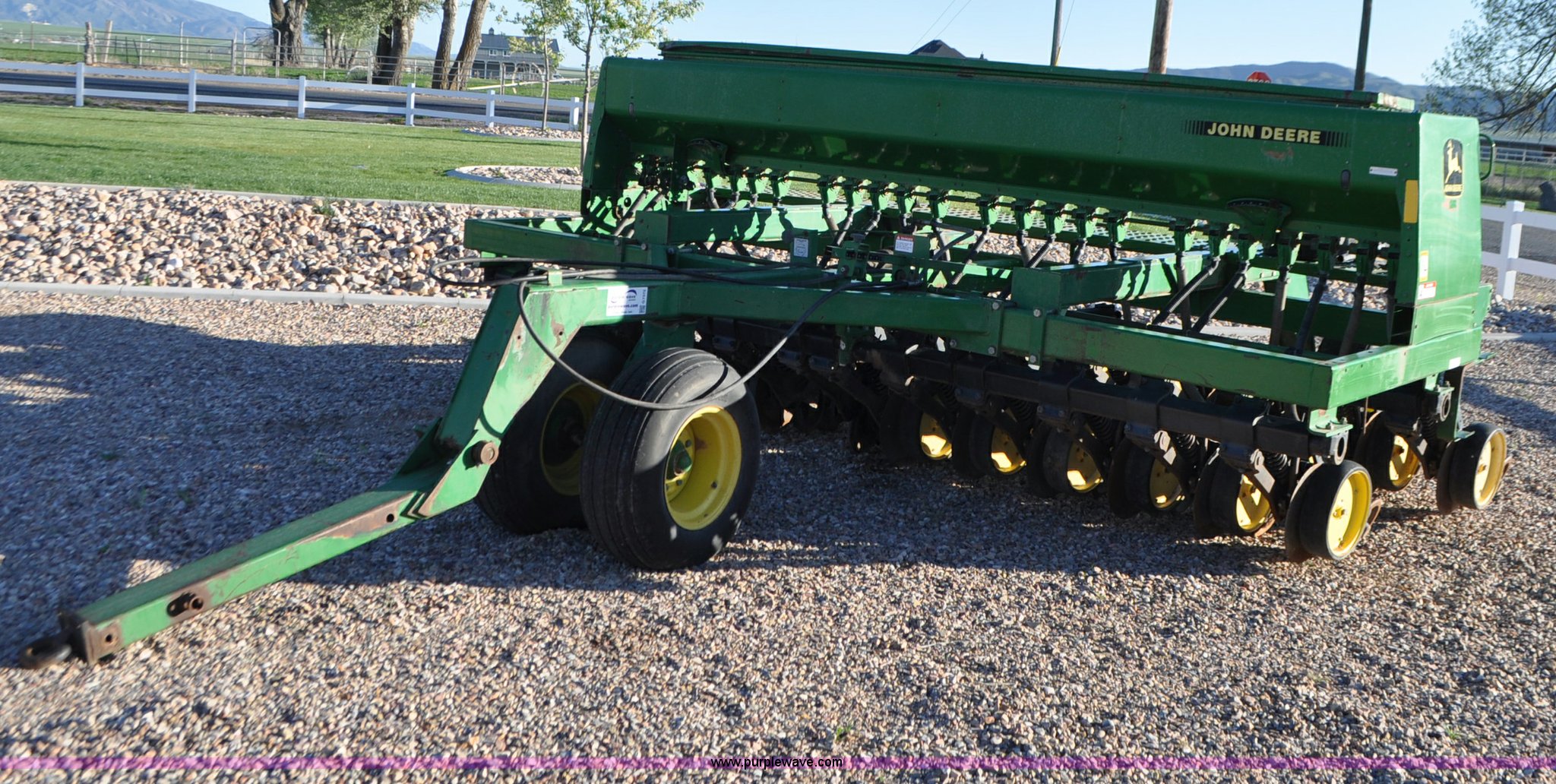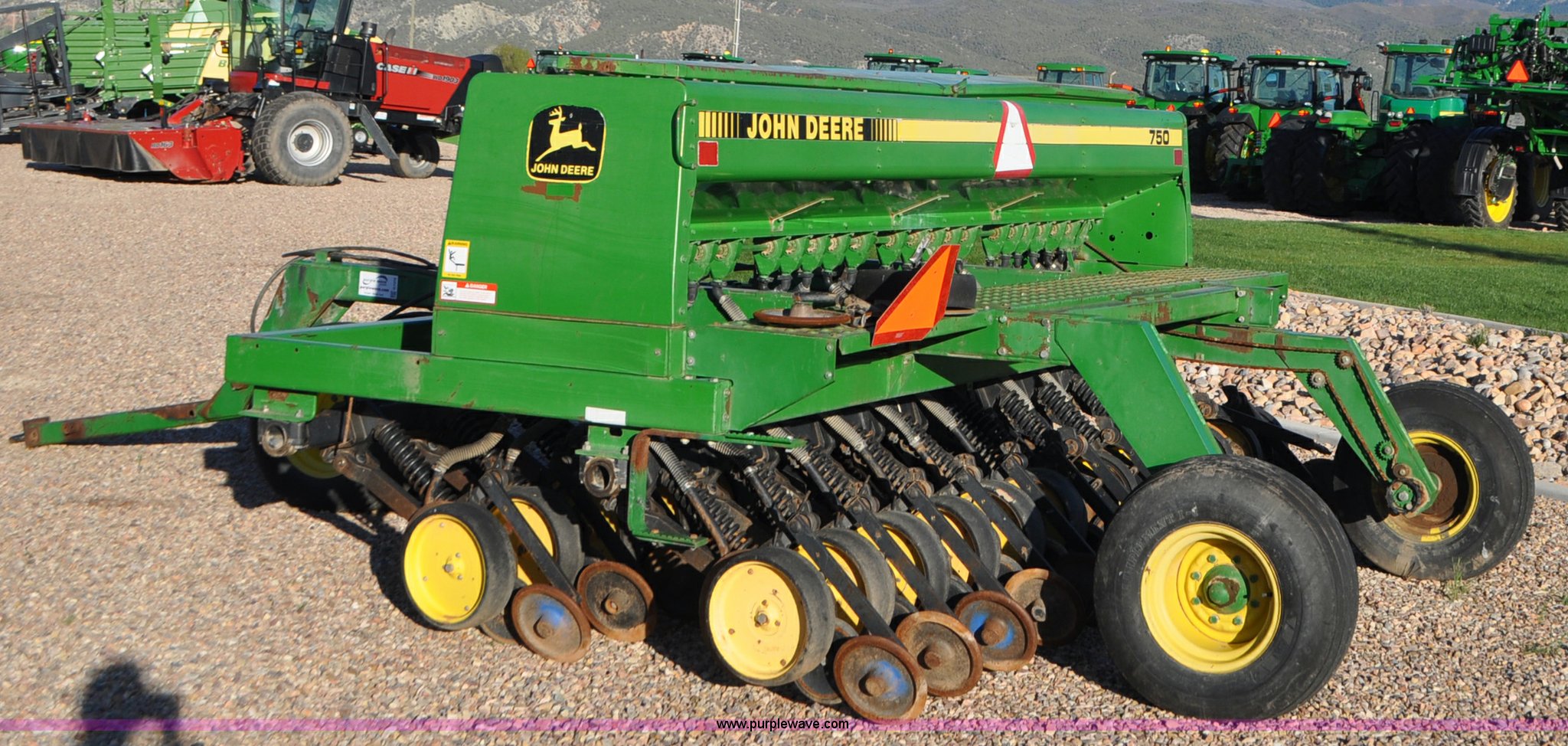 Purple Wave is selling a used Grain Drill or Seeder in Utah. This item is a 1992 John Deere 750 grain drill with the following: 24 row units, 7.5" spacing, Bulk fill system, Ground meter drive, Single disk openers, Single gauge wheels, Single cast closing system, Pin hitch, (4) 12.5L-16 transport tires, Hopper lid damaged and bent, Serial N00750X006423, Unit# U15J0931