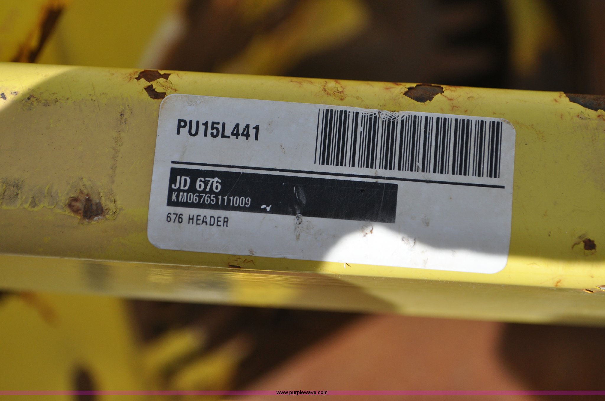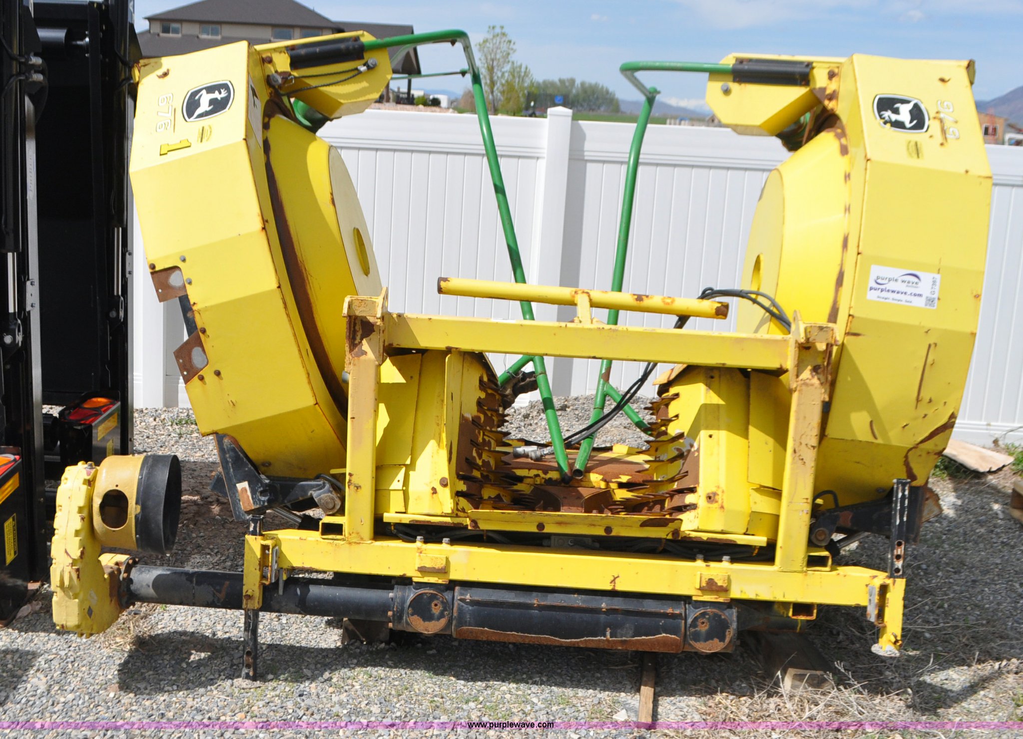Purple Wave is selling a used Forage Head or Silage Handling in Utah. This item is a 2005 John Deere 676 rotary head with the following: 15'W, Six rows, 30" row spacing, Hydraulic folding, Single driveline, Serial KM0676F111009, Unit# PU15L441