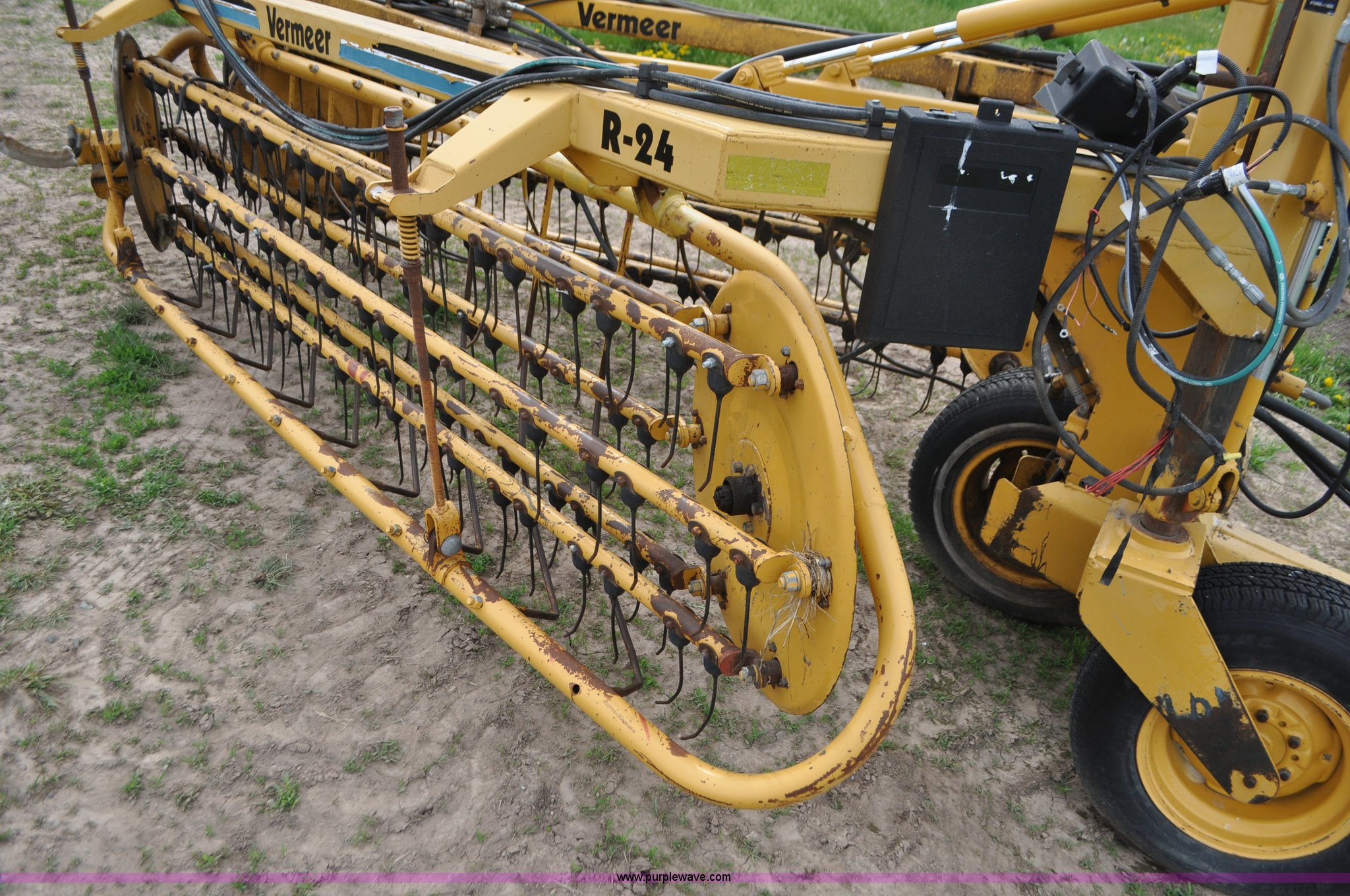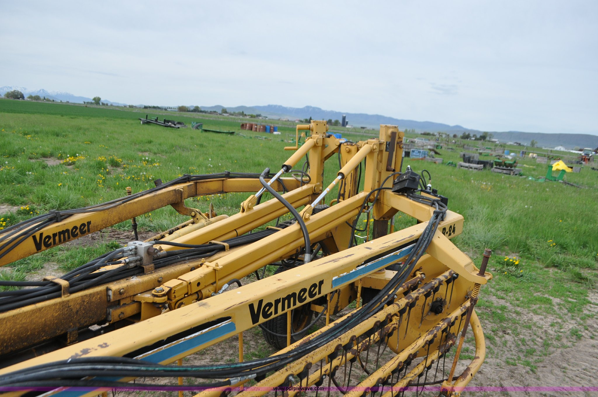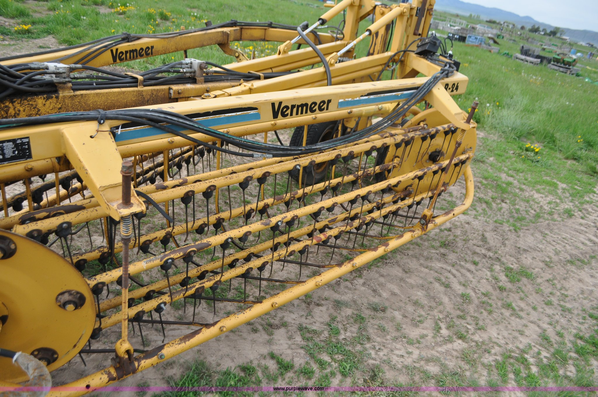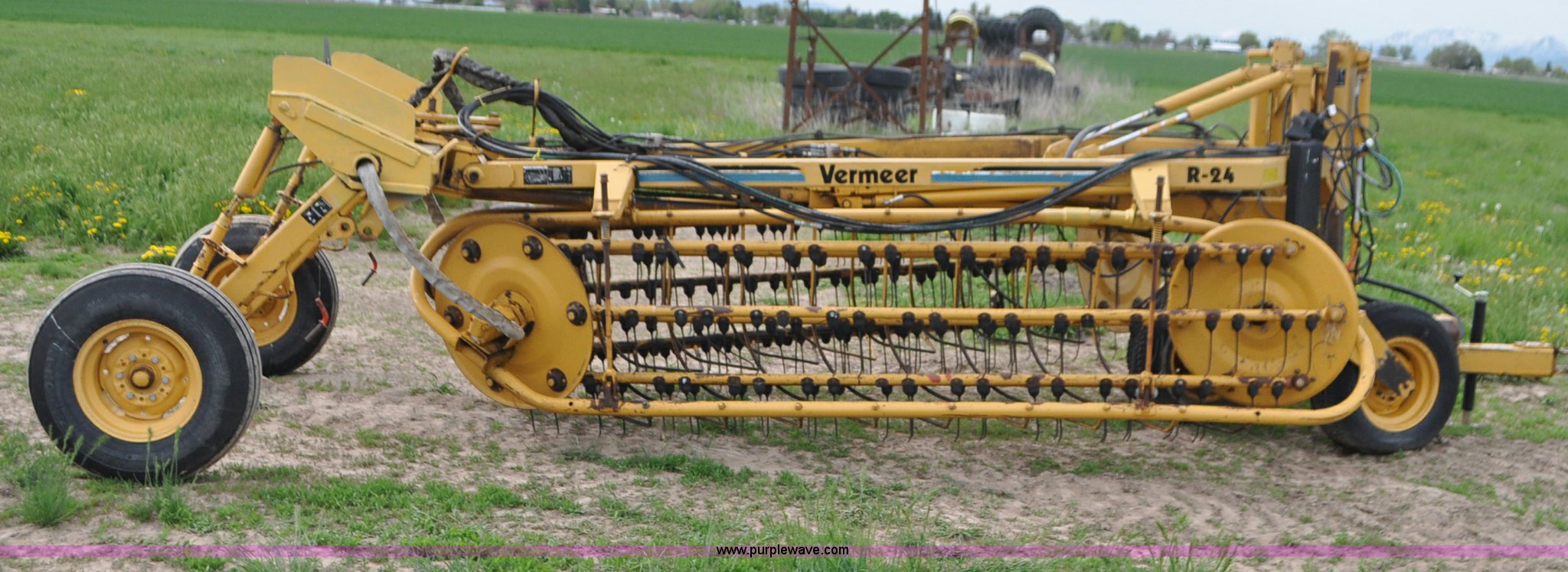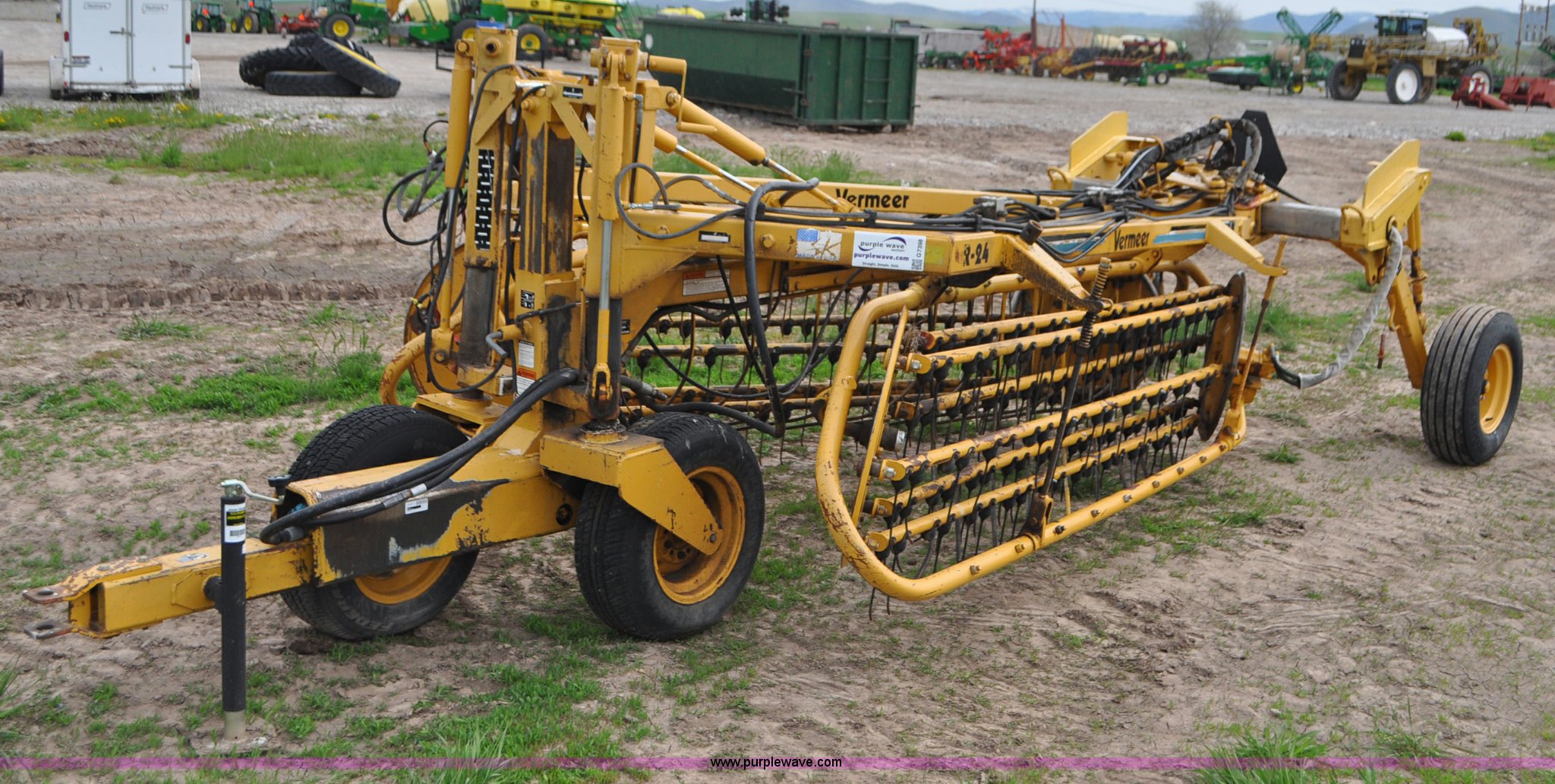 Purple Wave is selling a used Hay Rake in Idaho. This item is a Vermeer R24 twin hay rake with the following: Variable swath width, Hydraulic driven, Pin hitch, 275/75R15 wing tires, 11L-15 rear tires, Serial 1VRB221TXS1000169, Unit# I14W1482