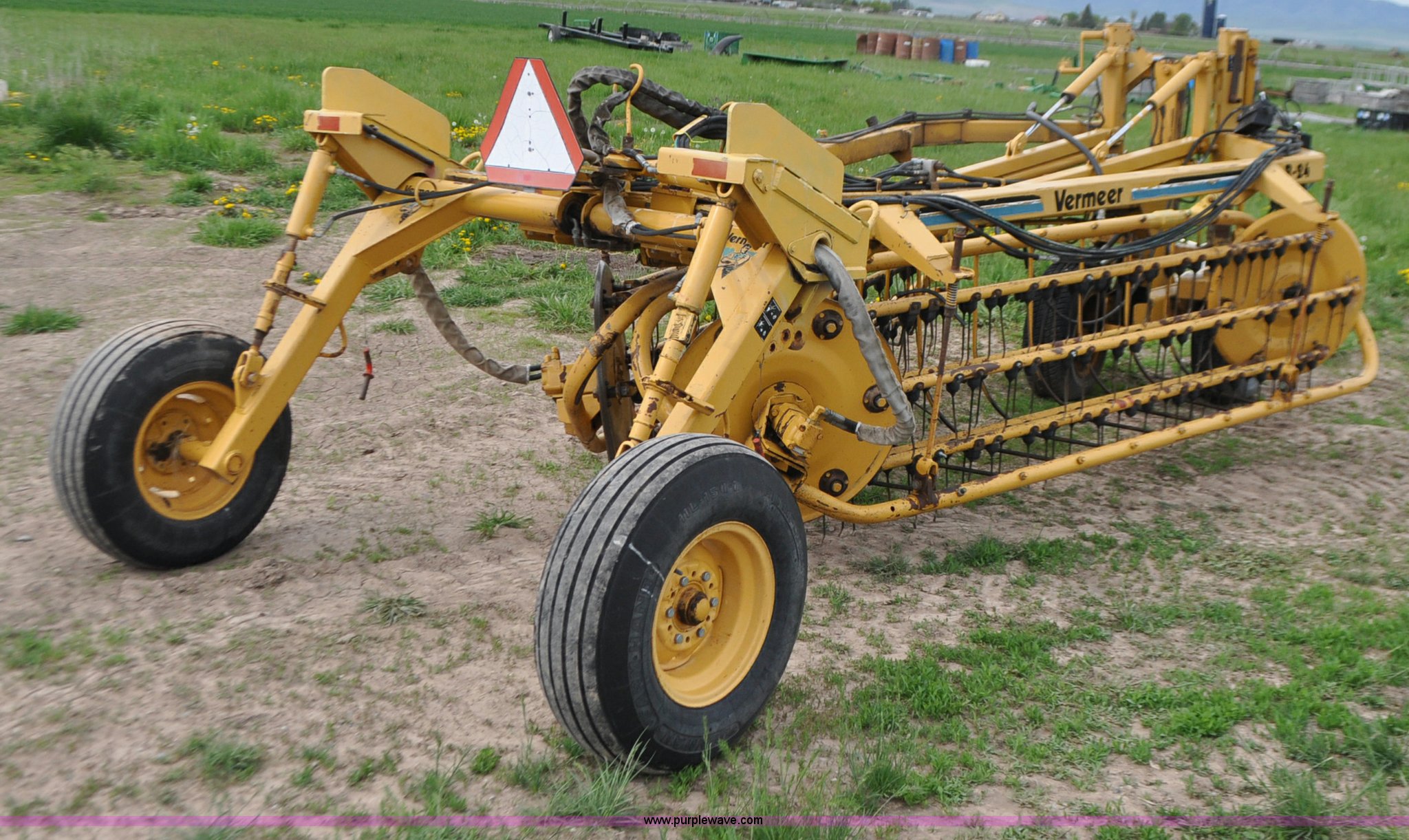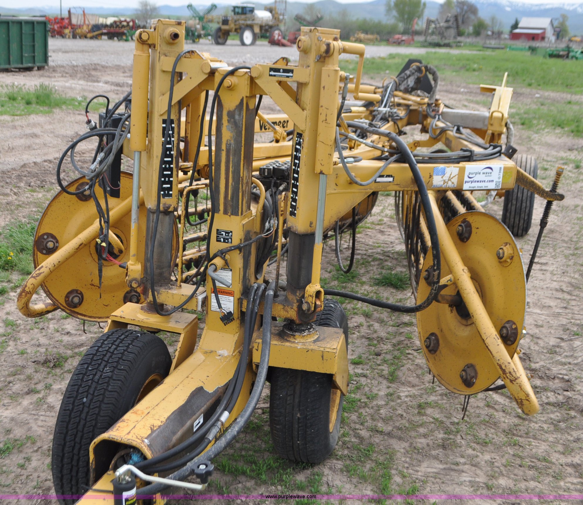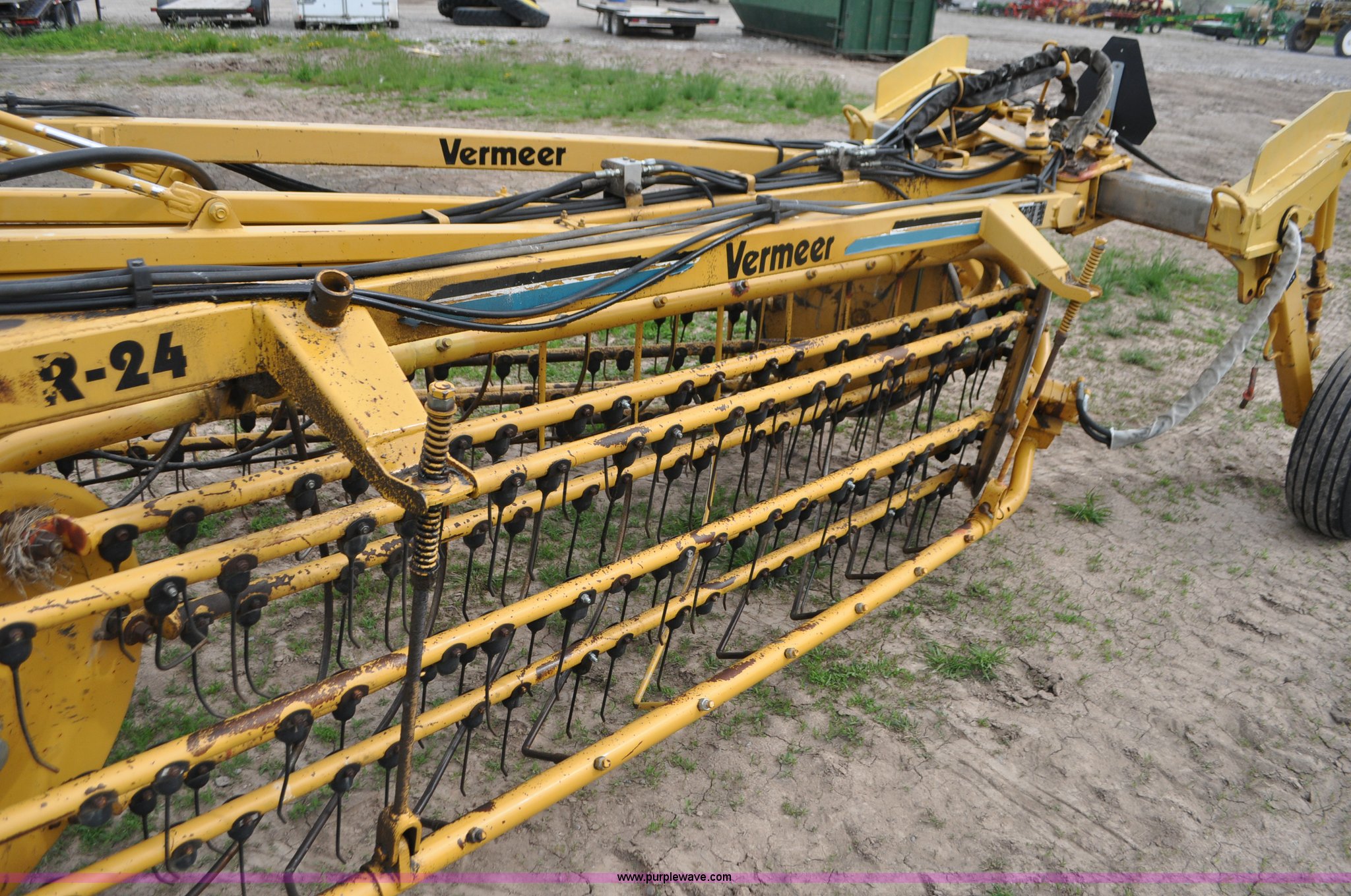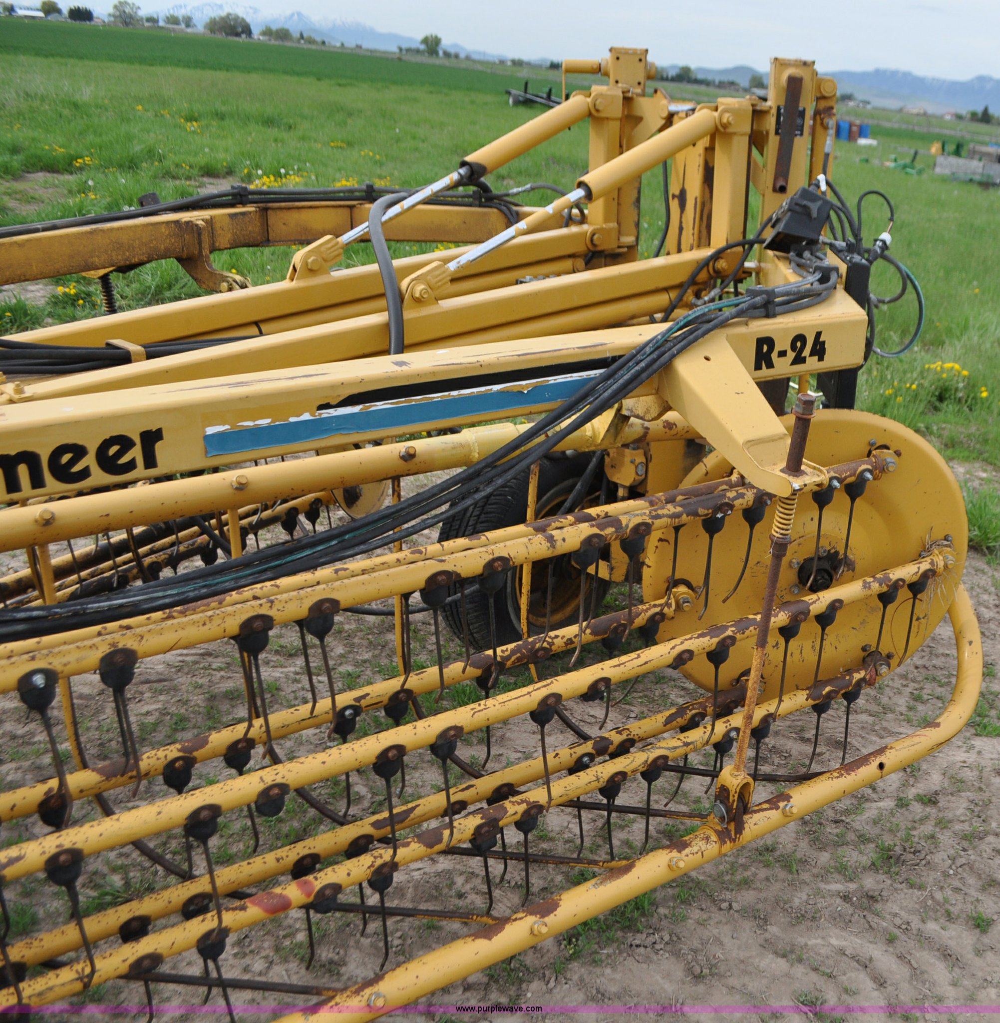Purple Wave is selling a used Hay Rake in Idaho. This item is a Vermeer R24 twin hay rake with the following: Variable swath width, Hydraulic driven, Pin hitch, 275/75R15 wing tires, 11L-15 rear tires, Serial 1VRB221TXS1000169, Unit# I14W1482