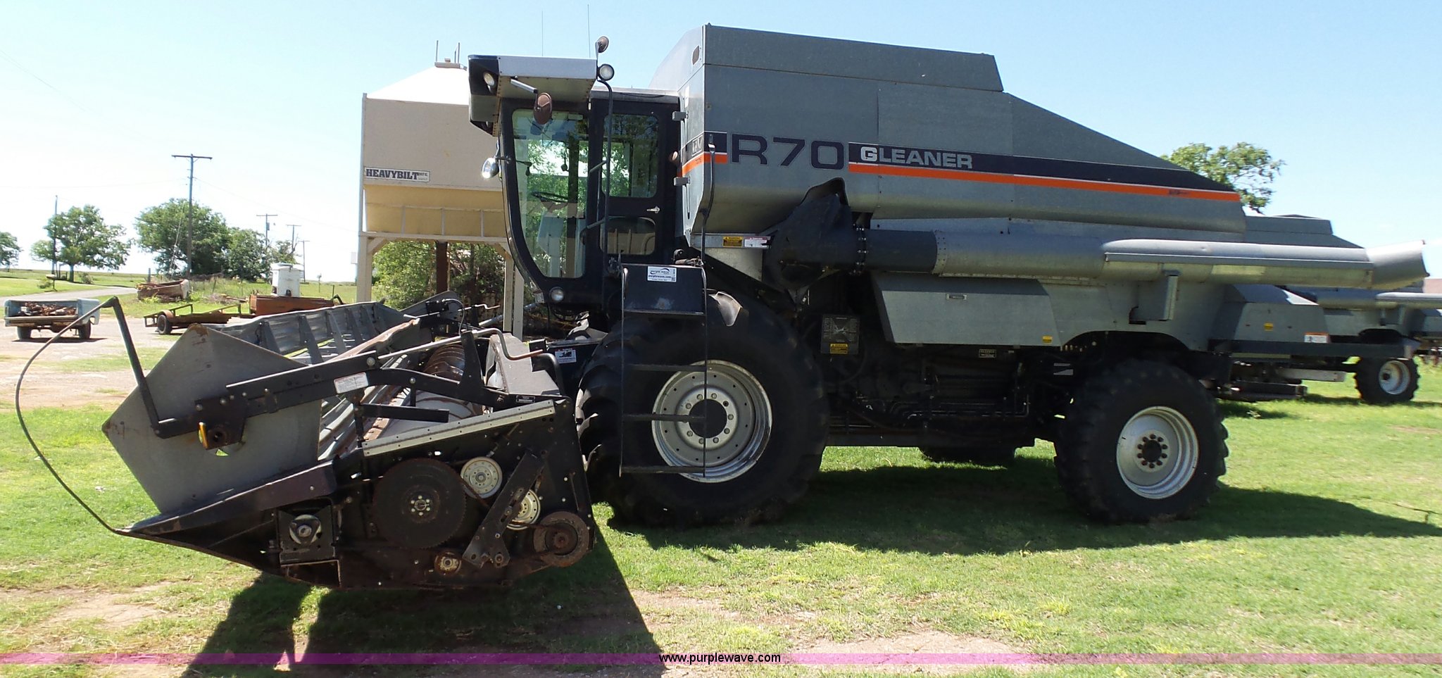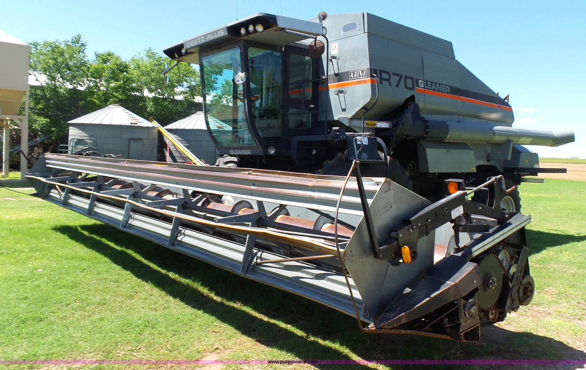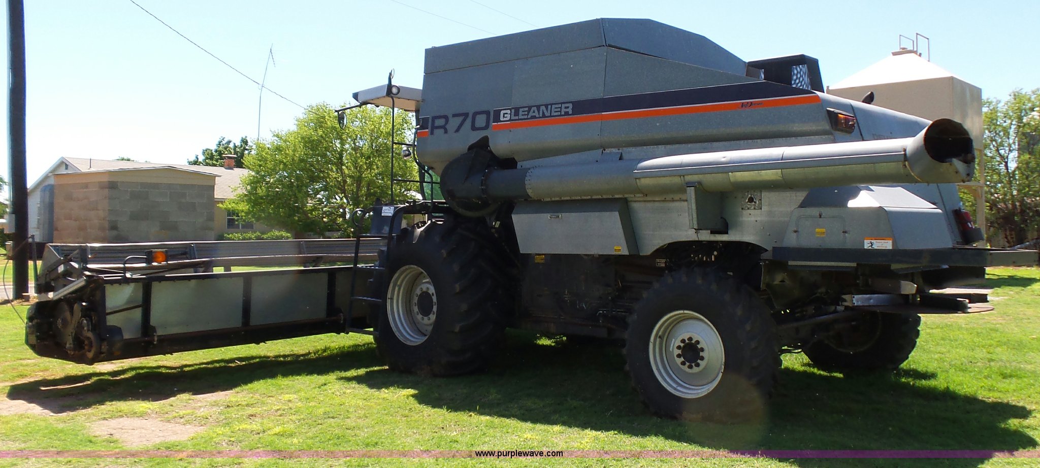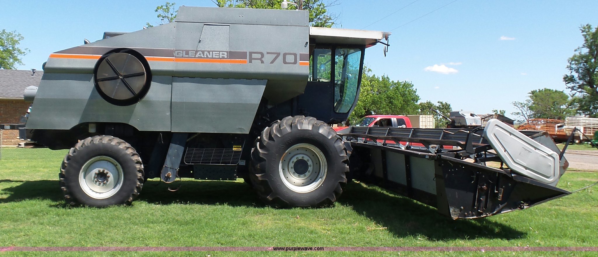 Purple Wave is selling a used Combine in Oklahoma. This item is a 1991 Gleaner R70 RWA combine with the following: 4,143 engine hours on meter, 3,146 separator hours on meter, Unknown actual hours, Deutz eight cylinder diesel engine, Serial 7782276, Four speed manual transmission, Rear wheel assist, Tilt steering wheel, AM/FM, Suspension seat, Work lights, 15'L unloading auger, AGCO rigid head, 30'W, Serial 3040143G, 30.5L-32 front tires, 16.9R26 rear tires, Serial R70K012855H9191
