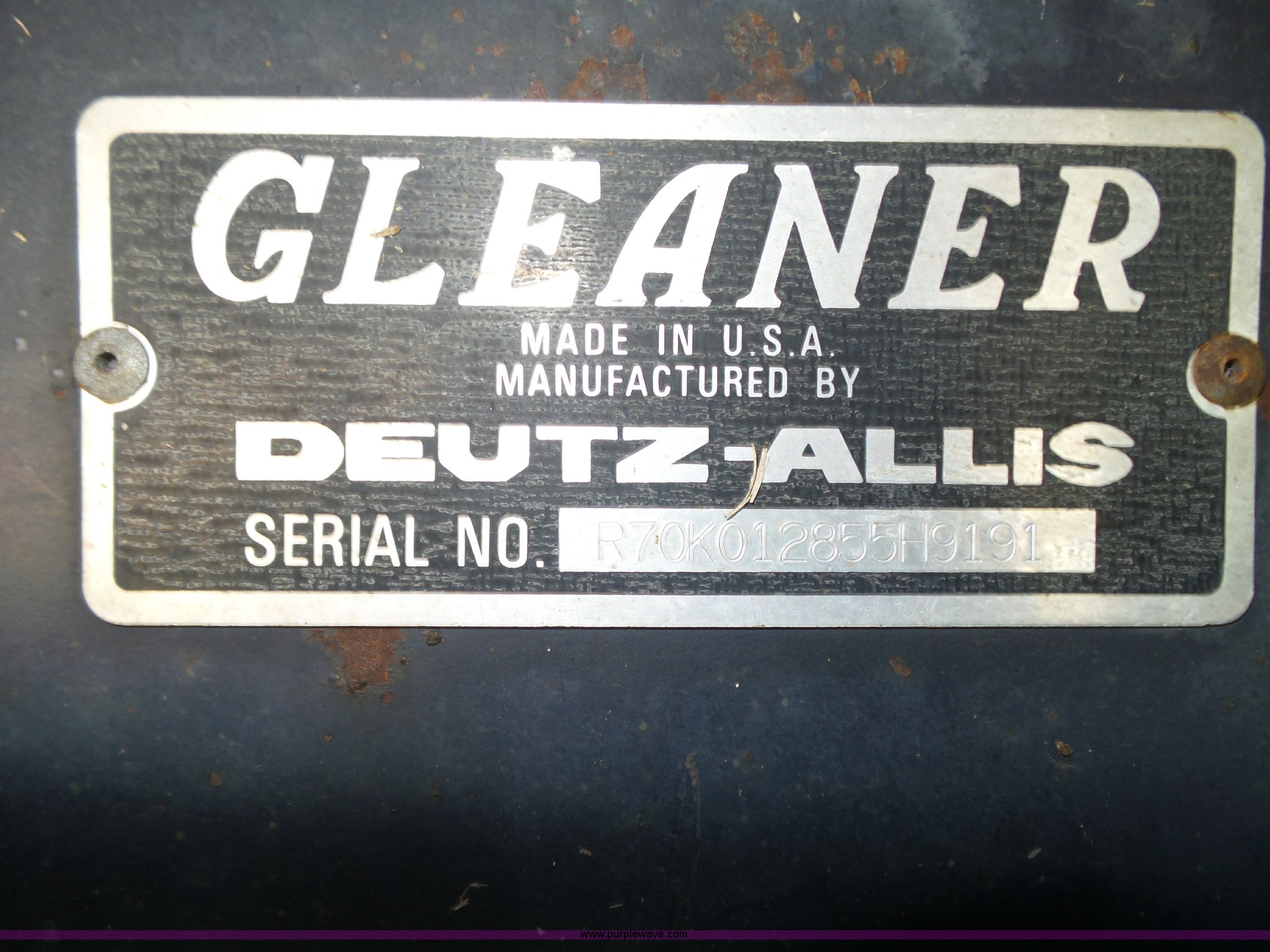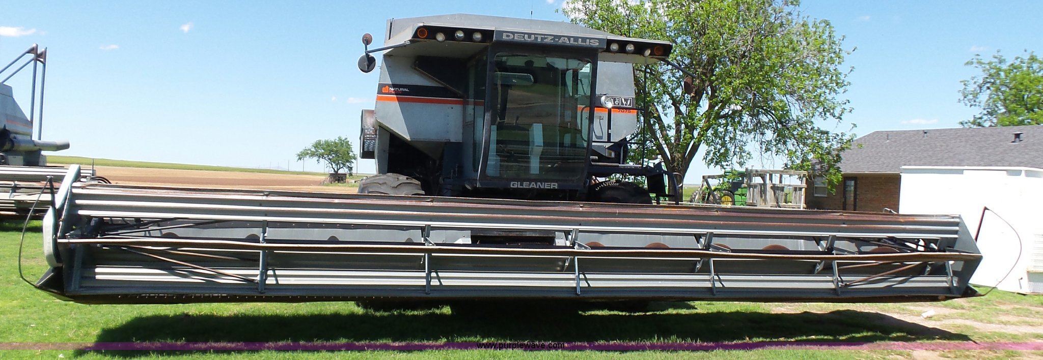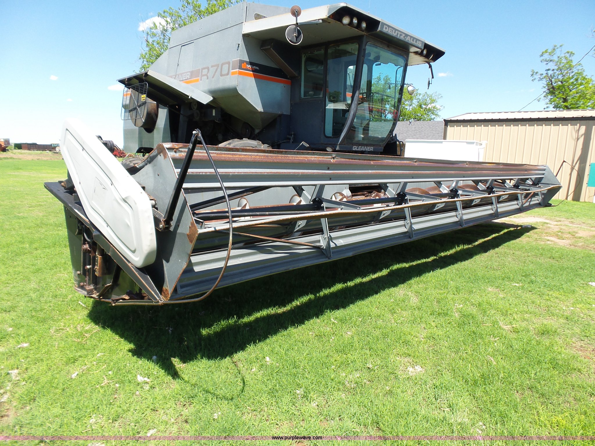 Purple Wave is selling a used Combine in Oklahoma. This item is a 1991 Gleaner R70 RWA combine with the following: 4,143 engine hours on meter, 3,146 separator hours on meter, Unknown actual hours, Deutz eight cylinder diesel engine, Serial 7782276, Four speed manual transmission, Rear wheel assist, Tilt steering wheel, AM/FM, Suspension seat, Work lights, 15'L unloading auger, AGCO rigid head, 30'W, Serial 3040143G, 30.5L-32 front tires, 16.9R26 rear tires, Serial R70K012855H9191