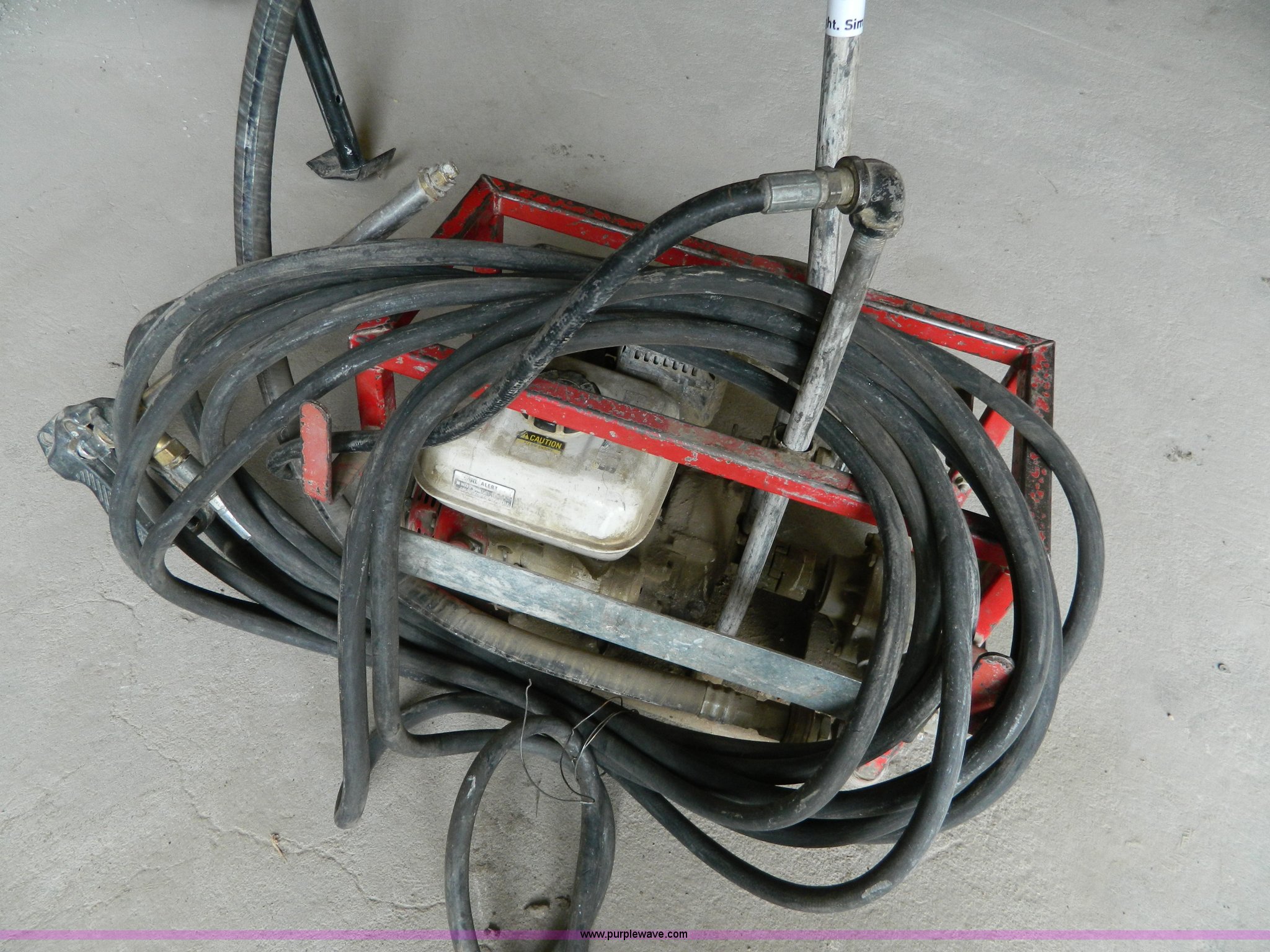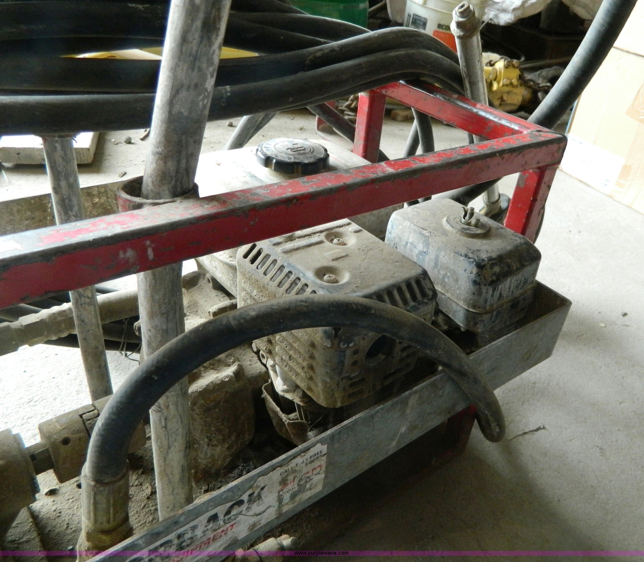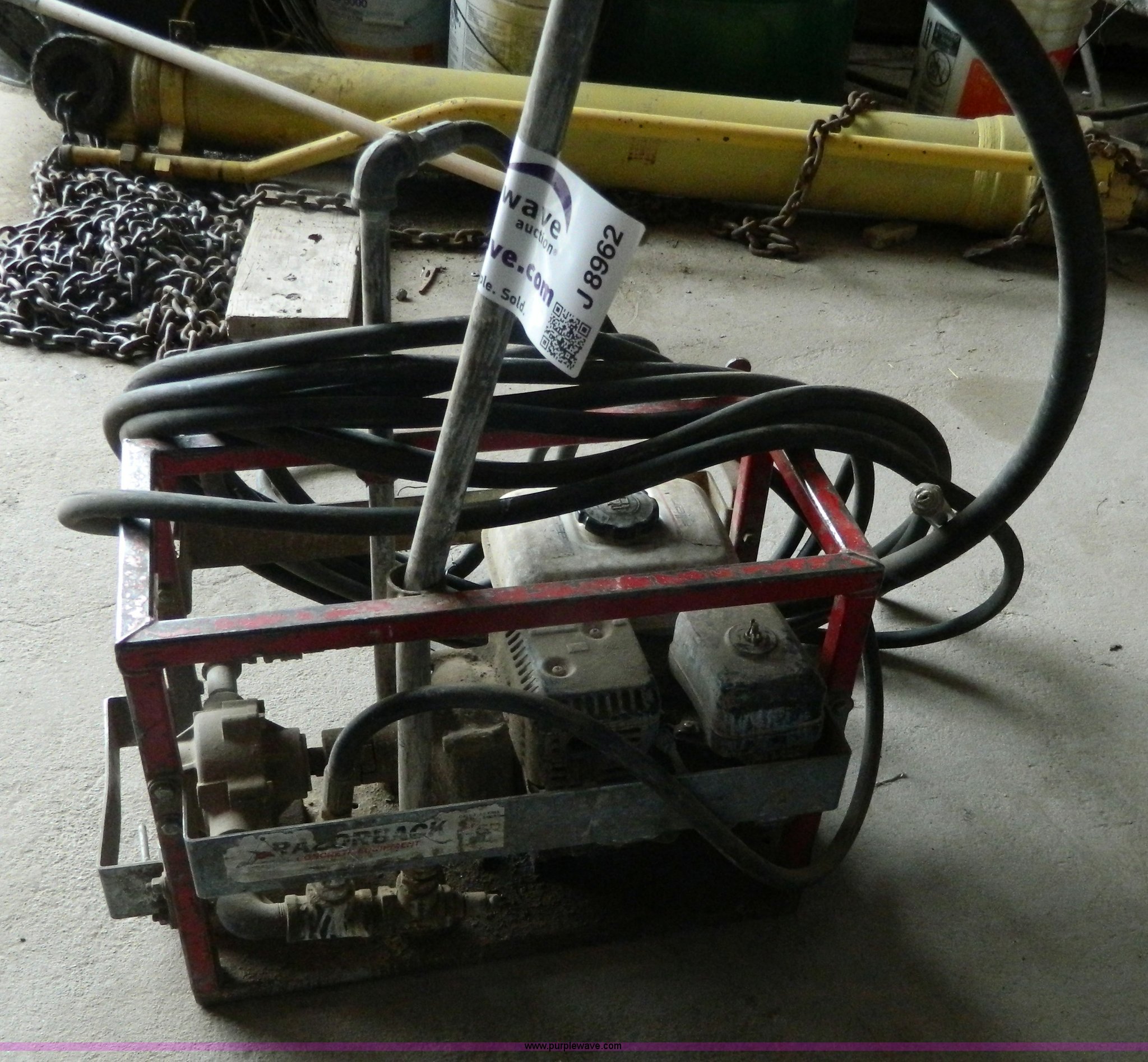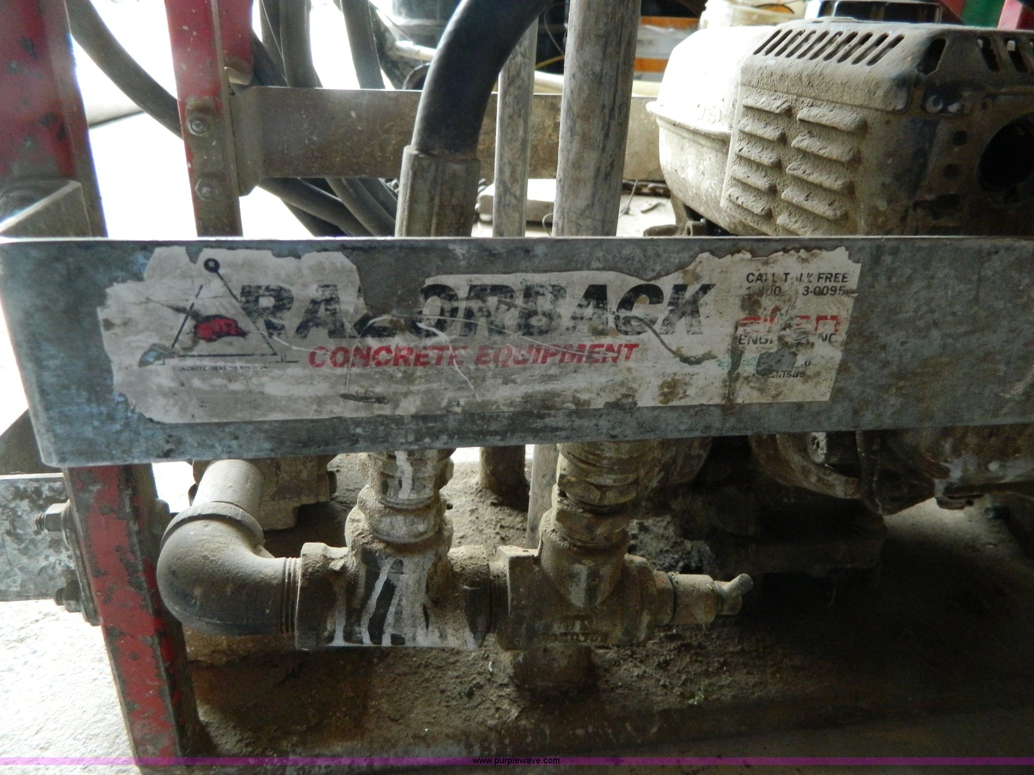 Purple Wave is selling a used Concrete Equip. or Acces. in Kansas. This item is a Razor Back curing solution pump with the following: Gas engine, Roller pump, Spray wand, Hose