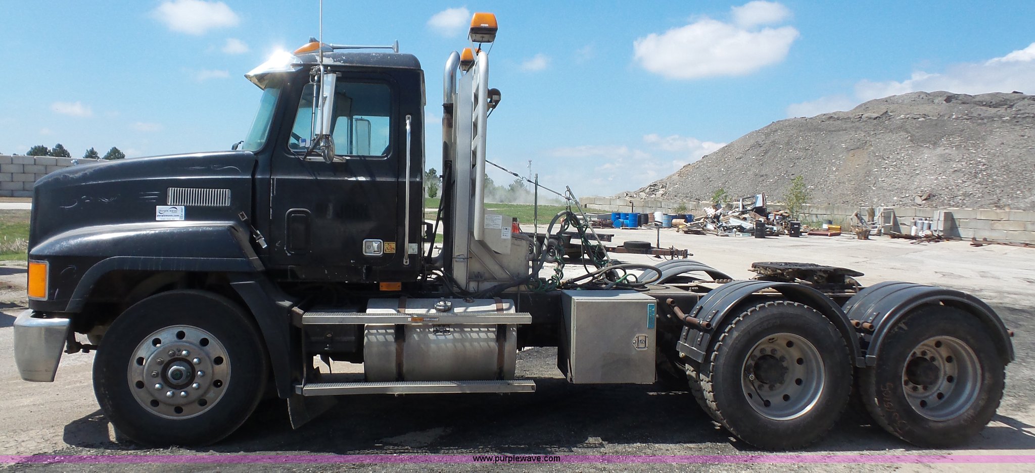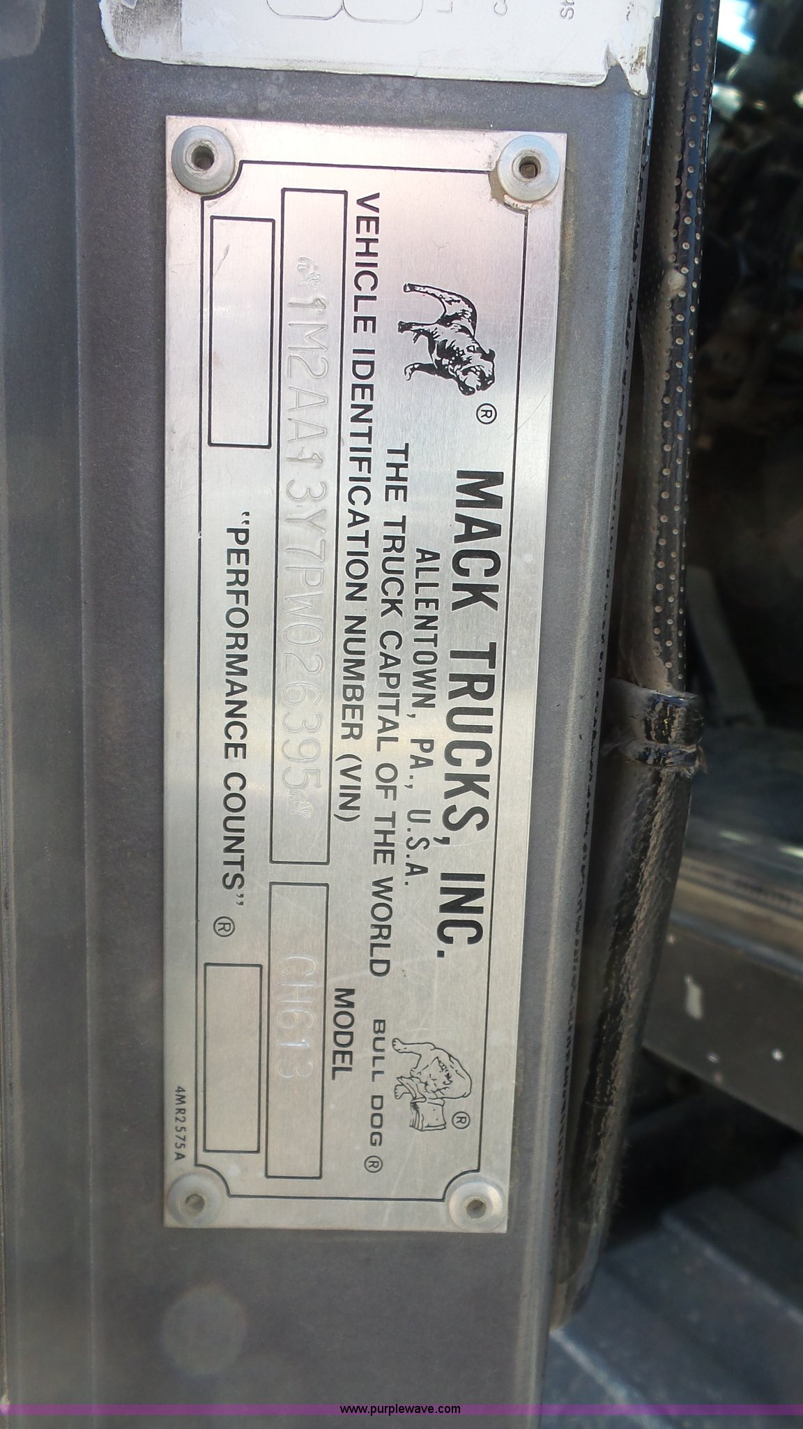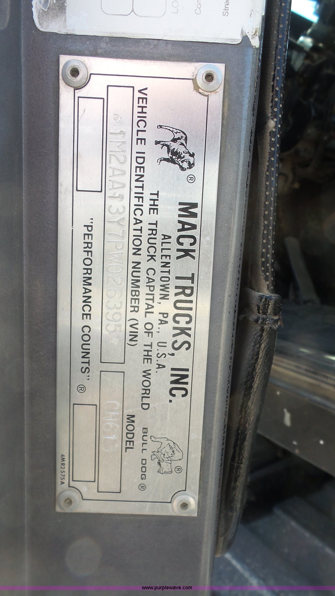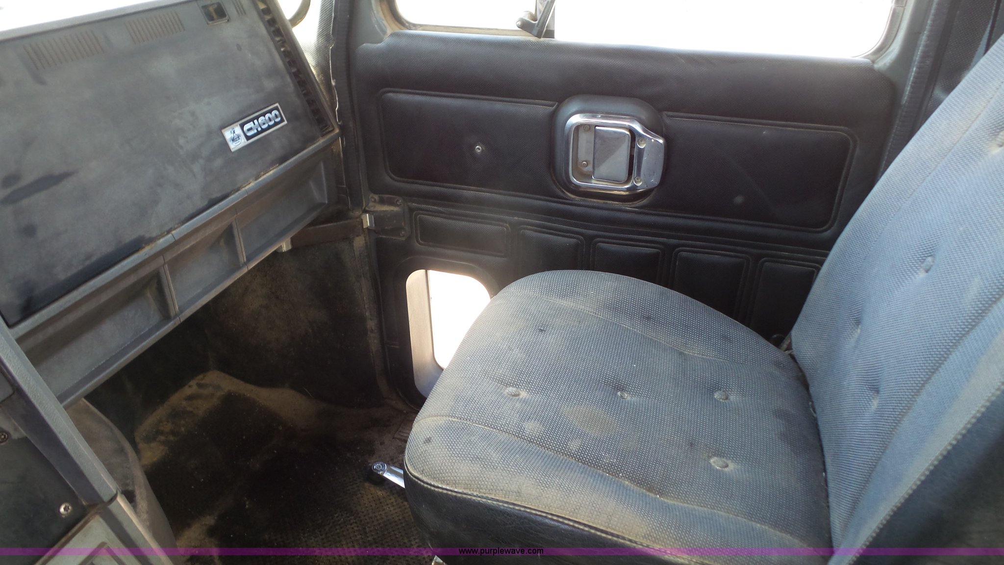 Purple Wave is selling a used Truck Tractor in Kansas. This item is a 1993 Mack CH613 semi truck with the following: 633,344 miles on odometer, 32,383 hours on meter, Mack E7 12.0L L6 turbo diesel engine, Eaton Fuller 13 speed manual transmission, Tandem axle, Inter-axle differential lock, AC and heat, AM/FM, Beacon light, Front tow hooks, Exterior visor, PTO, Wet kit, Aluminum headache rack, Chain hanger, Steel deck plate, Sliding fifth wheel plate, Single rear exhaust stack, Full plastic fenders, Spring suspension, Air brakes, 11R24.5 tires, Recently replaced brakes and drums on front axle
