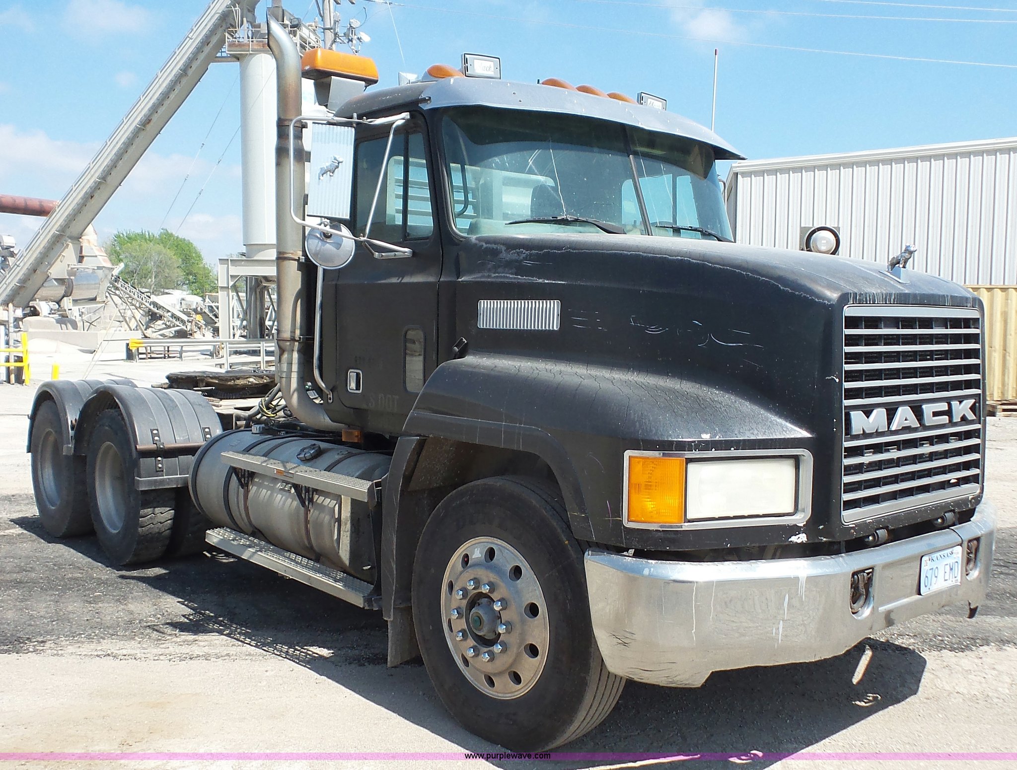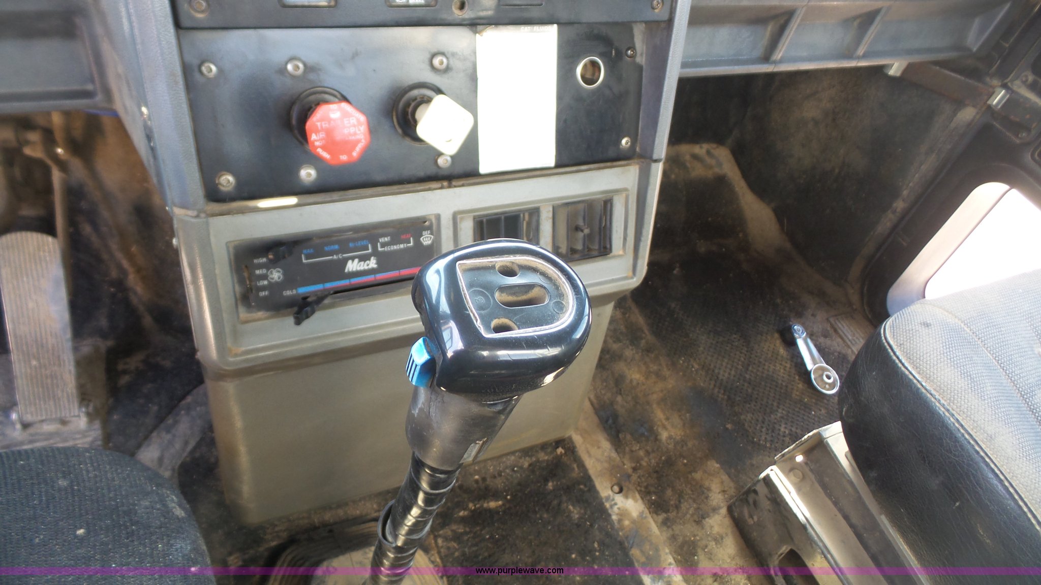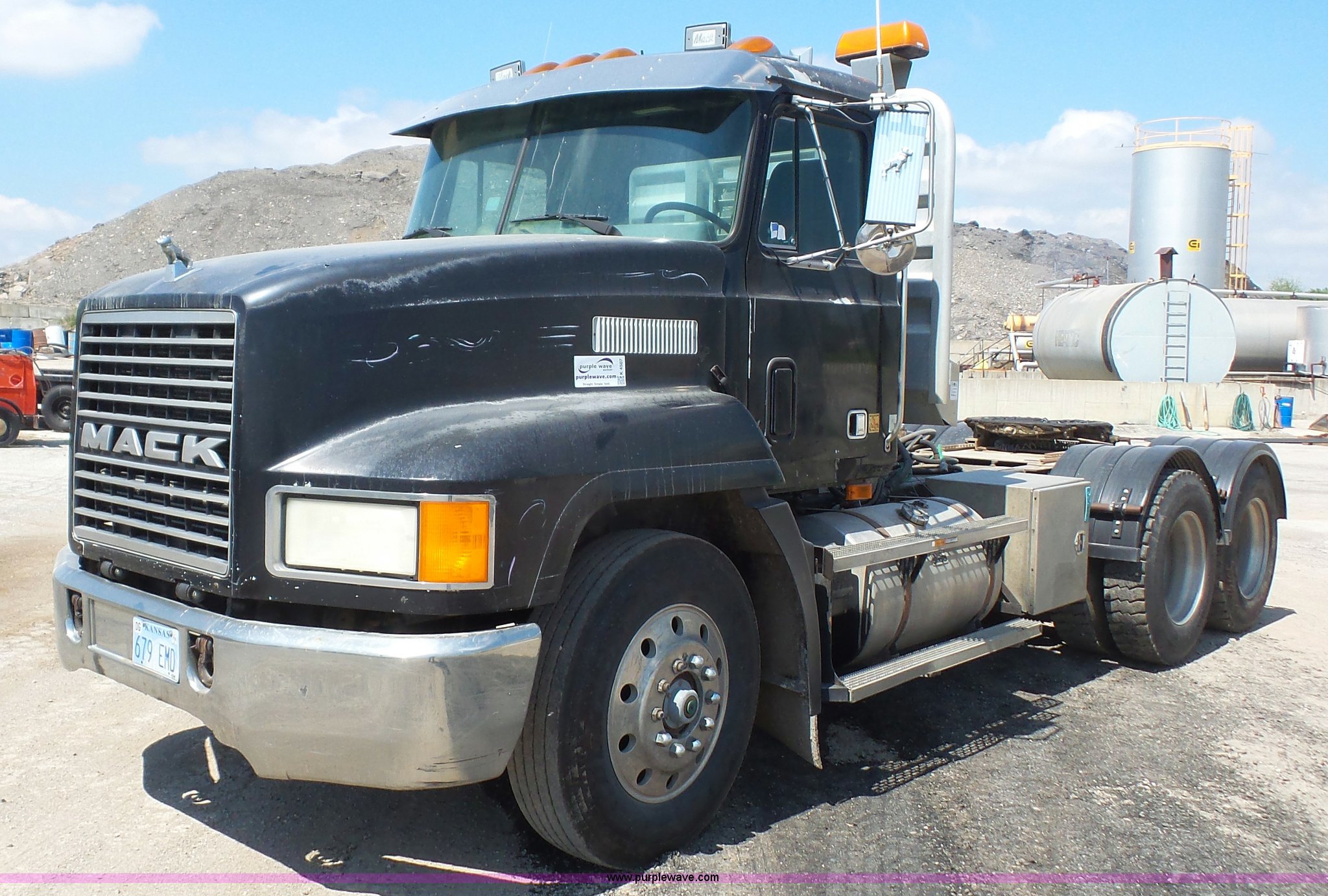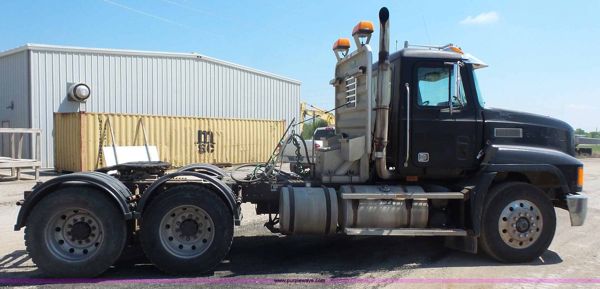 Purple Wave is selling a used Truck Tractor in Kansas. This item is a 1993 Mack CH613 semi truck with the following: 633,344 miles on odometer, 32,383 hours on meter, Mack E7 12.0L L6 turbo diesel engine, Eaton Fuller 13 speed manual transmission, Tandem axle, Inter-axle differential lock, AC and heat, AM/FM, Beacon light, Front tow hooks, Exterior visor, PTO, Wet kit, Aluminum headache rack, Chain hanger, Steel deck plate, Sliding fifth wheel plate, Single rear exhaust stack, Full plastic fenders, Spring suspension, Air brakes, 11R24.5 tires, Recently replaced brakes and drums on front axle