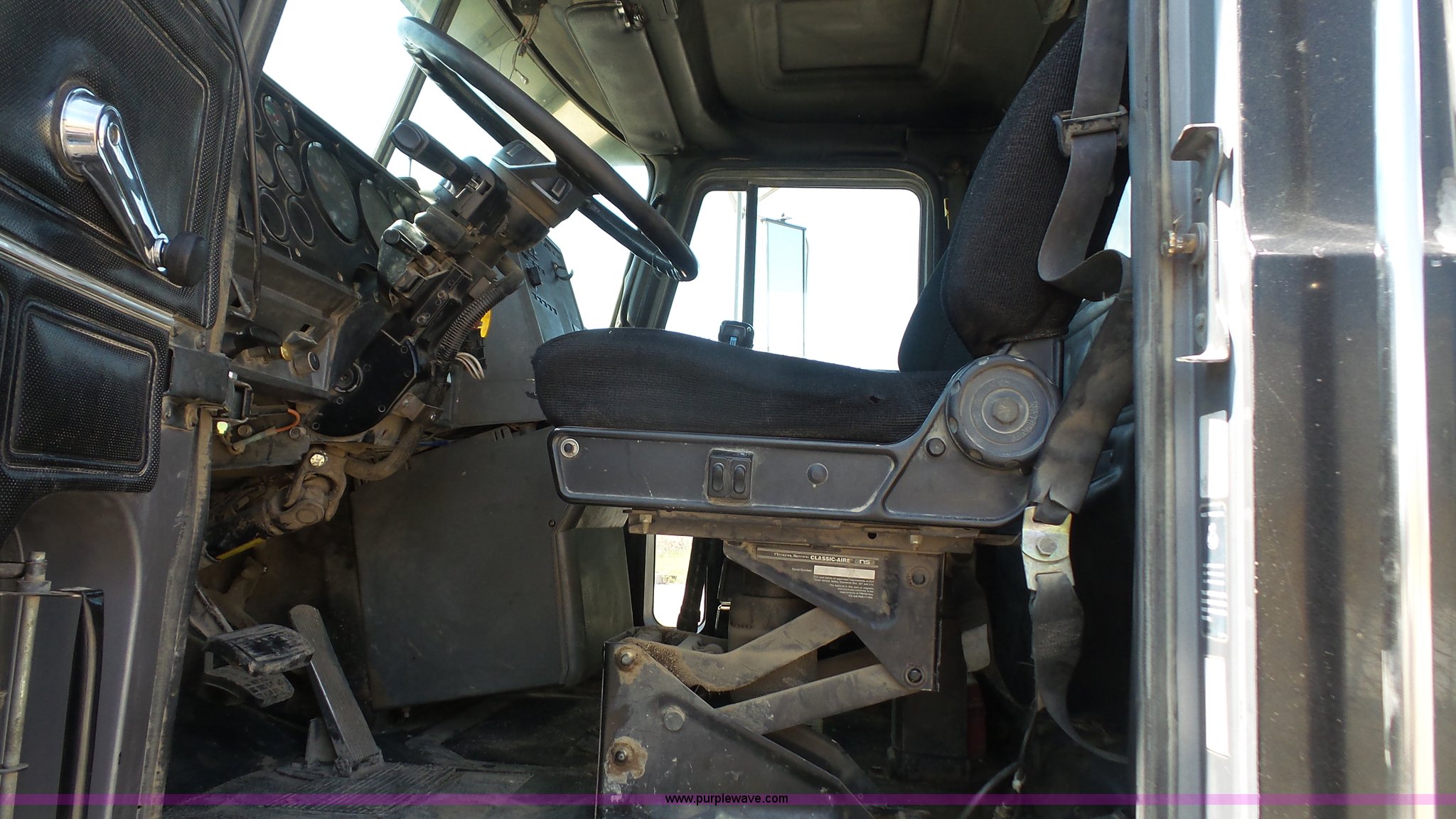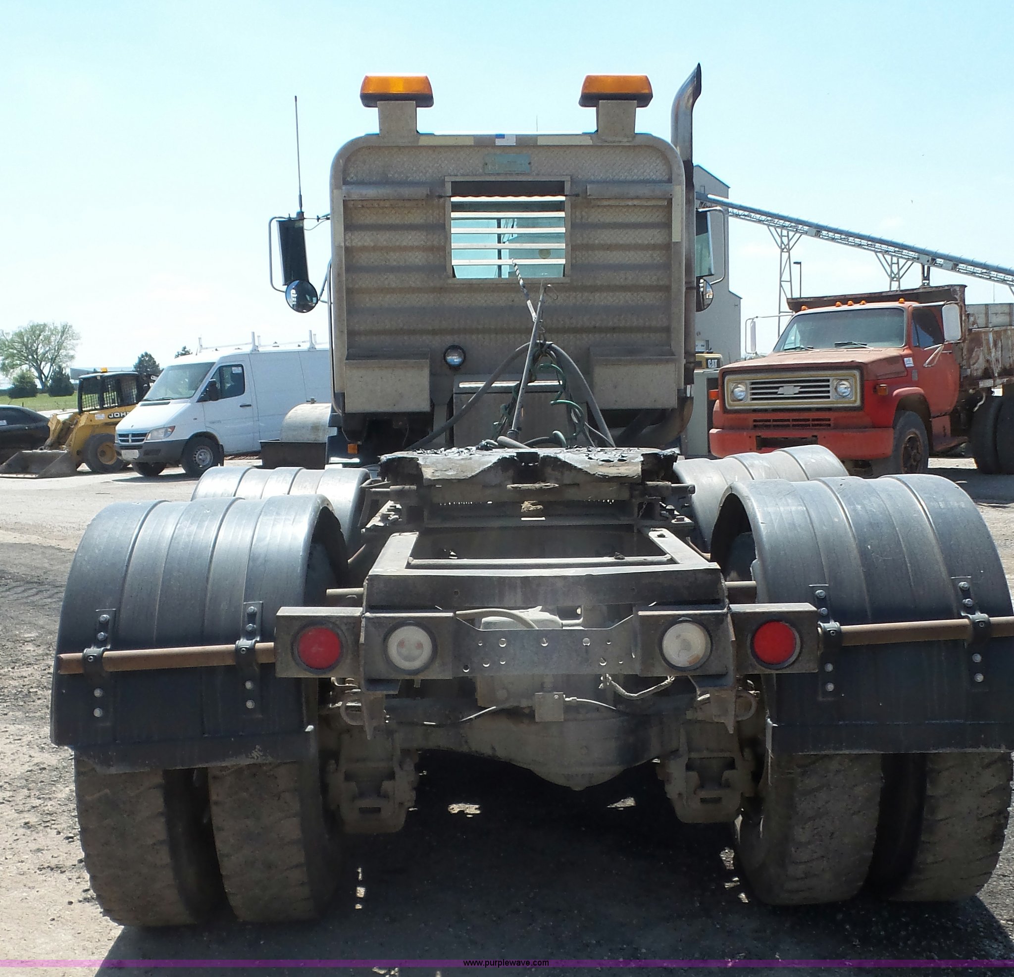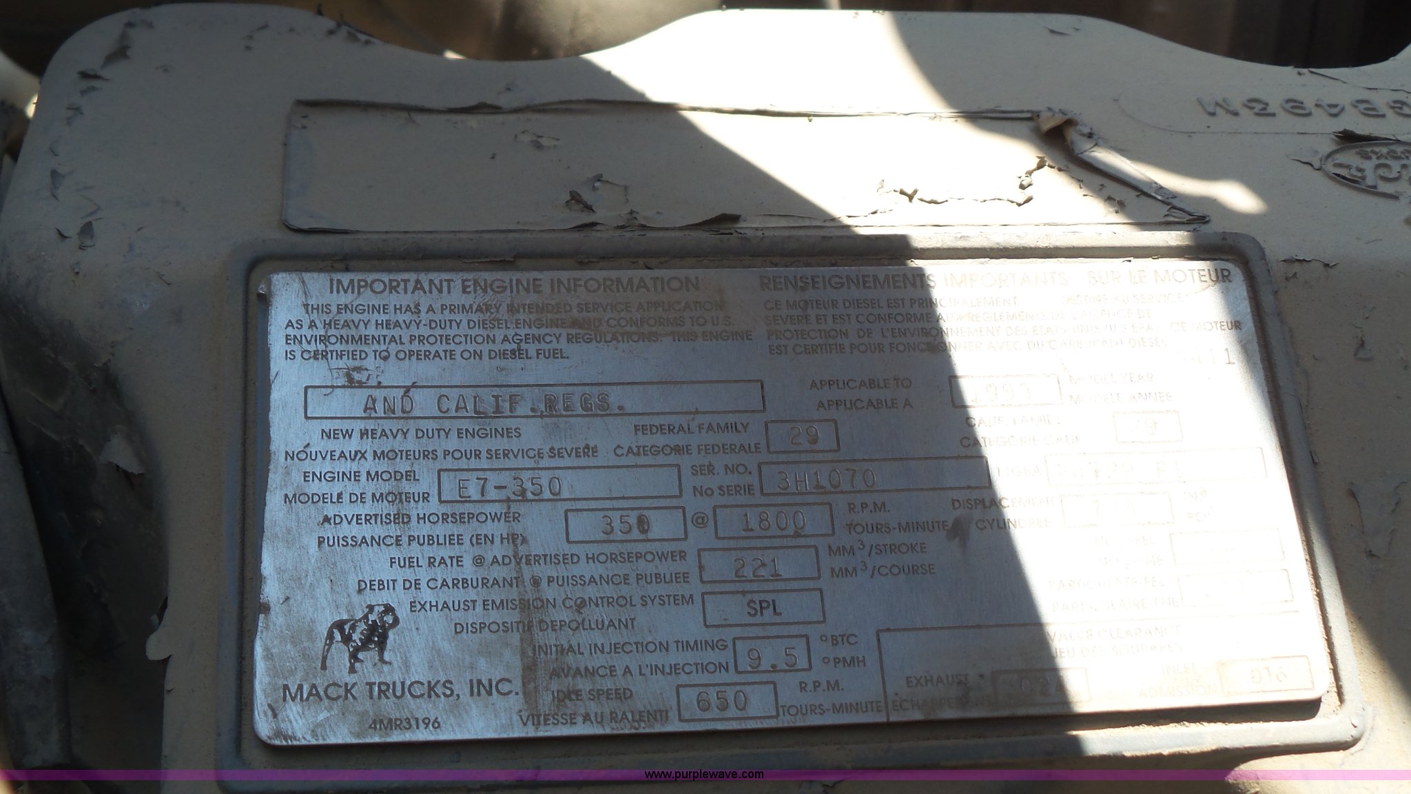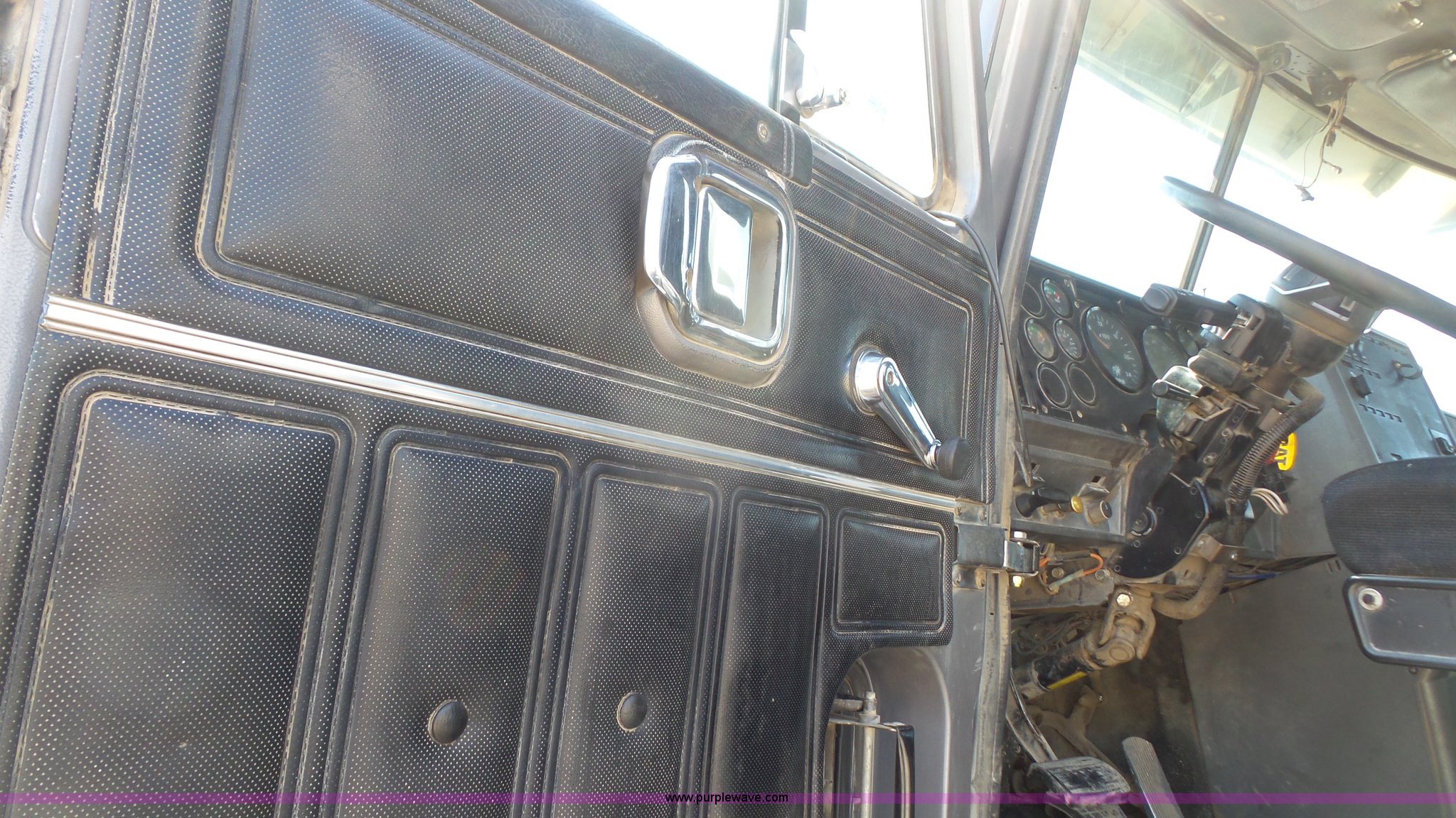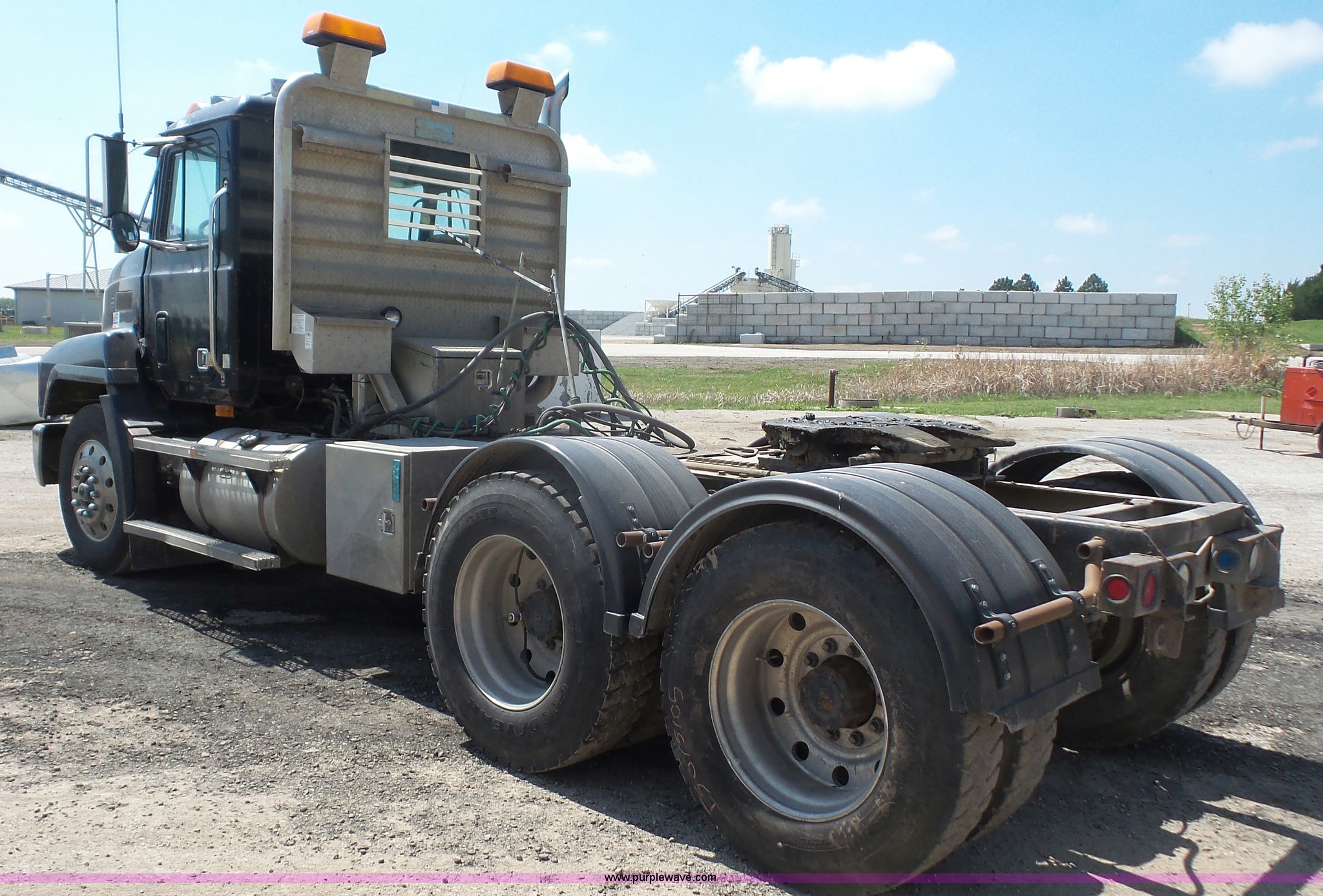 Purple Wave is selling a used Truck Tractor in Kansas. This item is a 1993 Mack CH613 semi truck with the following: 633,344 miles on odometer, 32,383 hours on meter, Mack E7 12.0L L6 turbo diesel engine, Eaton Fuller 13 speed manual transmission, Tandem axle, Inter-axle differential lock, AC and heat, AM/FM, Beacon light, Front tow hooks, Exterior visor, PTO, Wet kit, Aluminum headache rack, Chain hanger, Steel deck plate, Sliding fifth wheel plate, Single rear exhaust stack, Full plastic fenders, Spring suspension, Air brakes, 11R24.5 tires, Recently replaced brakes and drums on front axle