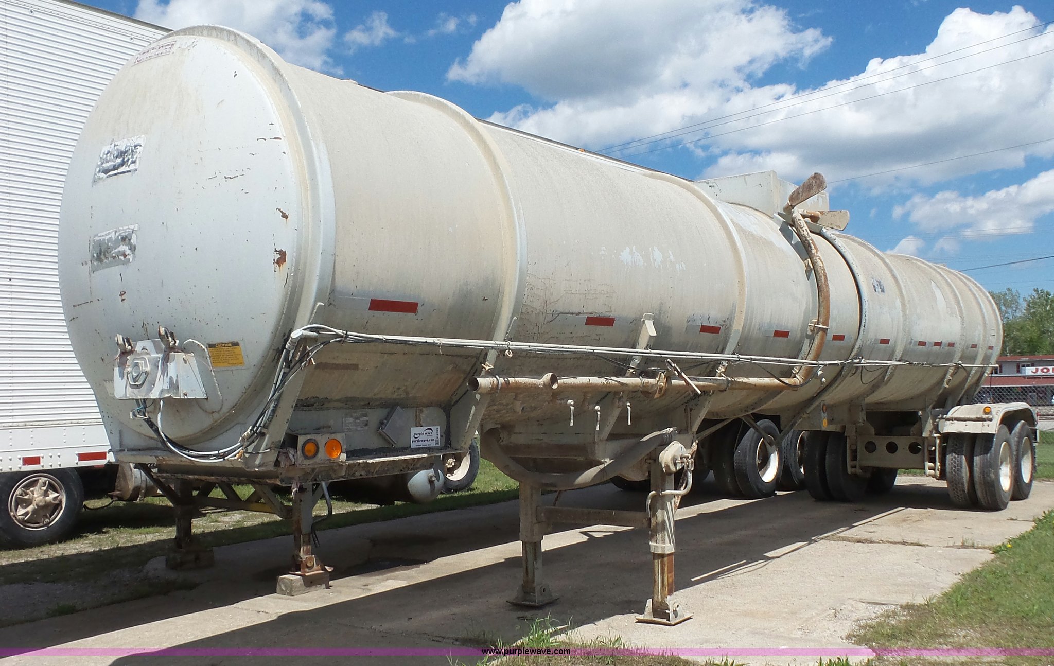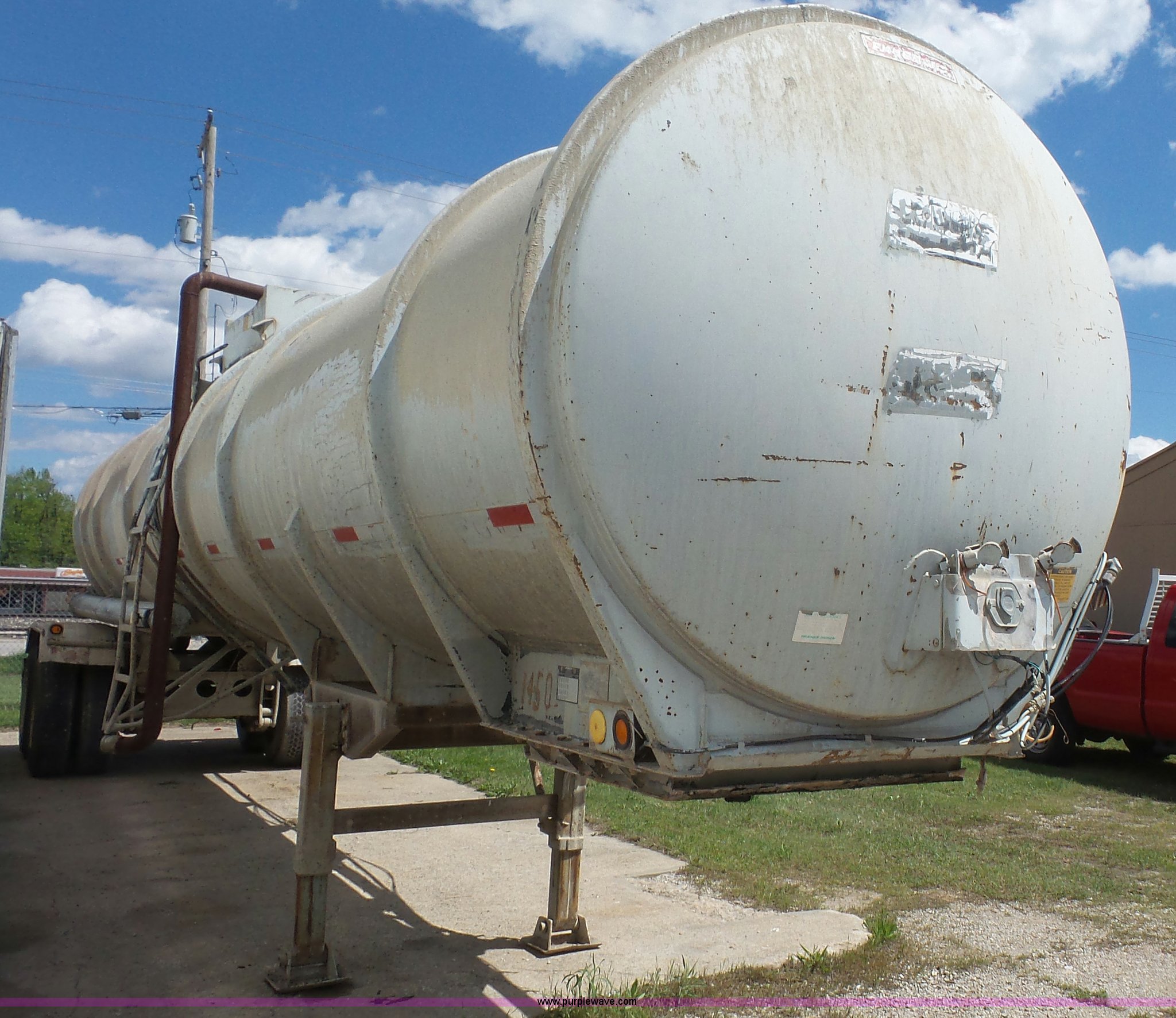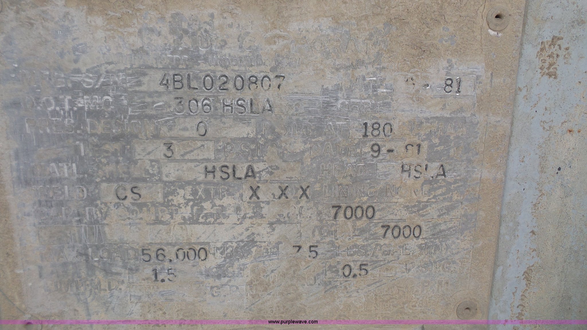 Purple Wave is selling a used Tank Trailer in Kansas. This item is a 1981 Fruehauf TE0-F2-R tank trailer with the following: 40'L, Steel tank, 7,000 gallon capacity, 16"W manway, Fifth wheel plate, Dual leg landing gear, Spring suspension, Air brakes, Tandem axle, Steel wheels, 11R22.5 tires, GVWR 68,000 lbs, GAWR 19,000 lbs, Unit# 1450