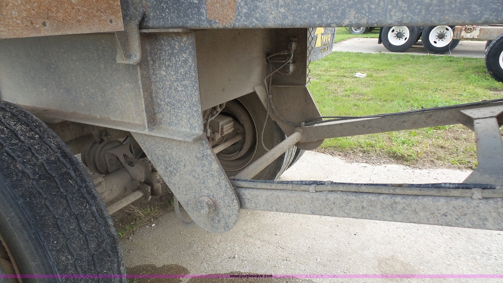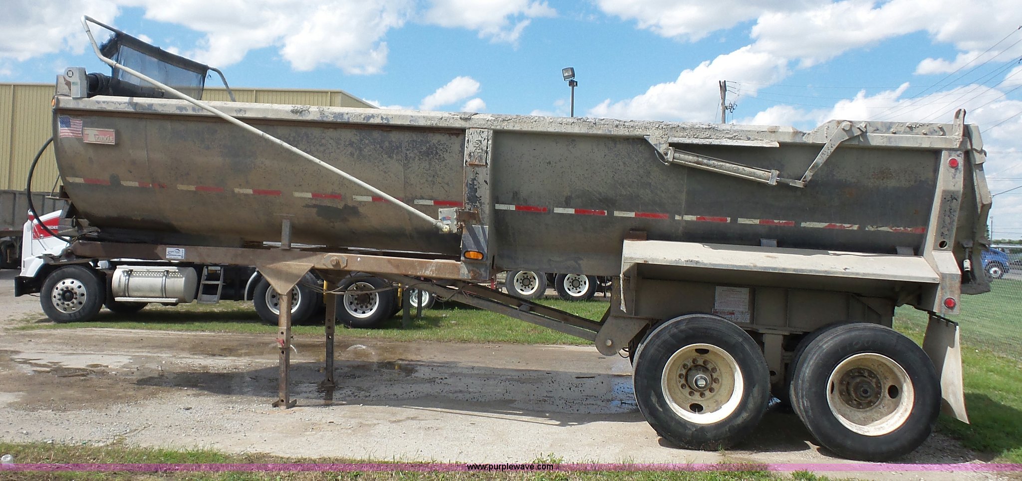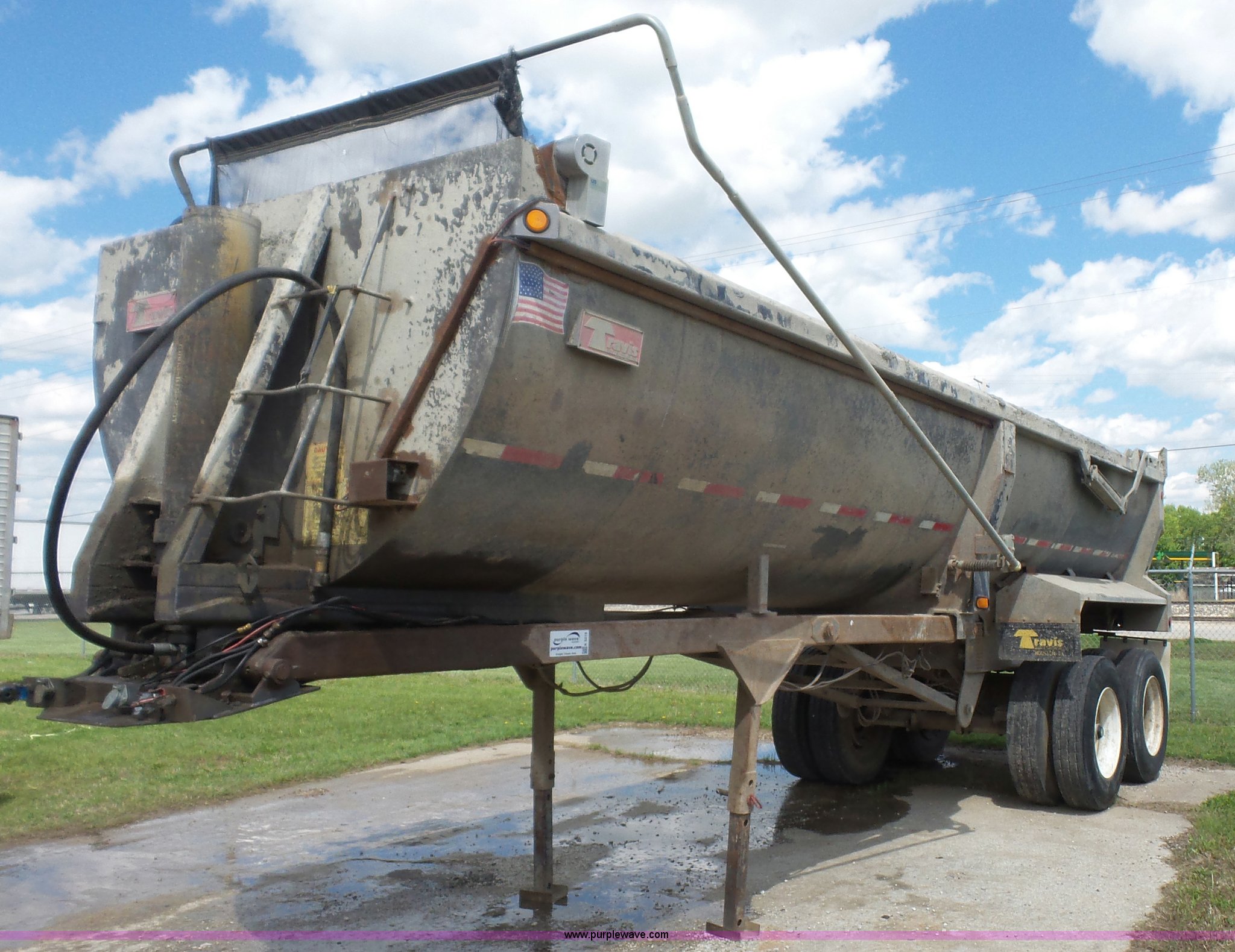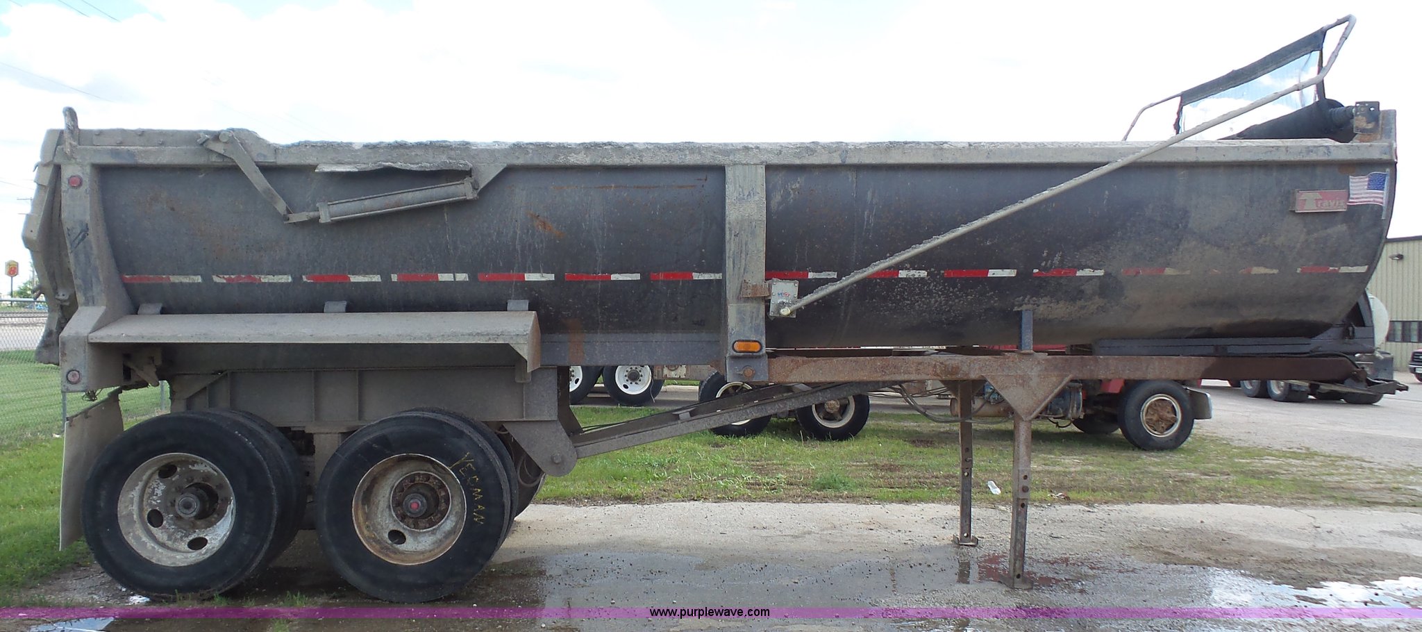 Purple Wave is selling a used End Dump Rock Trailer in Kansas. This item is a 1999 Travis HRS end dump trailer with the following: 26'L, Steel construction, Single ram hoist, High lift end gate, Electric rollover tarp, Bed vibrator, Fifth wheel plate, Dual leg landing gear, Spring suspension, Air brakes, Tandem axle, Steel wheels, 11R24.5 tires, GVWR 68,000 lbs, GAWR 20,000 lbs