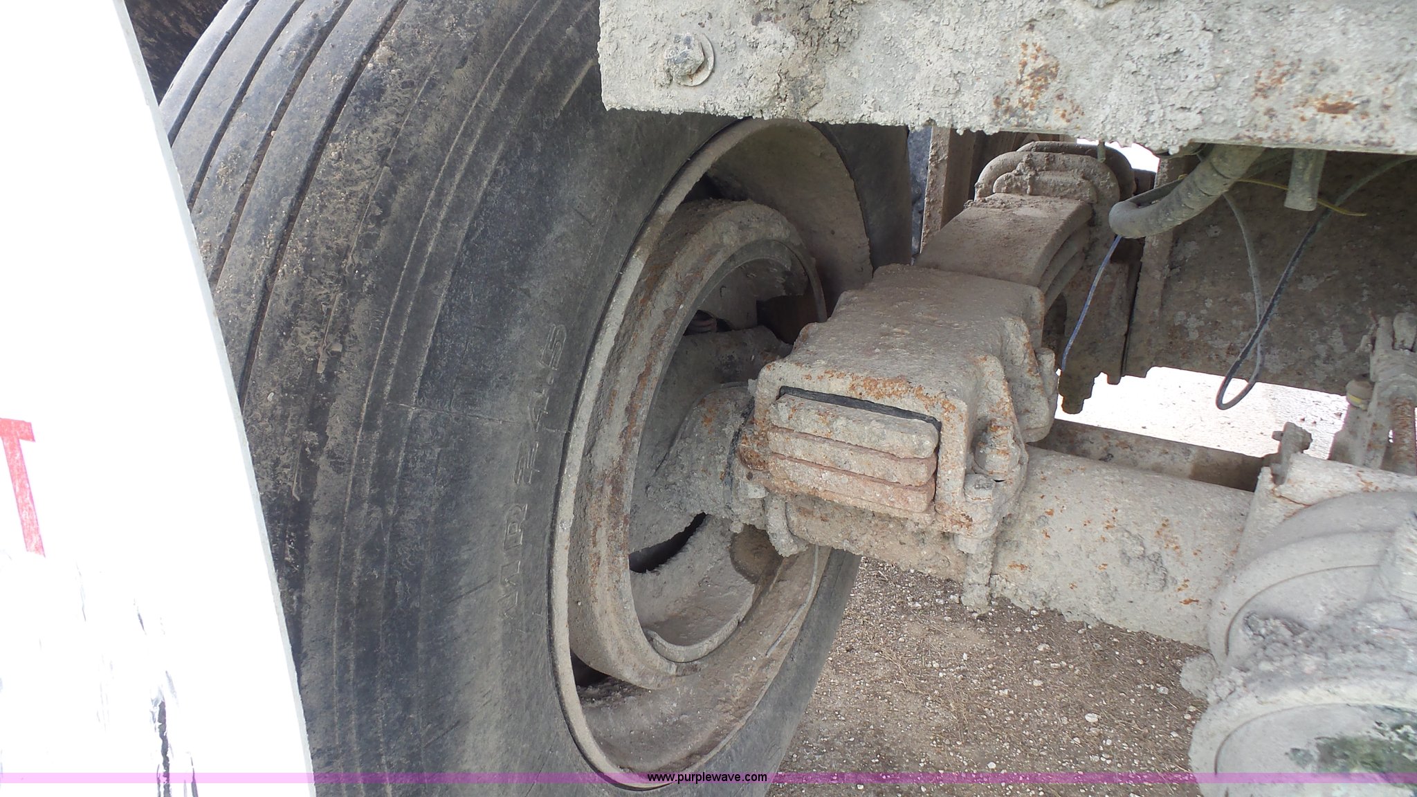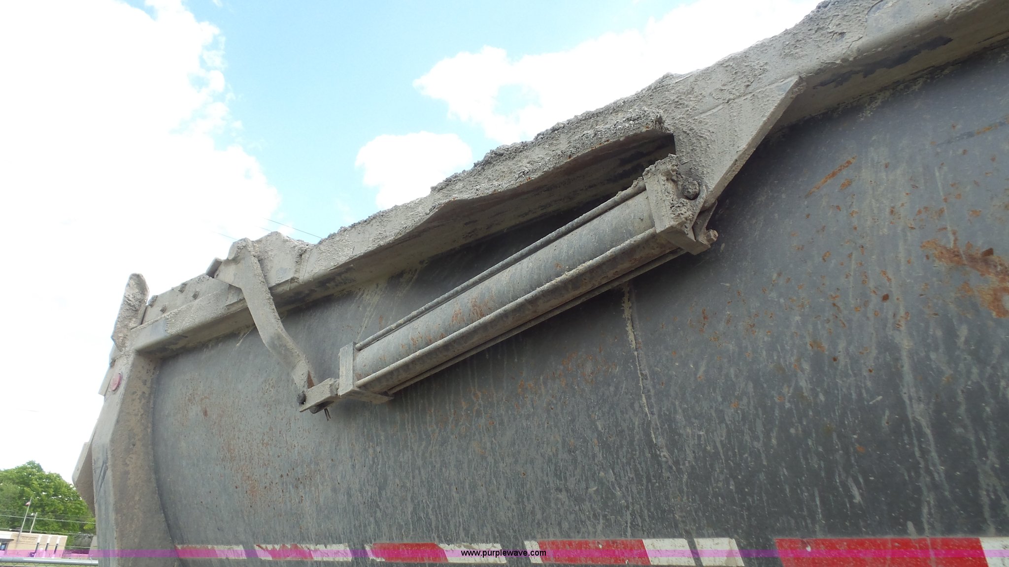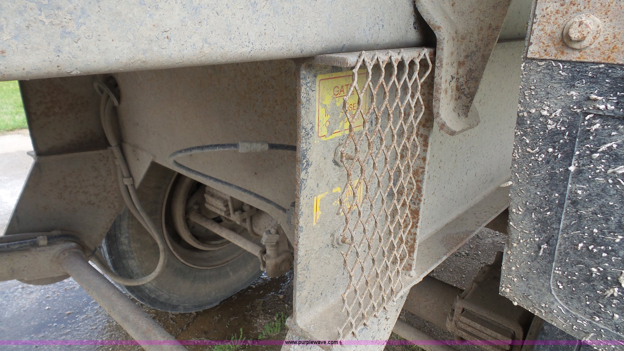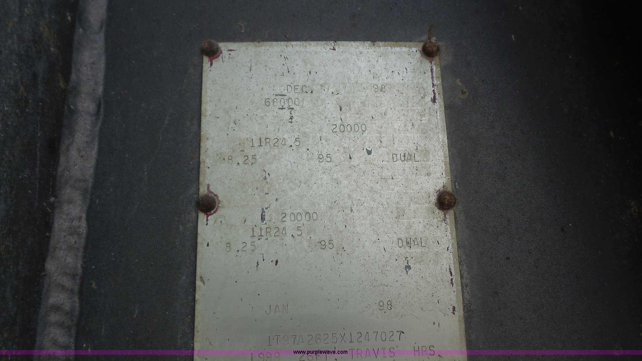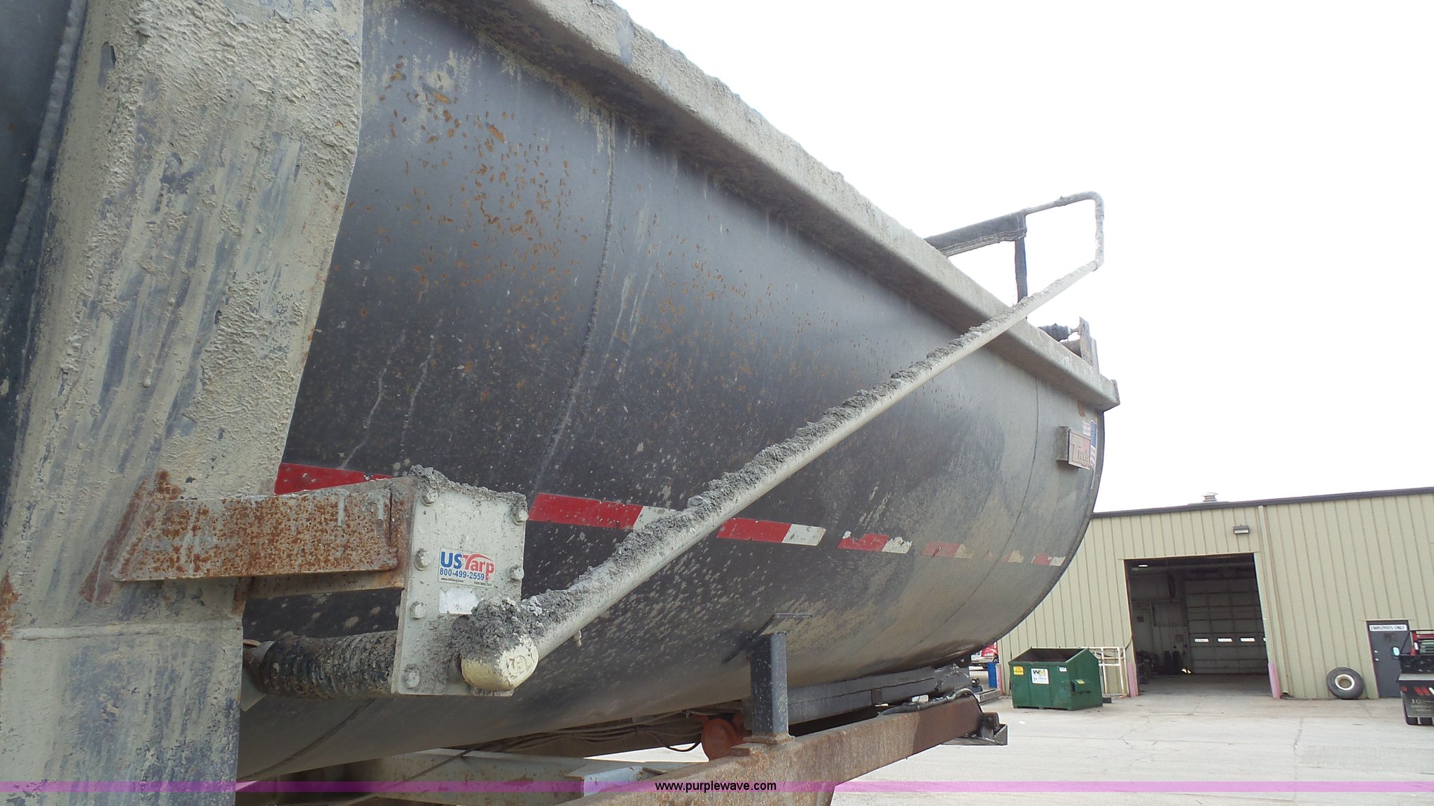 Purple Wave is selling a used End Dump Rock Trailer in Kansas. This item is a 1999 Travis HRS end dump trailer with the following: 26'L, Steel construction, Single ram hoist, High lift end gate, Electric rollover tarp, Bed vibrator, Fifth wheel plate, Dual leg landing gear, Spring suspension, Air brakes, Tandem axle, Steel wheels, 11R24.5 tires, GVWR 68,000 lbs, GAWR 20,000 lbs