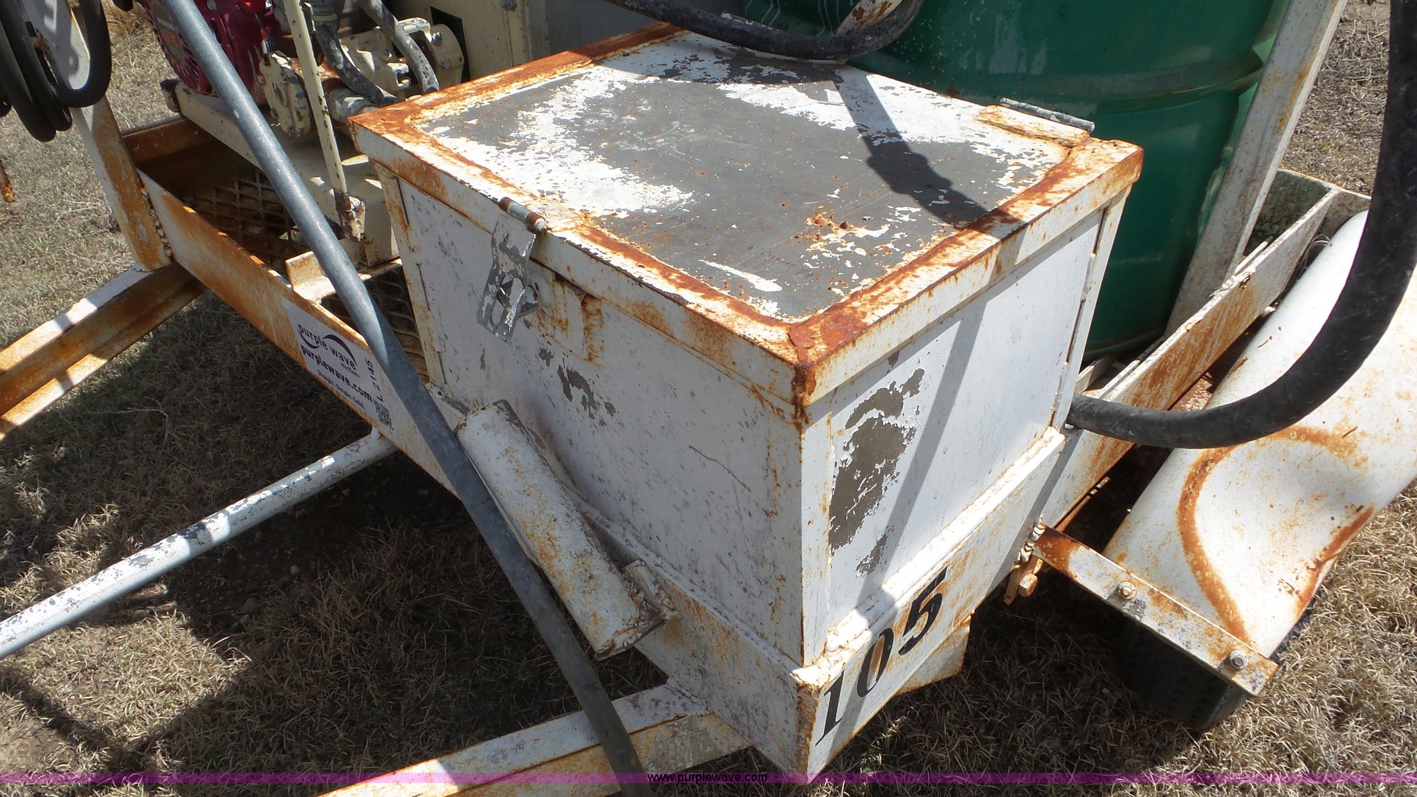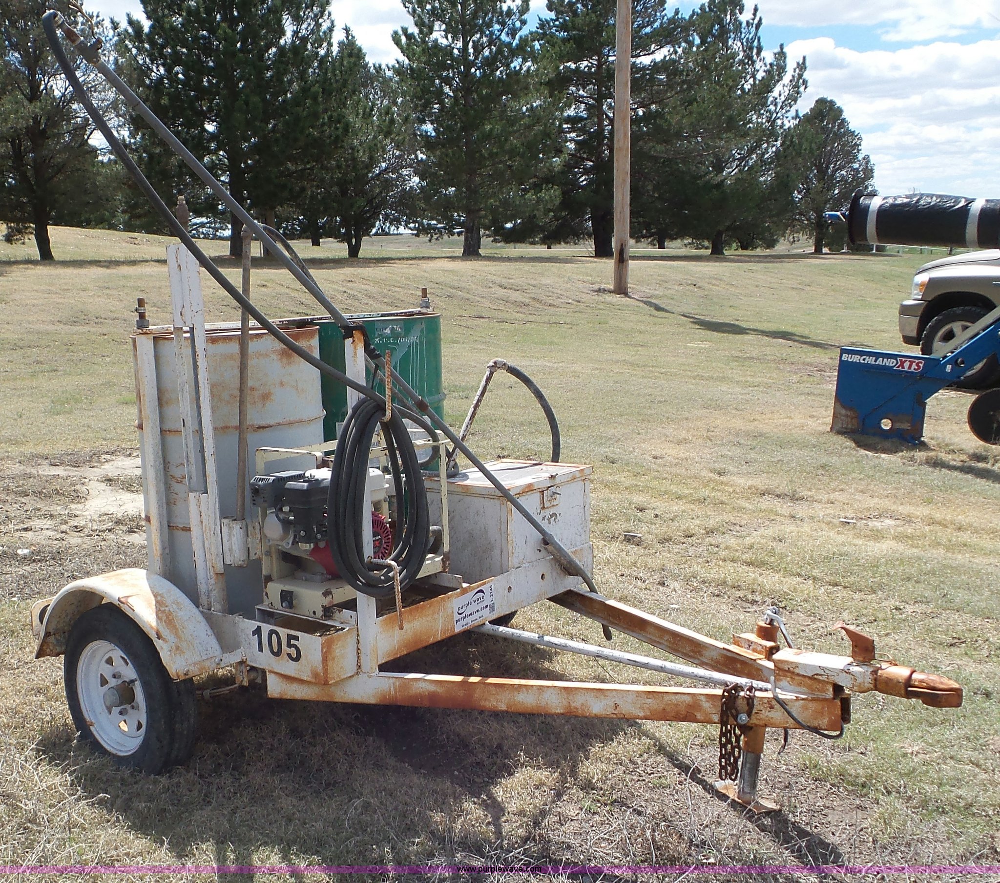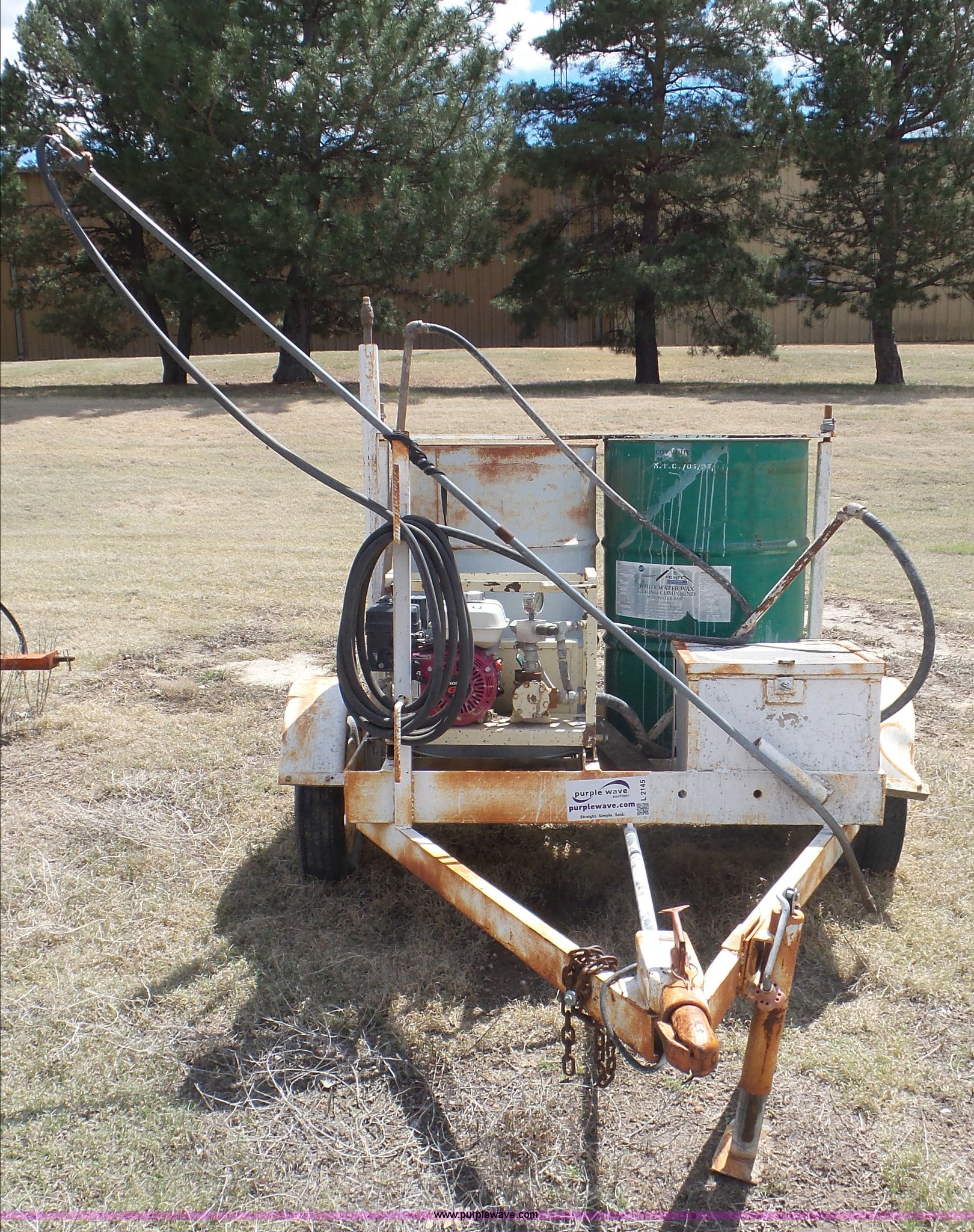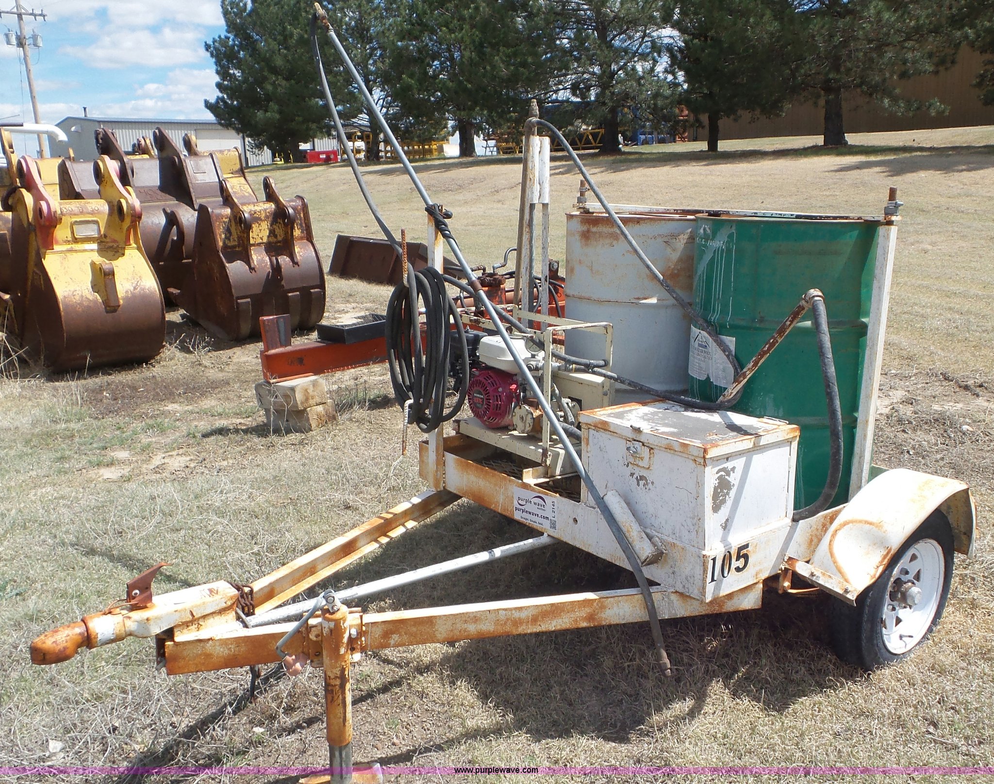 Purple Wave is selling a used Trailer Other in Kansas. This item is a Terex OMS201 curing trailer with the following: Honda GX120 gas engine, (2) 55 gallon barrels, Hose with sprayer, Ball hitch, 5.50-12 tires, Serial 000262789