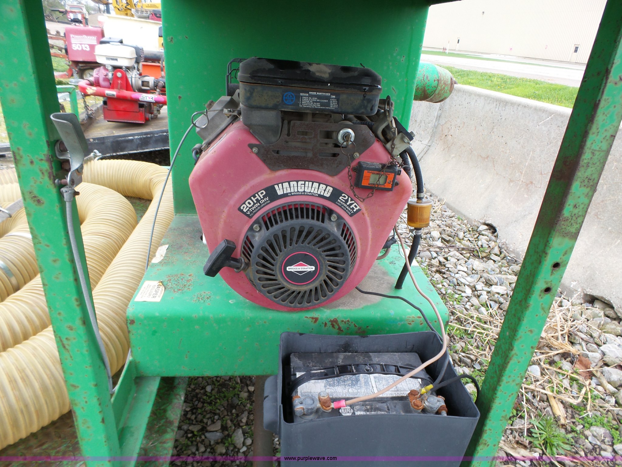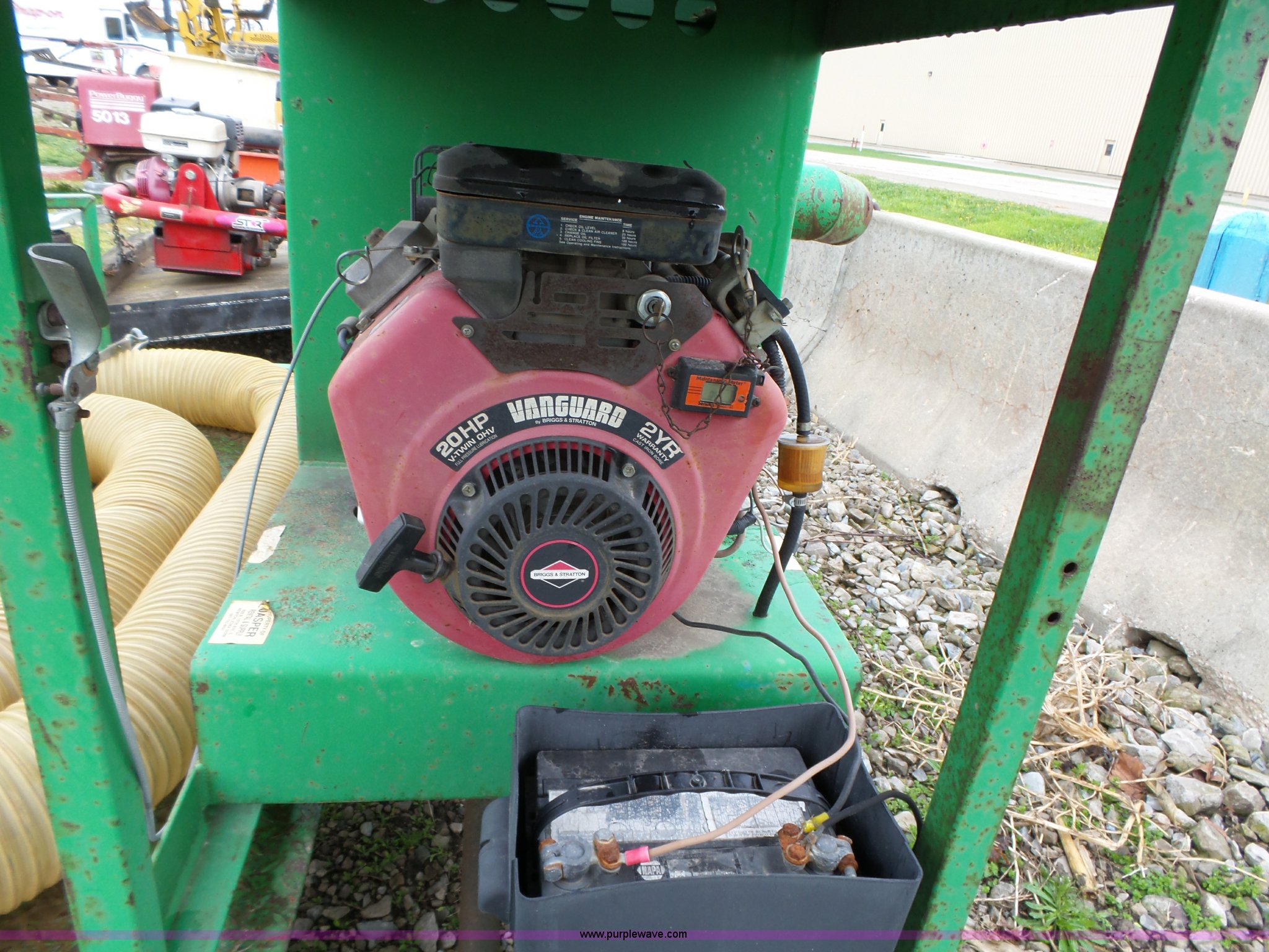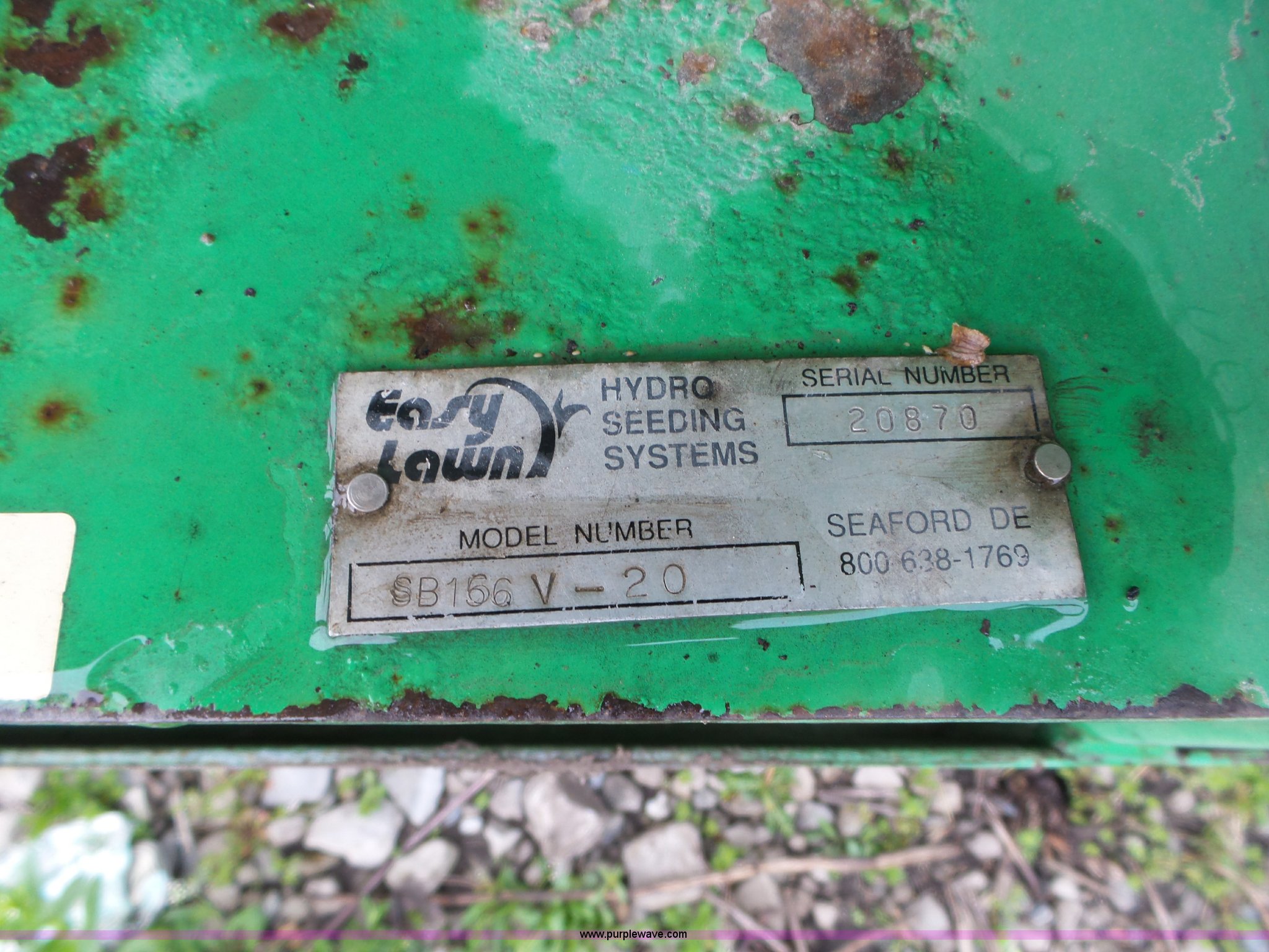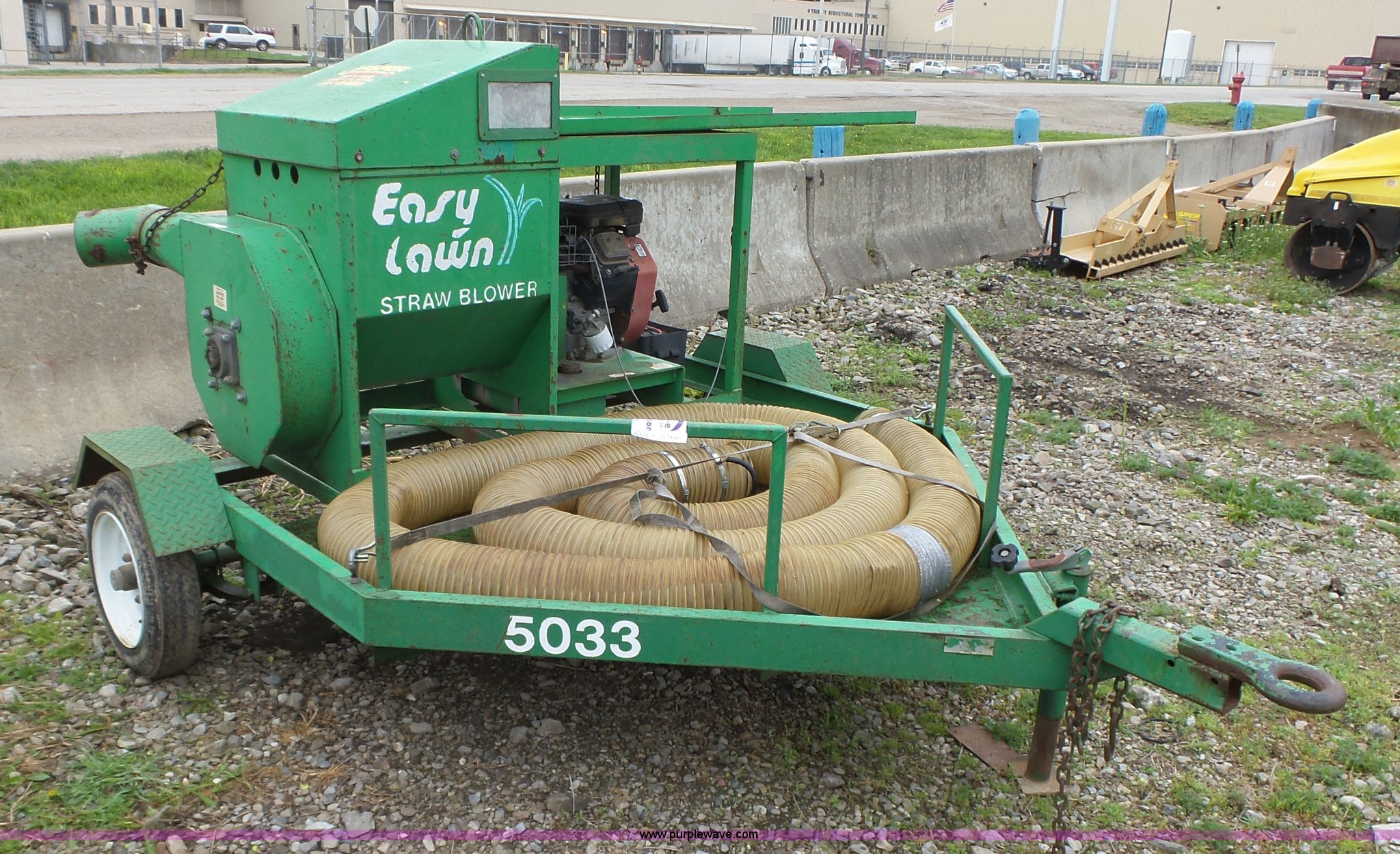 Purple Wave is selling a used Hydro Seeder/ Mulcher in Iowa. This item is a Easy Lawn 6B156V-20 straw blower with the following: Honda gas engine, 20 HP, 6" discharge tube, Assorted 6" plastic tubing, Trailer, Model SB56T, Tongue mounted jack stand, Pintle hitch, Single axle, Spring suspension, 4.80-12 tires, Serial 20870, Unit# 5033