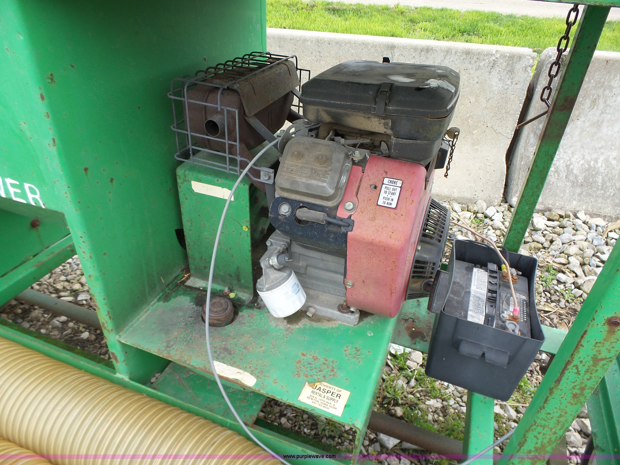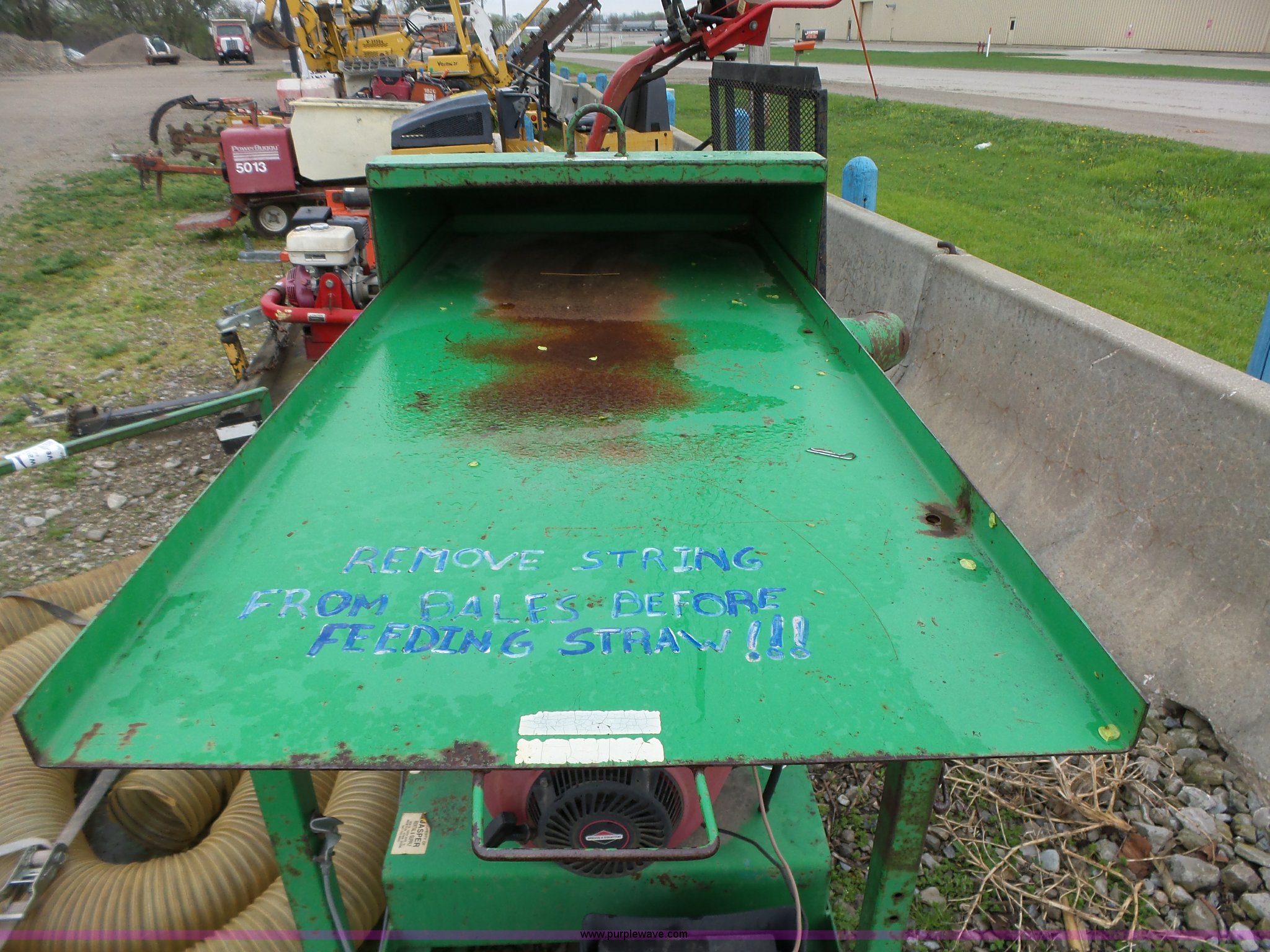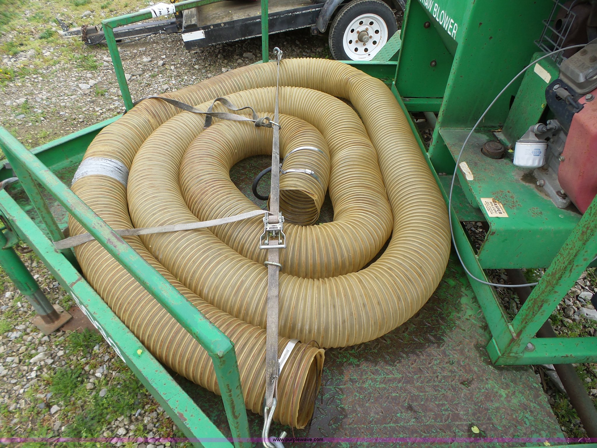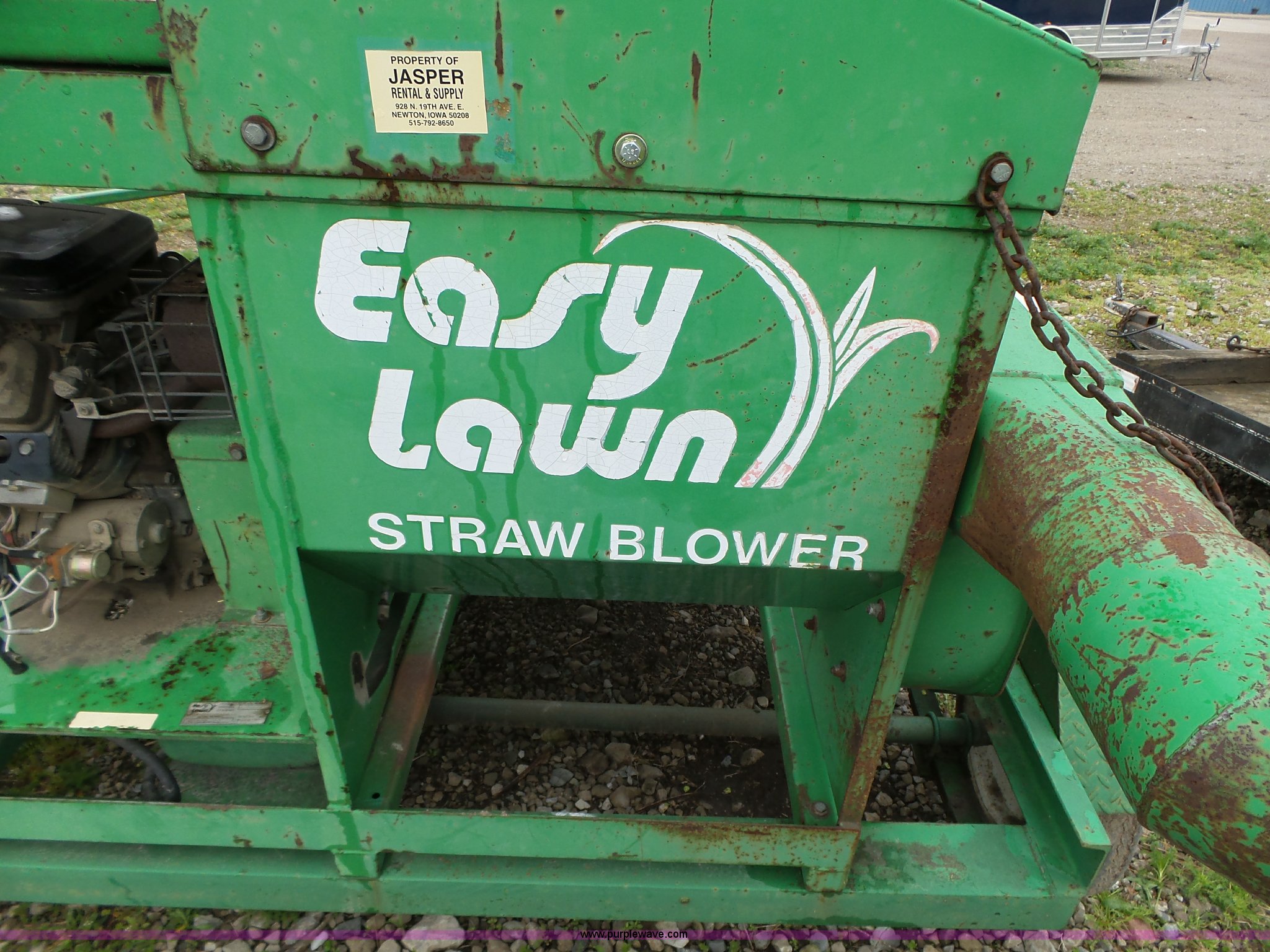 Easy Lawn 6B156V-20 straw blower. Honda gas engine 20 HP, 6" discharge tube Assorted 6" plastic tubing, Trailer Model SB56T, Tongue mounted jack stand, Pintle hitch, Single axle, Spring suspension, 4.80-12 tires, Serial 20870, Unit# 5033. 11277. Jasper Construction Services. 928 N. 19th Avenue E. Newton, IA 50208