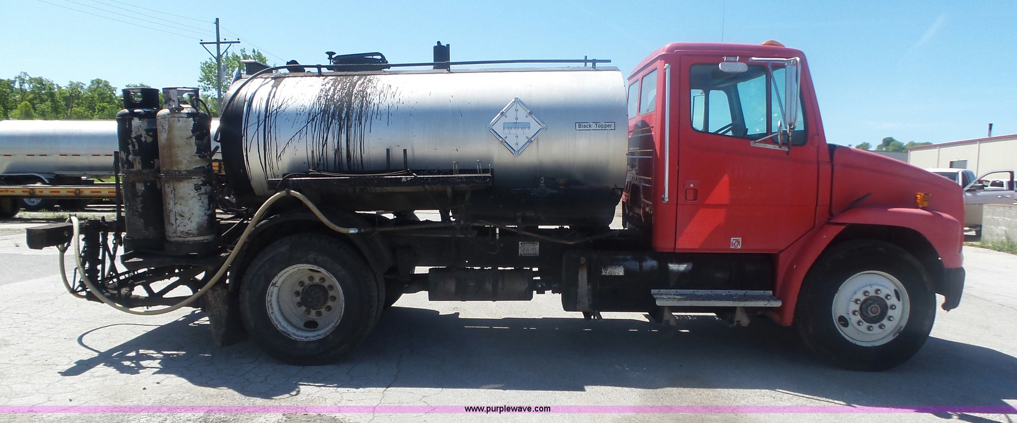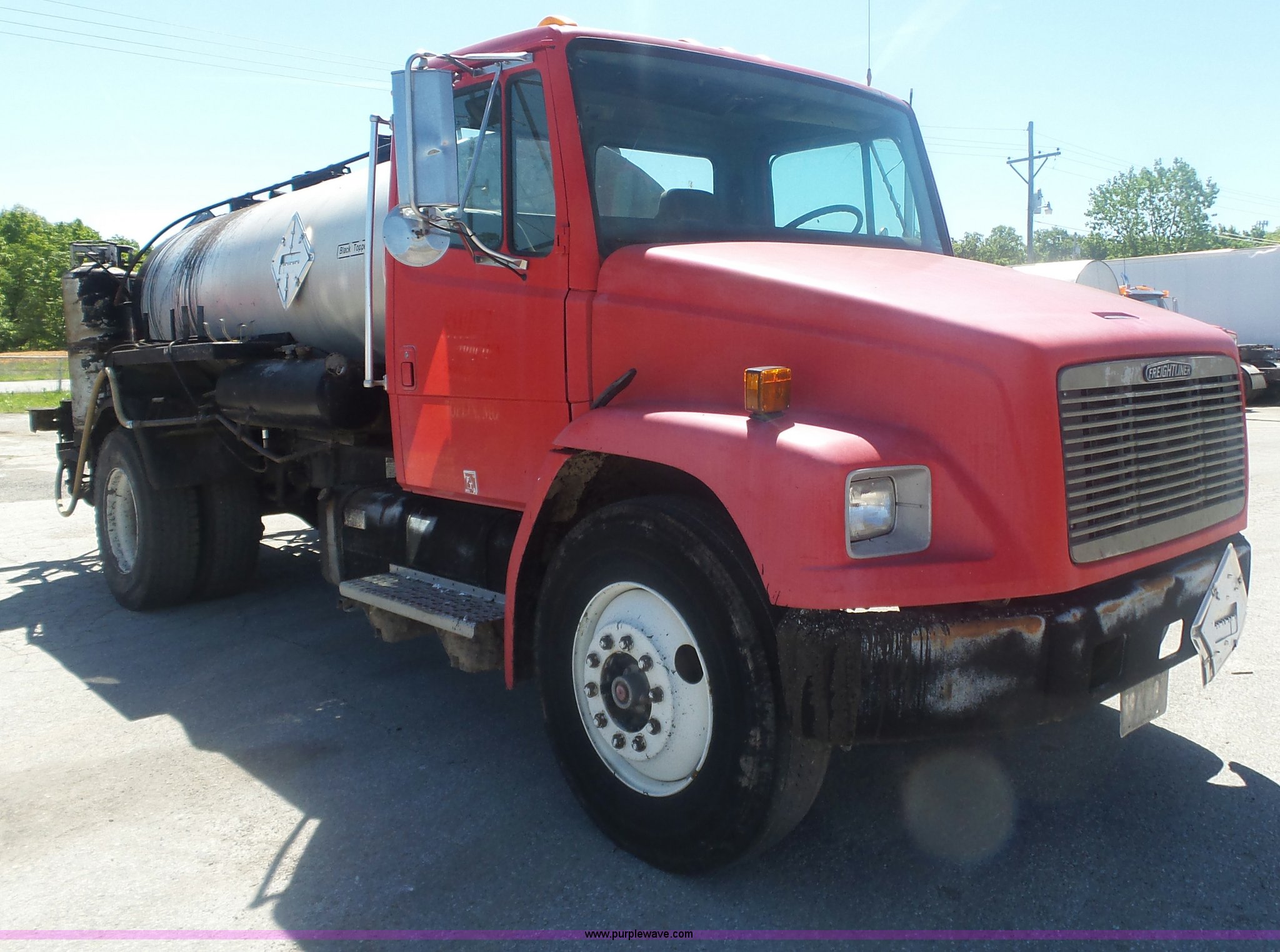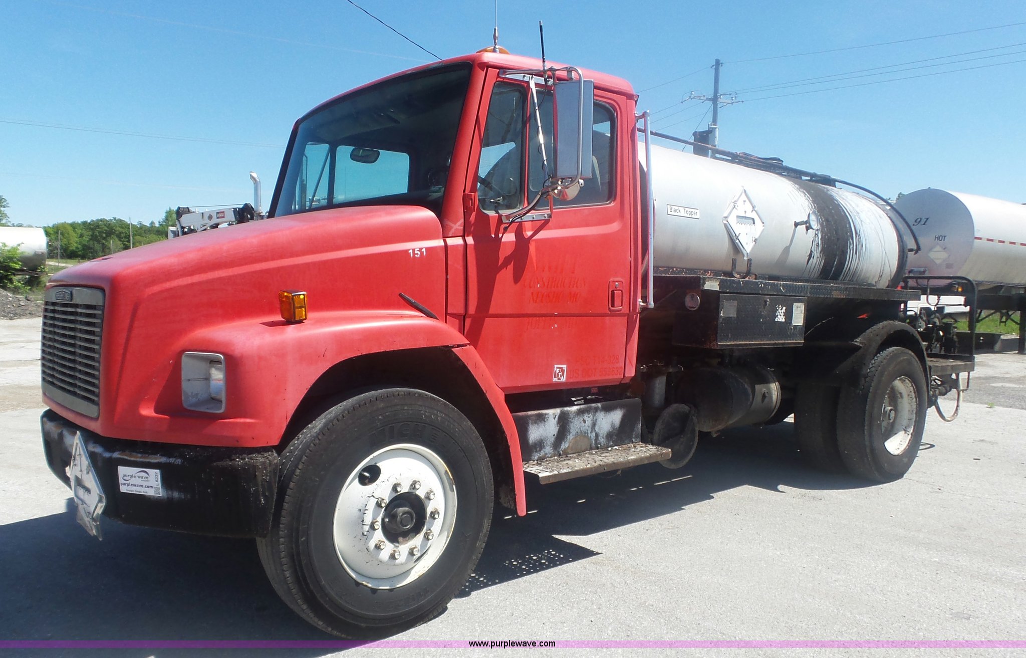 Purple Wave is selling a used Oil Distributor Truck in Missouri. This item is a 1994 Freightliner FL70 oil distributor truck with the following: 248,080 miles on odometer, 15,370 hours on meter, Cummins 5.9L L6 turbo diesel engine, Five speed manual transmission, Single axle, AC and heat, AM/FM, Heated mirrors, Air suspension seat, PTO, Single exhaust stack, Etnyre BX-HS oil distributor bed, 1,074 gallon capacity, Serial J-3804, Propane burner, In-cab controls, Spray wand, 10'W spray boom, Folding,, Single fuel tank, Spring suspension, Air brakes, 11R22.5 front tires, 295/75R22.5 rear tires, GVWR 29,000 lbs, Unit# 151