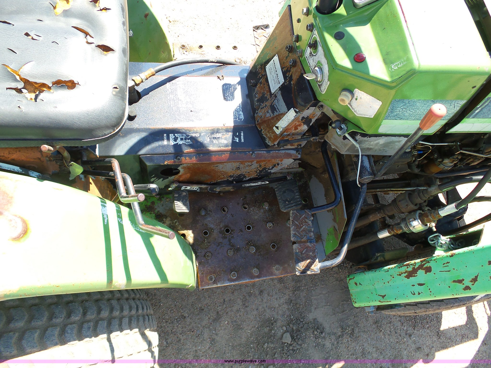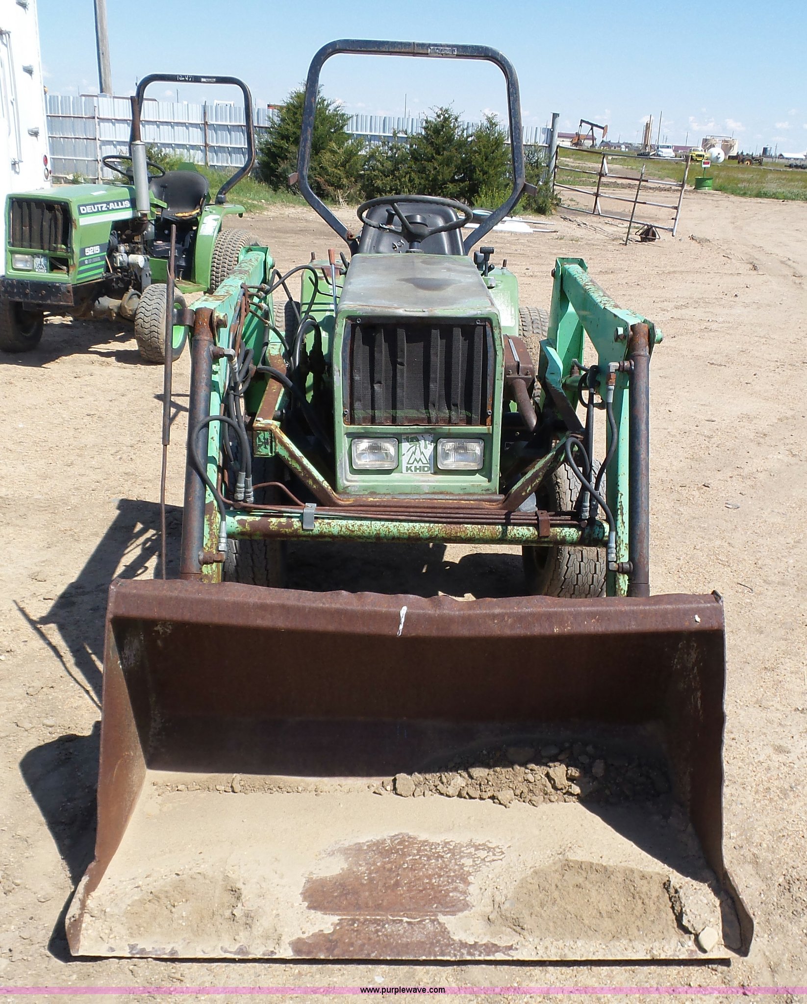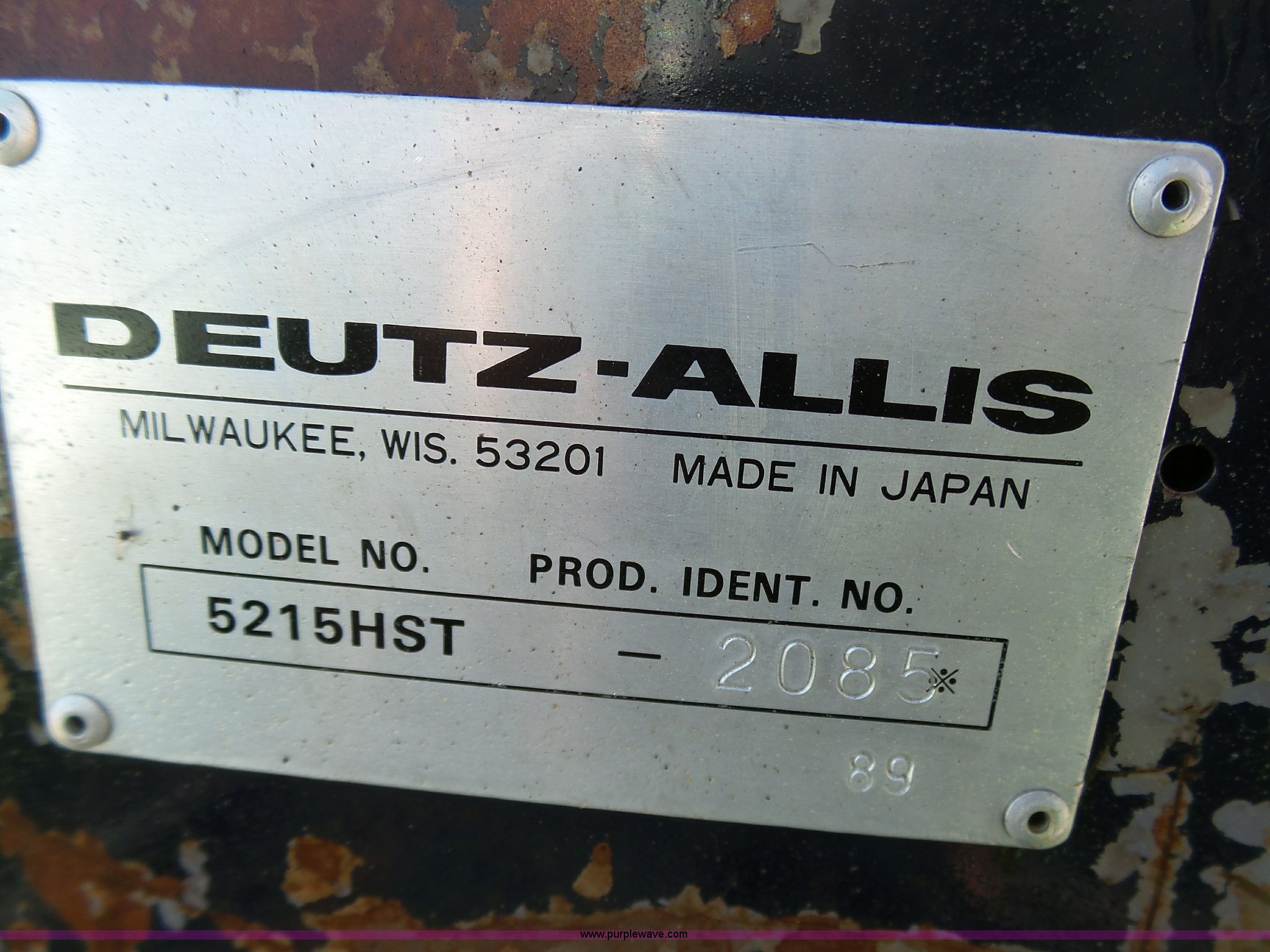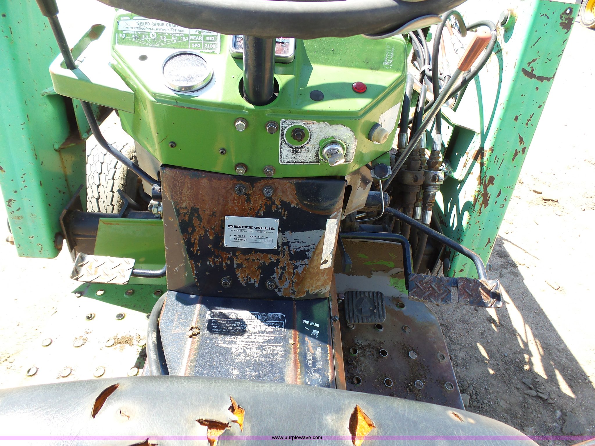 Purple Wave is selling a used Tractor in Kansas. This item is a Deutz Allis 5215 tractor with the following: 1,772 hours on meter, Deutz Allis three cylinder diesel engine, 18 HP, Hydrostatic transmission, 3F-3R gears, Suspension seat, Deutz Allis 425 loader, 48"W bucket, Two-lever controls, Three point, 540 PTO, 60" wheelbase, 20x8-10 front tires, 29x12-15 rear tires, Interior/exterior cosmetic damage, Oil leaks, Serial 2085