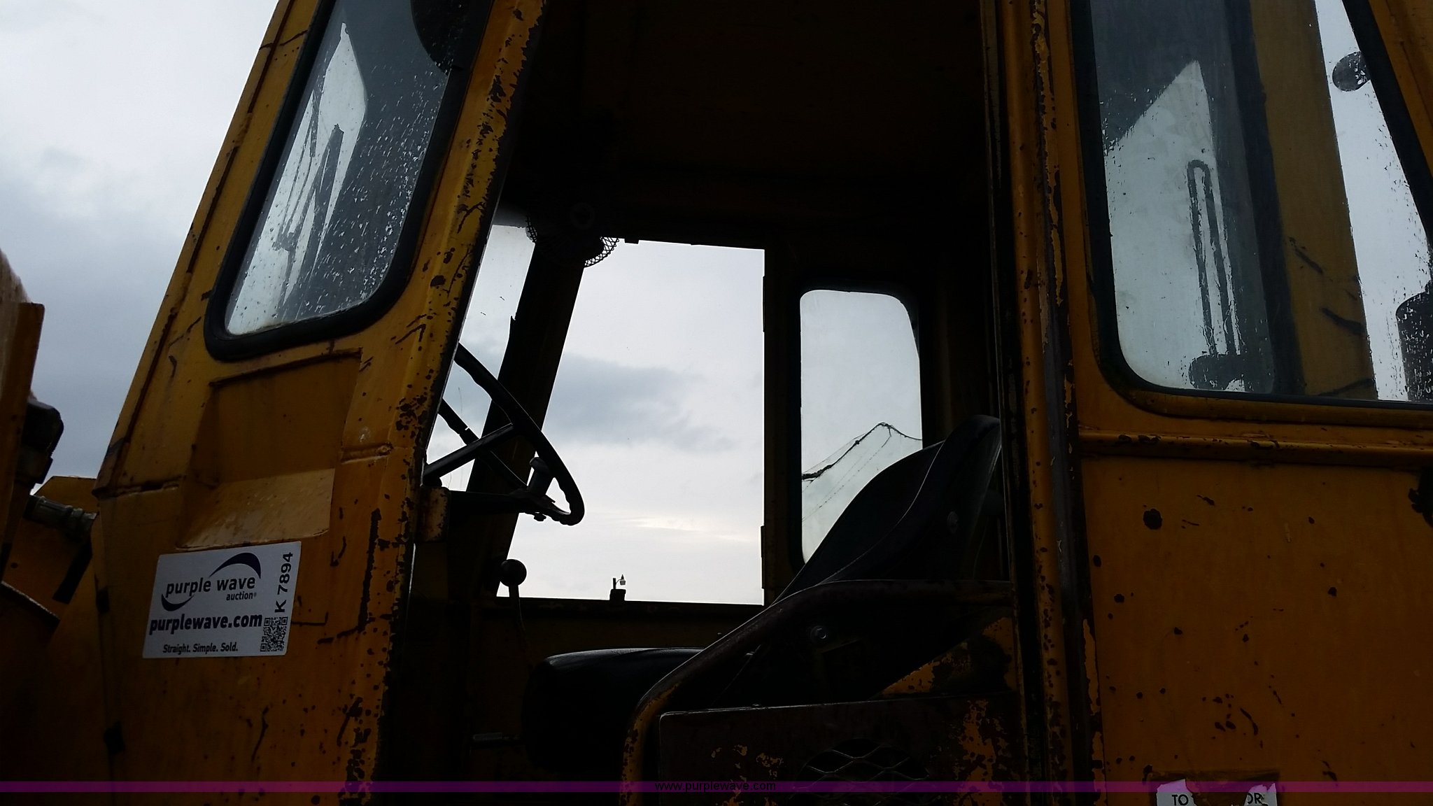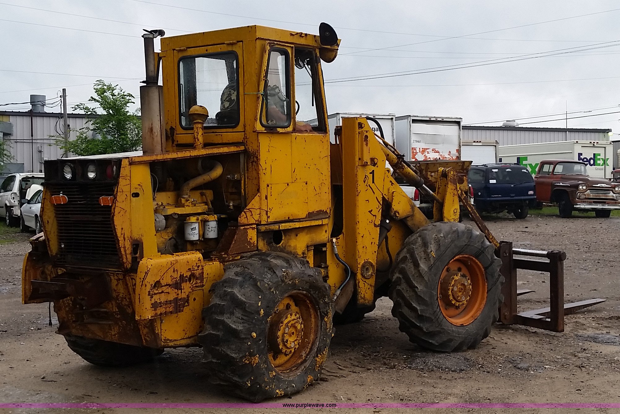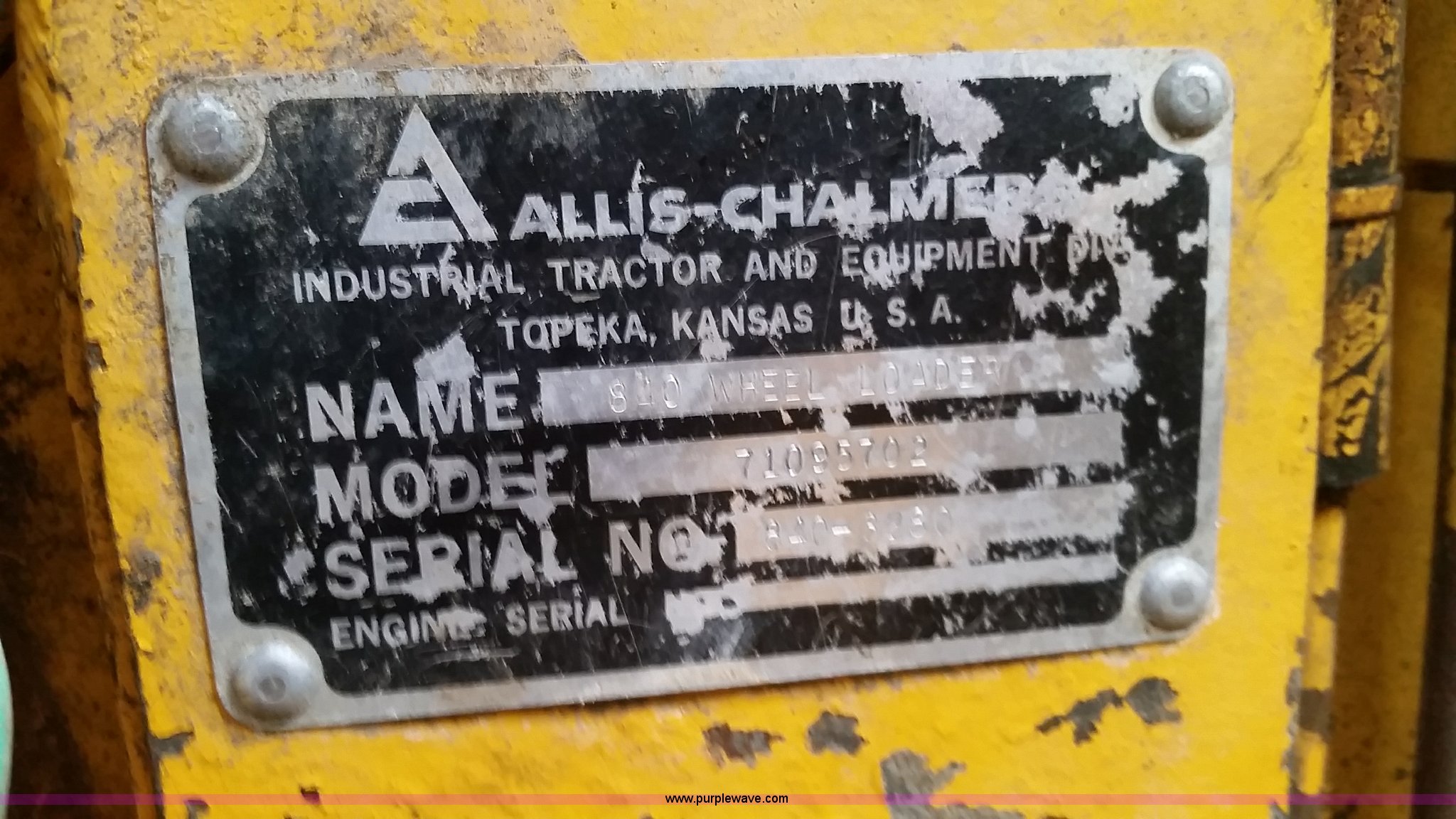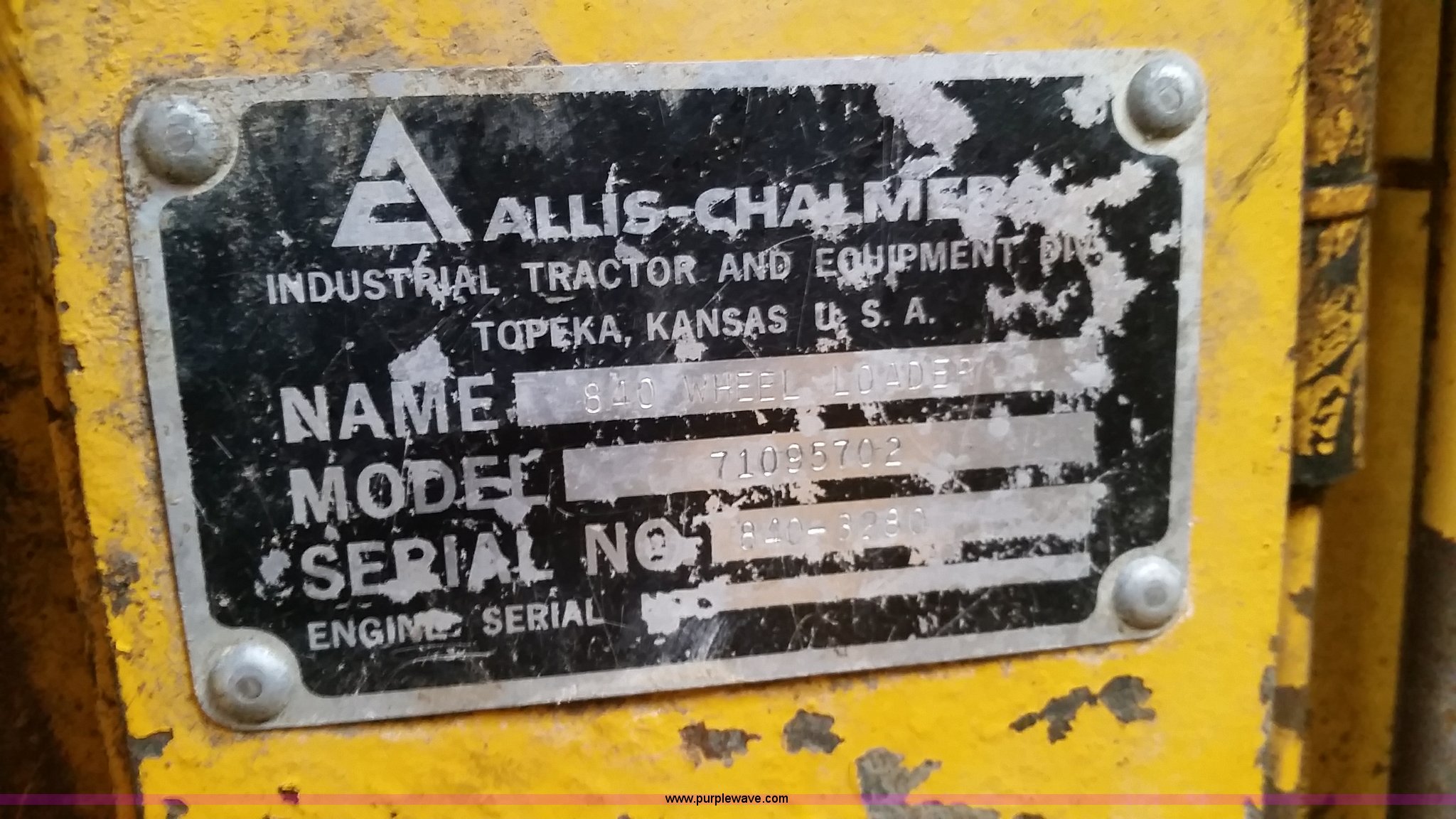 Purple Wave is selling a used Wheel Loader in Missouri. This item is a 1974 Allis Chalmers 840 wheel loader with the following: Six cylinder diesel engine, Powershift transmission, Enclosed cab, Heat, 87"W loader bucket, 72"L x 6"W forks, Counterweight, 16.9-24 tires, 12,300 lbs. base operating weight, Right rear tire needs to be replaced, Additional counterweight, Serial 840-3280