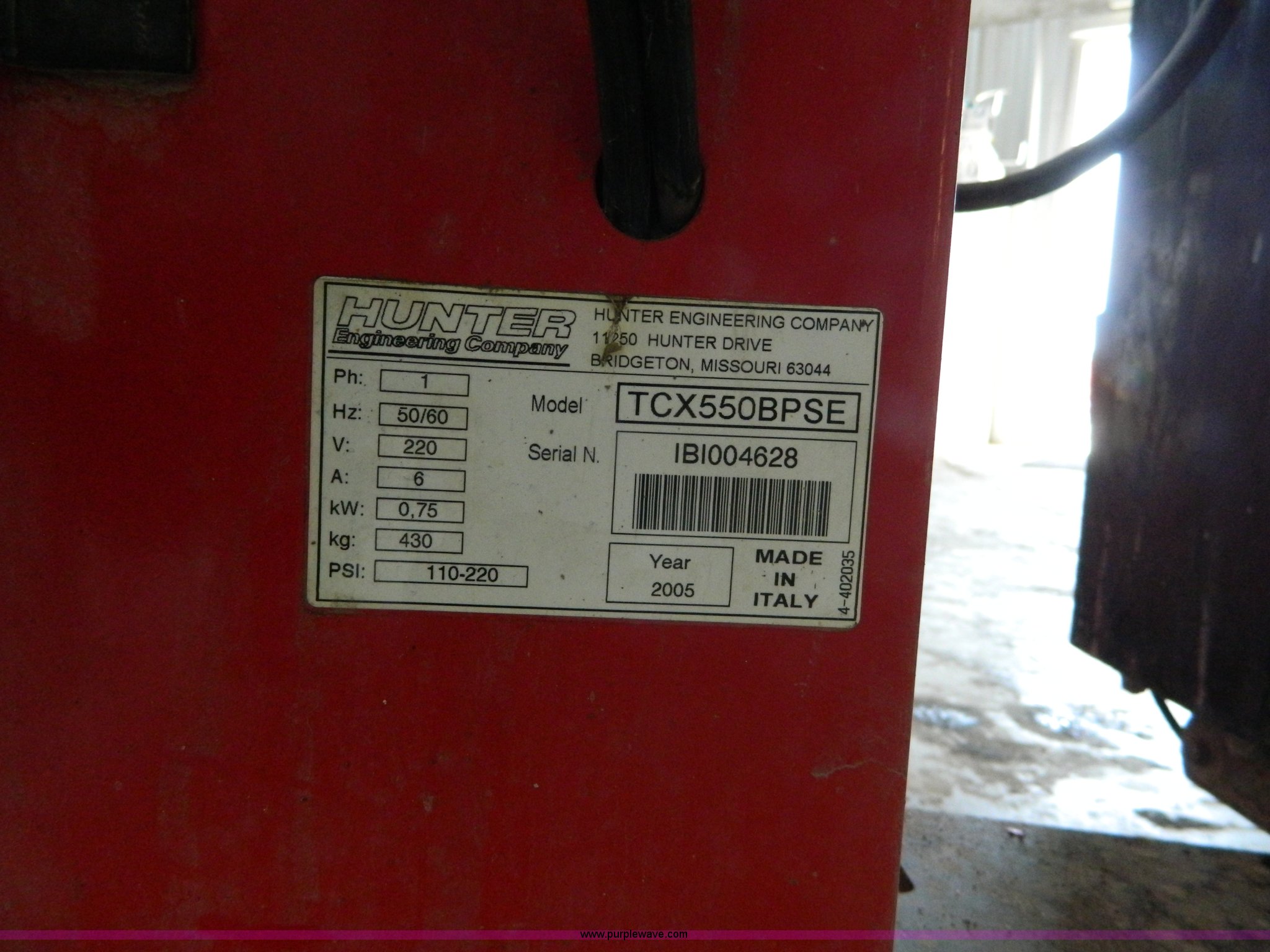 Purple Wave is selling a used Tools in Kansas. This item is a 2005 Hunter TCS550 BPS tire machie with the following: 220V, 110-220 psi, Assorted performance wheel adapters, Serial 1B1004628
