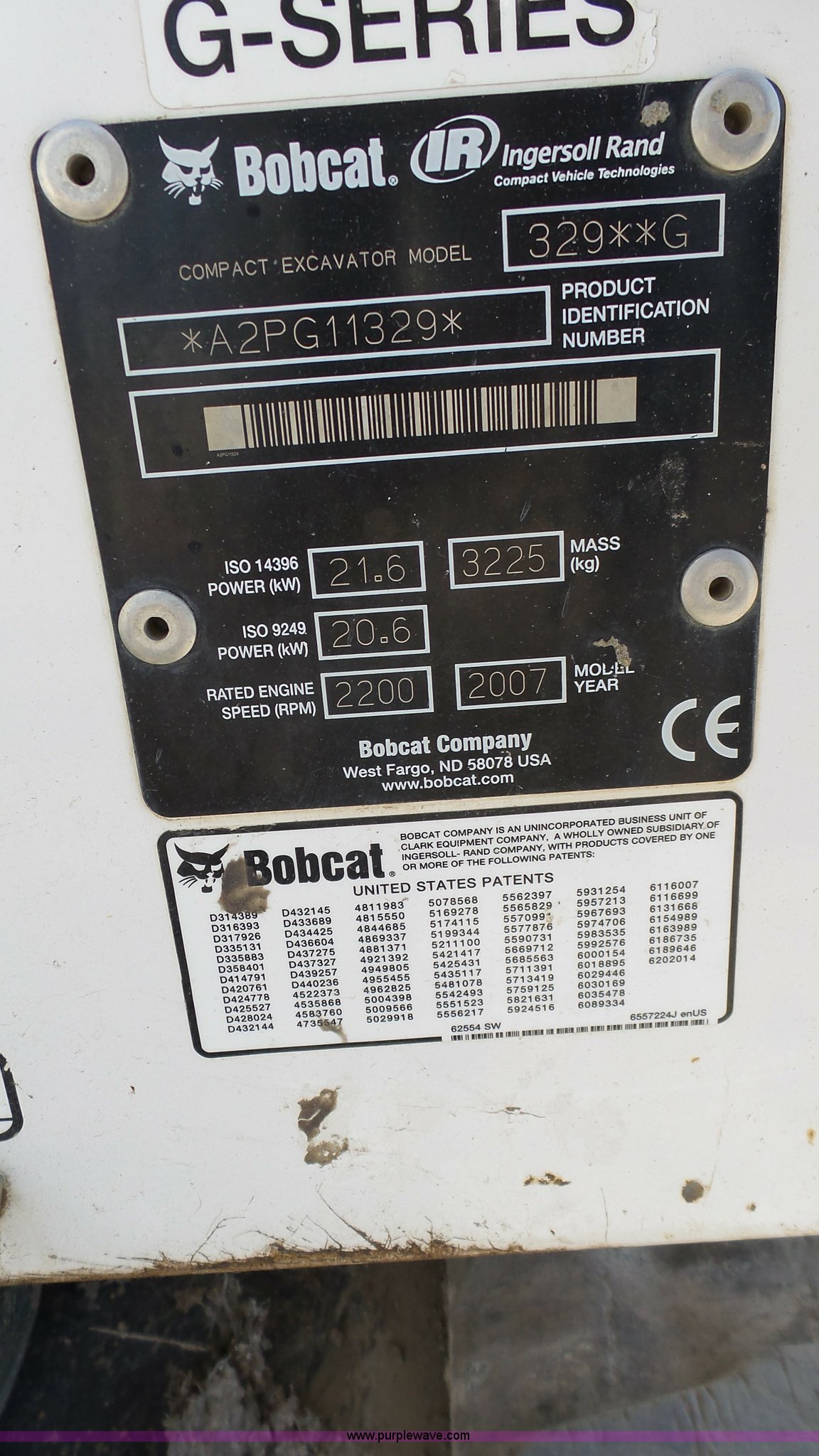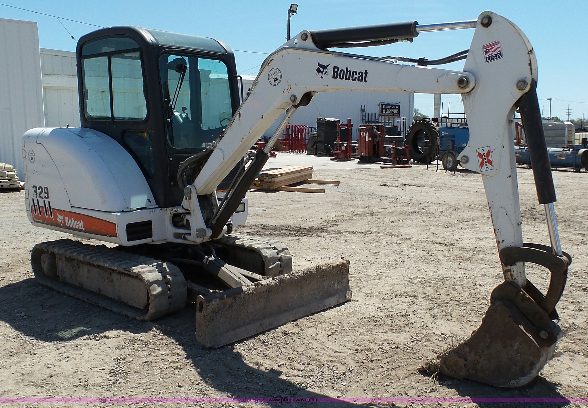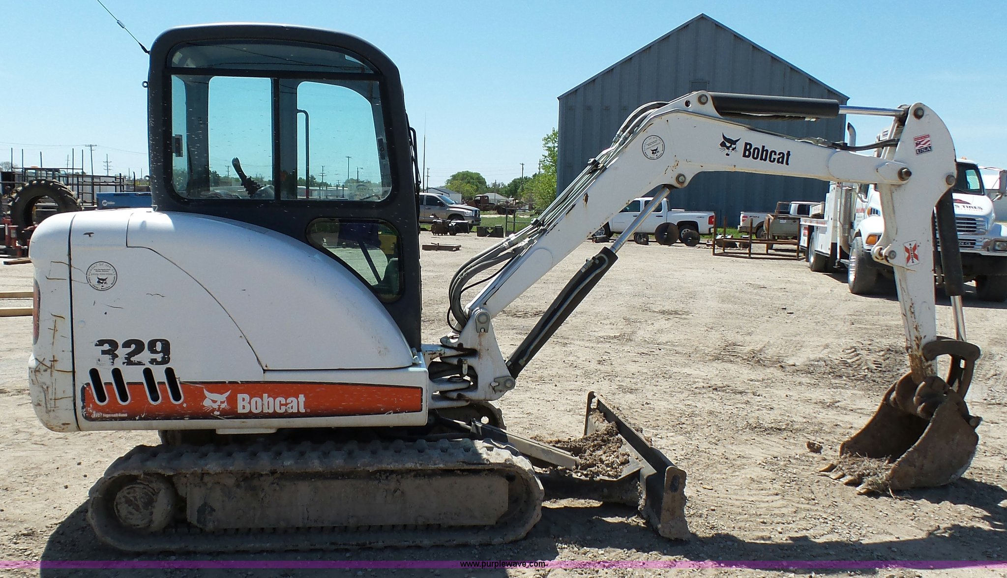 Purple Wave is selling a used Mini Excavator in Kansas. This item is a 2007 Bobcat 329 compact excavator with the following: 3,261 hours on meter, Kubota 1.7L three cylinder diesel engine, Hydrostatic transmission, Two speed travel, Heat, AM/FM/CD, Suspension seat, Wipers, Front work lights, Block heater, 5'W backfill blade, Standard boom, Auxiliary hydraulics, Mechanical quick coupler, 18"W bucket, (4) bolt-on teeth, Four bottom rollers, 12"W rubber tracks, 7,098 lbs. base operating weight, Serial A2PG11329