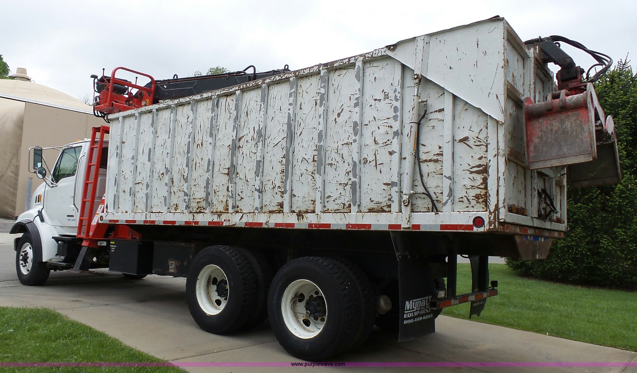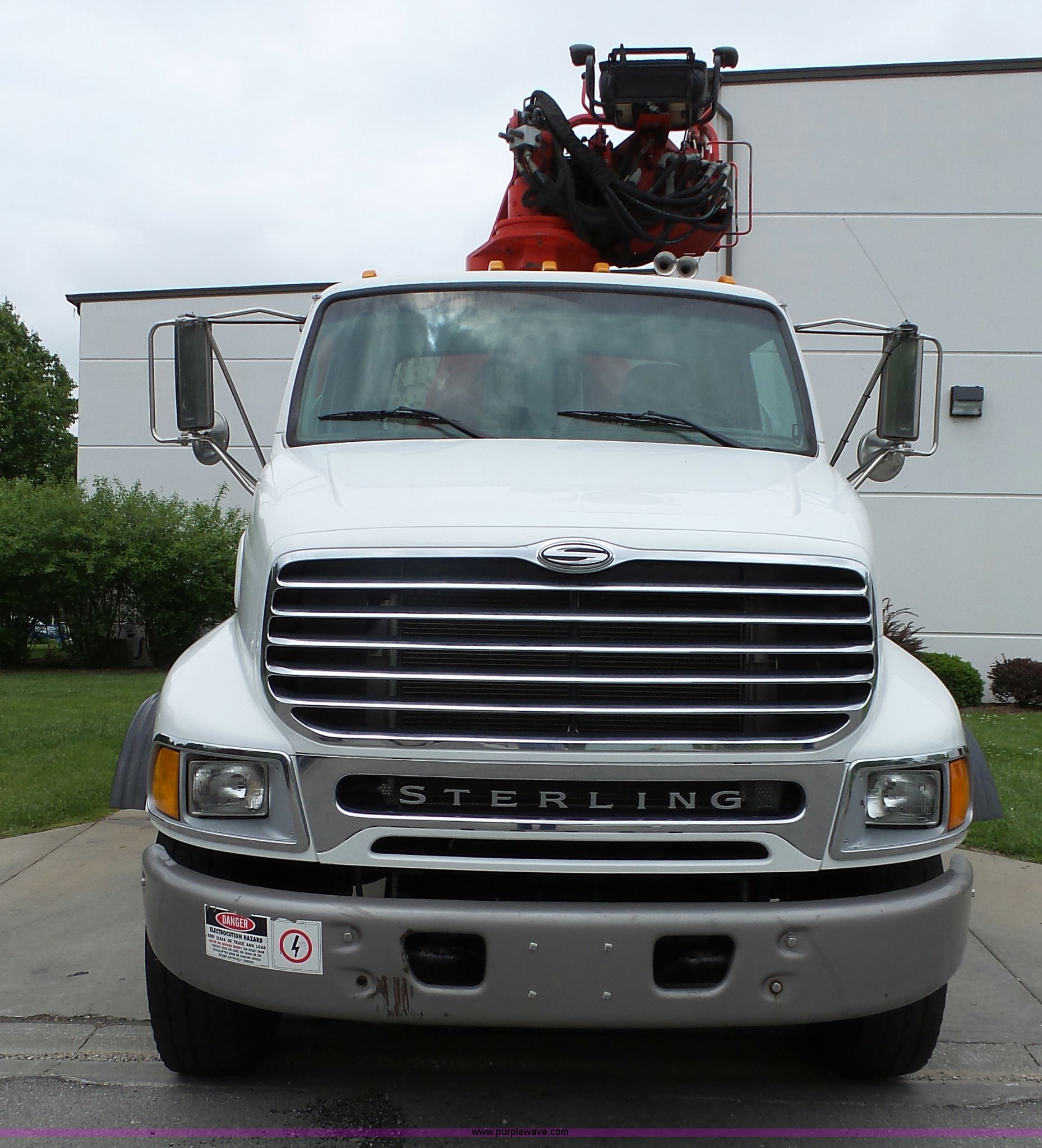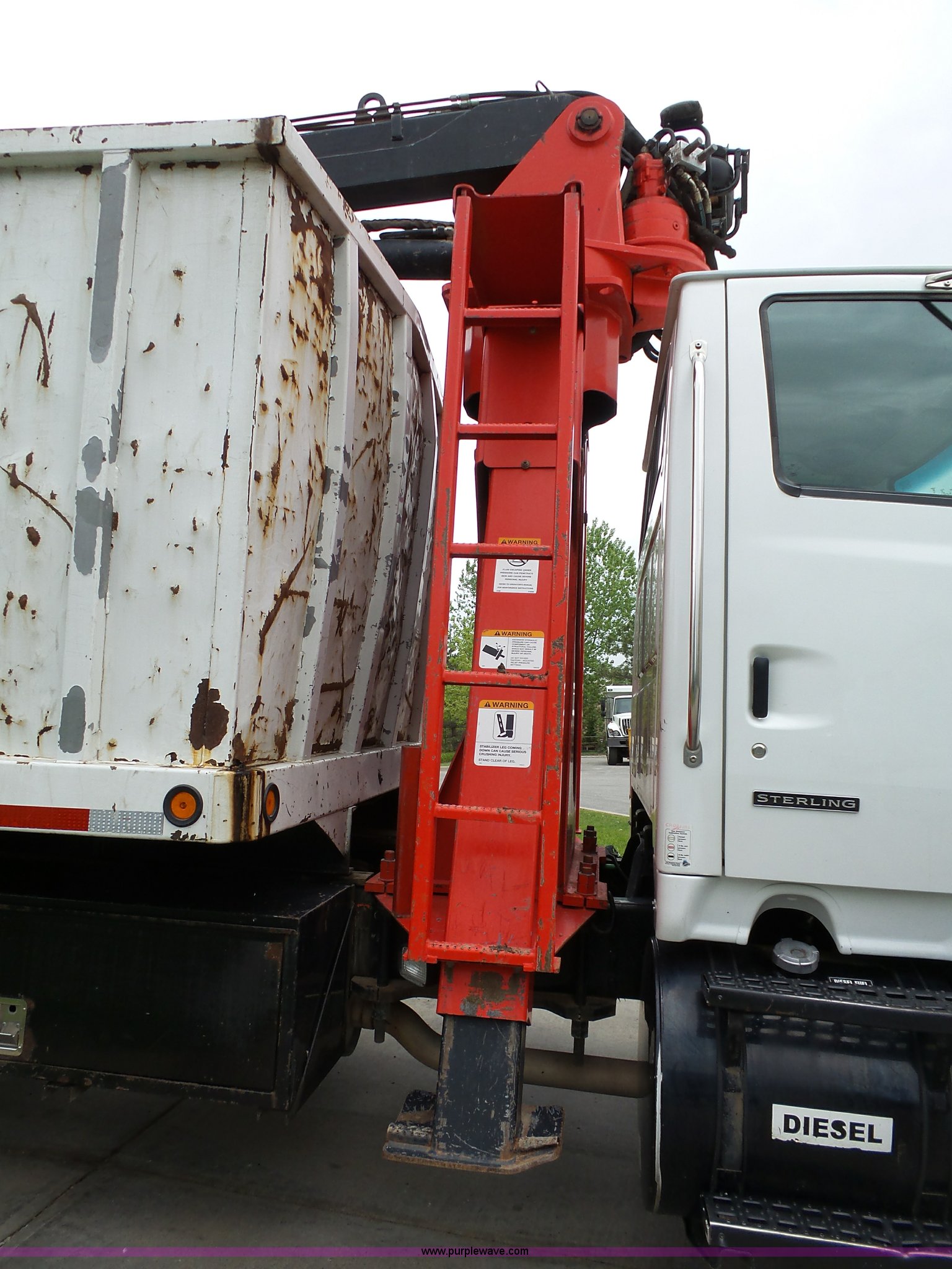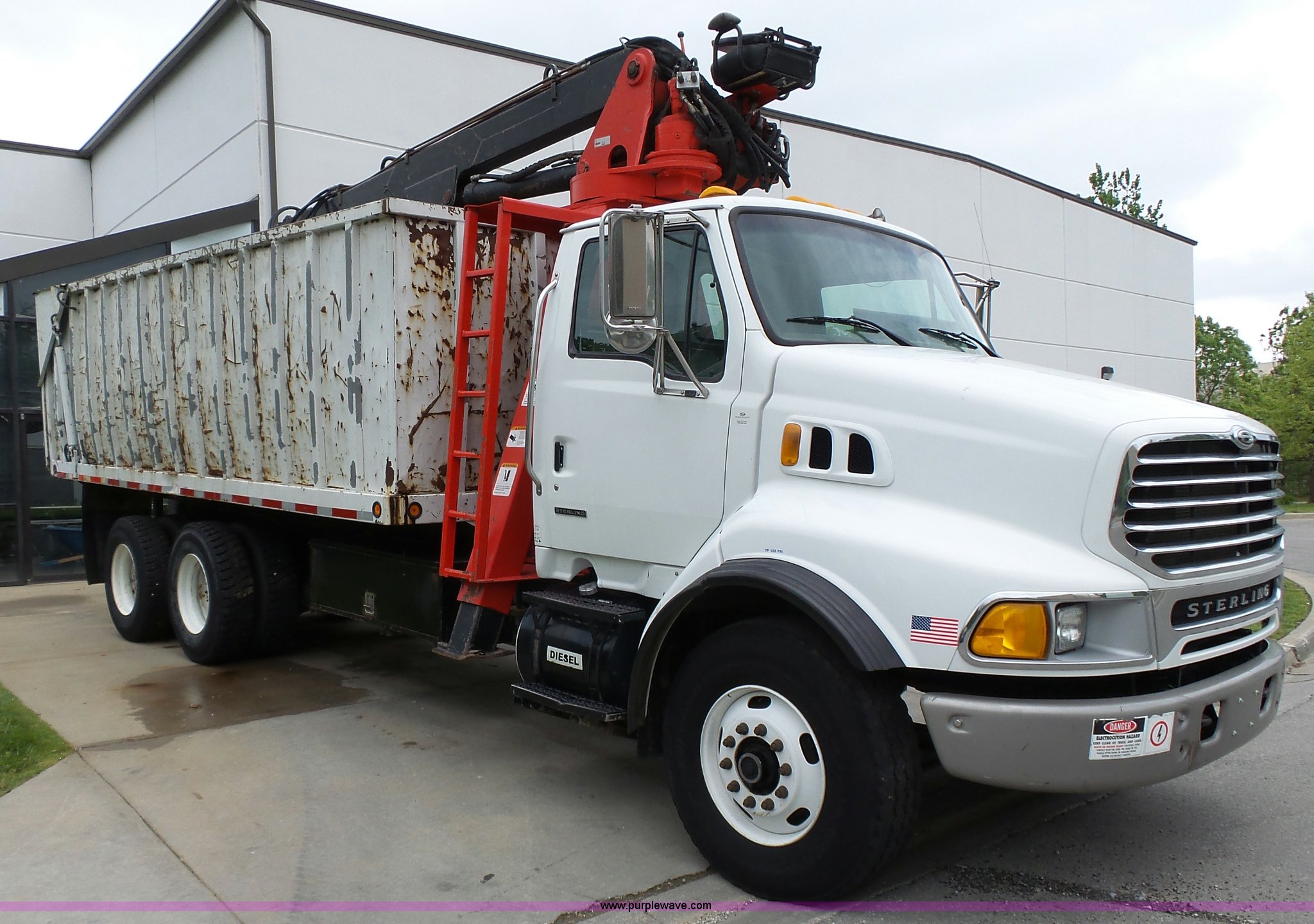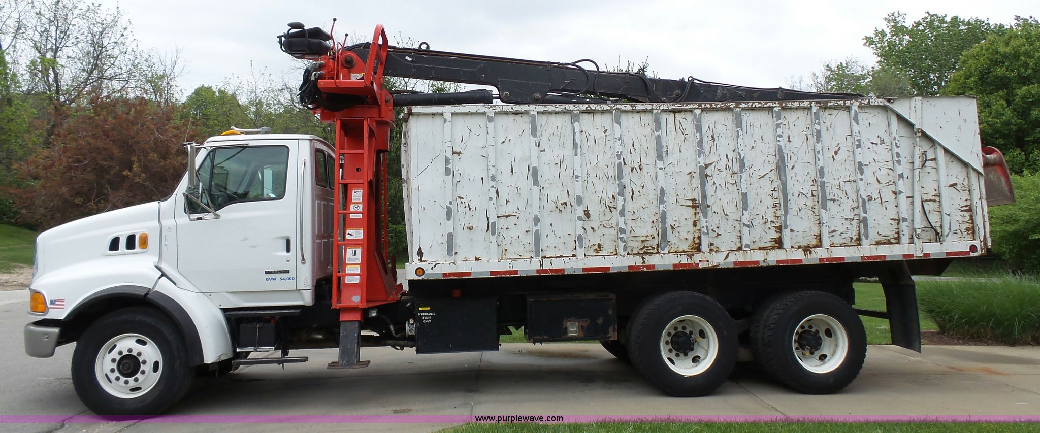 Purple Wave is selling a used Crane Truck in Kansas. This item is a 2004 Sterling L8500 Acterra Grapple truck with the following: 35,861 miles on odometer, Caterpillar 3126 7.2L L6 turbo diesel engine, 300 HP, Serial HEP36100, Automatic transmission, Tandem axle, AC and heat, Cruise, AM/FM/cassette, Power windows, Heated mirrors, Vinyl interior, Front tow hooks, 20'L x 8'W flatbed, 68"H sides, Prentice grapple, Model 120E-BC, Exterior seat, Interior/exterior controls, Crane bed, Gate or bed, Serial 120P59296, (2) underside toolboxes, Hydraulic tank, Rear brake toggle switch, 50 gallon fuel tank, Front stabilizers, Axle and wheel locks, Spring suspension, Air brakes, 315/80R22.5 tires, GVWR 54,780 lbs, FAWR 14,780 lbs, IAWR 20,000 lbs, RAWR 20,000 lbs, Paint chipping, Lift cylinder on bed leak