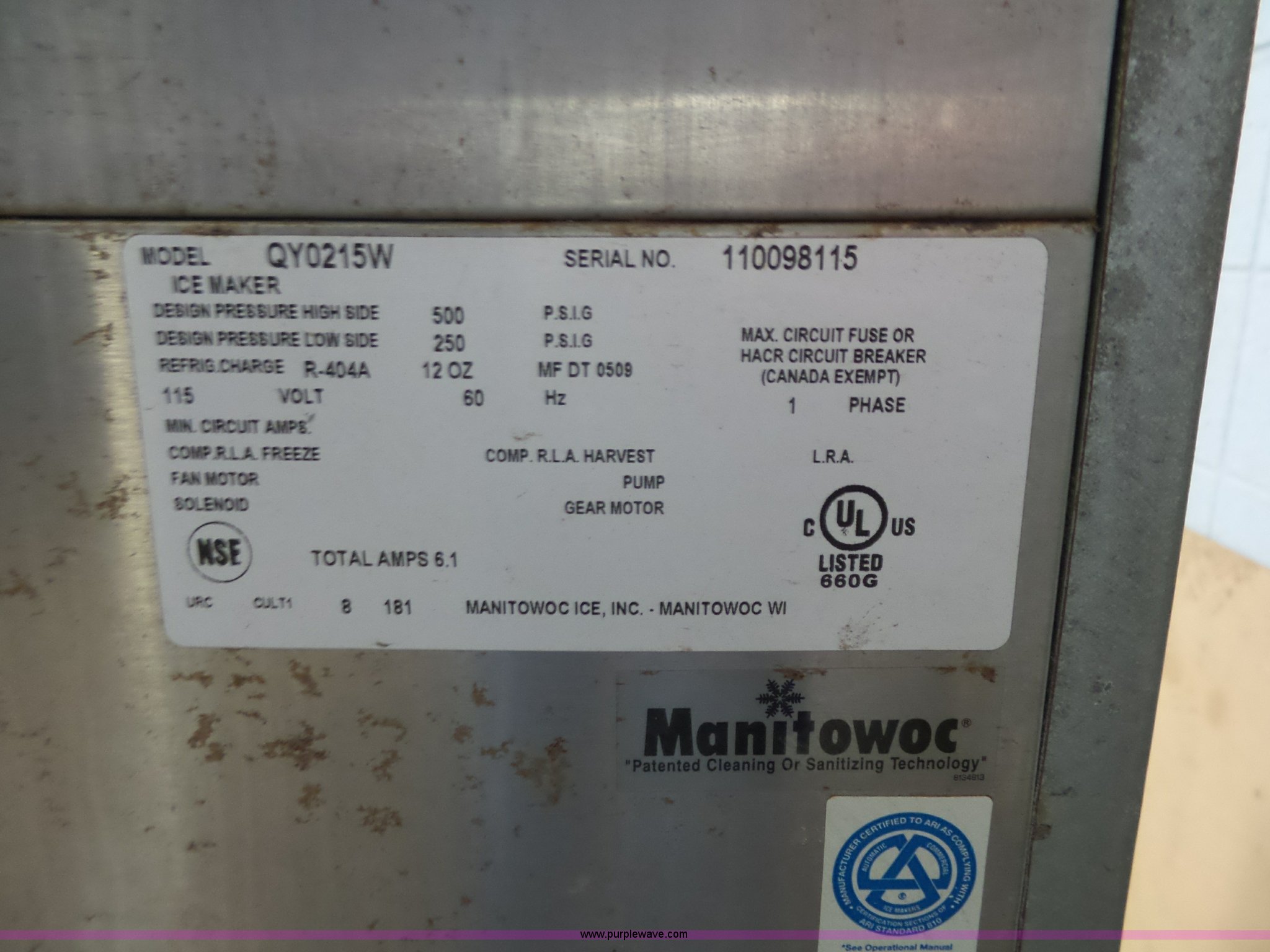 Purple Wave is selling a used Restaurant Equip. in Kansas. This item is a Manitowoc ice machine with the following: Model QY0215W, Unattached door included, Serial 110098115