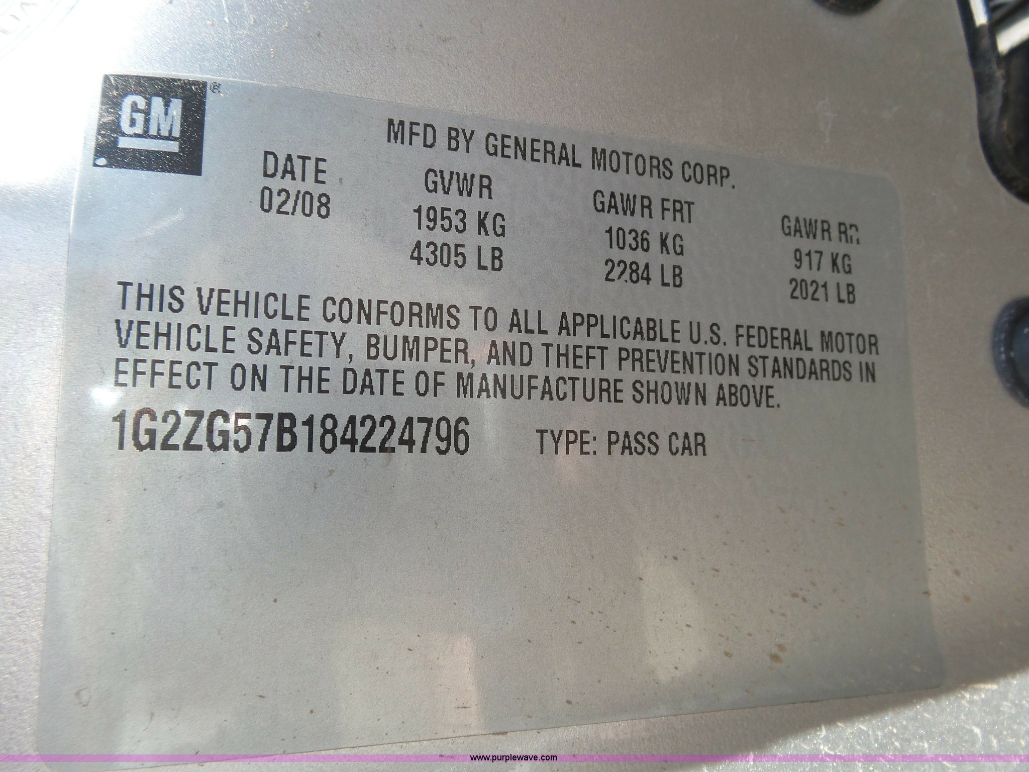 2008 Pontiac G6. Unknown miles on odometer, 2.4L L4 DOHC 16V gas engine, Automatic transmission, AC and heat, Tilt, Cruise, AM/FM/CD, Power windows, locks, and mirrors, Cloth interior, 225/50R17 tires, Interior/exterior cosmetic damage, Unknown operating condition. Kansas title. Title history is unknown. Seized vehicle. Condition and history are unknown. No additional information is available. 1G2ZG57B184224796. Garden City Police Department. 504 S 9th St. Garden City, KS 67846