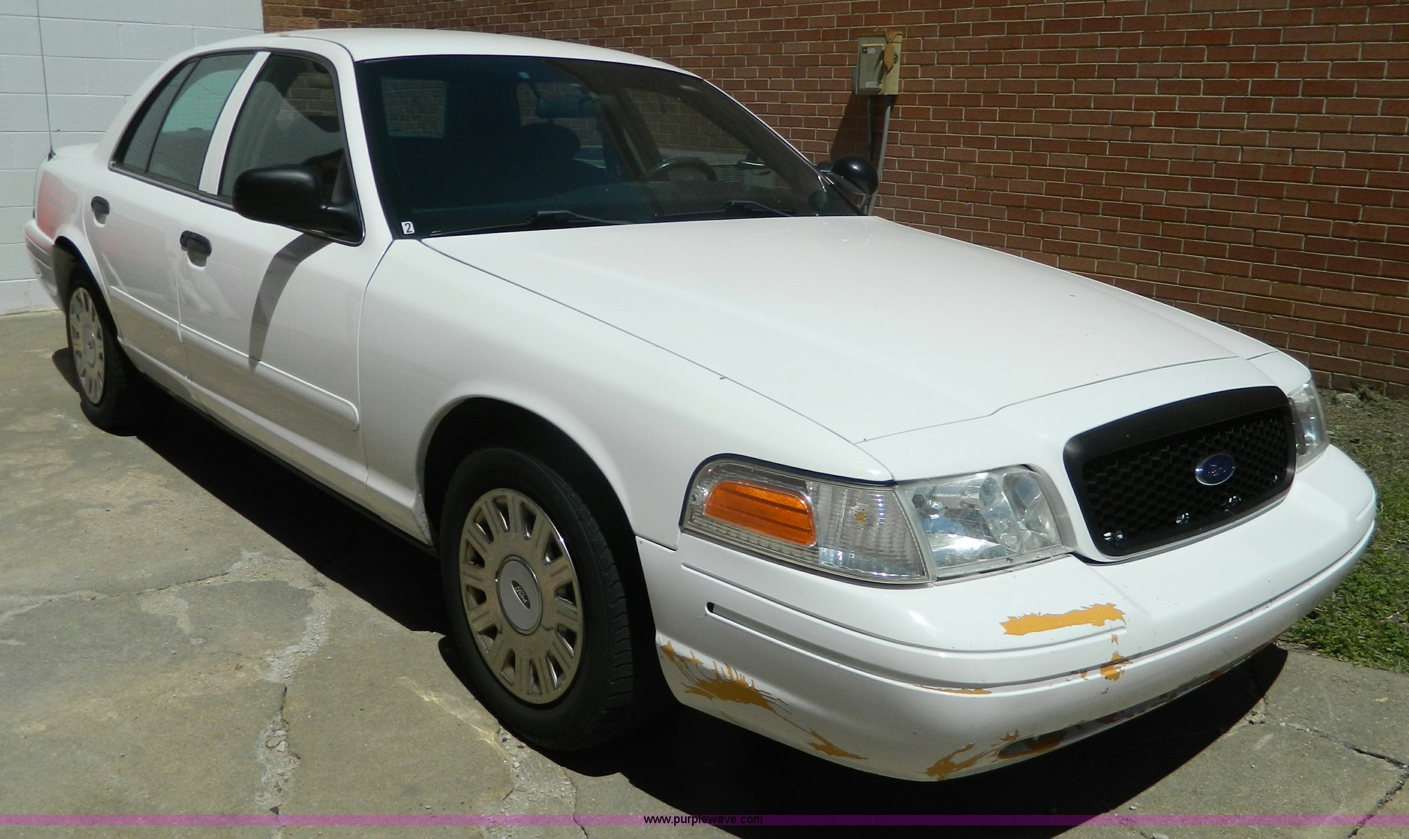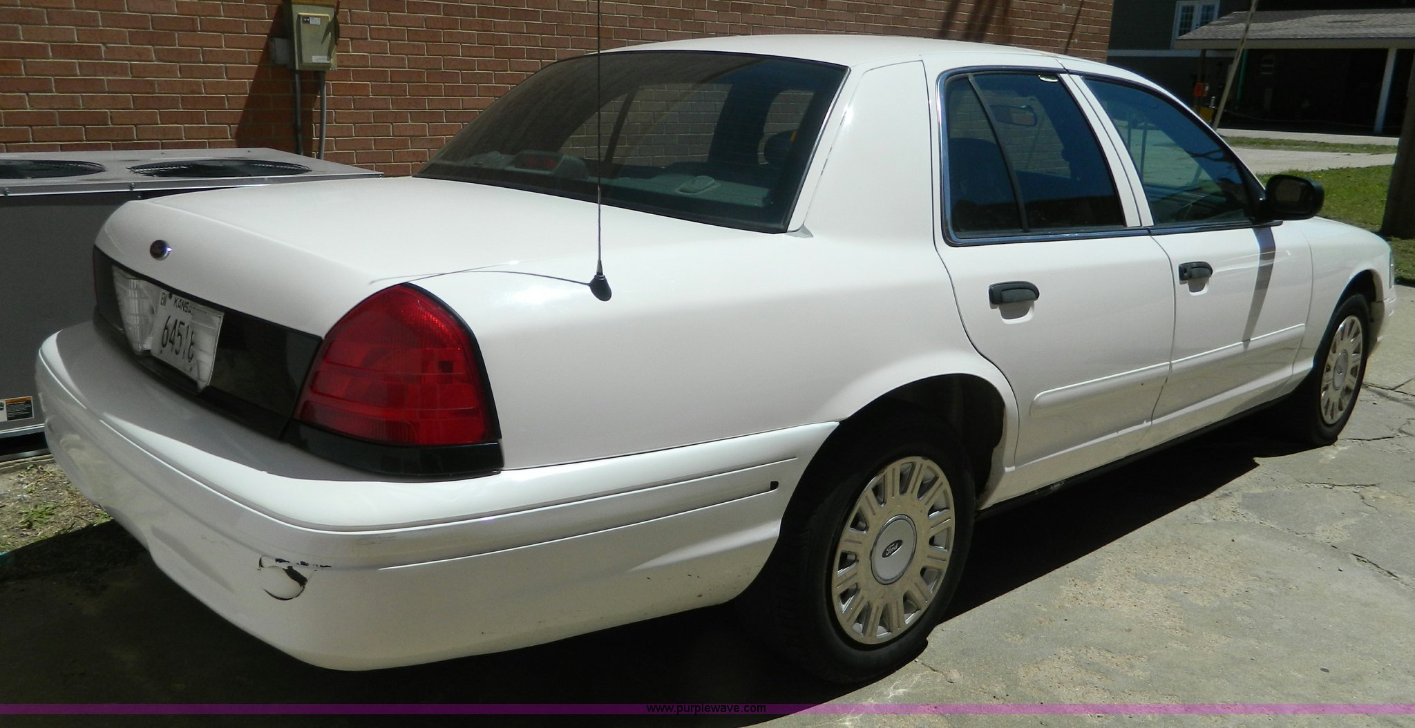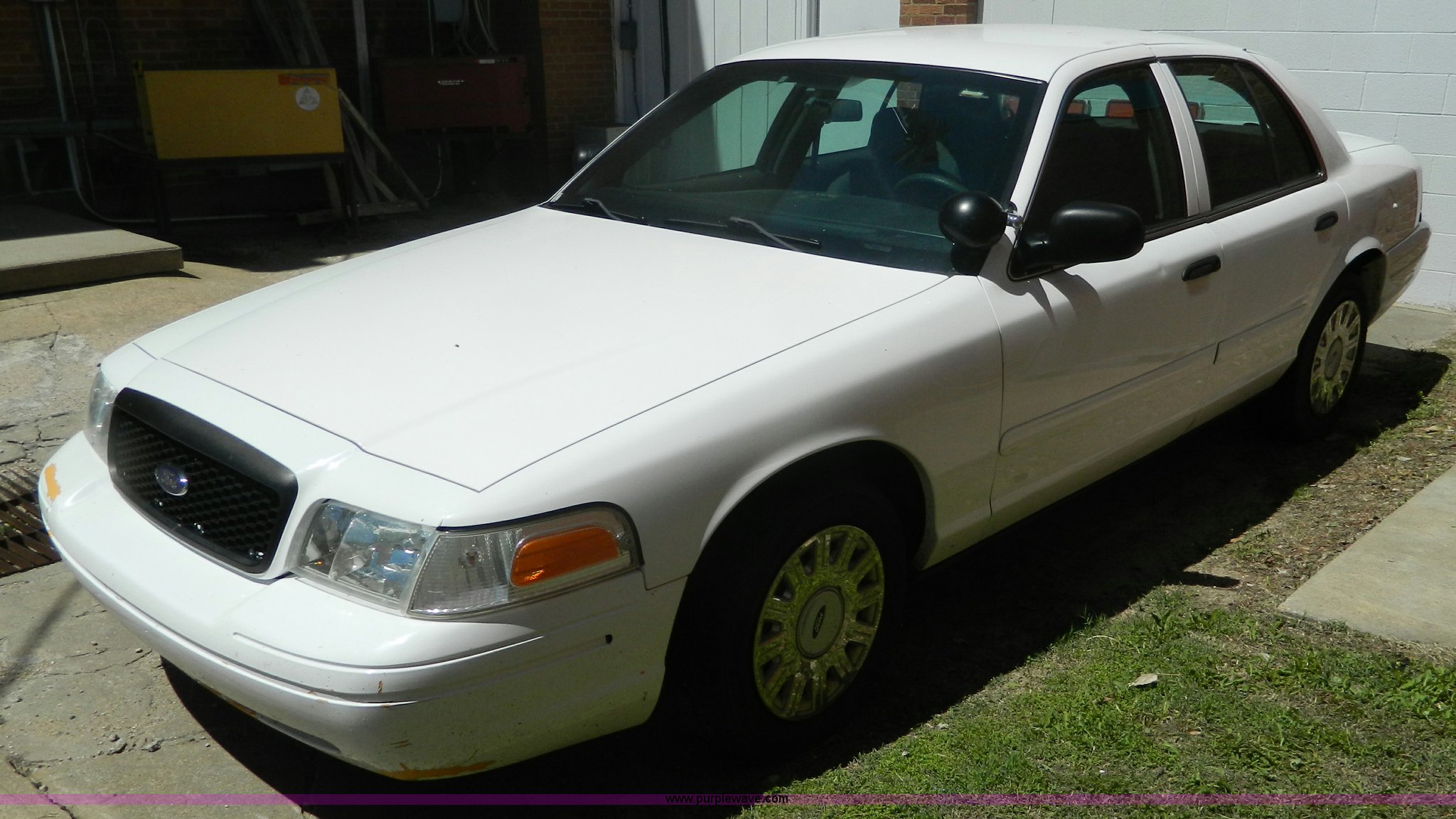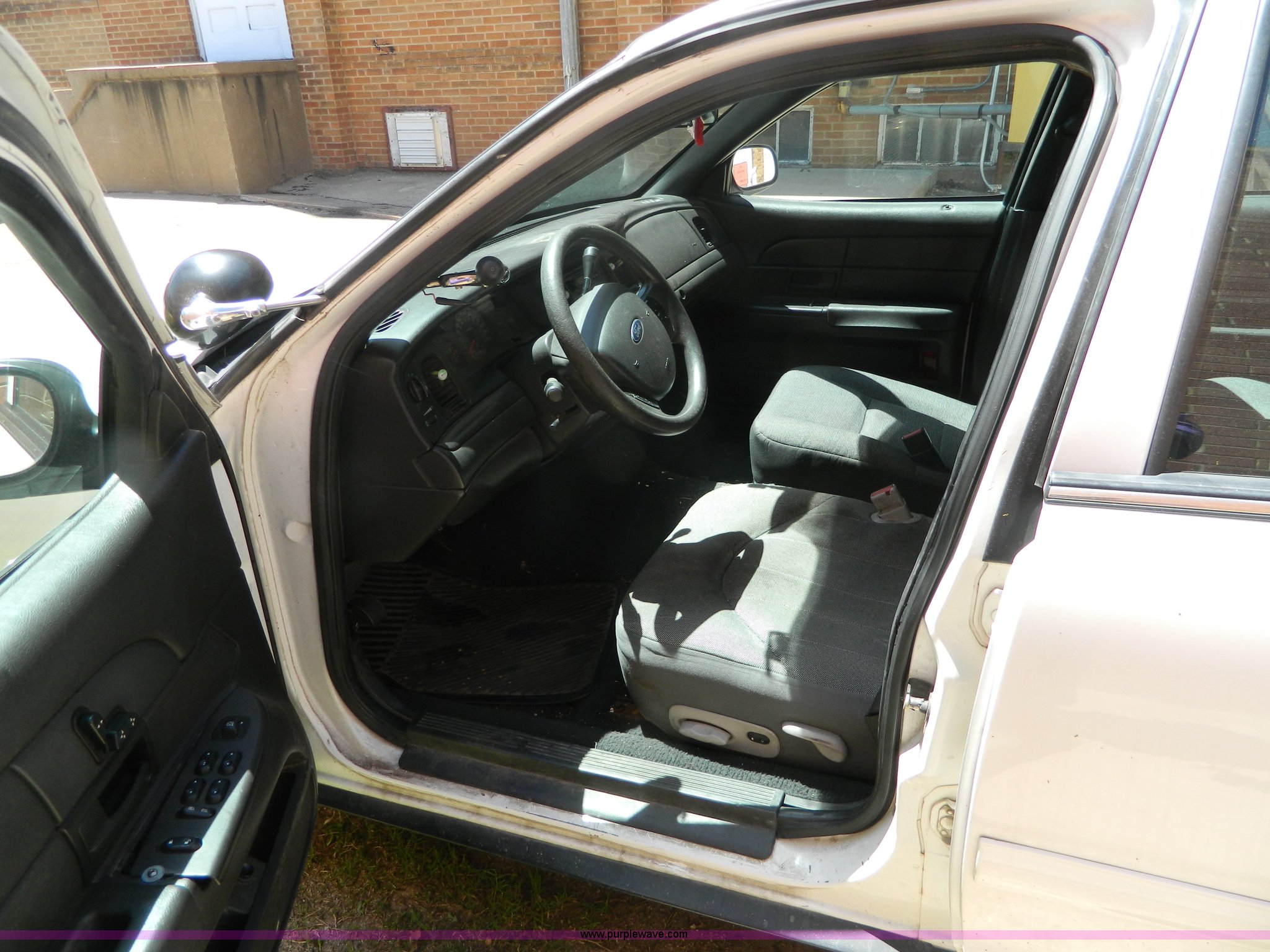 Purple Wave is selling a used Passenger Vehicle in Kansas. This item is a 2005 Ford Crown Victoria Police Interceptor with the following: 116,465 miles on odometer, 4.6L V8 SOHC 16V gas engine, Automatic transmission, AC and heat, Tilt, Cruise, AM/FM, Power windows, locks, mirrors, and seats, Cloth interior, 235/60R16 tires, ABS light is on, Paint peeling, Holes in roof, Interior/exterior cosmetic damage