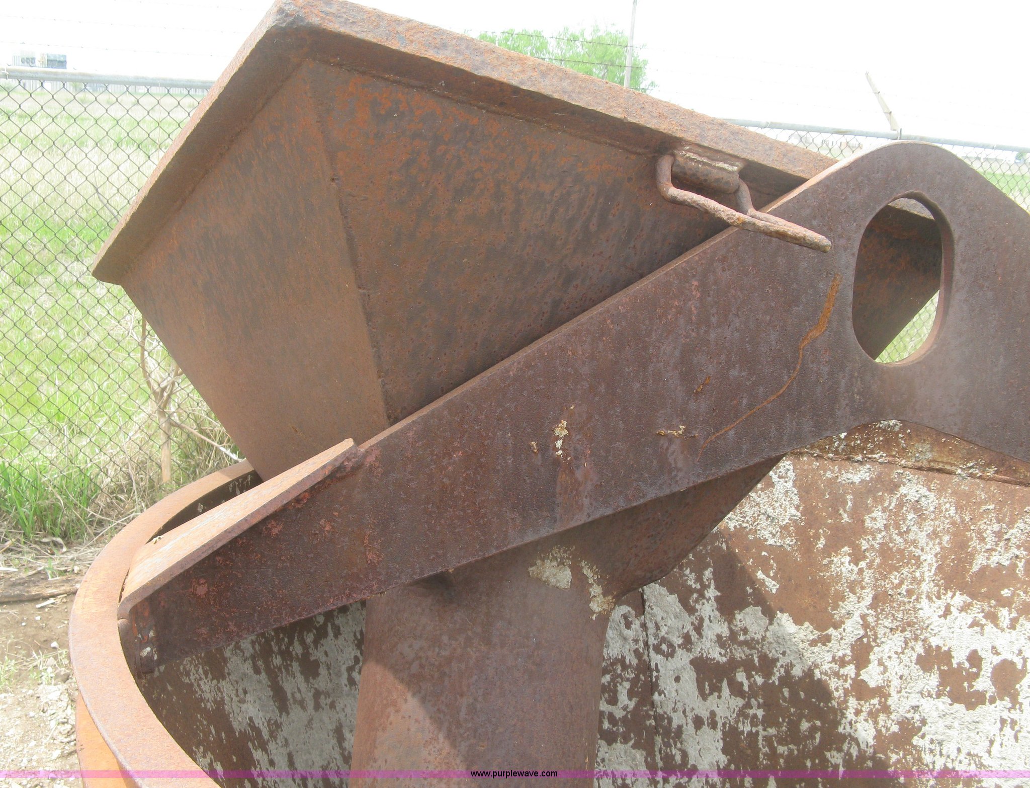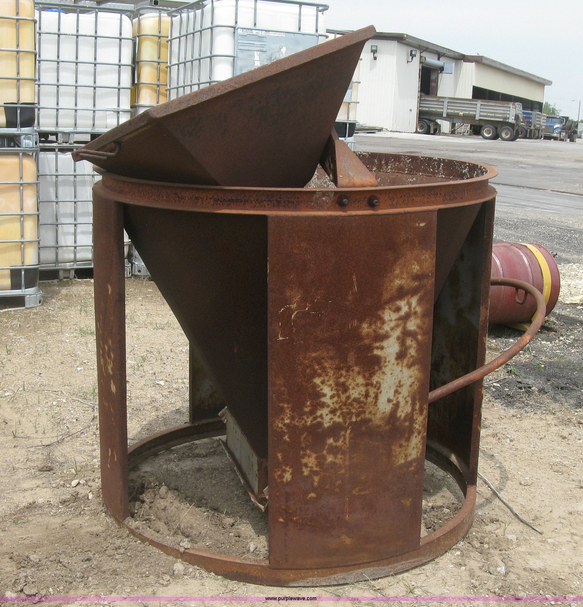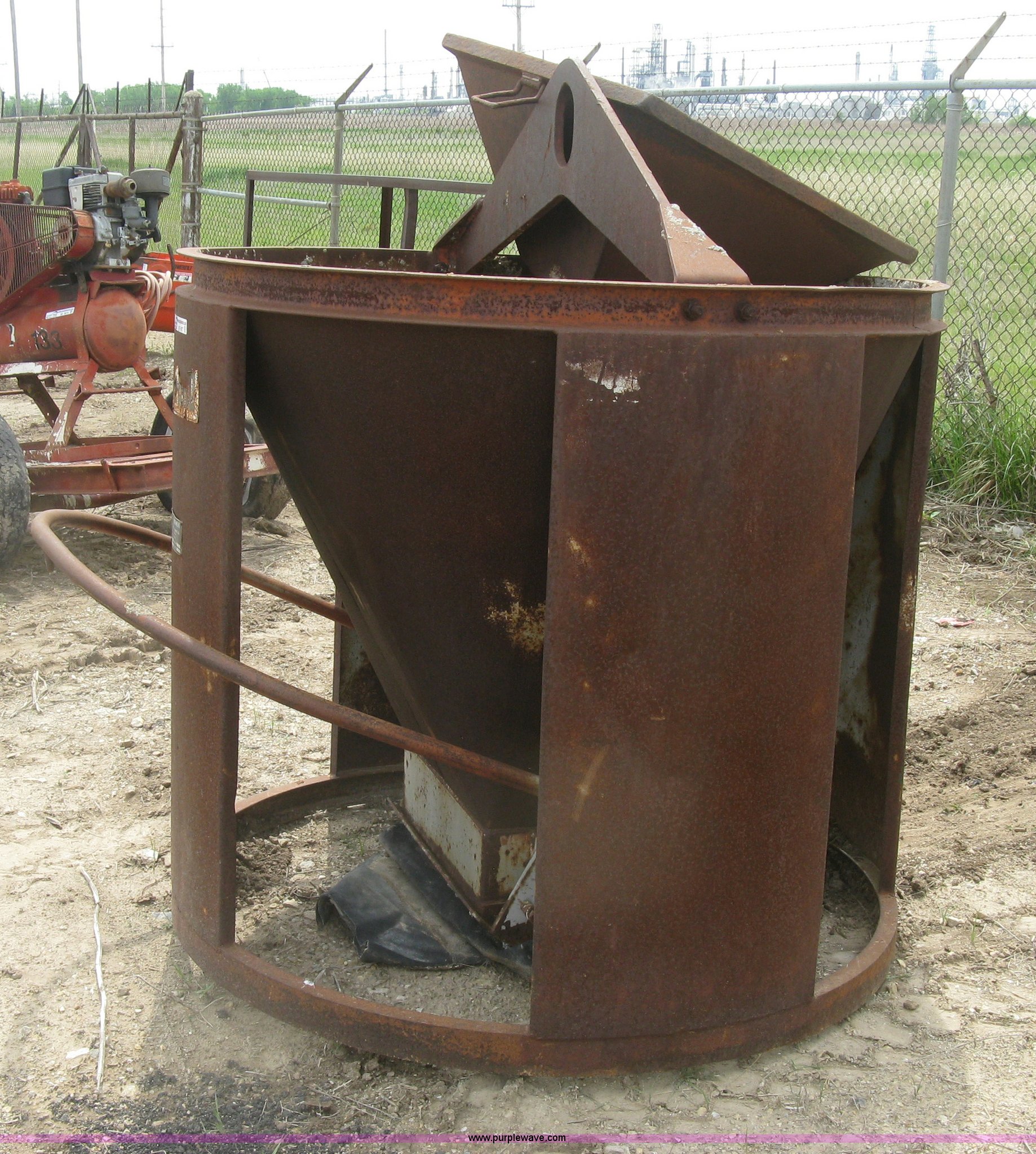 Purple Wave is selling a used Crane Attach. in Kansas. This item is a Gar Bro mud bucket with the following: 54" diameter hopper opening, 30.5" x 30.5" chute funnel, One cu. yd. capacity, 7,200 lbs max gross weight, Unit# 433G