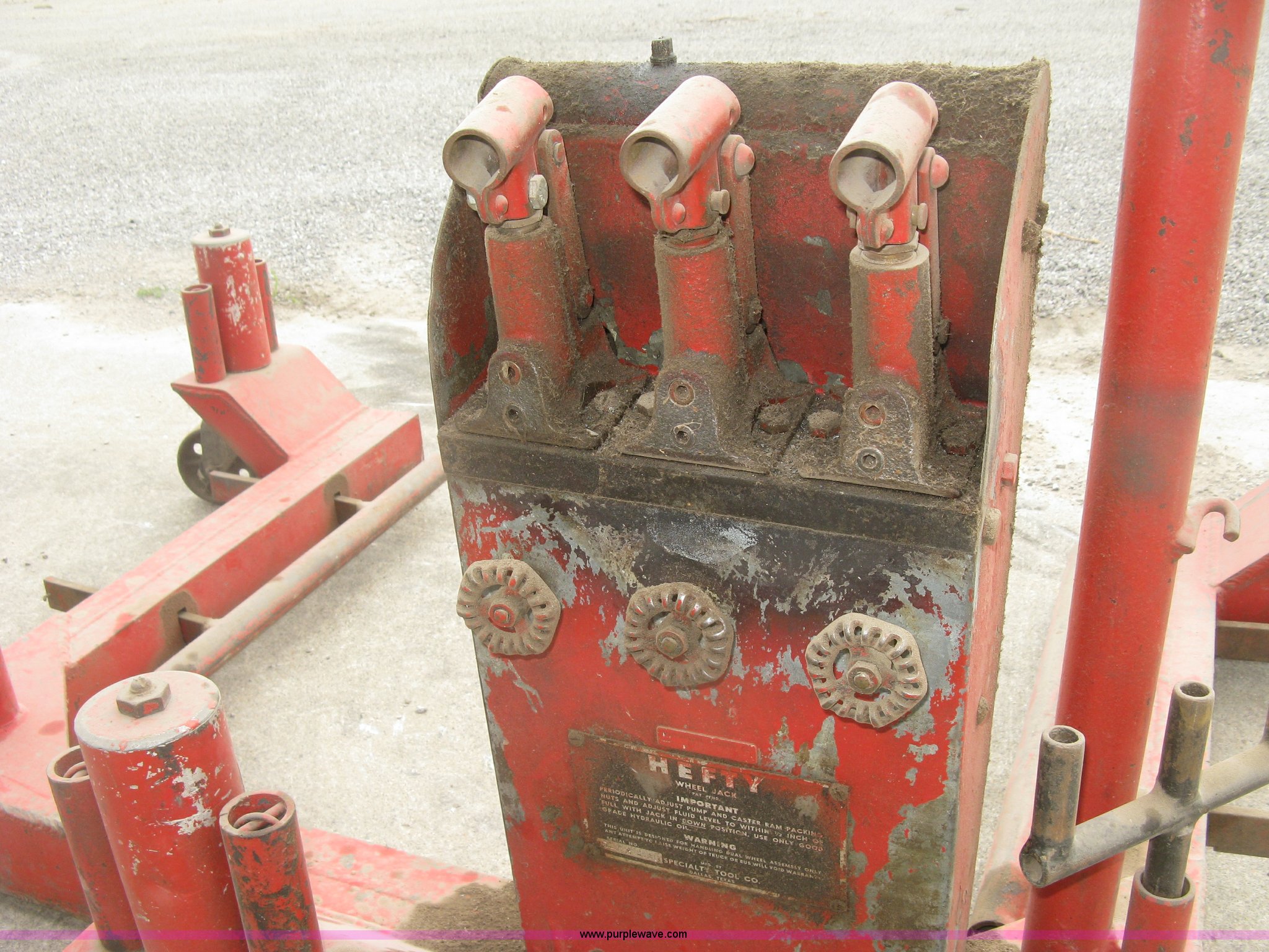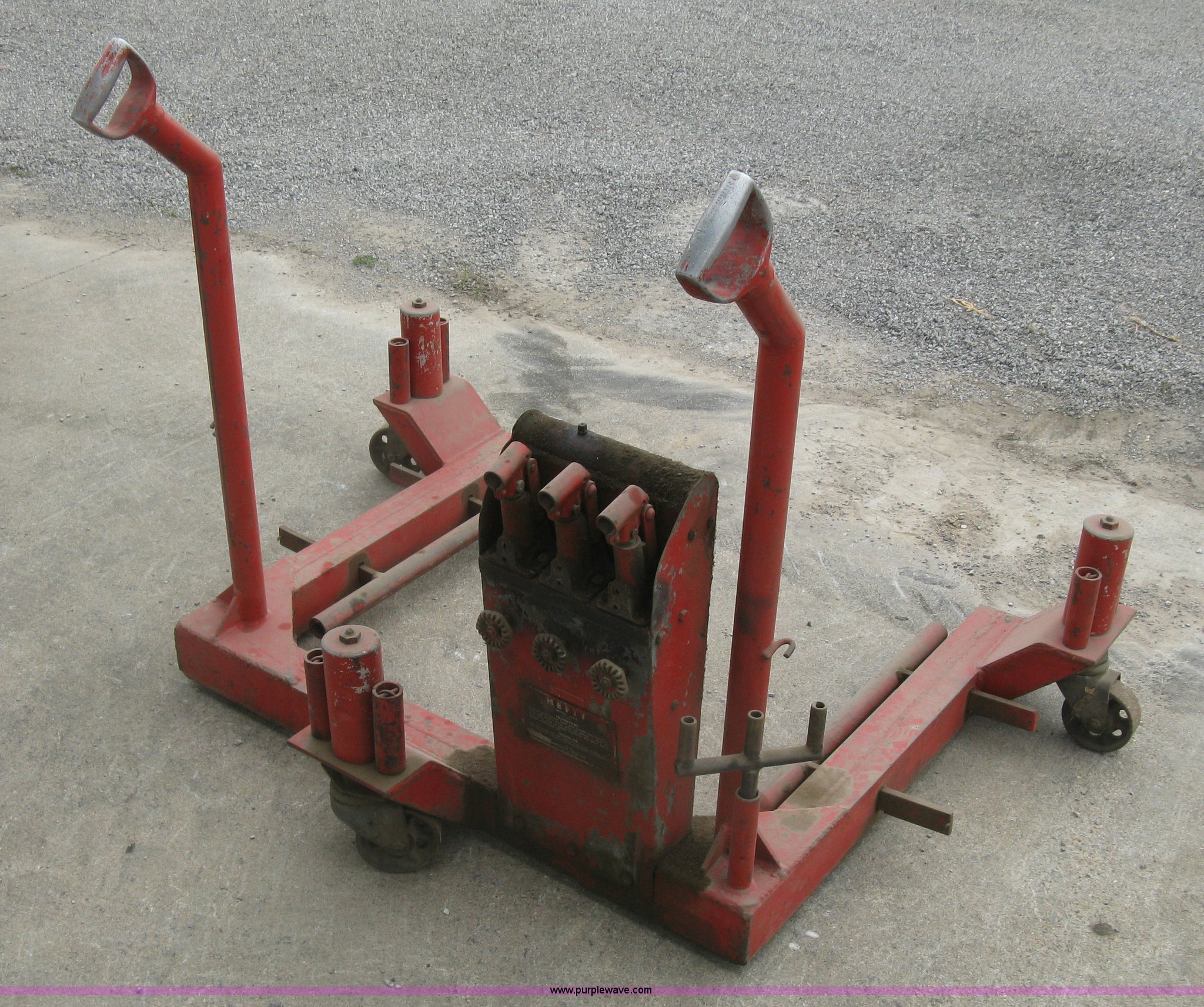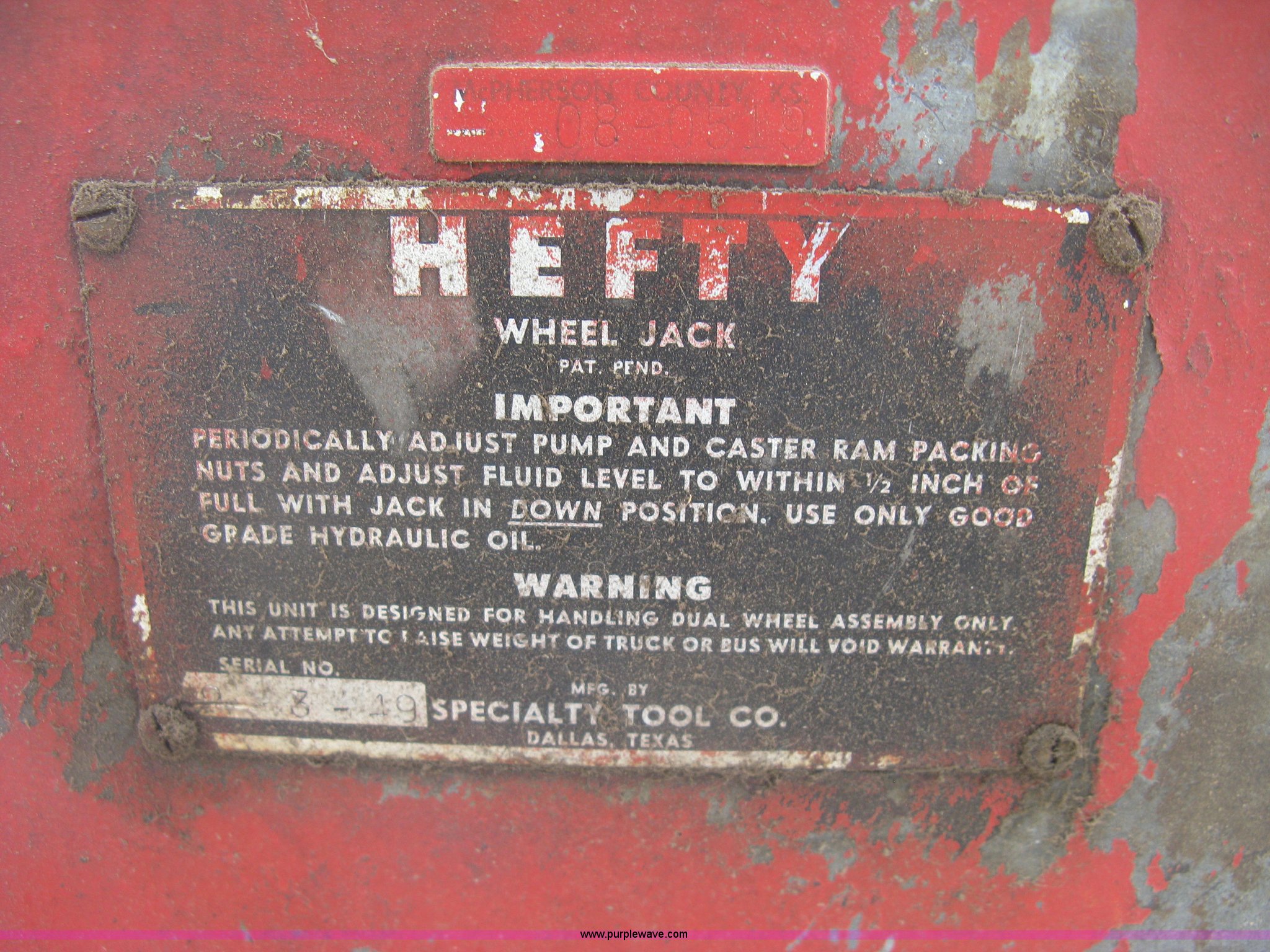 Purple Wave is selling a used Tools in Kansas. This item is a Hefty wheel jack with the following: Steel casters, Serial 0-3-49